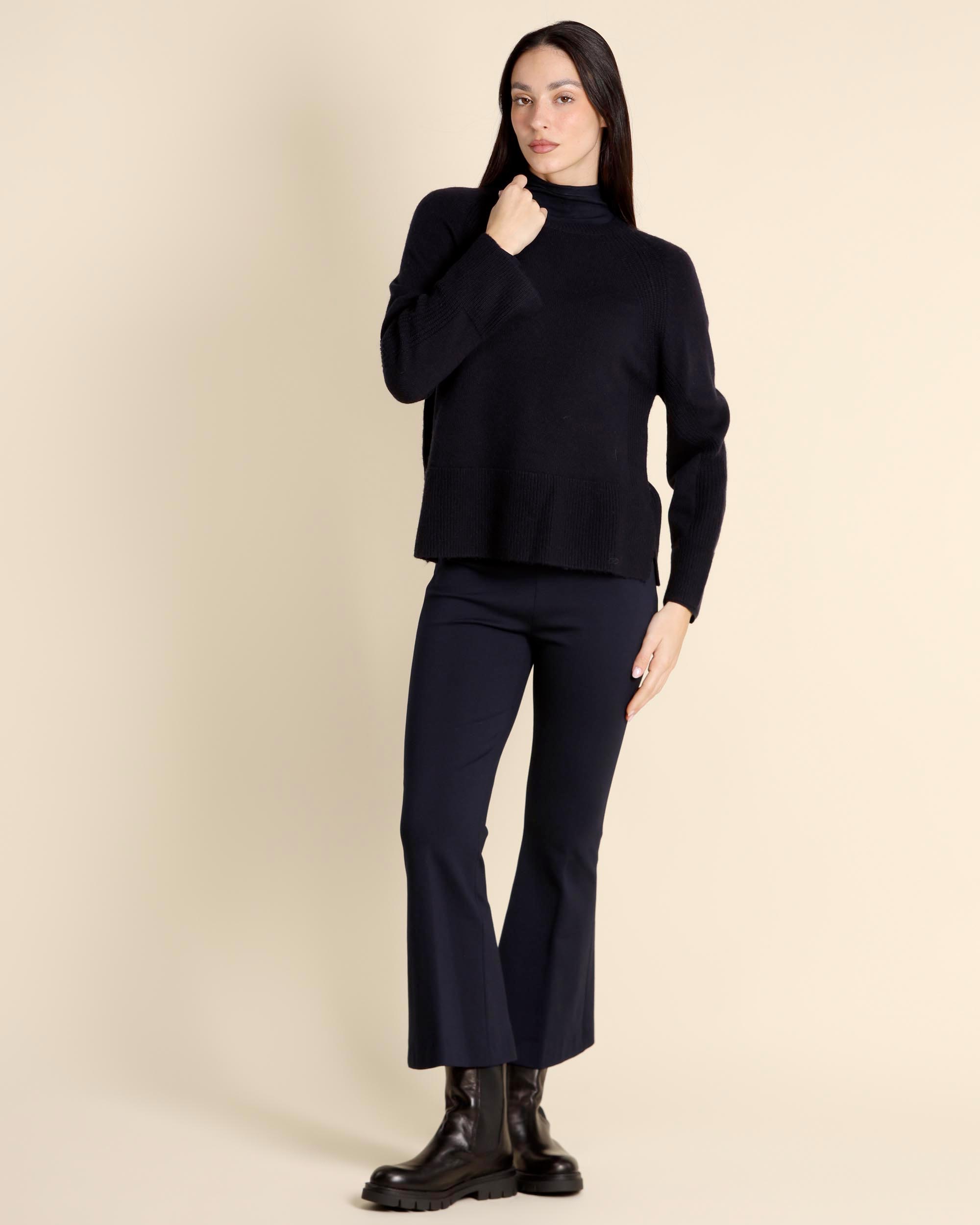Maglia blu in misto lana vergine, scollo tondo, maniche lunghe raglan con spacco nei polsi, linea morbida, spacchi laterali, la modella indossa una tg.S, la modella ha le seguenti misure: altezza 173, seno 84, vita 63, fianchi 94, collezione donna Emme by Marella Autunno Inverno 2025/26