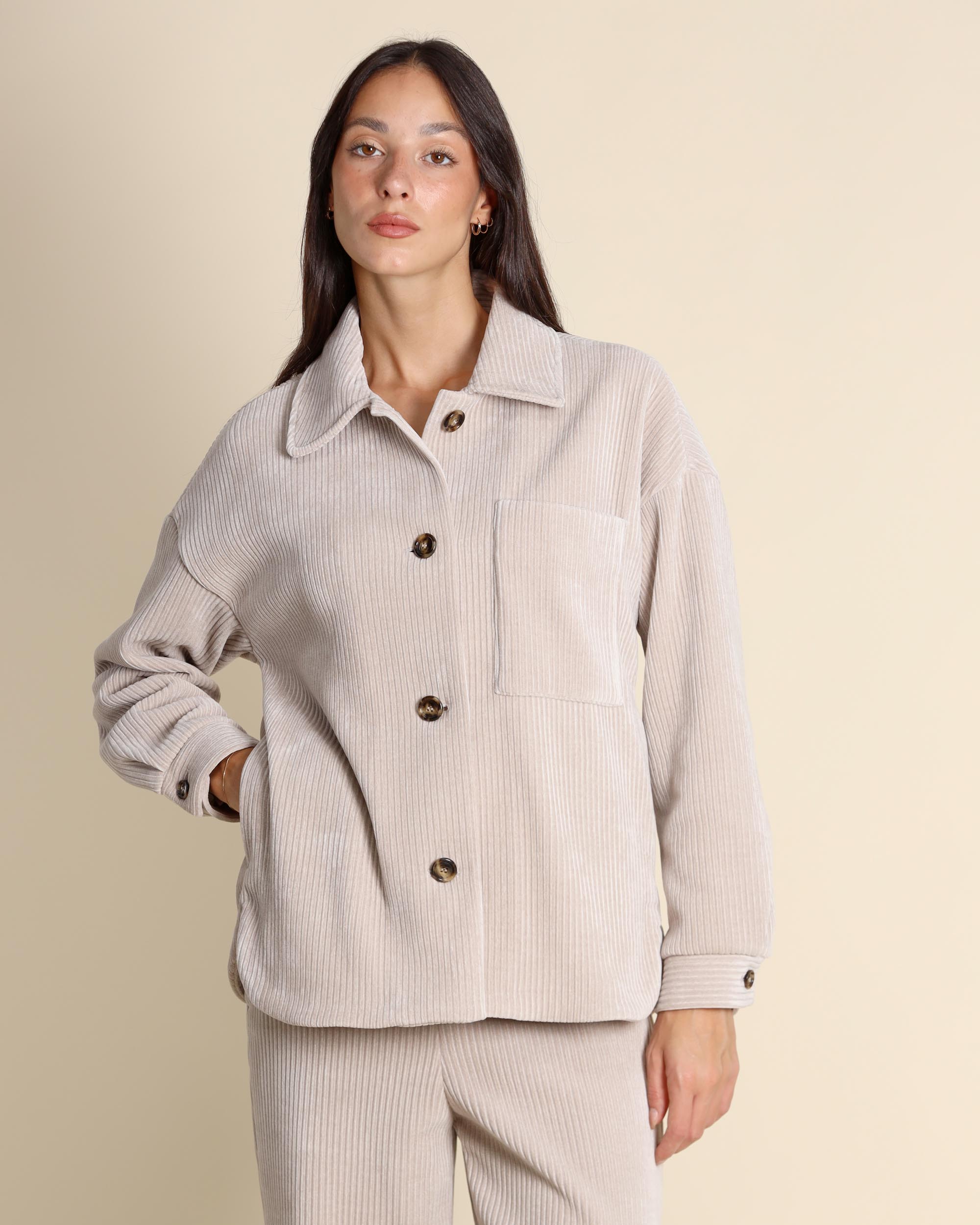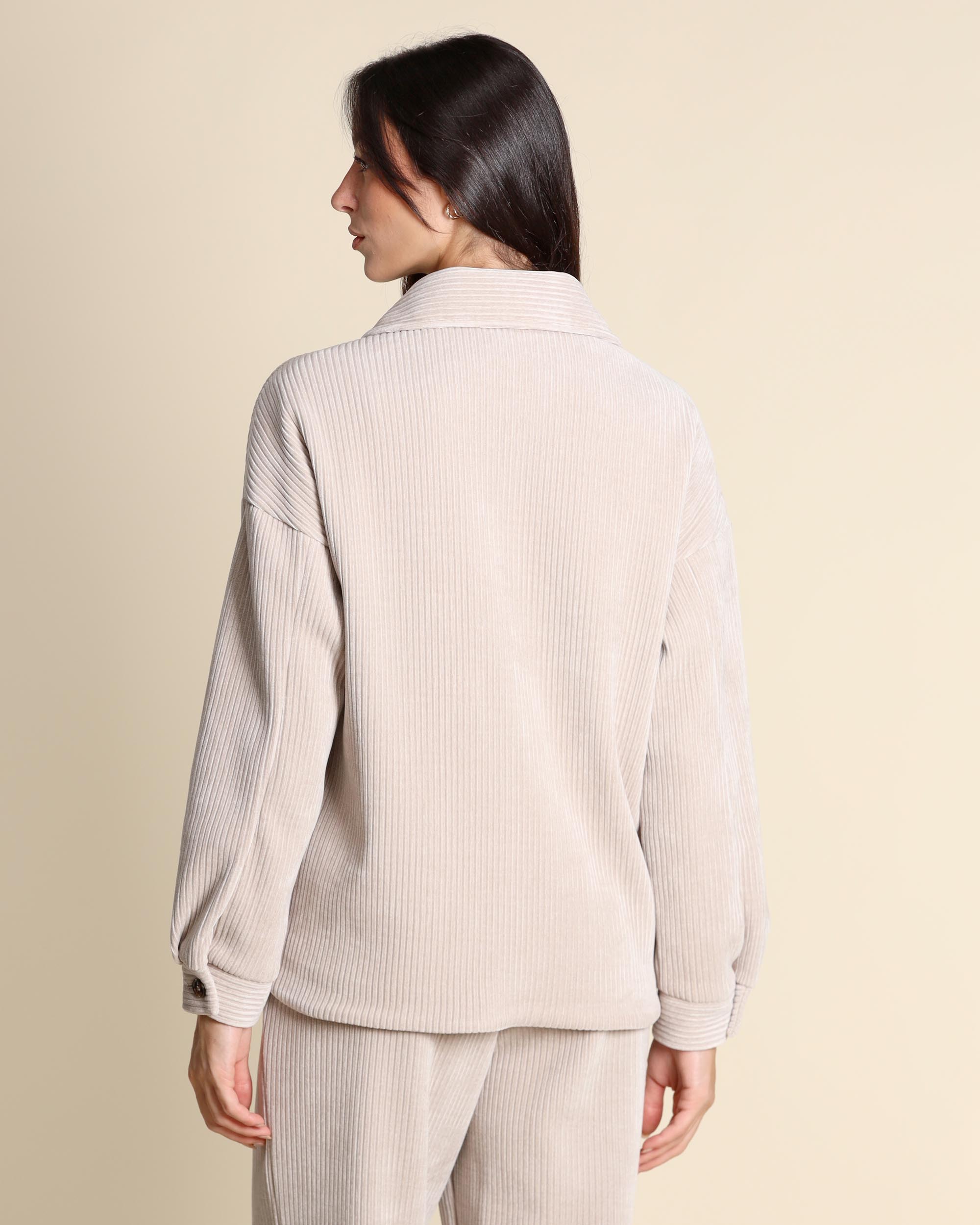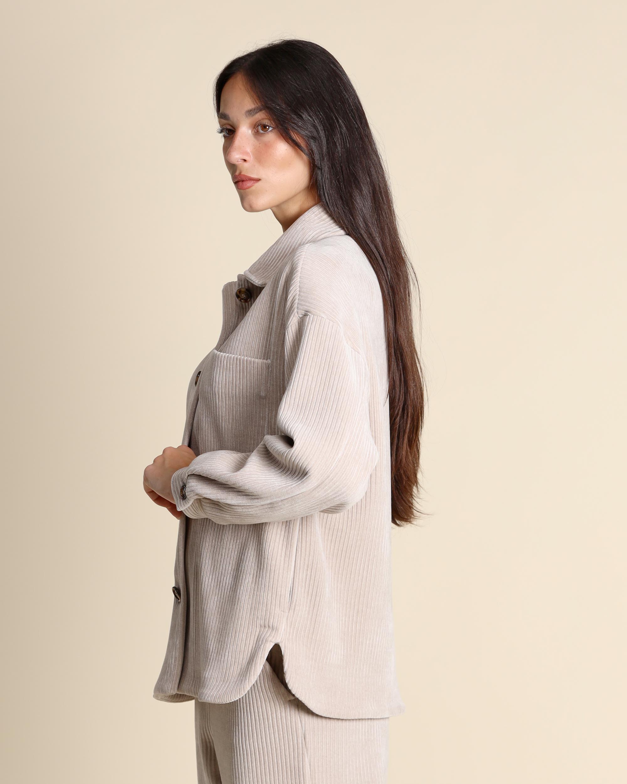 Giacca camicia color cacha in jersey di velluto a coste stretch, collo a camicia, maniche lunghe con polsino, giro sceso, chiusura con bottoni, linea ampia, tasca applicata e tasche inserite sul fianco, foderata, spacchi laterali, la modella indossa una tg.40, la modella ha le seguenti misure: altezza 173, seno 86,vita 65, fianchi 93, collezione donna Emme by Marella Autunno Inverno 2025/26