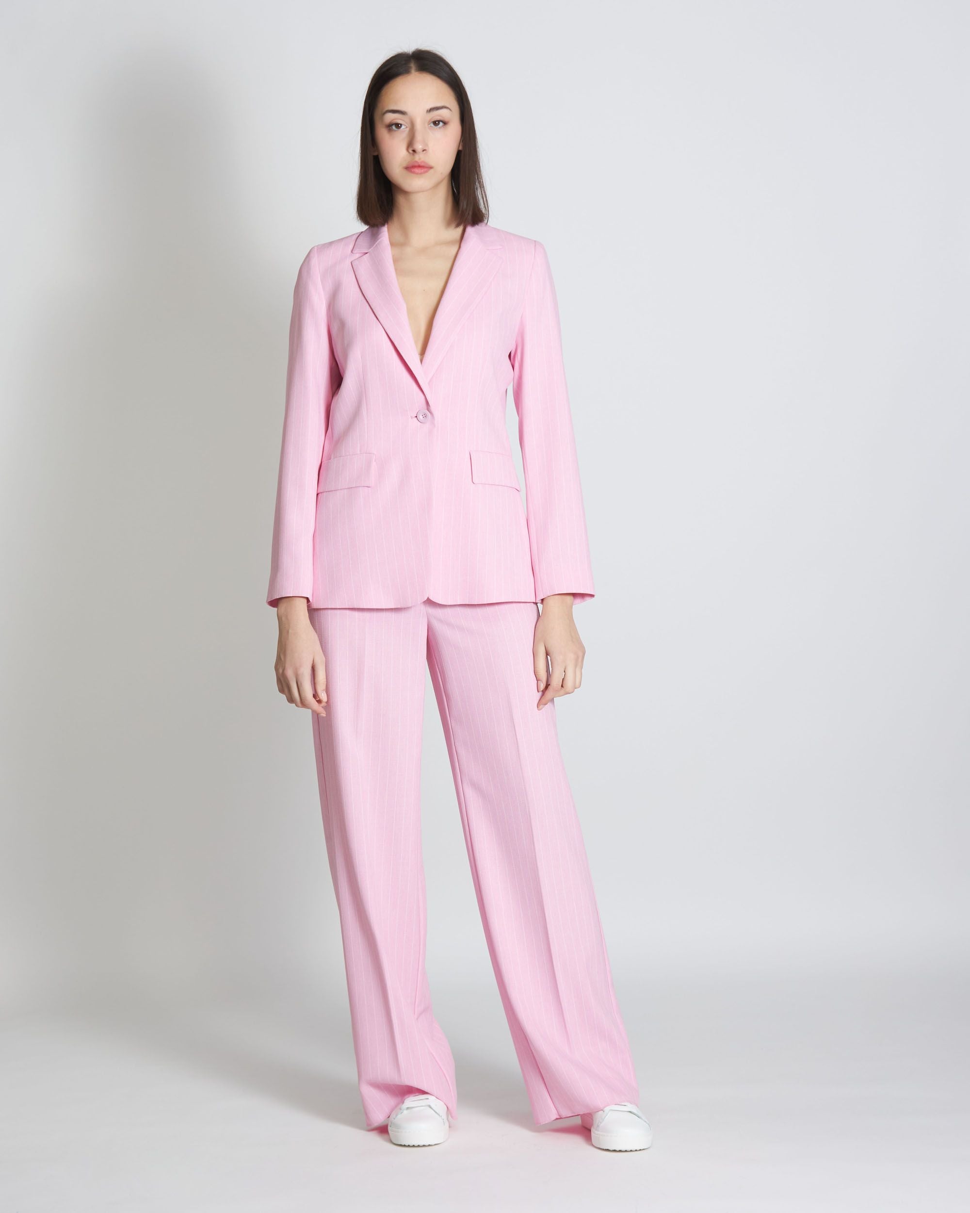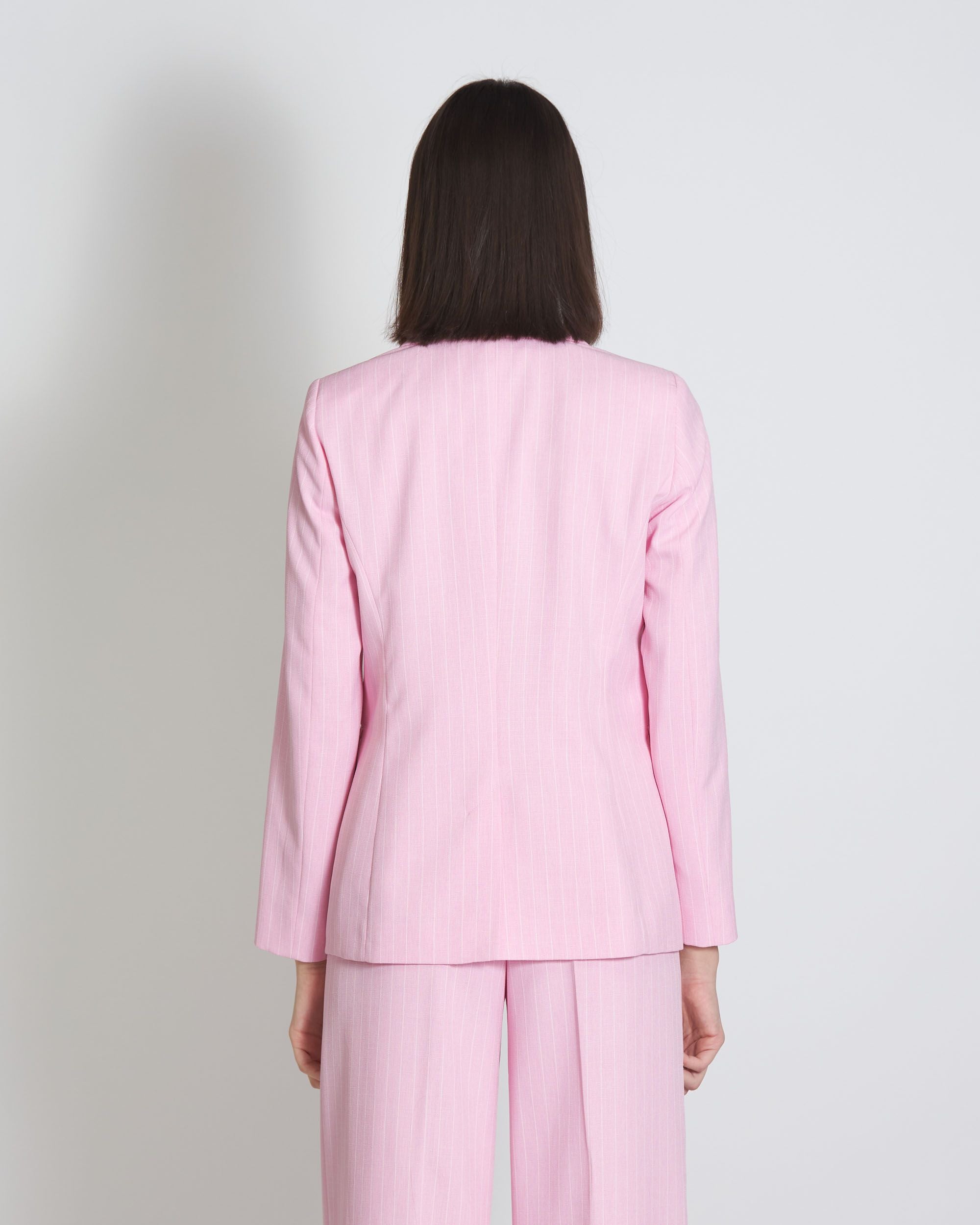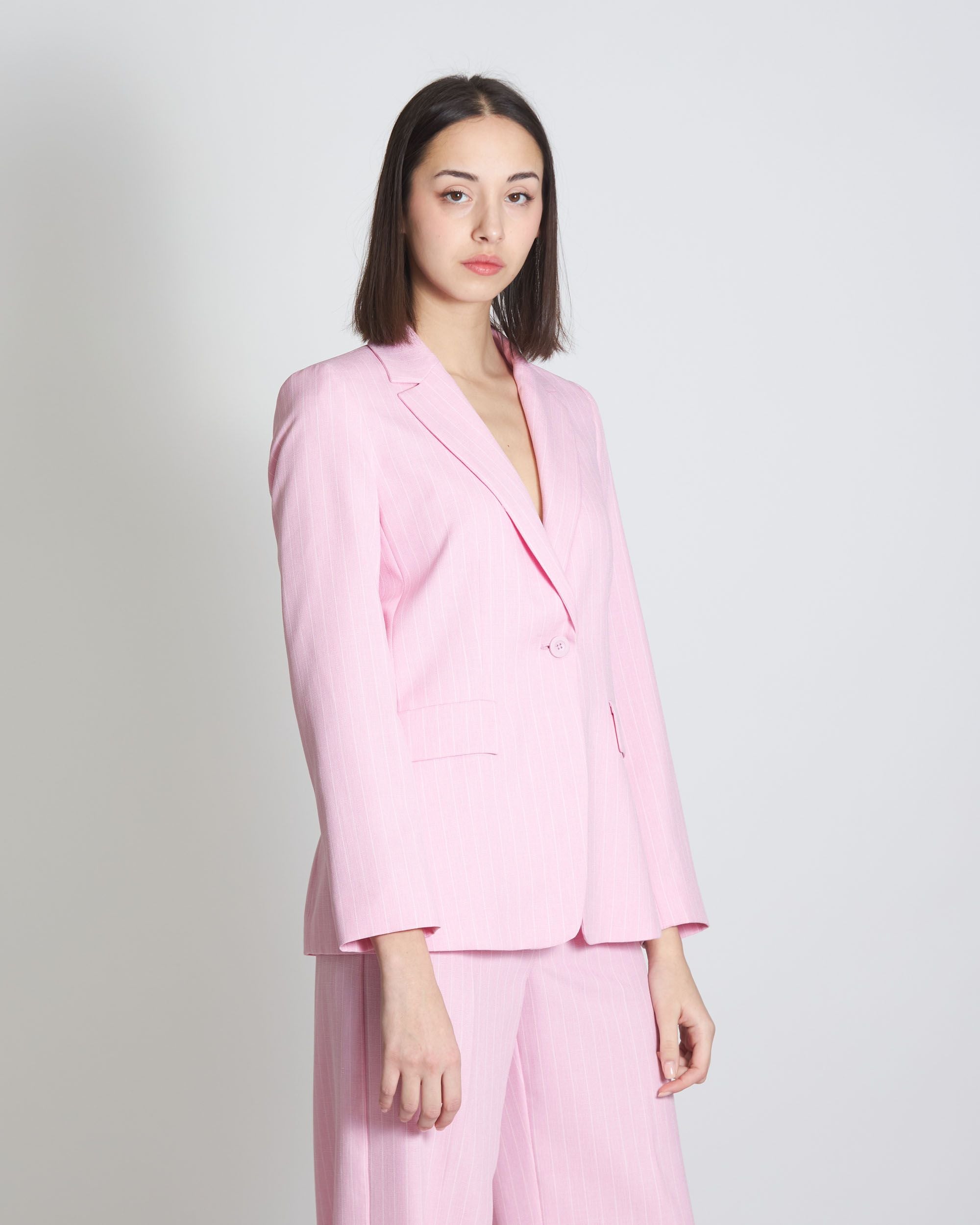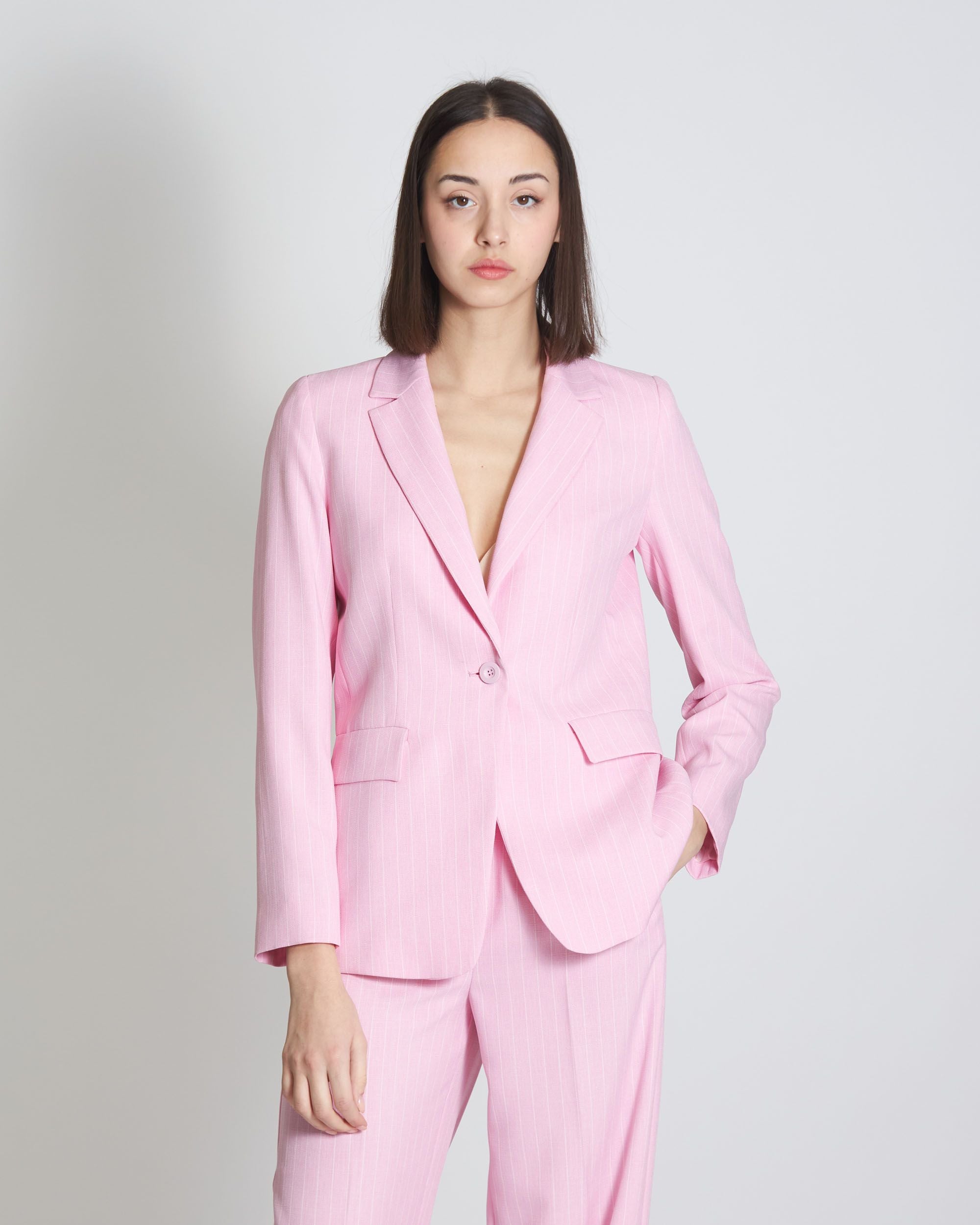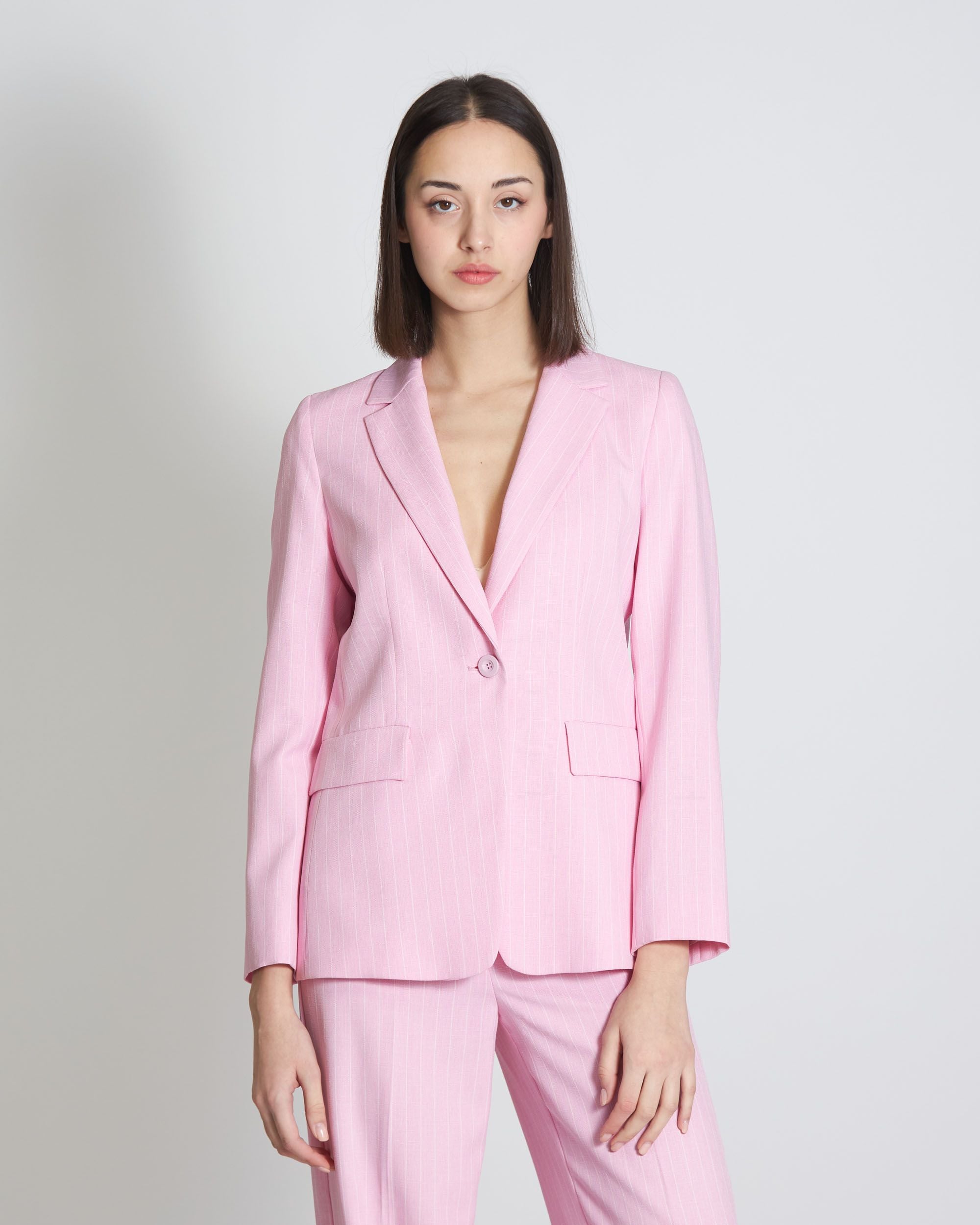 Giacca gessata rosa pastello in stuoia, collo a rever, chiusura con bottone, maniche lunghe, tasche con patta, linea semiaderente, foderata, spacco centrale sul retro, Giorgia indossa una tg.42, Giorgia ha le seguenti misure: altezza 1.78, seno 85cm, vita 70cm, fianchi 88cm, collezione donna Emme by Marella Primavera Estate 2024