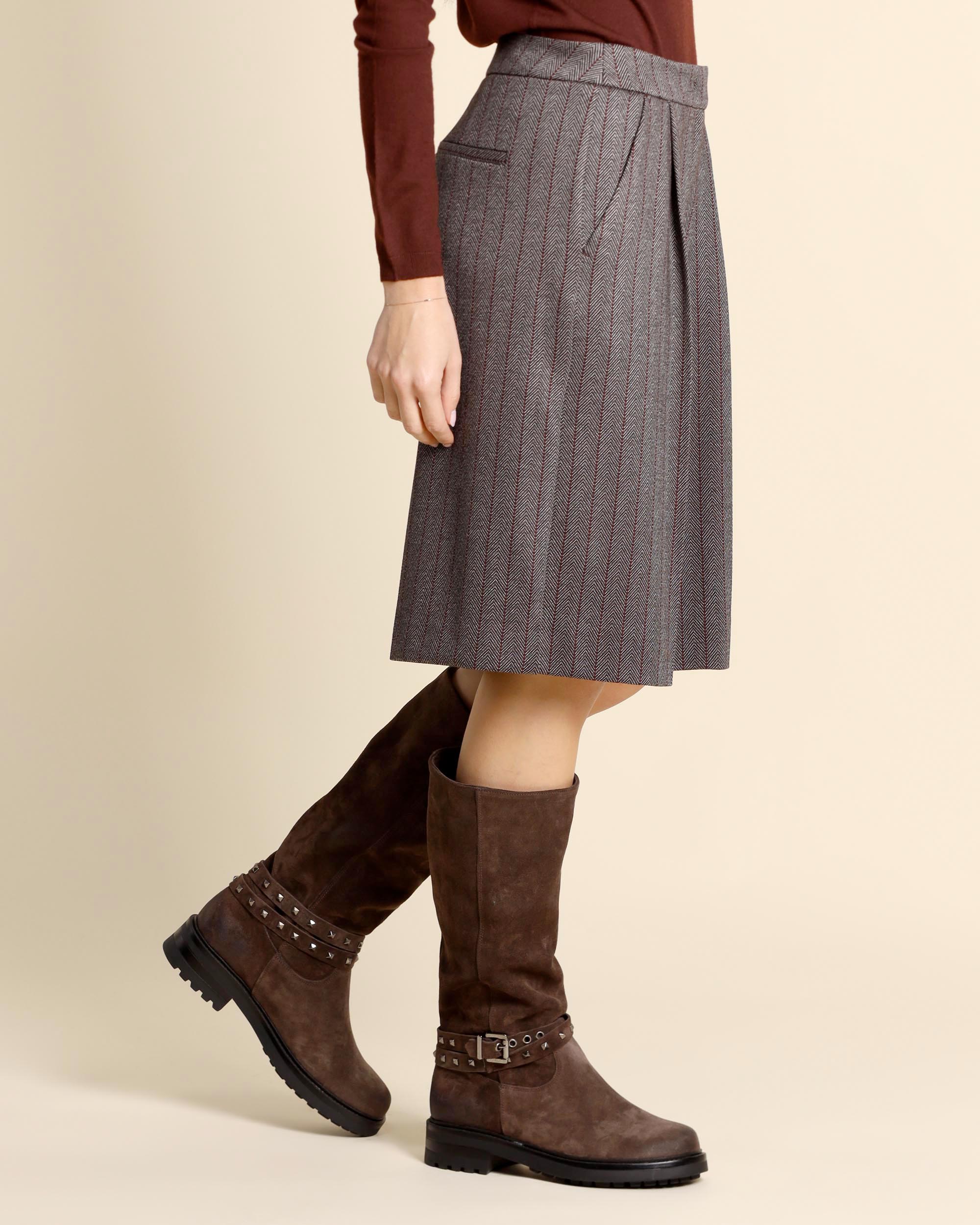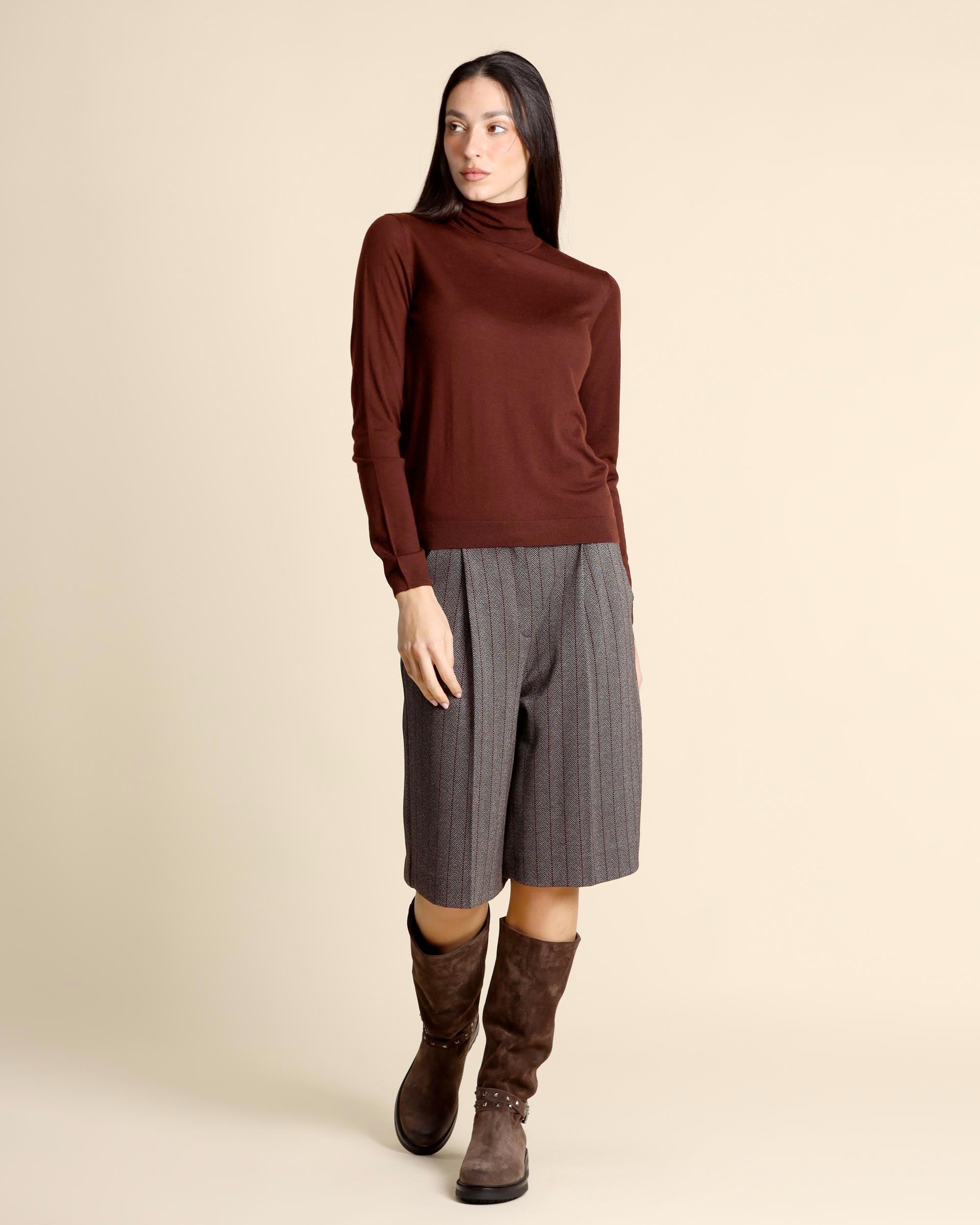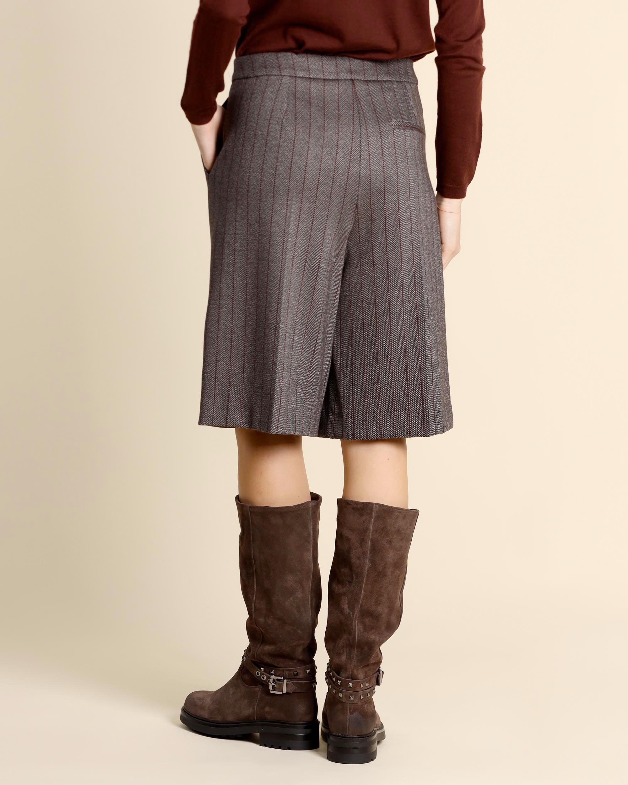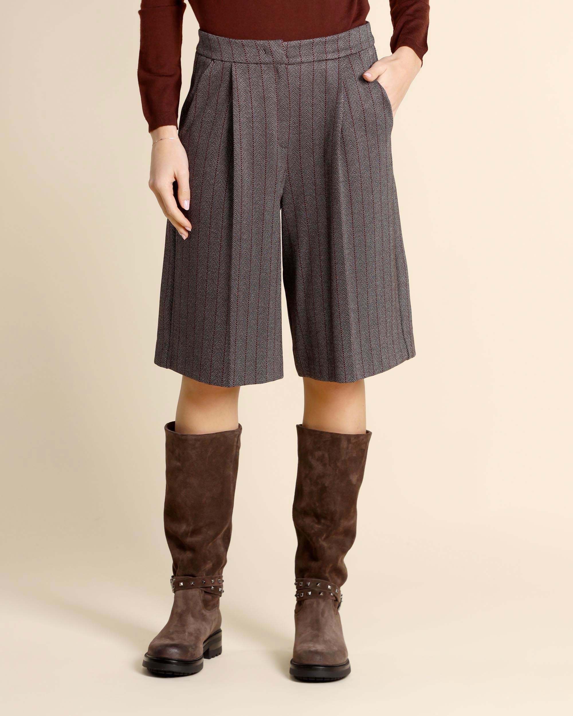 Bermuda gessati testa moro in misto viscosa stretch, linea morbida con pinces sul davanti, tasche alla francese sul davanti e tasche a filetto sul dietro, chiusura con gancio e zip nascosti, la modella indossa una tg.40, la modella ha le seguenti misure: altezza 175, seno 86,vita 65, fianchi 93, collezione donna I Blues Autunno Inverno 2025/26