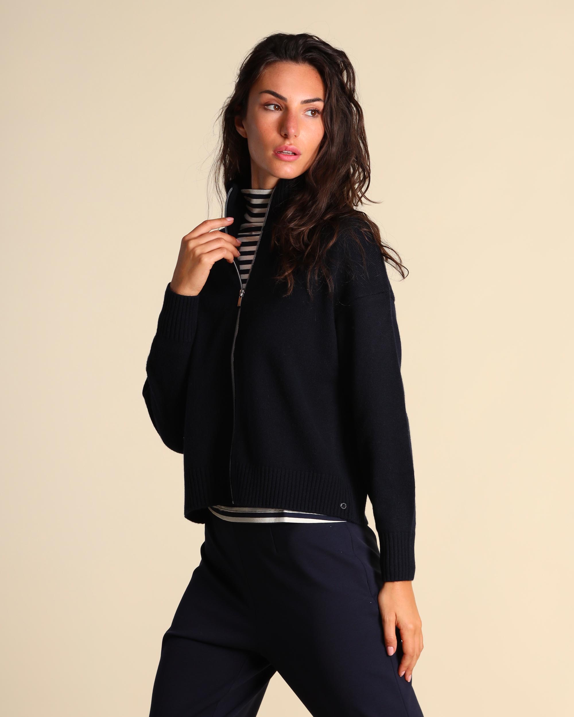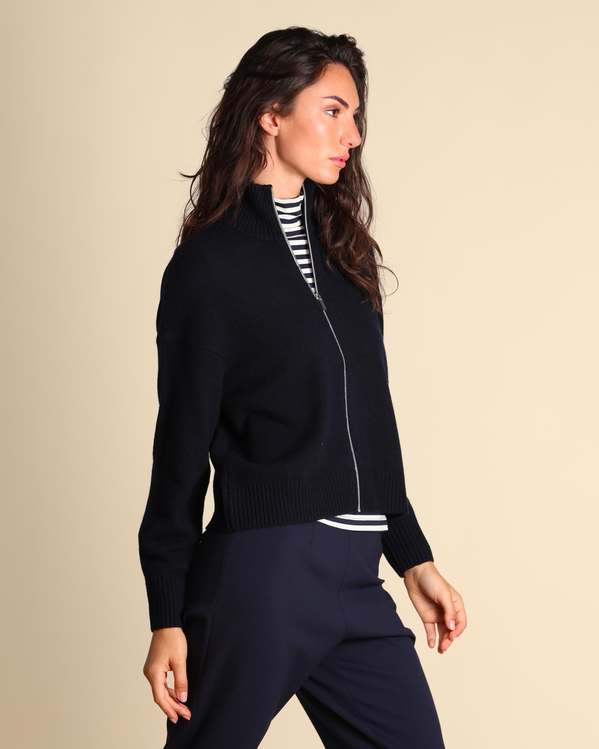 Cardigan blu navy in misto lana, viscosa e cashmere, collo alto, maniche lunghe, giro sceso, chiusura con zip, linea morbida, la modella indossa una tg.S, la modella ha le seguenti misure: altezza 179, seno 84, vita 63, fianchi 94, collezione donna Pennyblack Autunno Inverno 2025/26