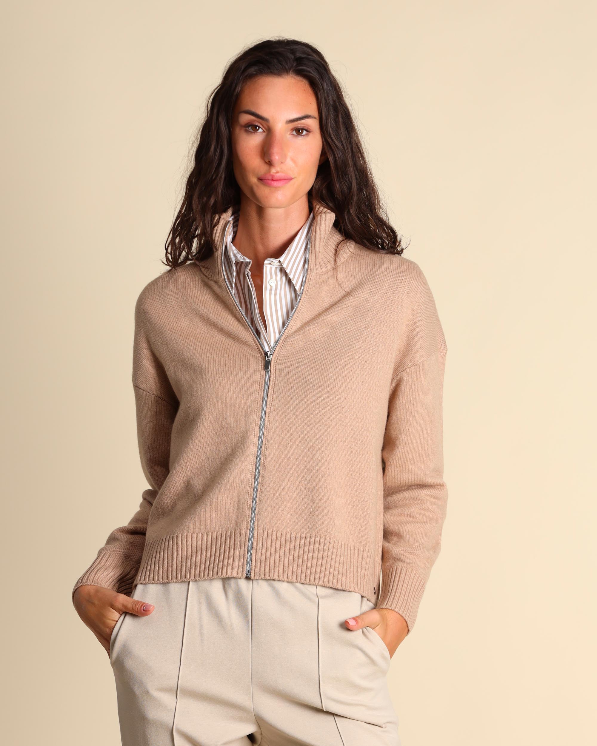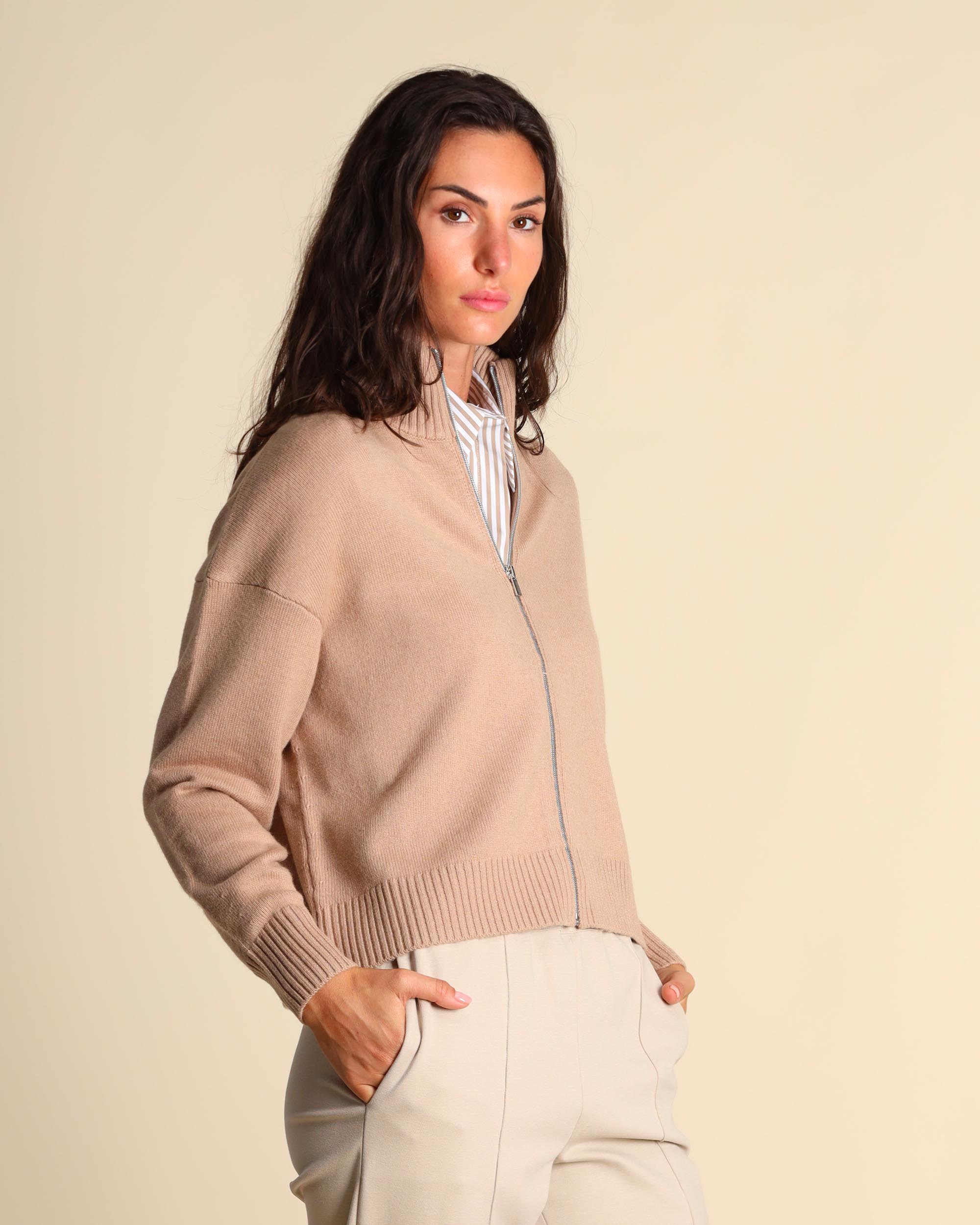 Cardigan color cammello in misto lana, viscosa e cashmere, collo alto, maniche lunghe, giro sceso, chiusura con zip, linea morbida, la modella indossa una tg.S, la modella ha le seguenti misure: altezza 179, seno 84, vita 63, fianchi 94, collezione donna Pennyblack Autunno Inverno 2025/26