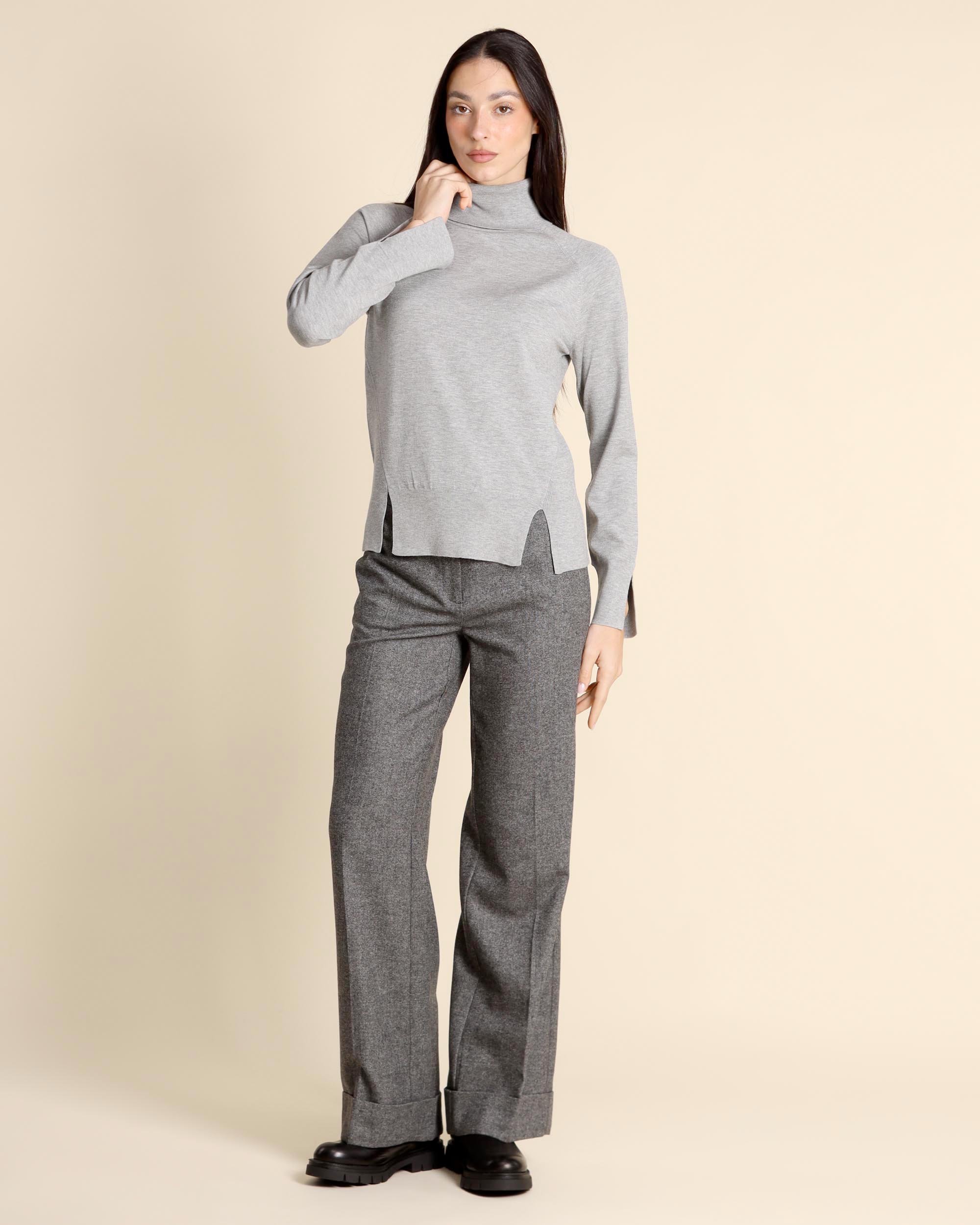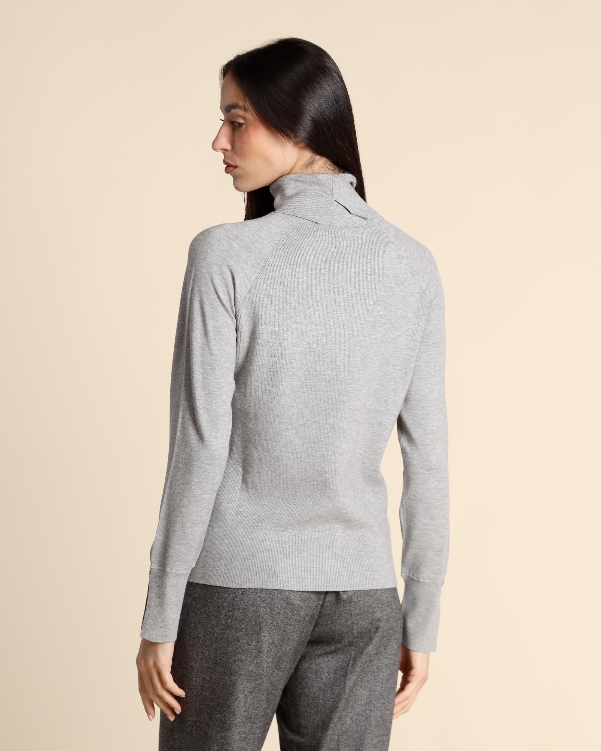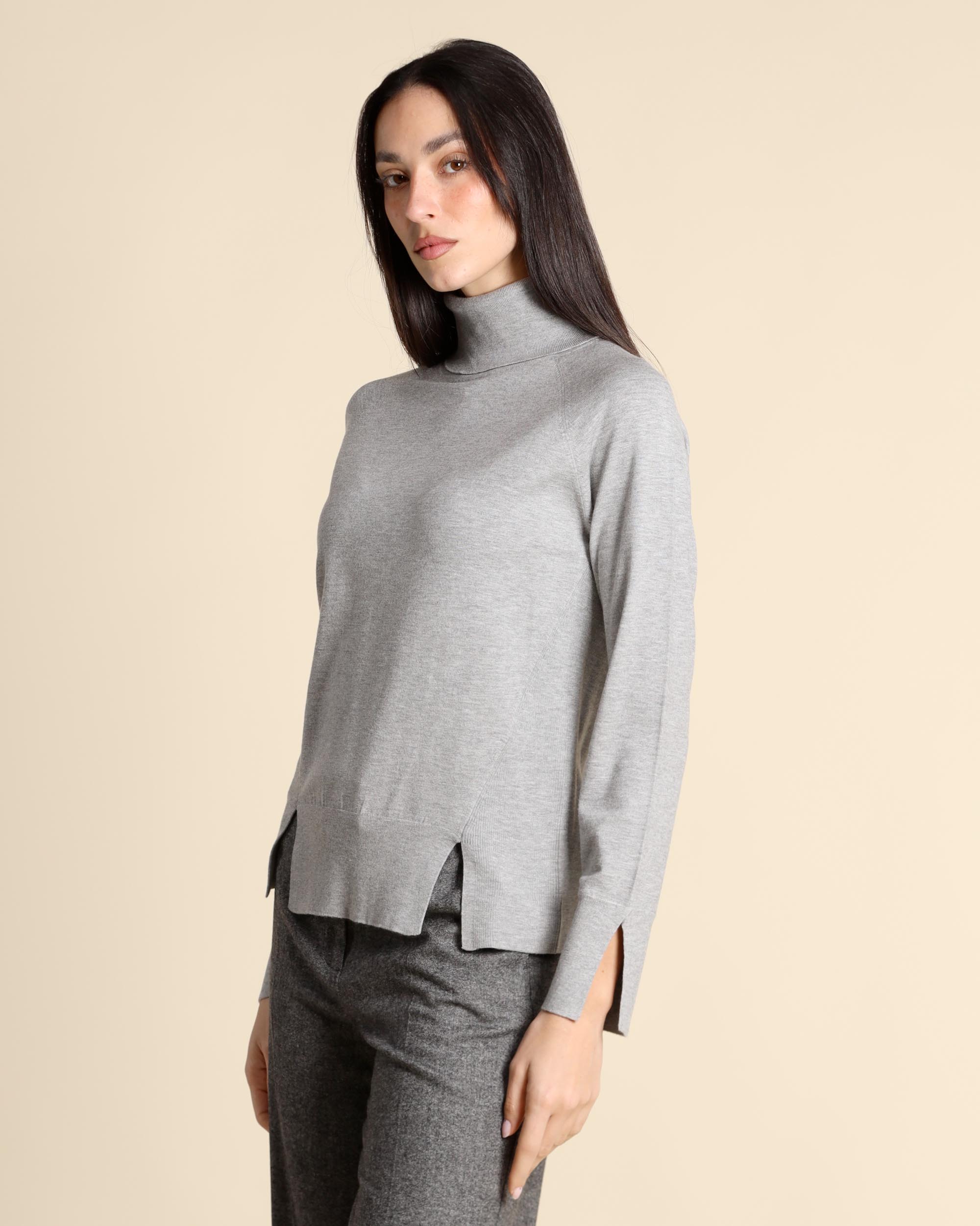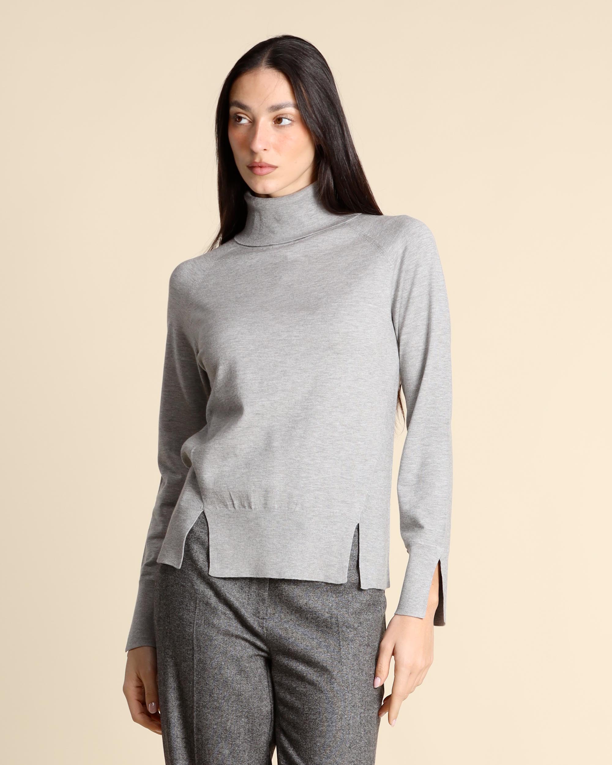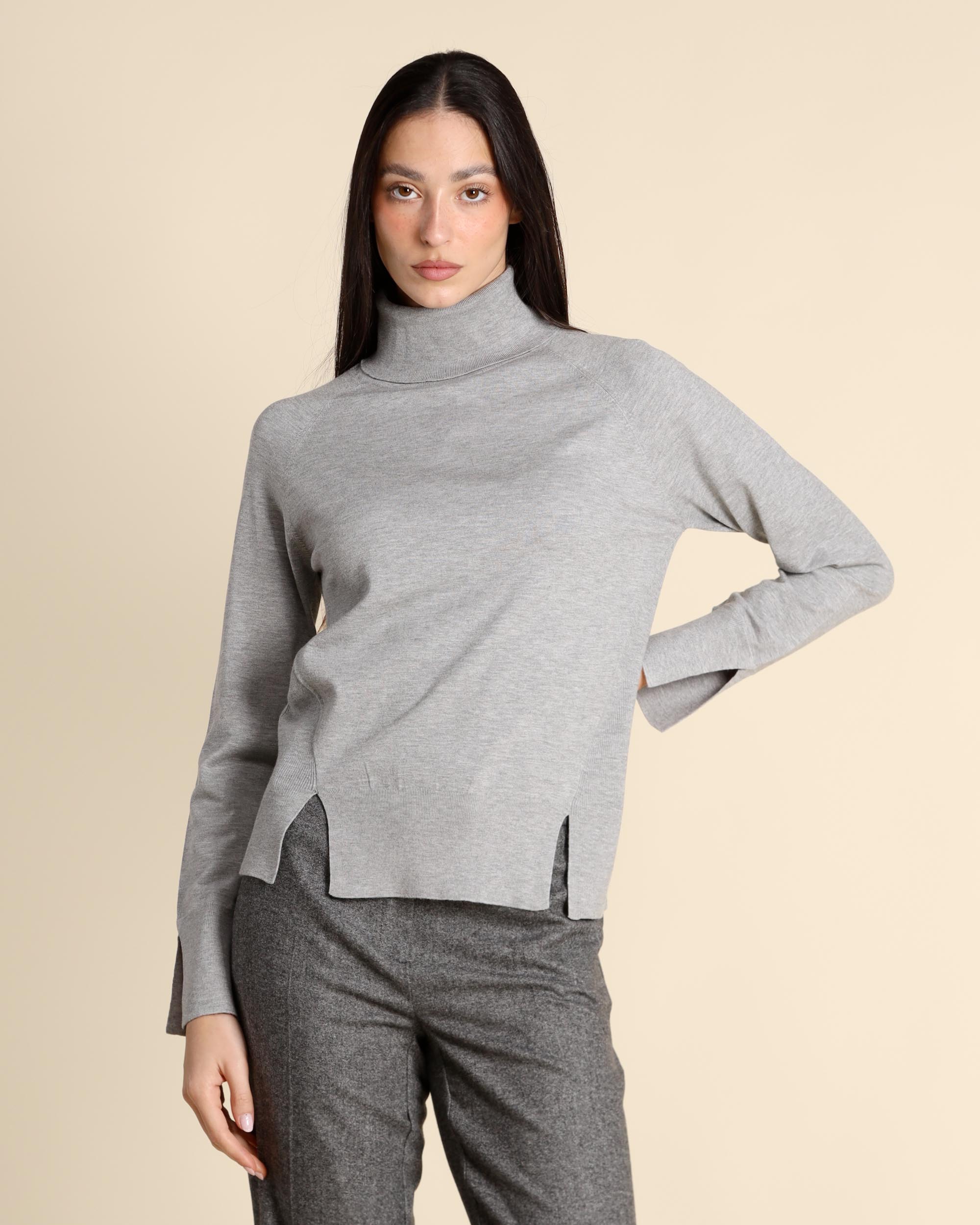 Maglia grigio melange in misto viscosa, collo alto, maniche lunghe raglan con spacco sul polso, linea semiaderente, la modella indossa una tg.S, la modella ha le seguenti misure: altezza 173, seno 84, vita 63, fianchi 94, collezione donna Emme by Marella Autunno Inverno 2025/26