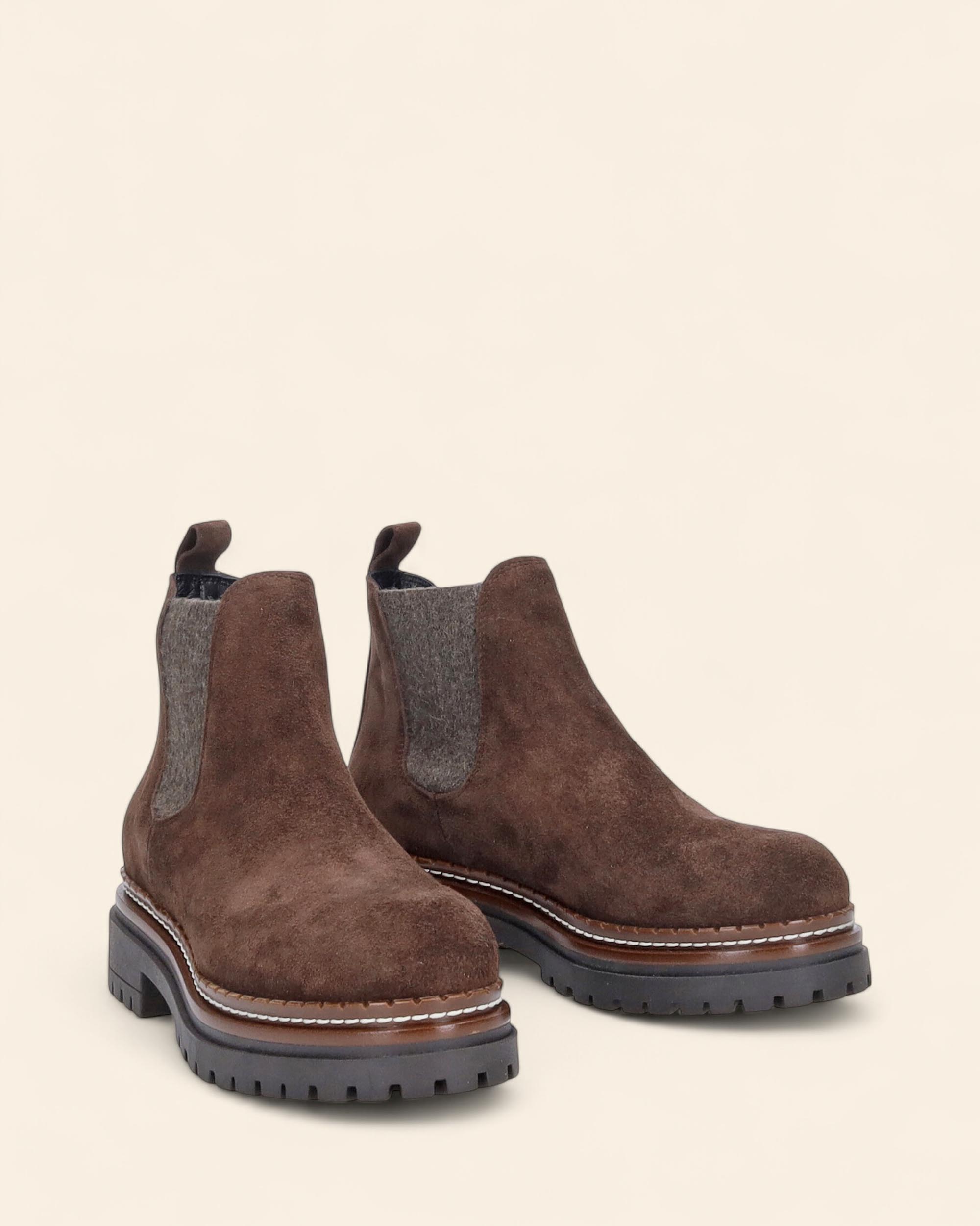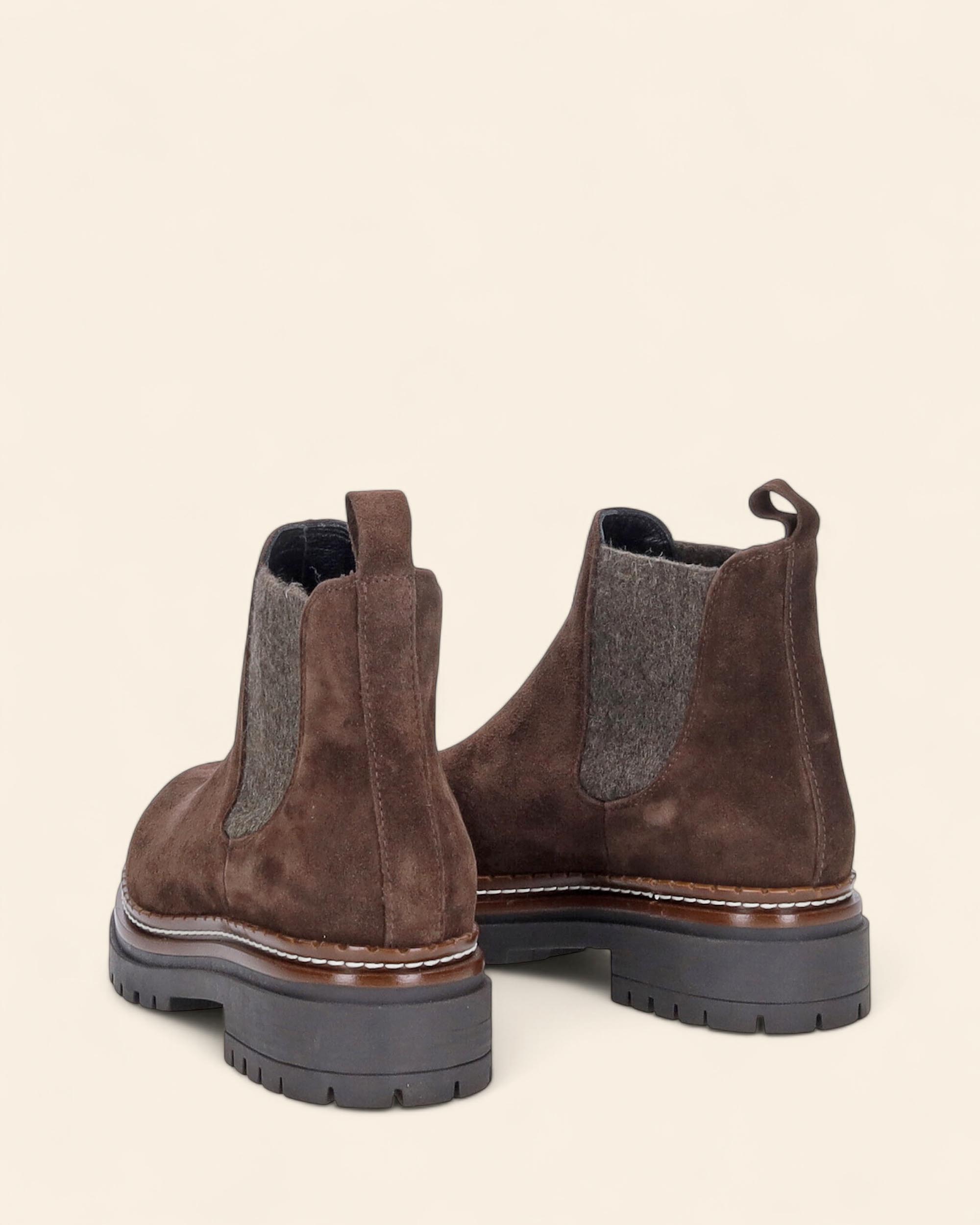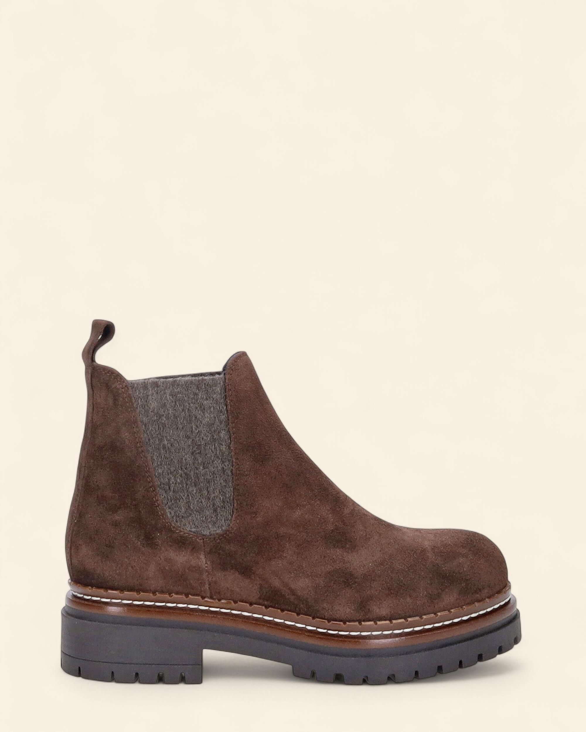 Beatles in camoscio marrone, elastico in lana in tinta, tirante posteriore in tinta, sottopiede in pelle, suola in gomma, dettaglio impuntura a contrasto, tacco 40mm, made in Italy, collezione Imma Autunno Inverno 25/26