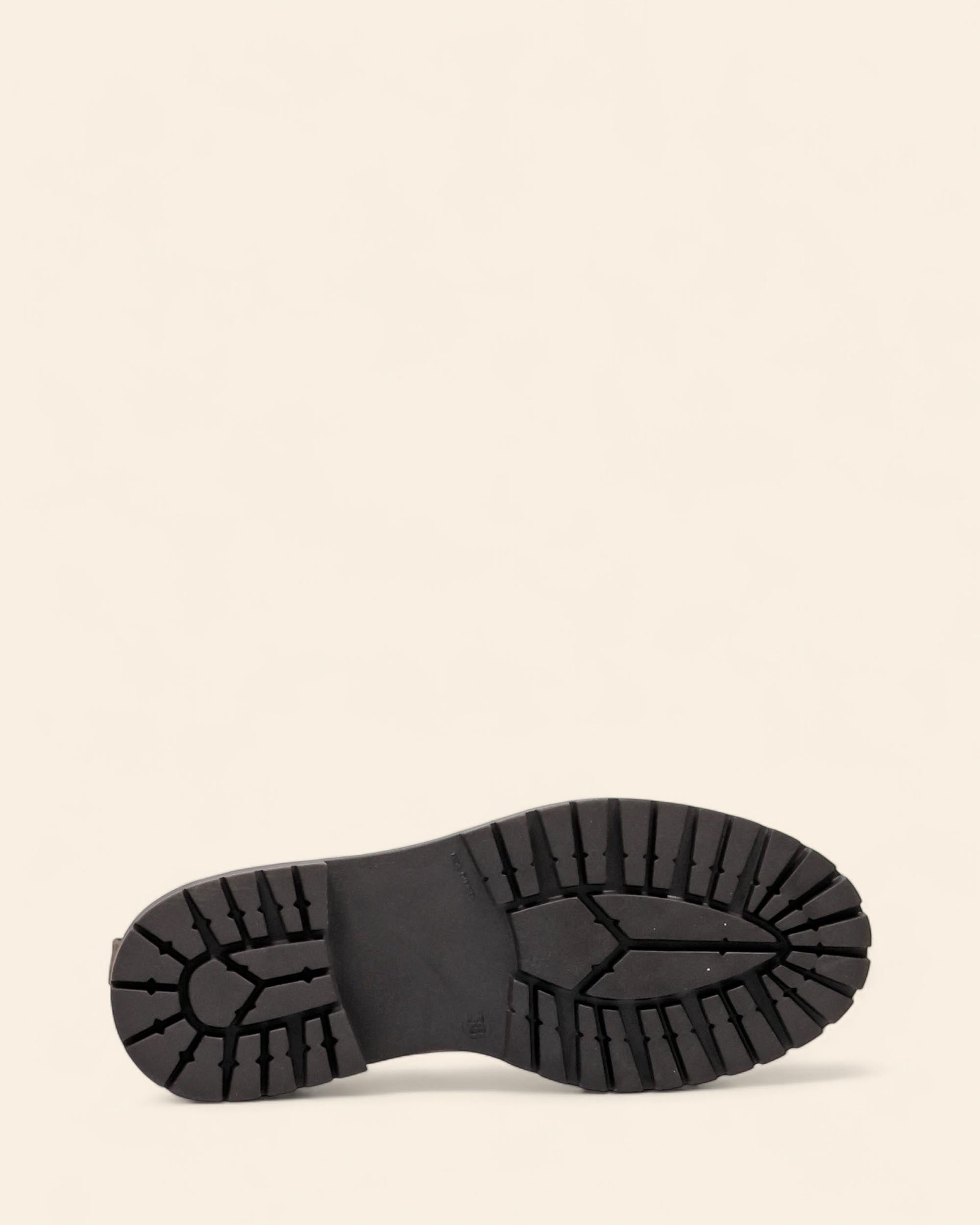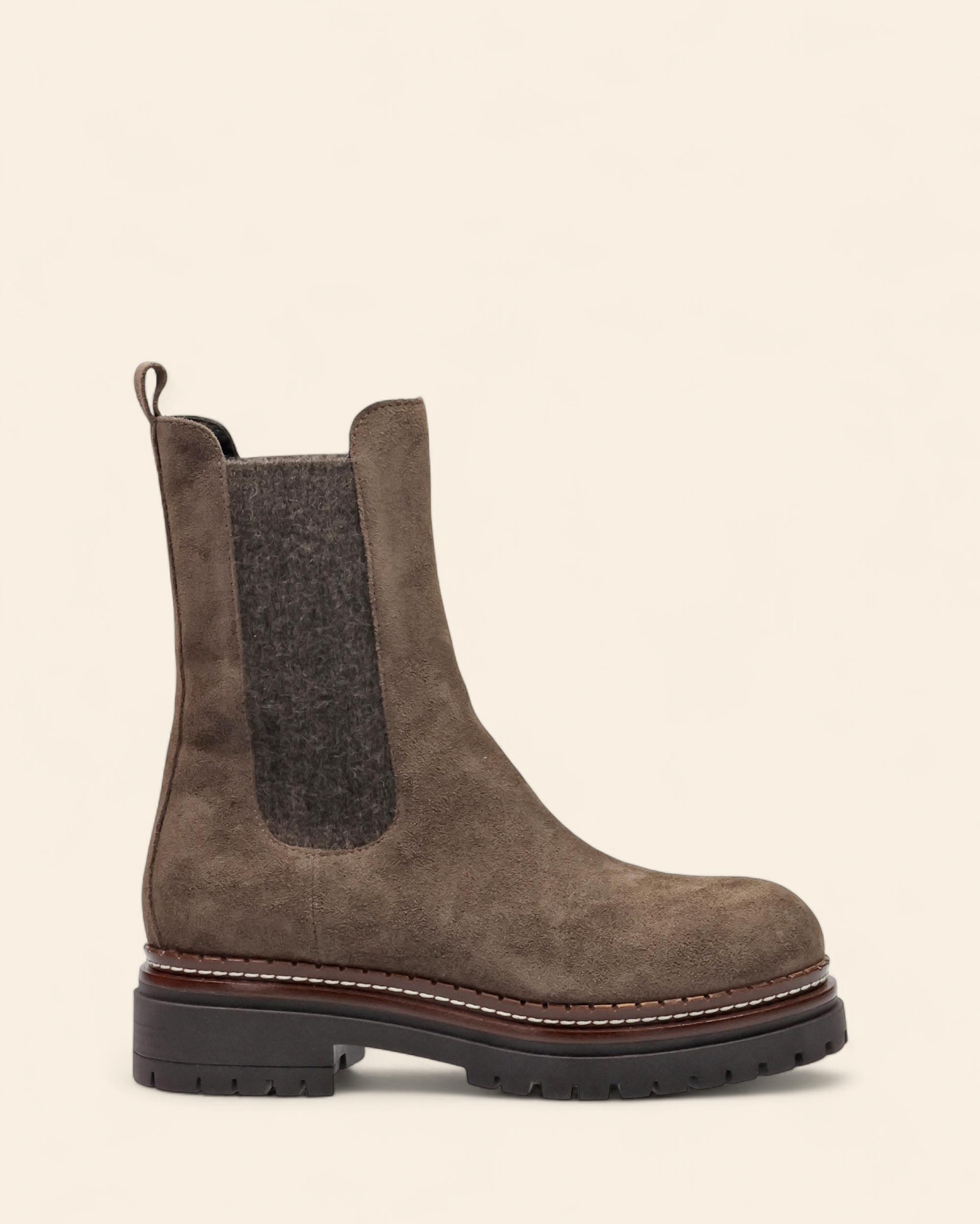 Beatles in camoscio tortora, elastico in lana in tinta, tirante posteriore in tinta, sottopiede in pelle, suola in gomma, dettaglio impuntura a contrasto, tacco 40mm, made in Italy, collezione Imma Autunno Inverno 25/26