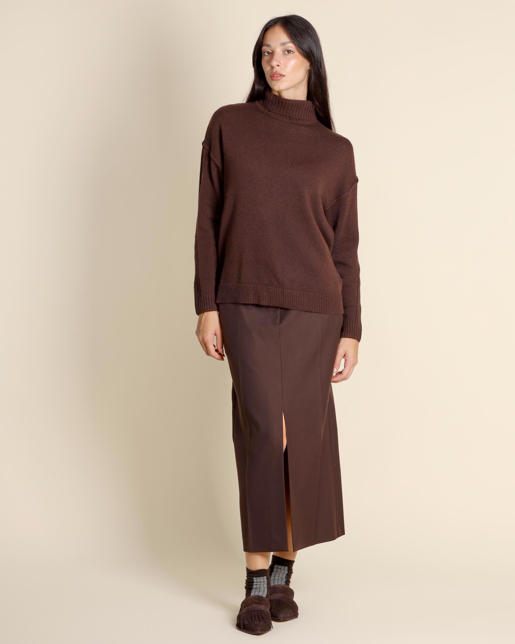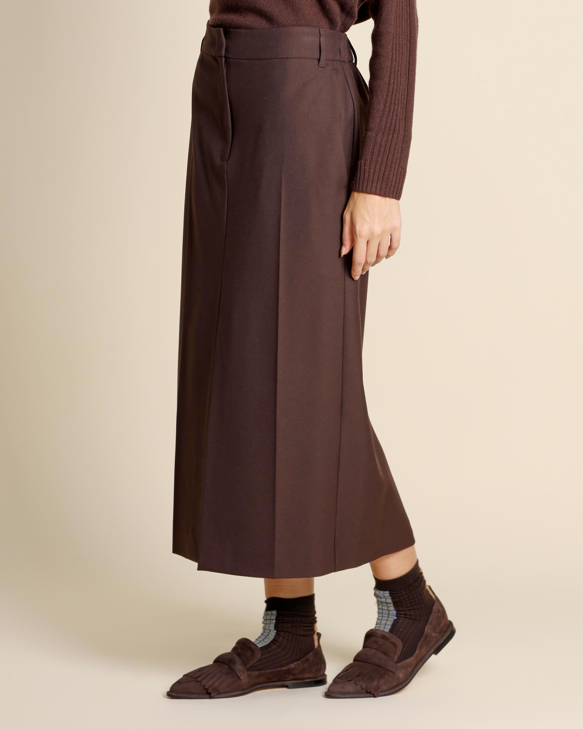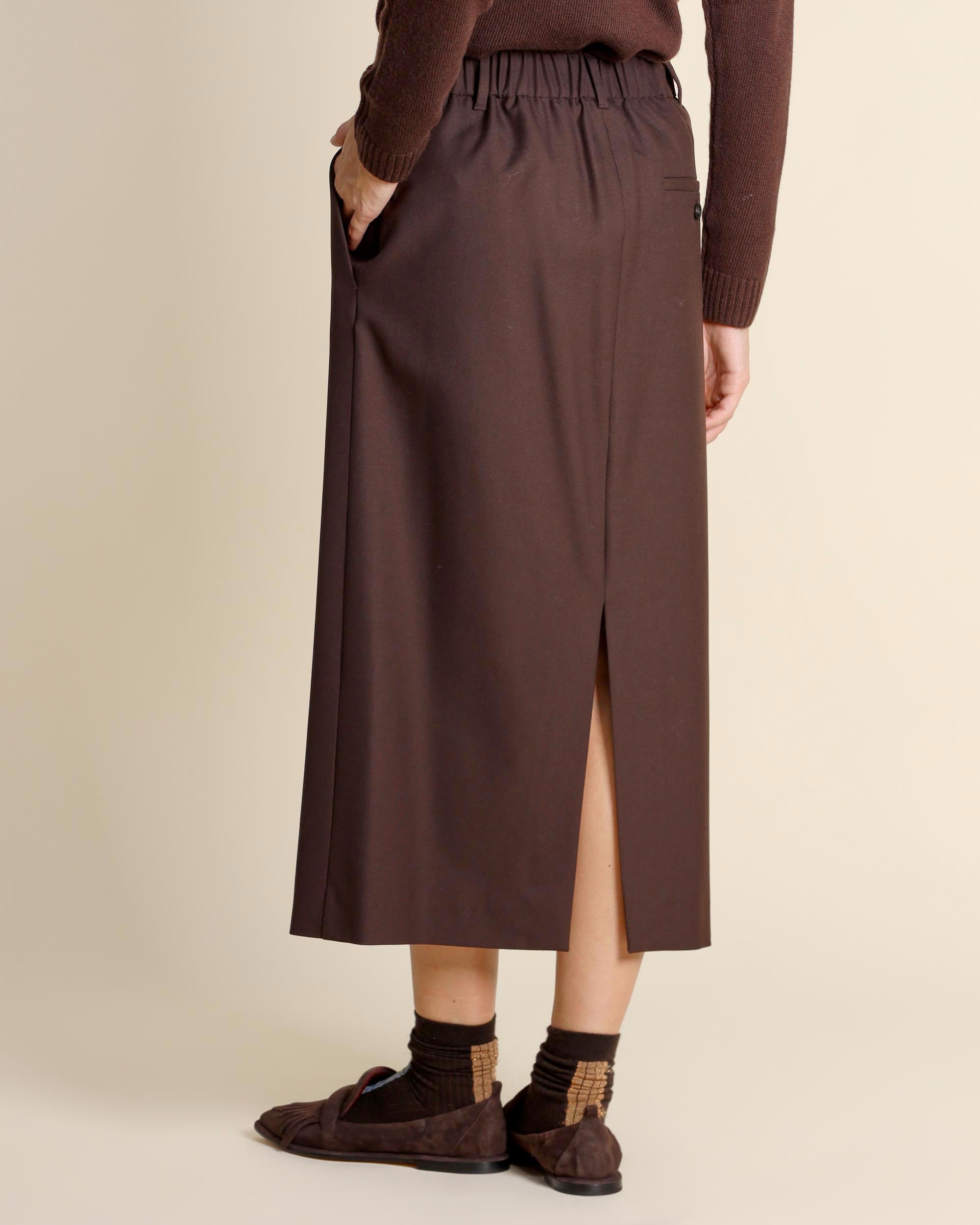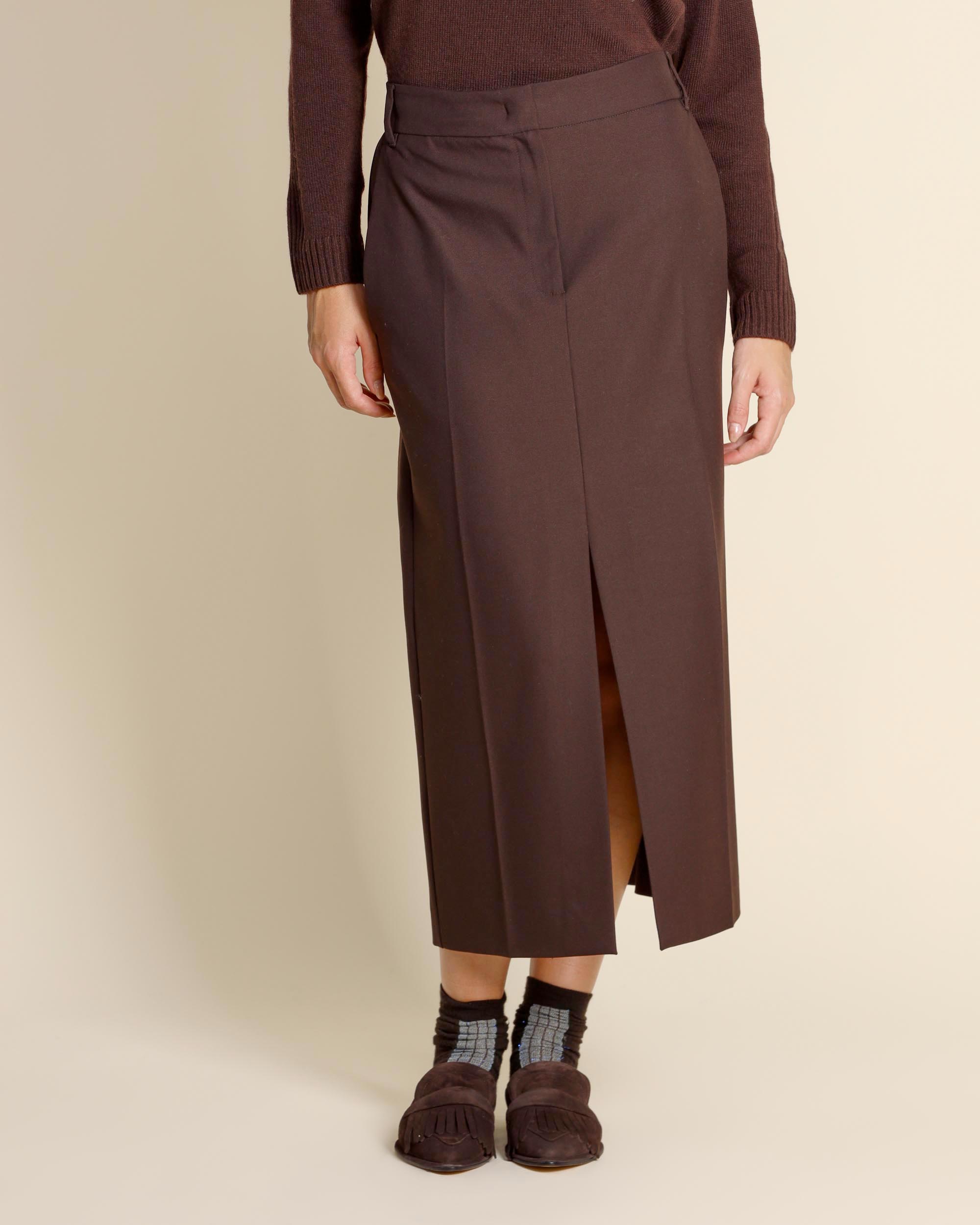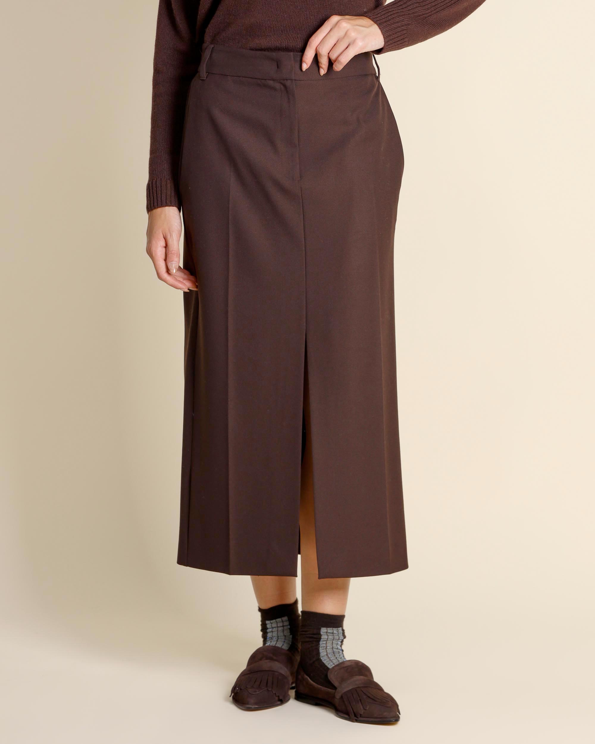 Gonna midi testa moro in misto viscosa stretch, chiusura con gancio e zip nascosta, tasche alla francese sul davanti e tasca a filetto sul dietro, linea dritta, spacco centrale davanti e dietro, sfoderata, la modella indossa una tg.40, la modella ha le seguenti misure: altezza 173, seno 86,vita 65, fianchi 93, collezione donna I Blues Autunno Inverno 2025/26