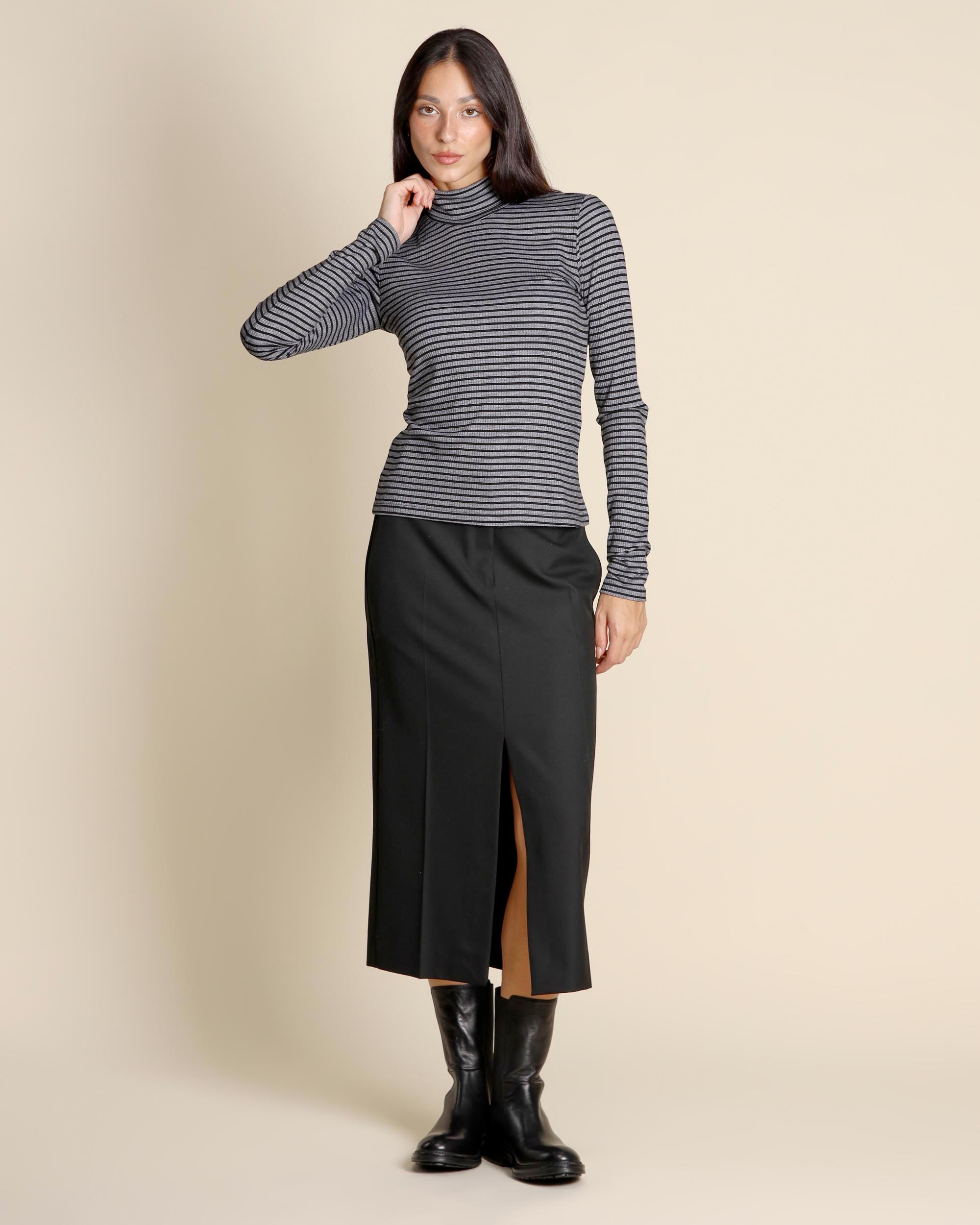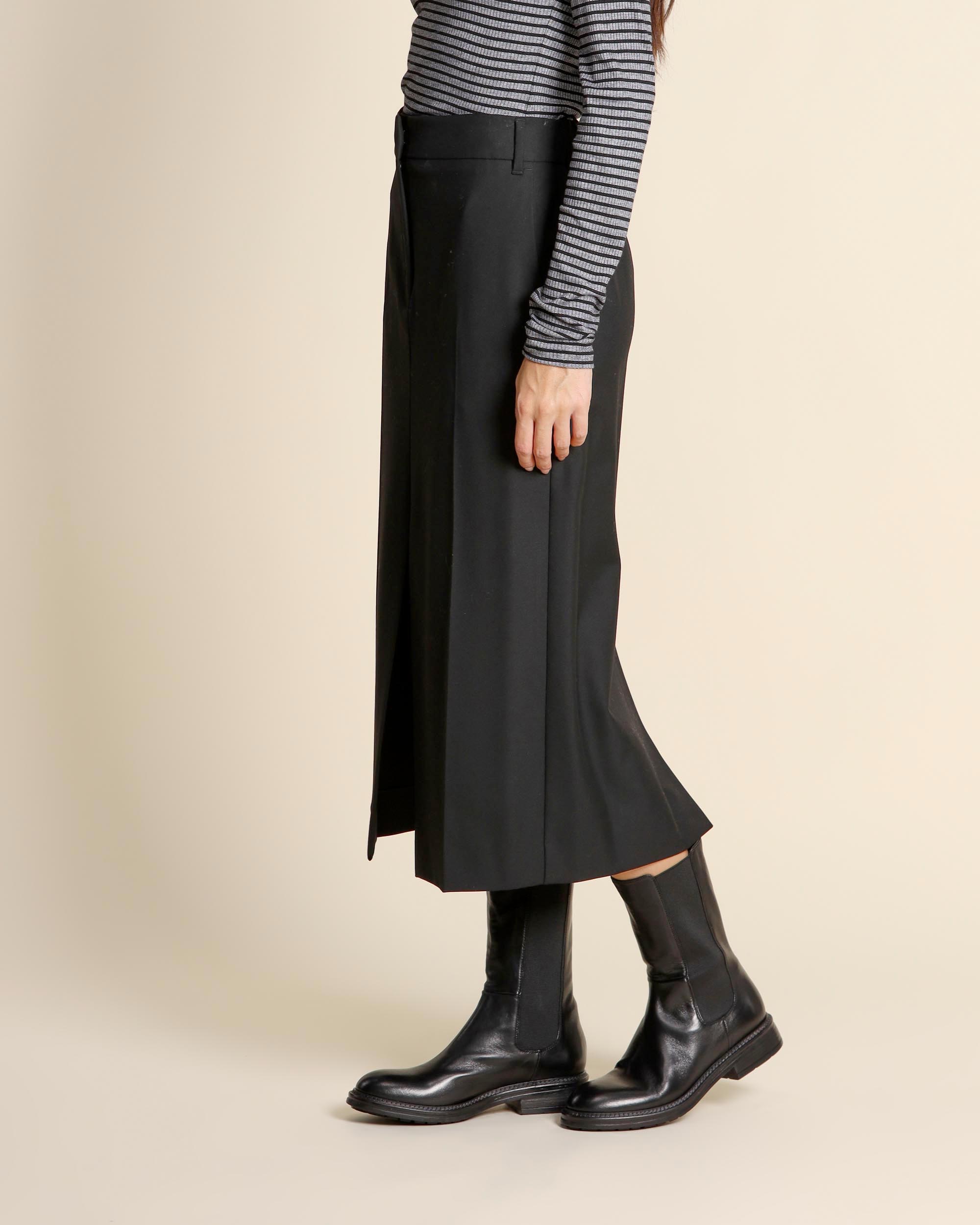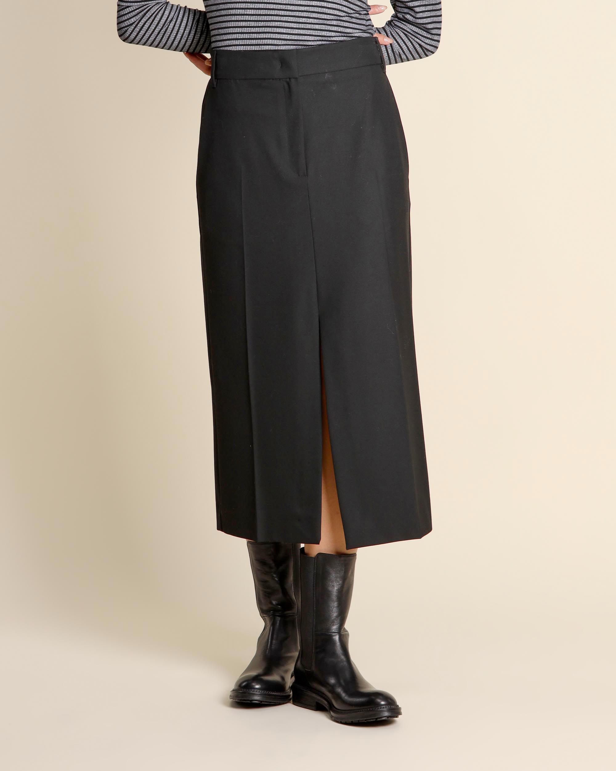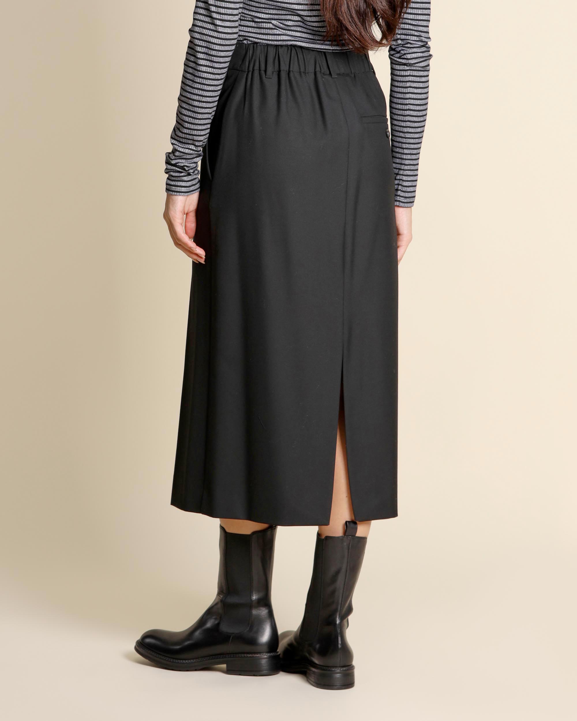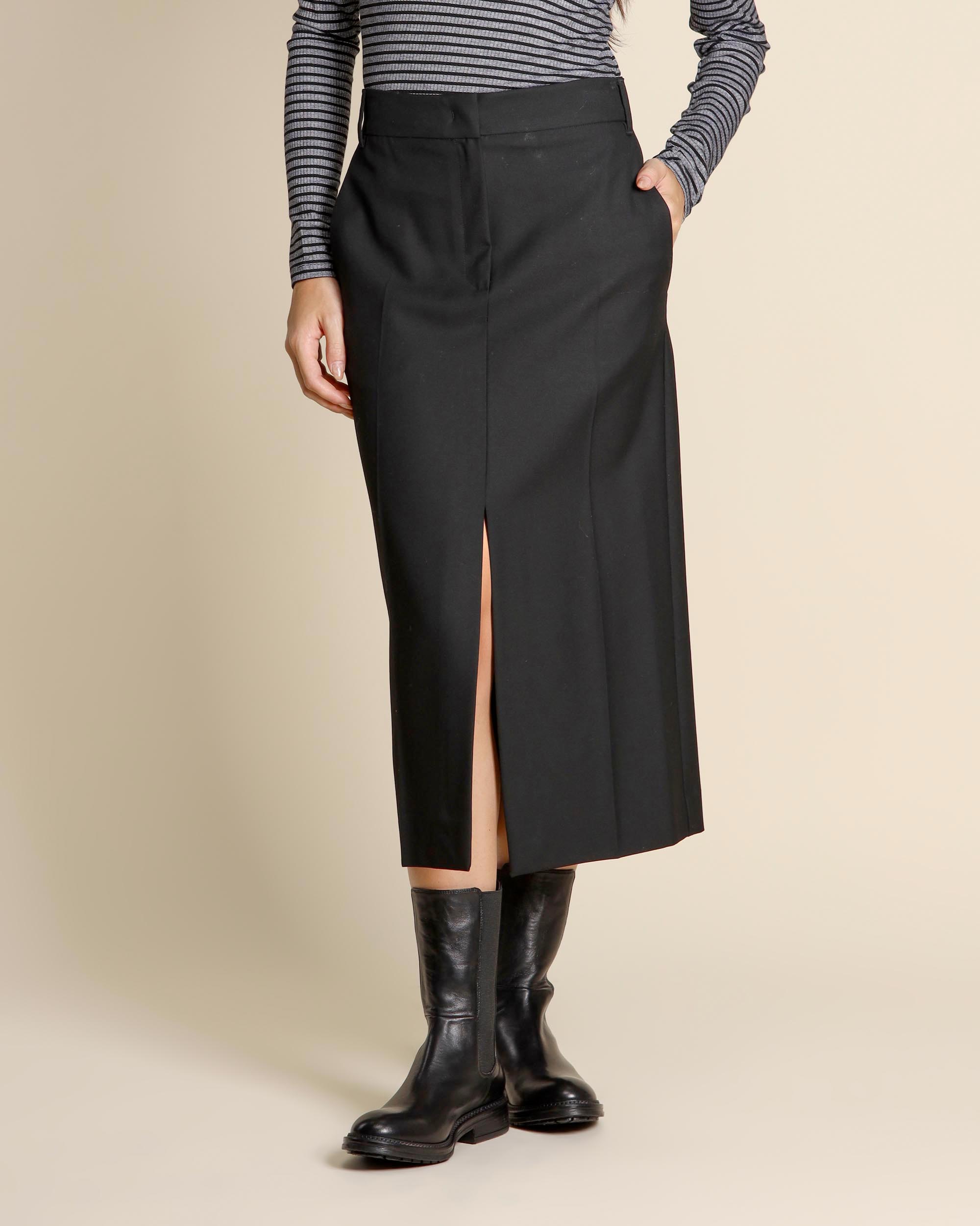 Gonna midi nera in misto viscosa stretch, chiusura con gancio e zip nascosta, tasche alla francese sul davanti e tasca a filetto sul dietro, linea dritta, spacco centrale davanti e dietro, sfoderata, la modella indossa una tg.40, la modella ha le seguenti misure: altezza 173, seno 86,vita 65, fianchi 93, collezione donna I Blues Autunno Inverno 2025/26