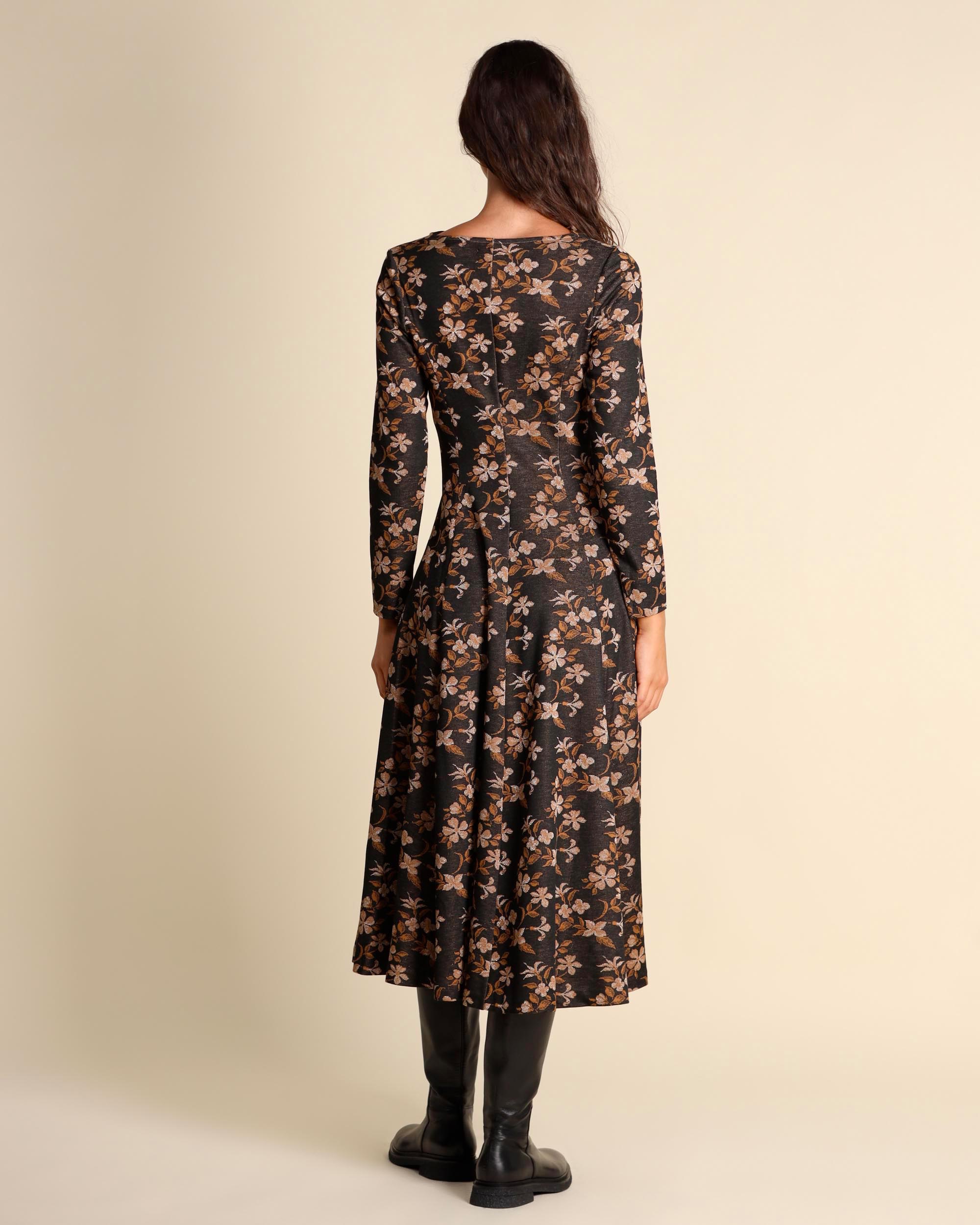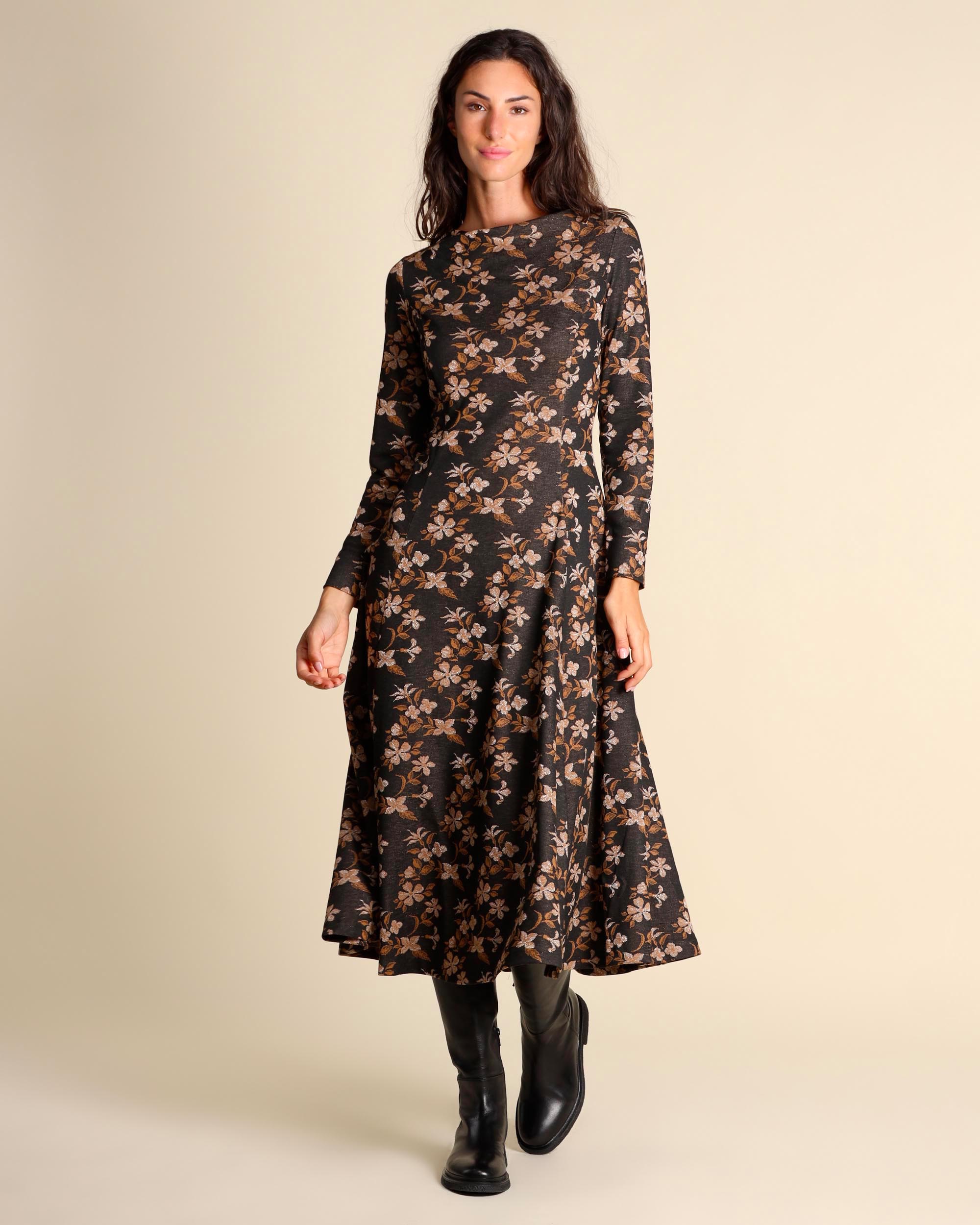 Abito lungo jacquard color ebano in jersey di misto viscosa e lurex, linea aderente nel busto e svasato sul fondo, maniche tre quarti, sfoderato, la modella indossa una tg.S, la modella ha le seguenti misure: altezza 178, seno 86,vita 65, fianchi 93, collezione donna Niù Autunno Inverno 2025/26