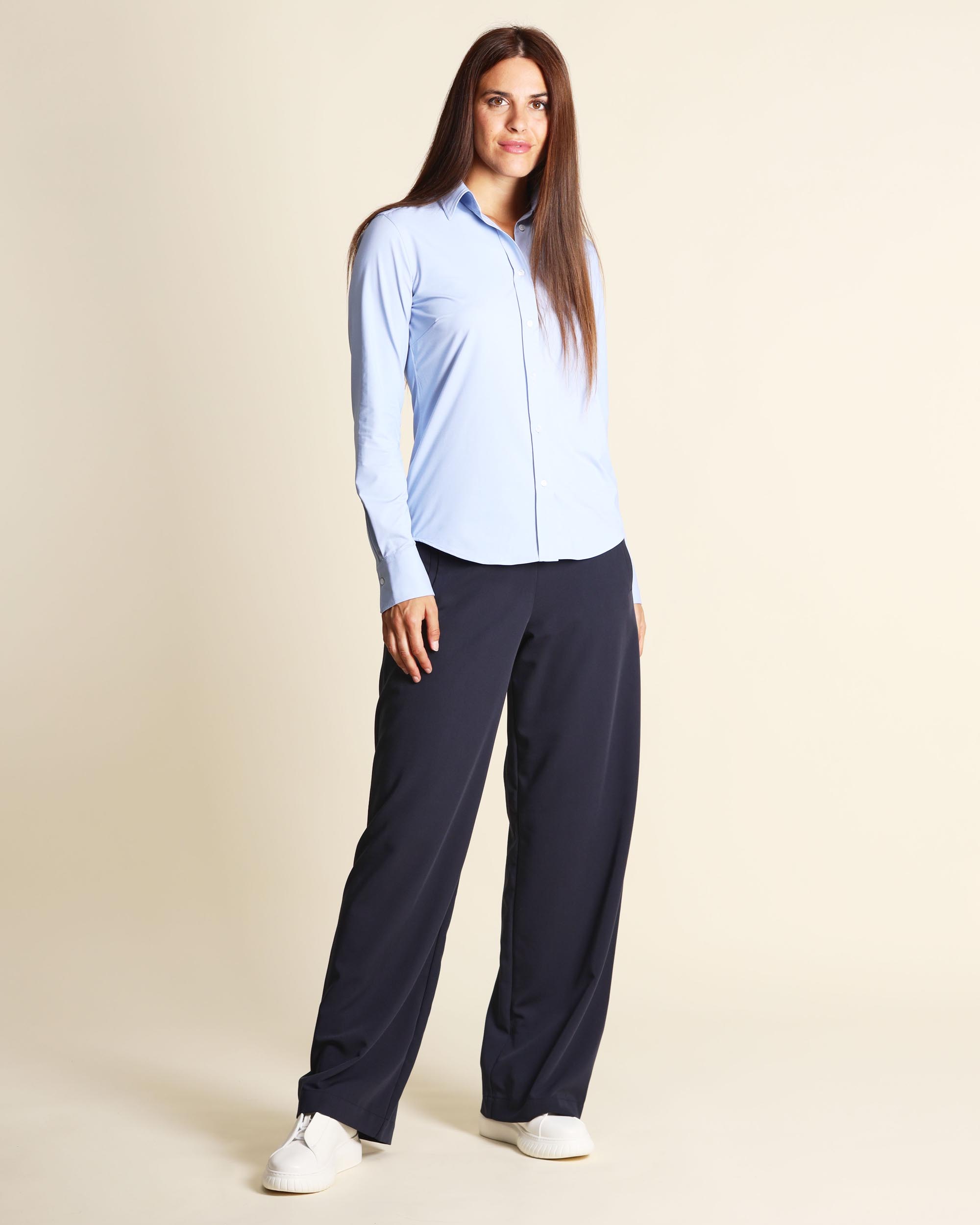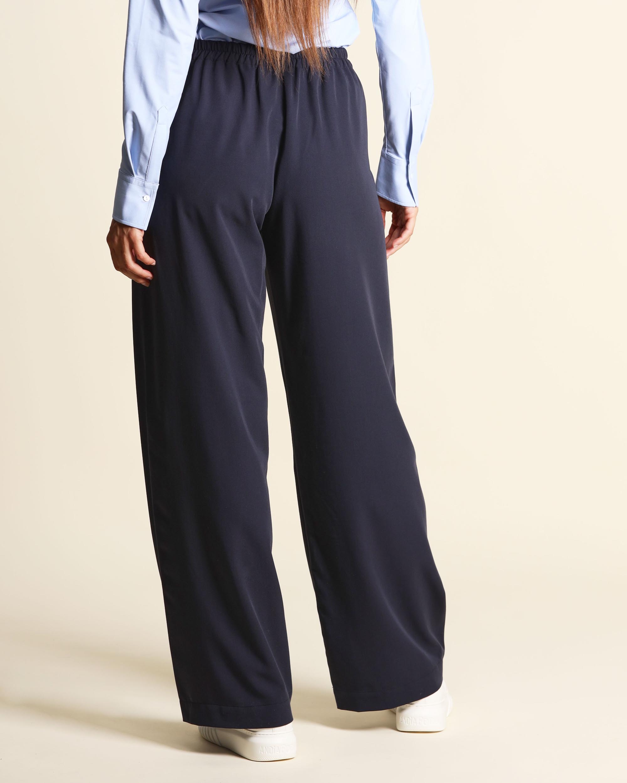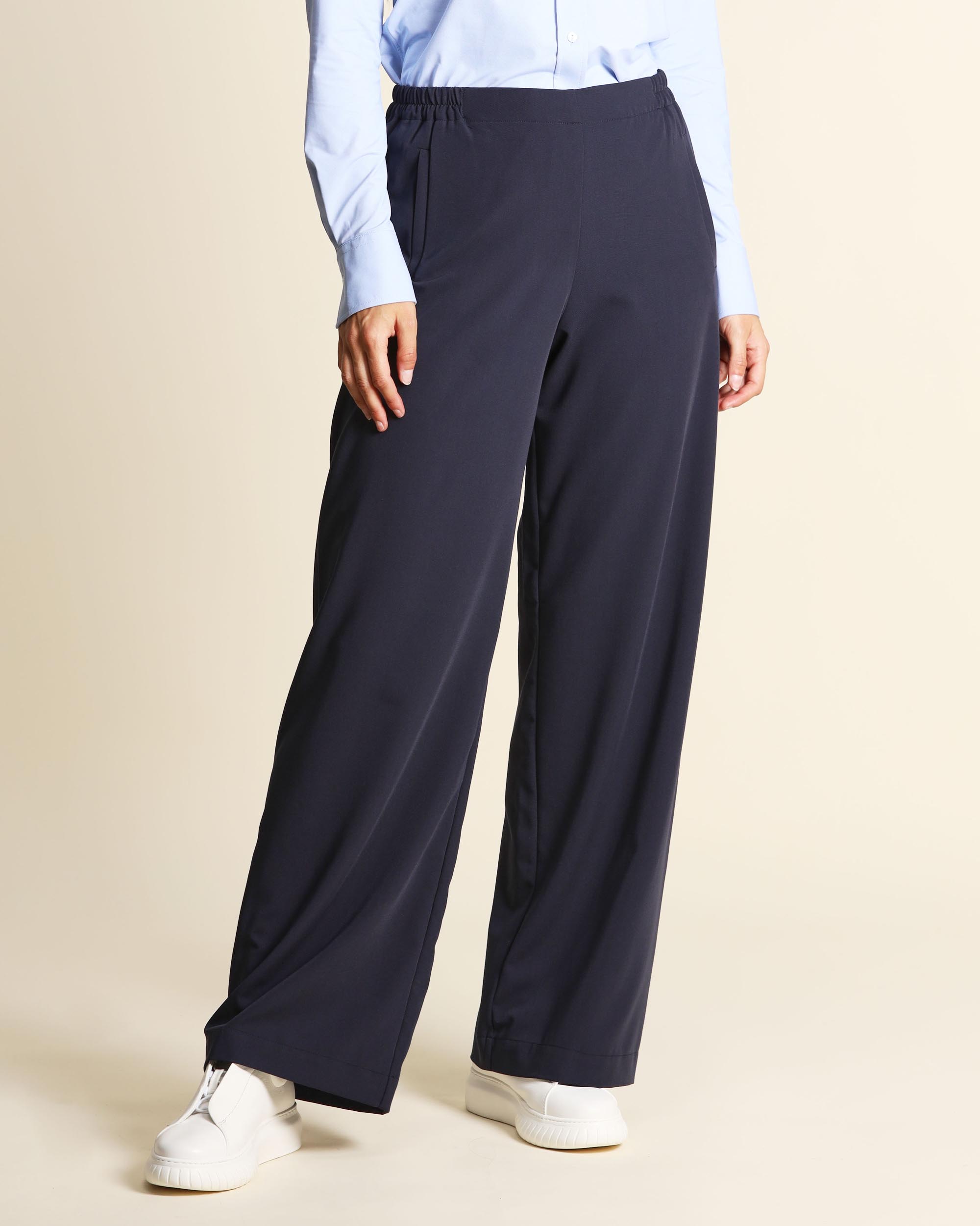 Pantaloni bojan blu in misto viscosa stretch, vita elastica sul dietro, tasche a filetto, linea ampia, la modella indossa una tg.S, la modella ha le seguenti misure: altezza 178, seno 86,vita 65, fianchi 93, collezione donna Niù Autunno Inverno 2025/26