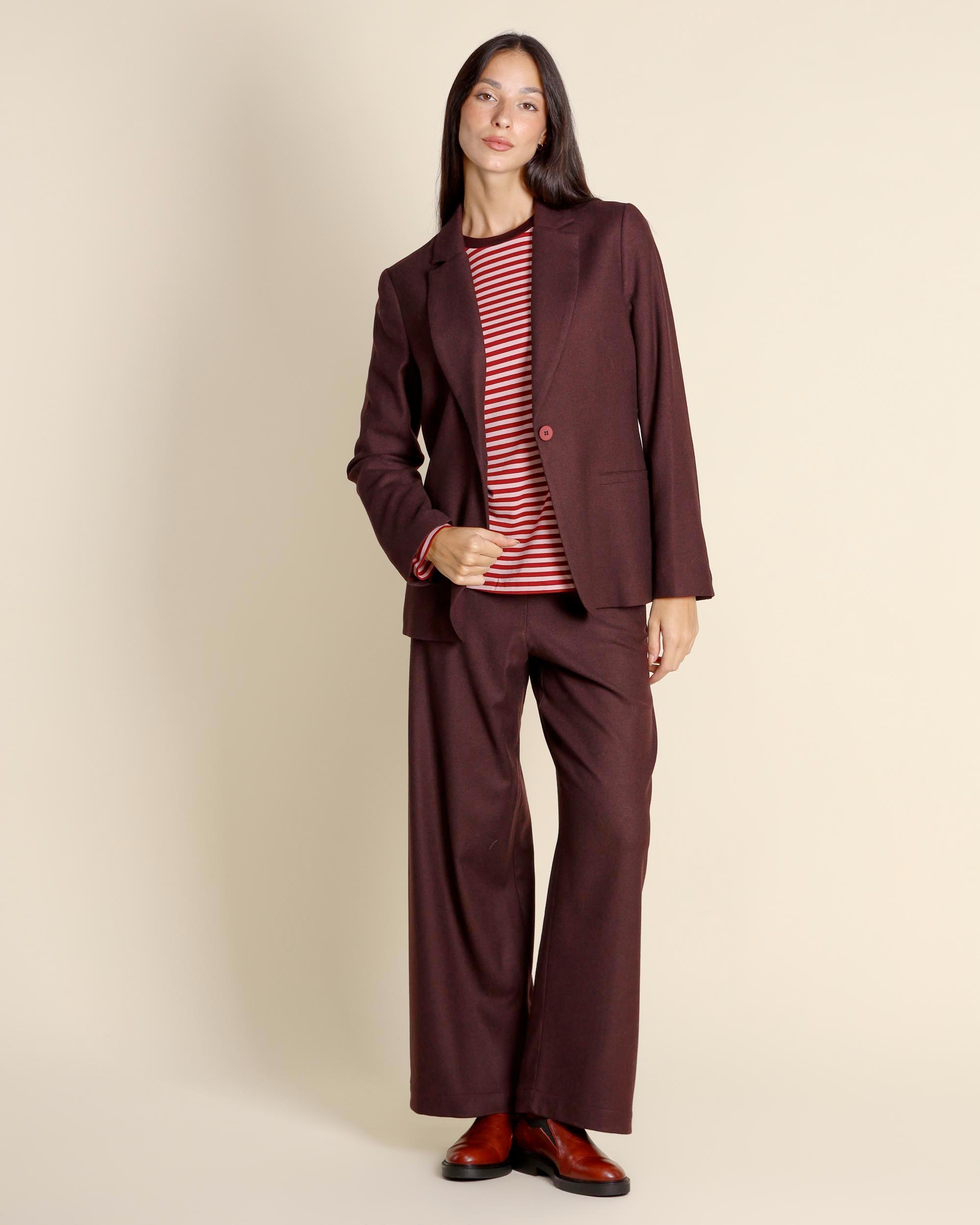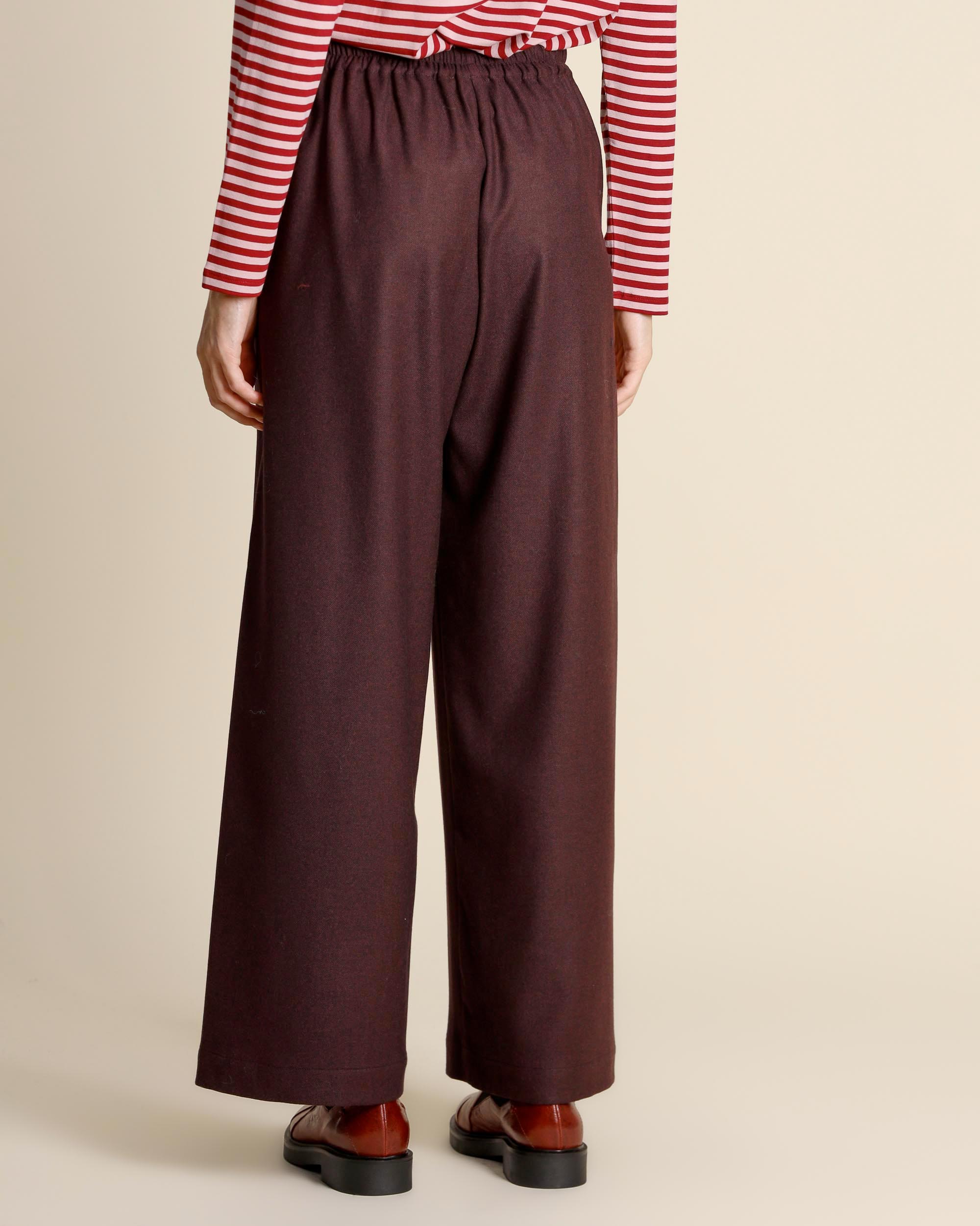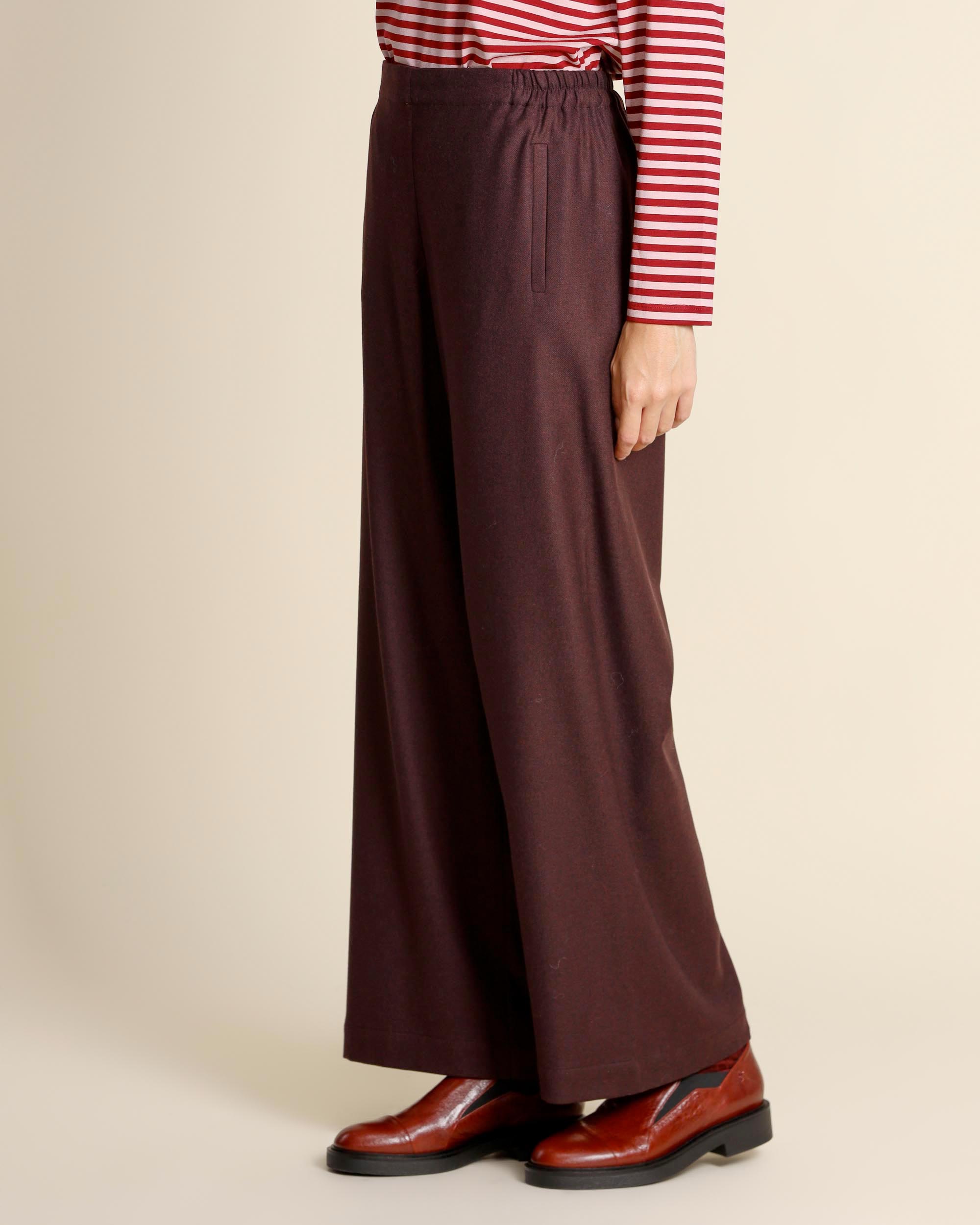 Pantaloni bojan bordeaux in flanella di misto lana e viscosa stretch, vita elastica sul dietro, linea ampia, tasche a filetto, la modella indossa una tg.S, la modella ha le seguenti misure: altezza 173, seno 86,vita 65, fianchi 93, collezione donna Niù Autunno Inverno 2025/26