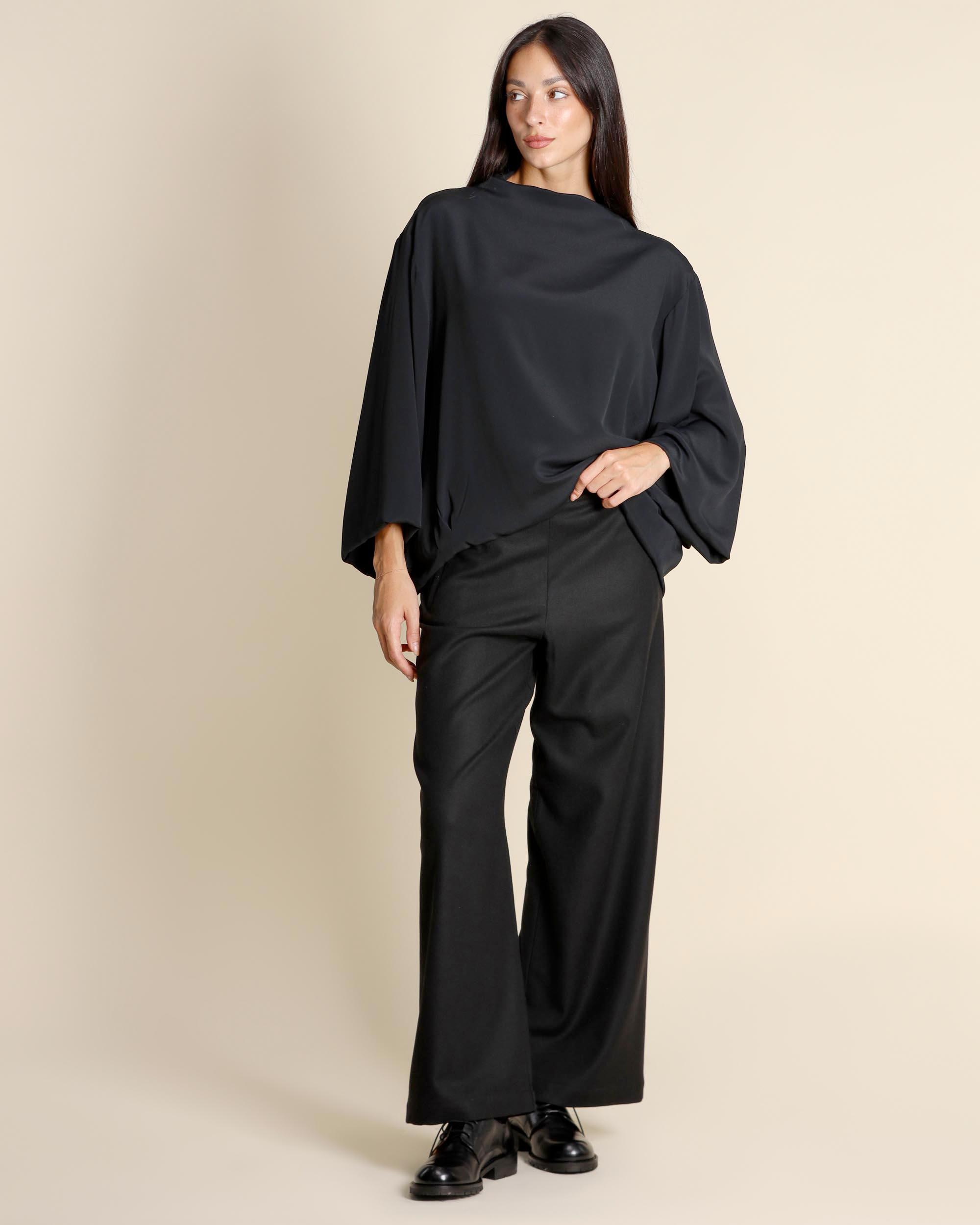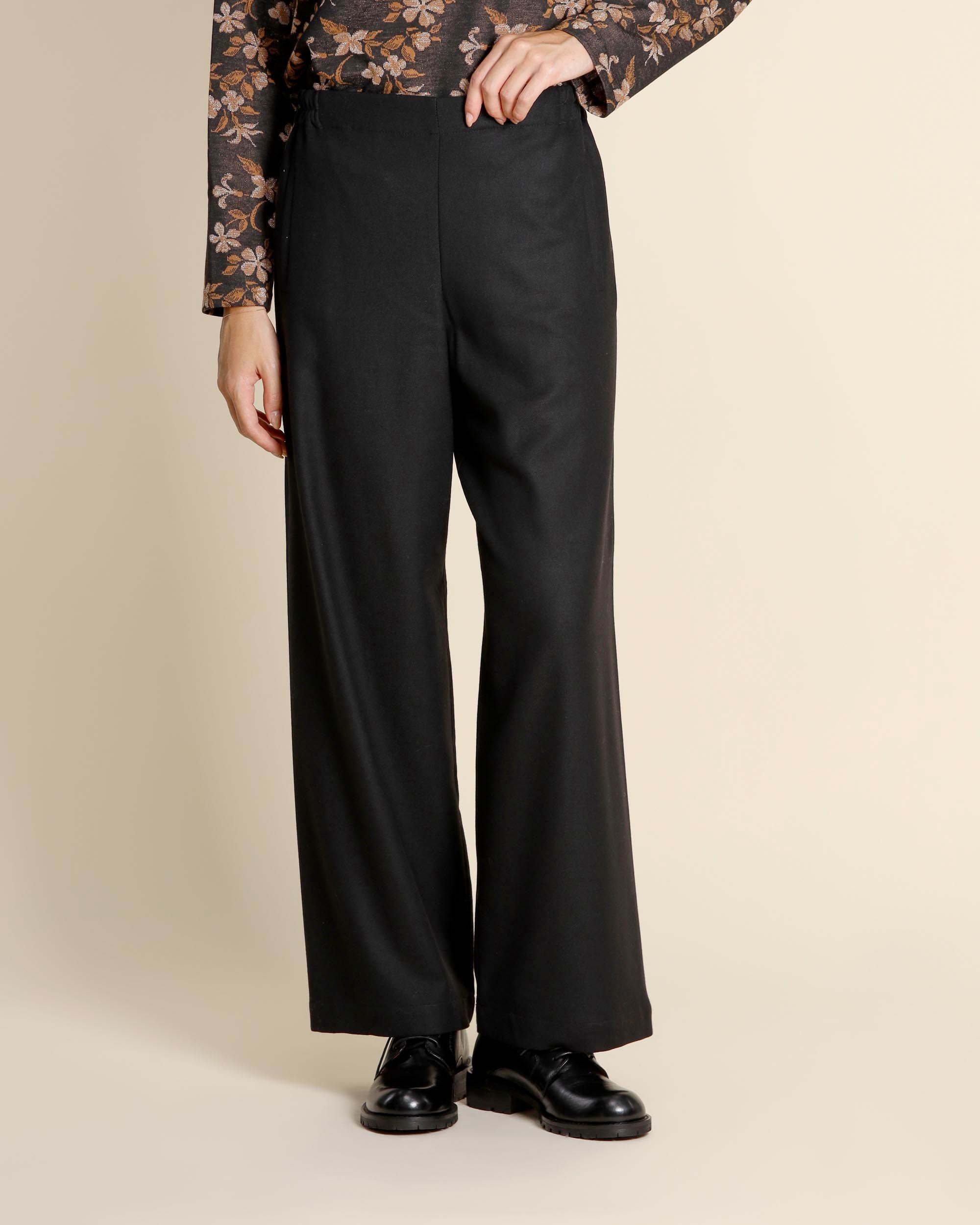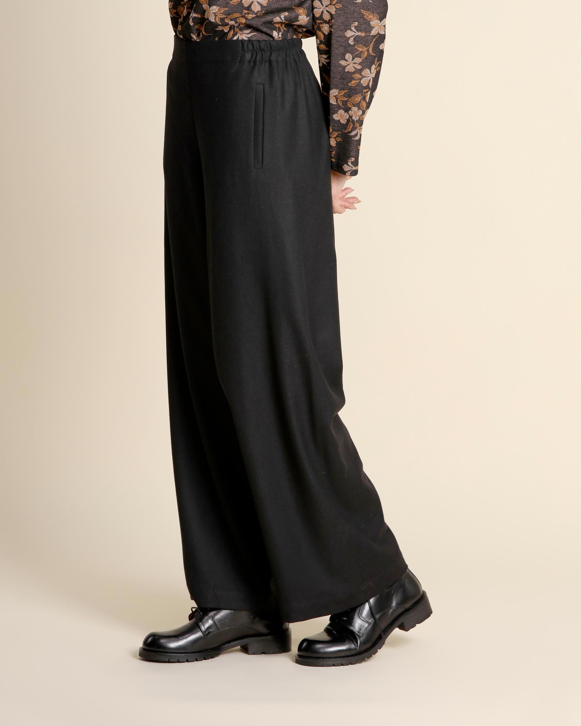 Pantaloni bojan neri in flanella di misto lana e viscosa stretch, vita elastica sul dietro, linea ampia, tasche a filetto, la modella indossa una tg.S, la modella ha le seguenti misure: altezza 173, seno 86,vita 65, fianchi 93, collezione donna Niù Autunno Inverno 2025/26