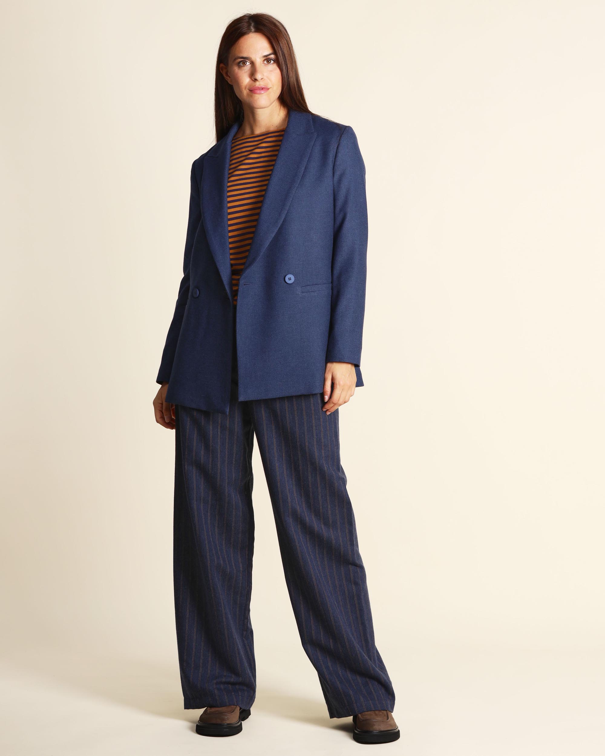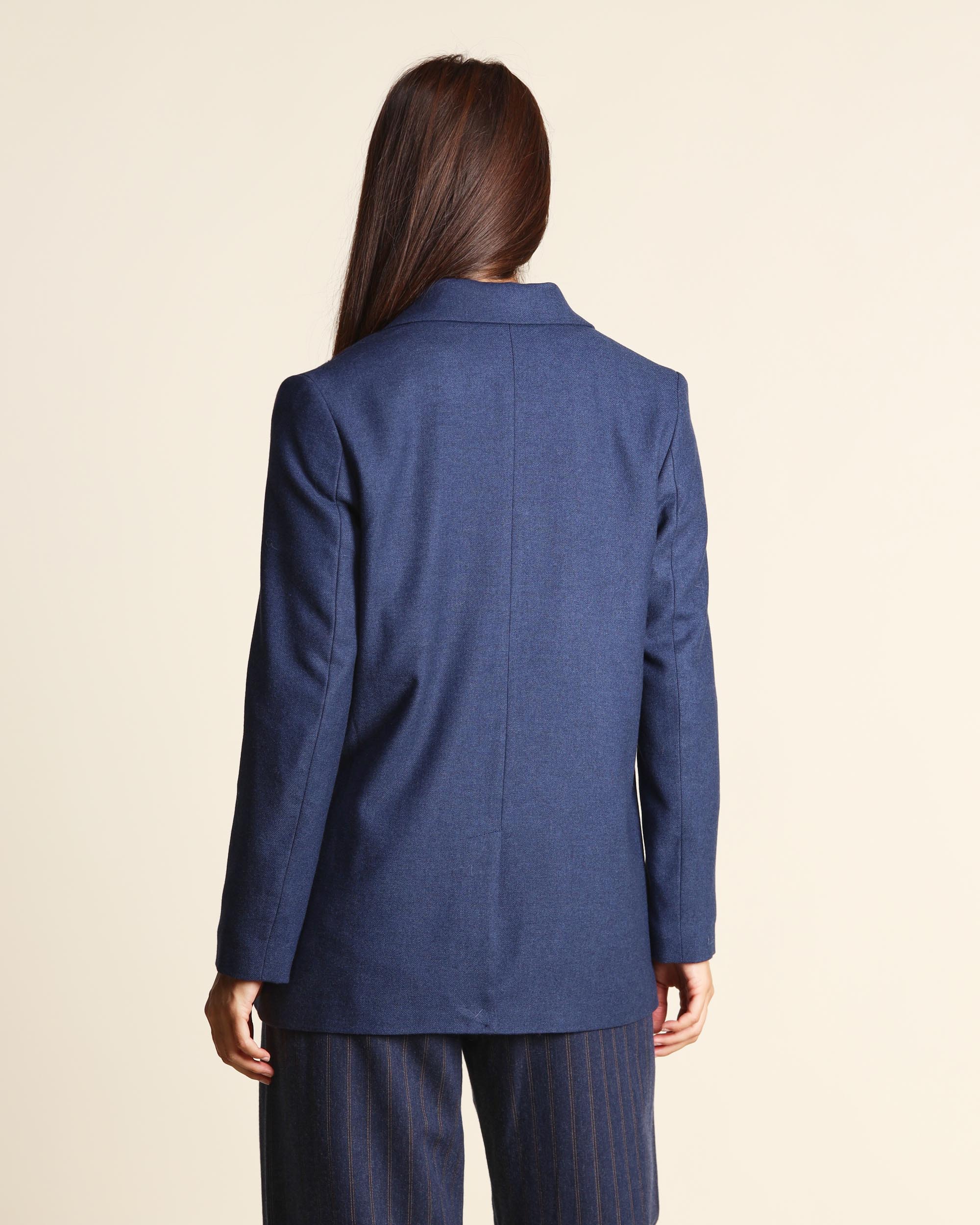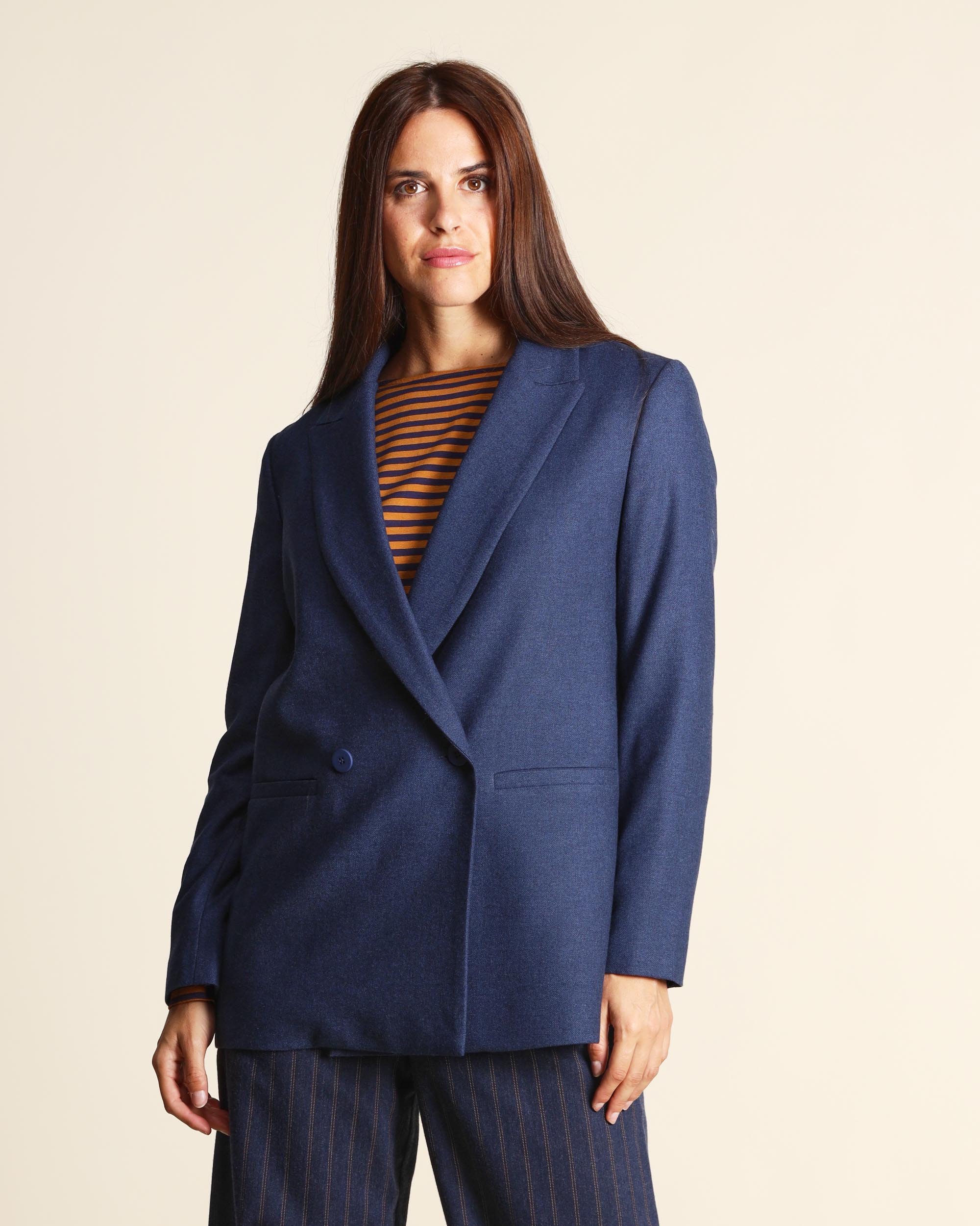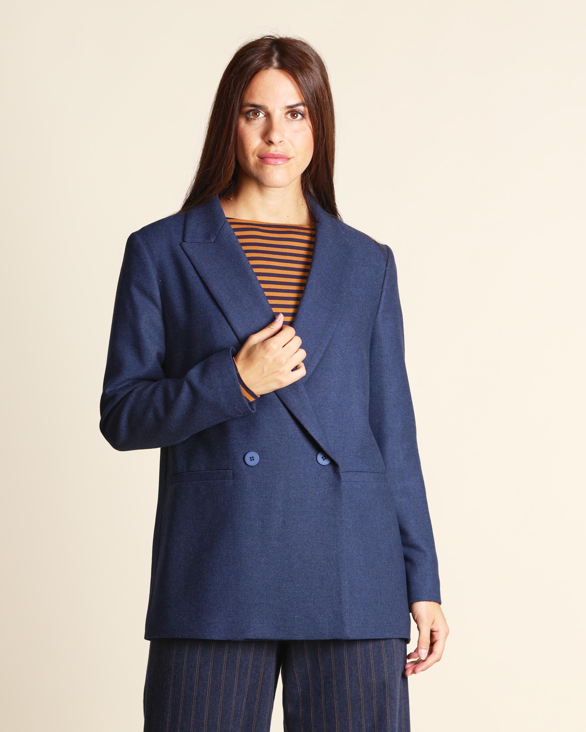 Giacca blu doppiopetto in misto viscosa e lana, collo a rever, maniche lunghe, chiusura con bottoni, linea dritta, foderata, la modella indossa una tg.S, la modella ha le seguenti misure: altezza 178, seno 86,vita 65, fianchi 93, collezione donna Niù Autunno Inverno 2025/26