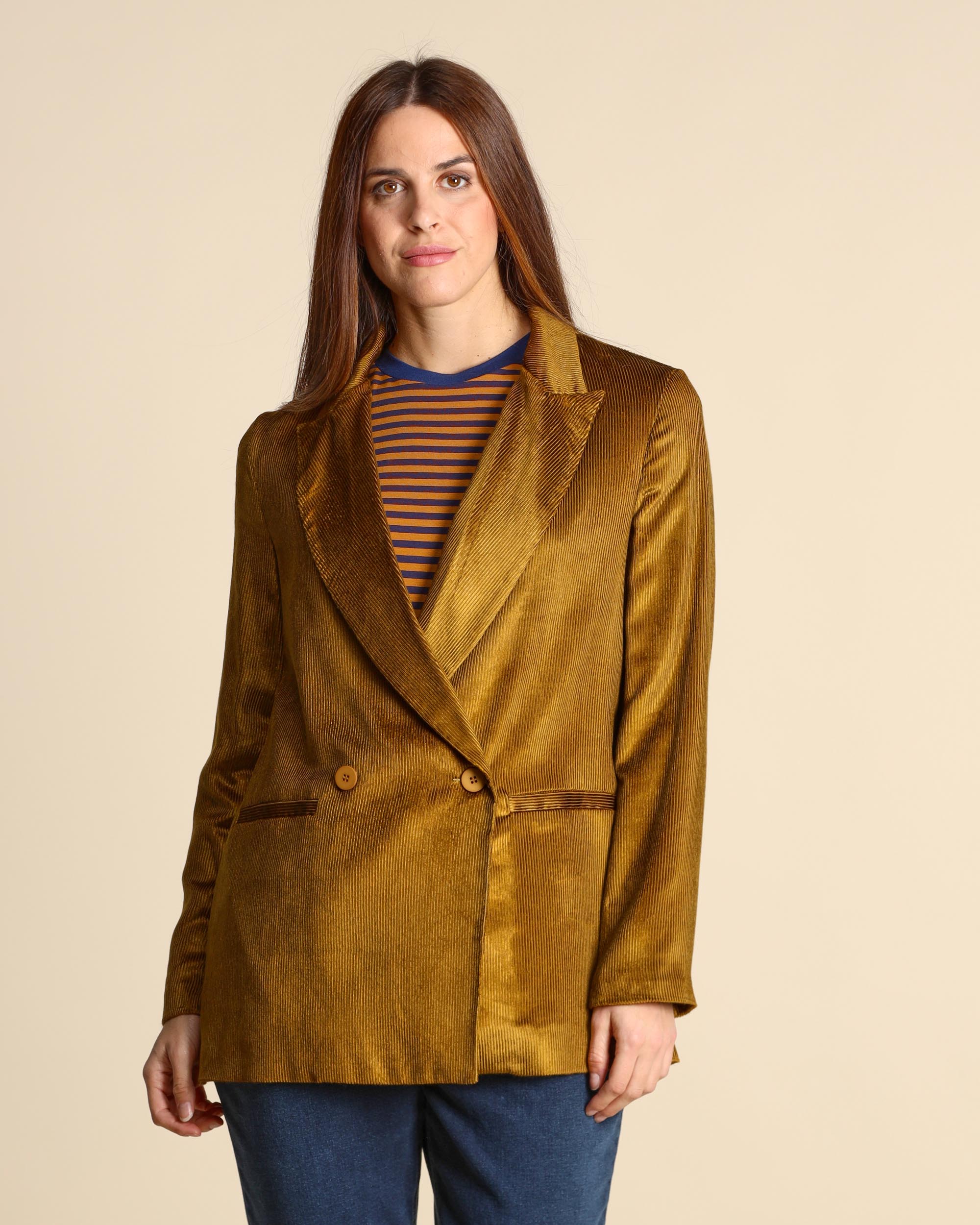 Giacca doppiopetto in velluto millerighe giallo acido in misto viscosa e tencel, collo a rever, maniche lunghe, chiusura con bottoni, linea dritta, foderata, la modella indossa una tg.S, la modella ha le seguenti misure: altezza 178, seno 86,vita 65, fianchi 93, collezione donna Niù Autunno Inverno 2025/26