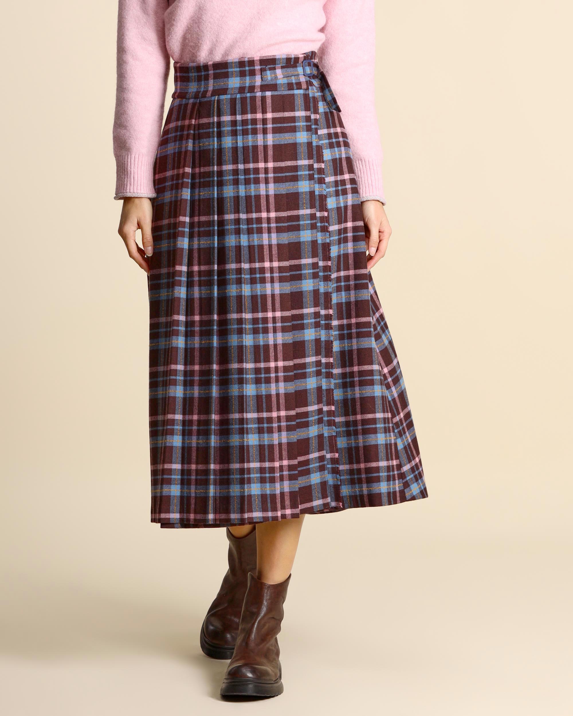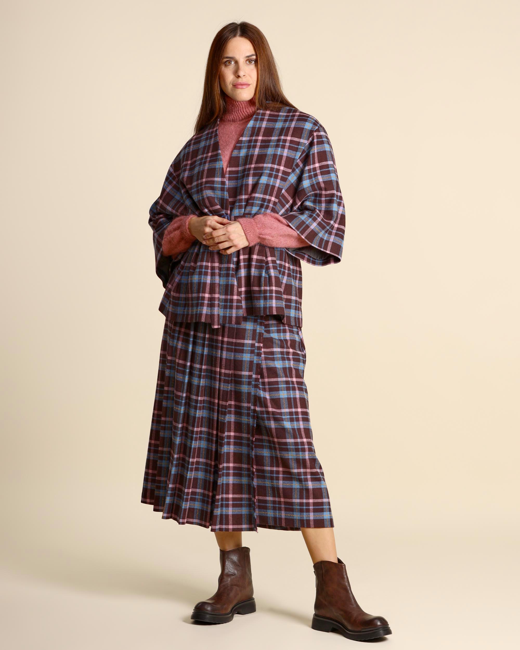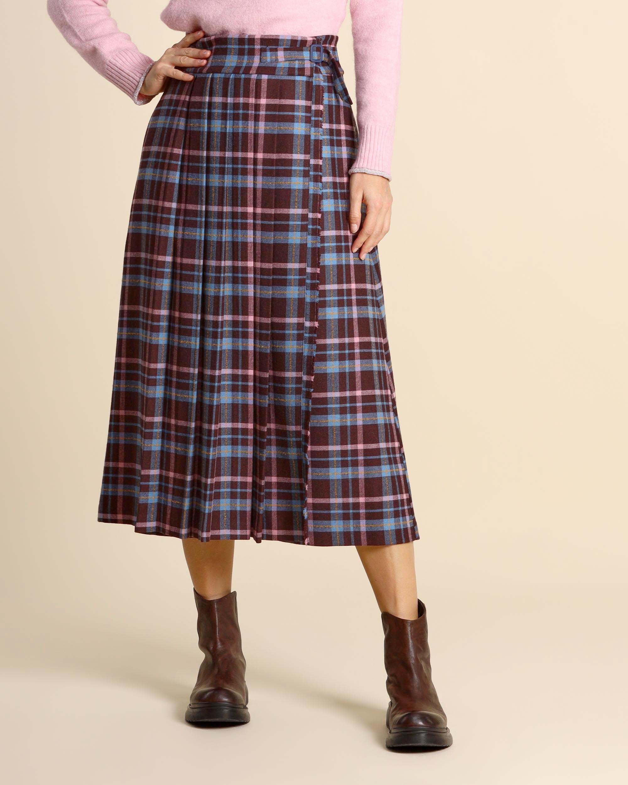 Gonna check bordeaux e rosa in misto lana e viscosa, a portafoglio, tasche inserite sul fianco, chiusura laterale con fibbia, linea morbida con pieghe, sfoderata, la modella indossa una tg.42, la modella ha le seguenti misure: altezza 178, seno 86,vita 65, fianchi 93, collezione donna Niù Autunno Inverno 2025/26