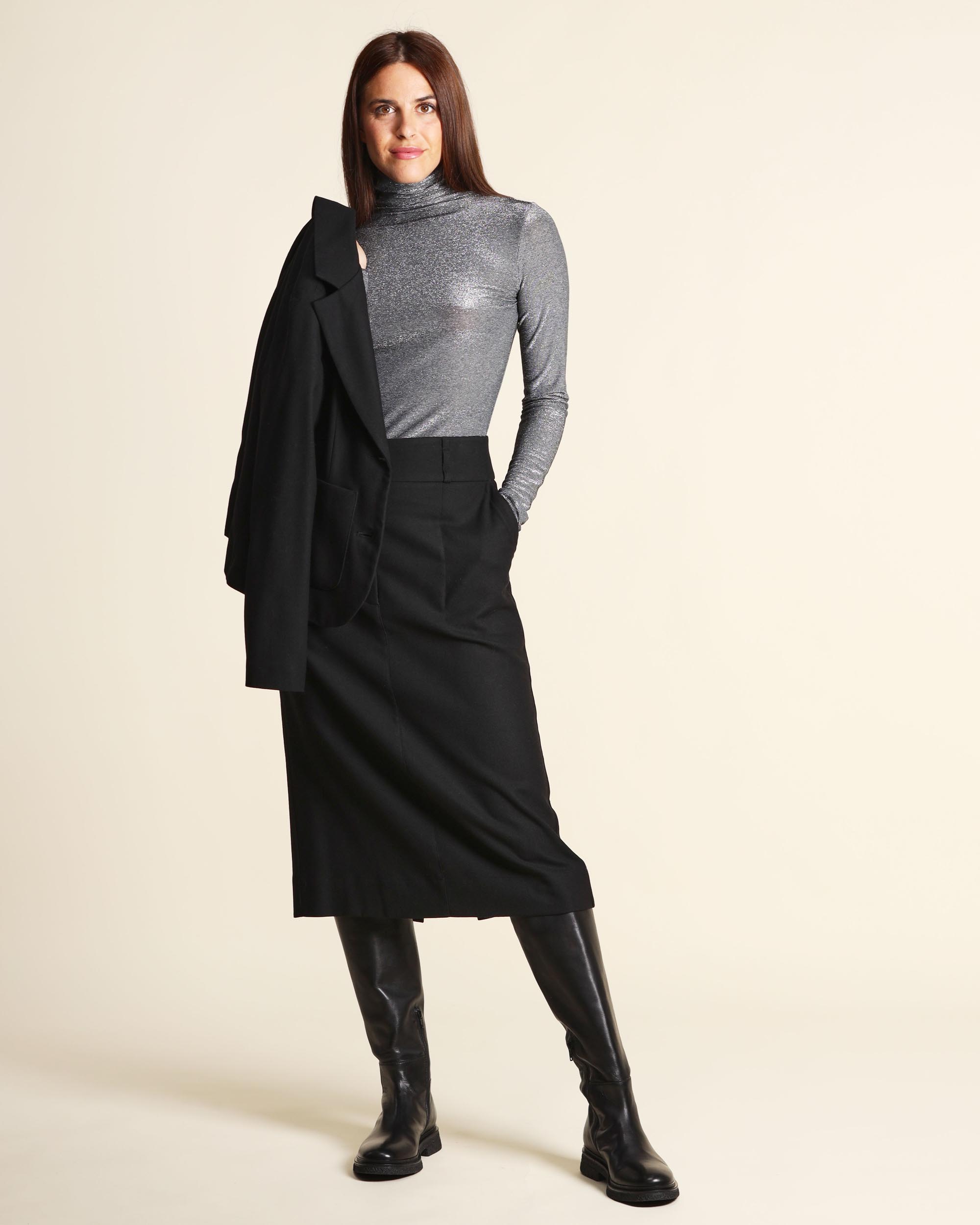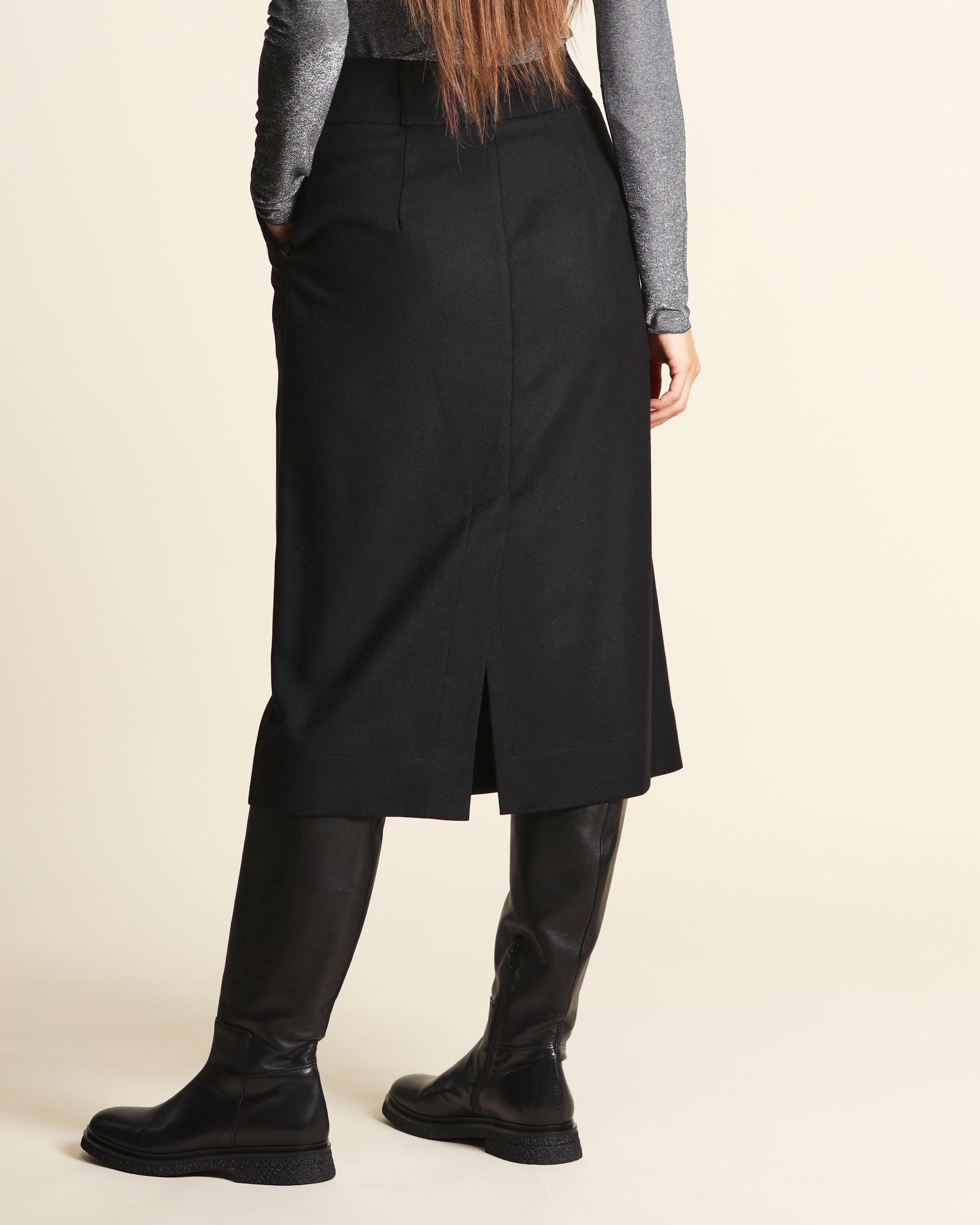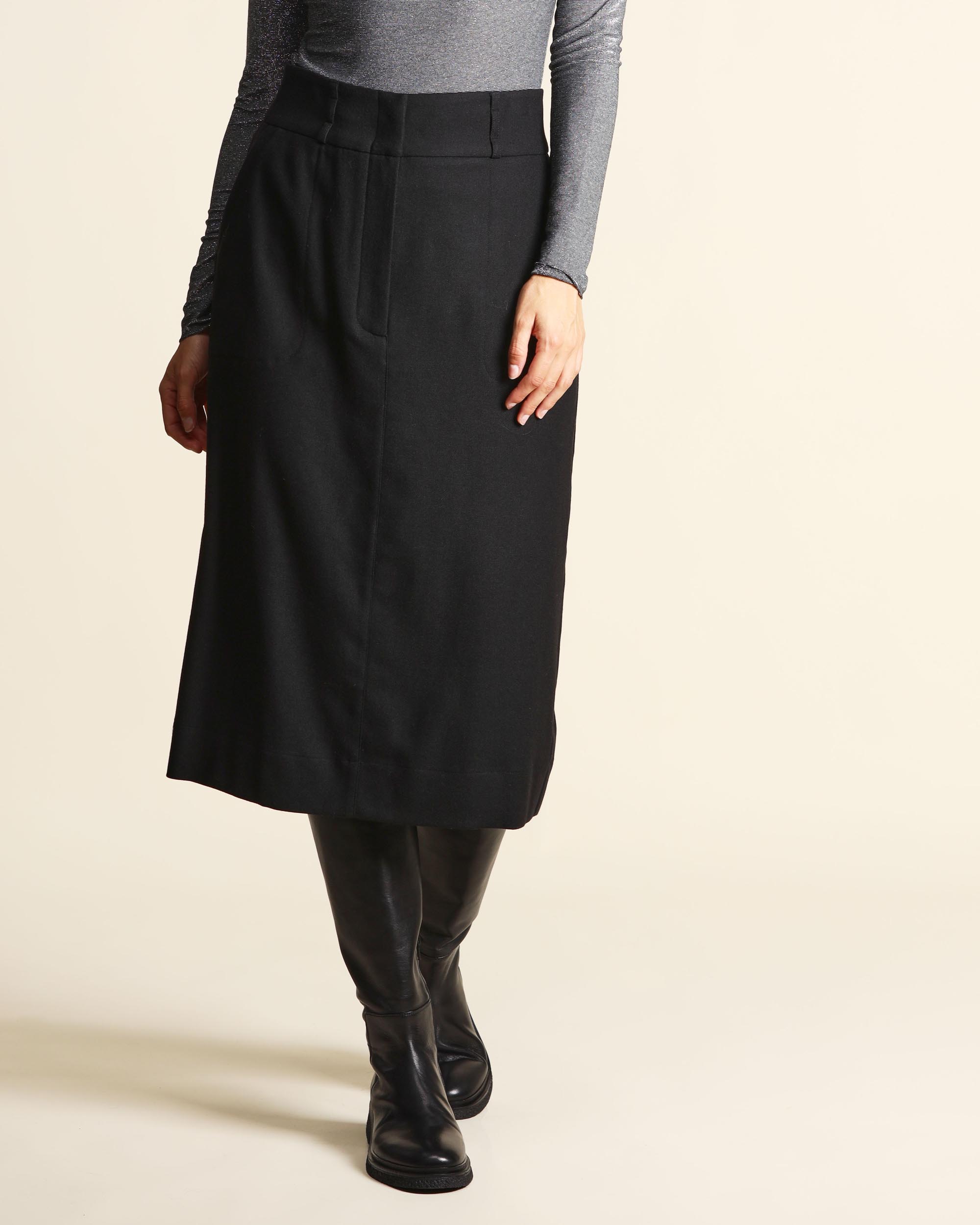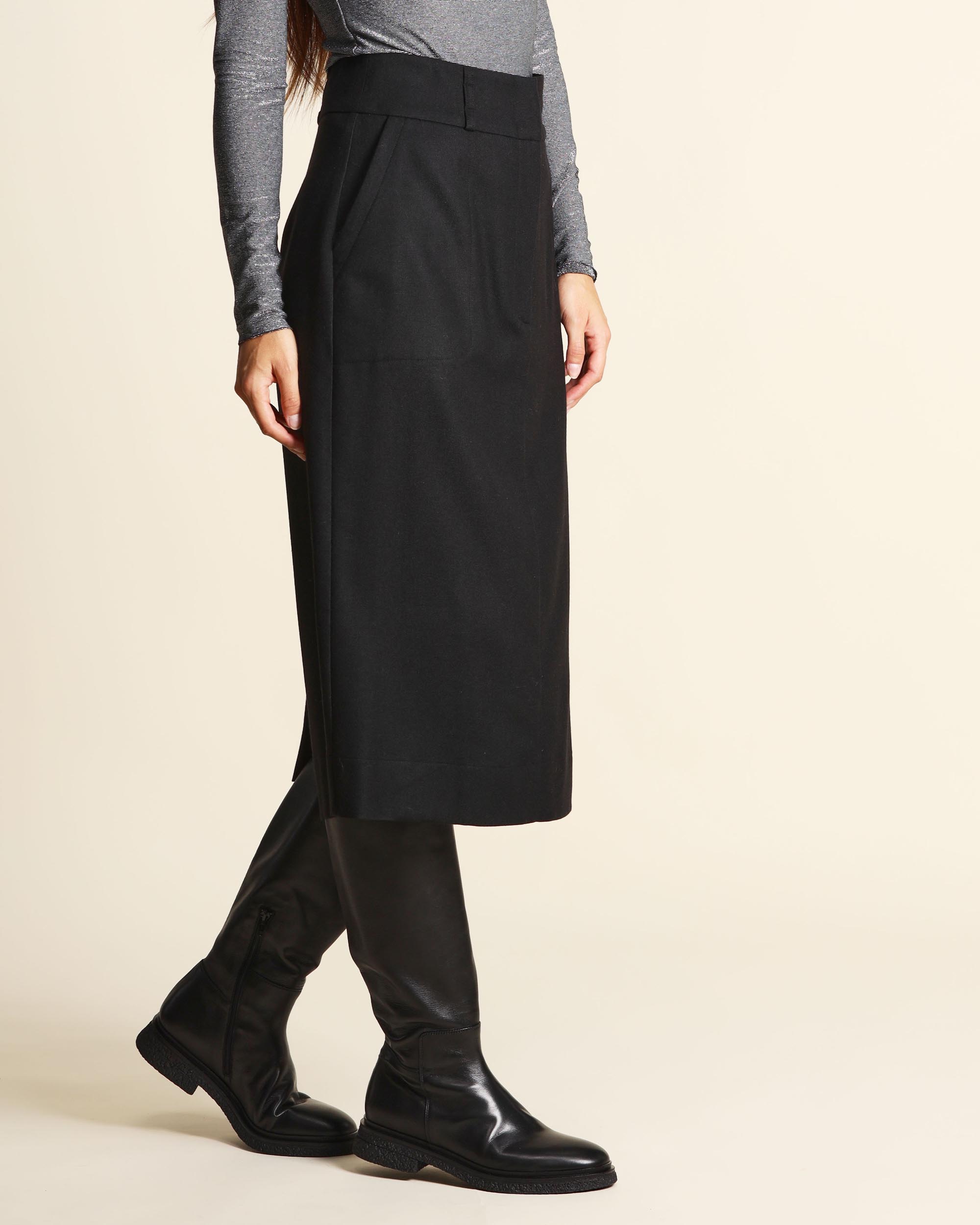 Gonna nera in misto lana e viscosa stretch, chiusura con ganci e zip nascosta, tasche alla francese, sfoderata, linea dritta morbida, spacco centrale sul dietro, la modella indossa una tg.S, la modella ha le seguenti misure: altezza 178, seno 86,vita 65, fianchi 93, collezione donna Niù Autunno Inverno 2025/26