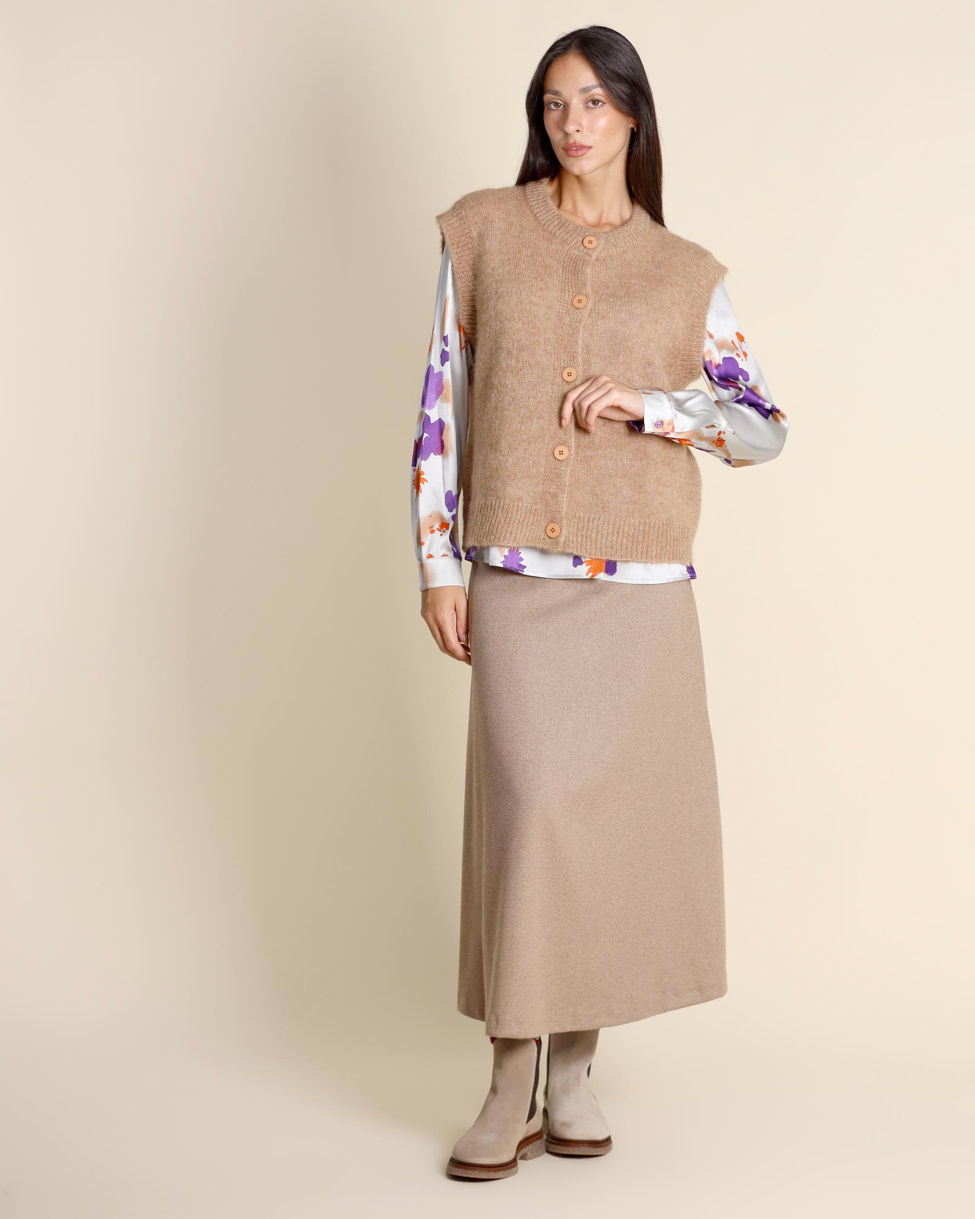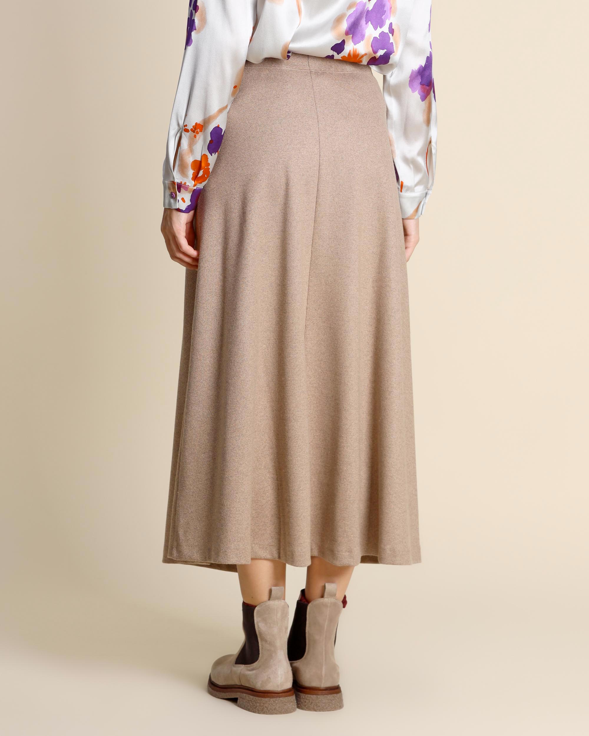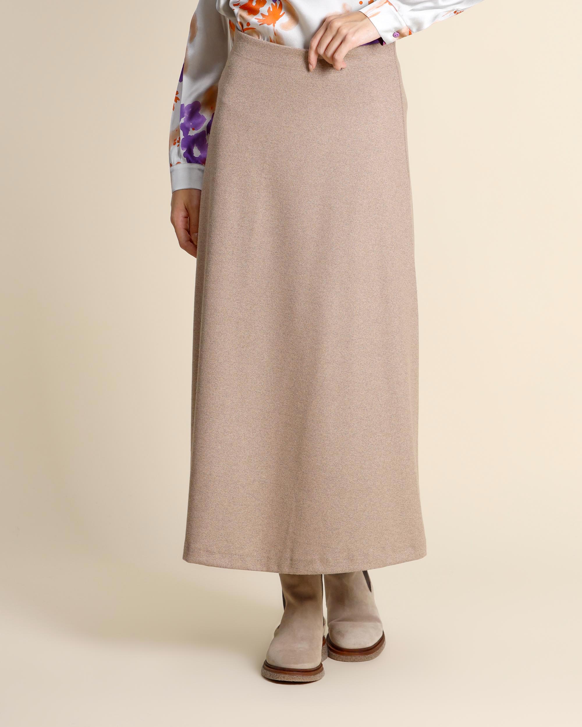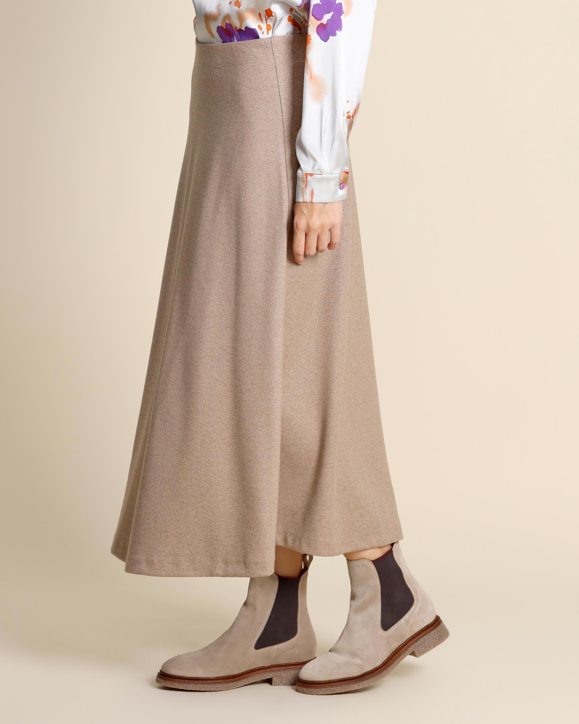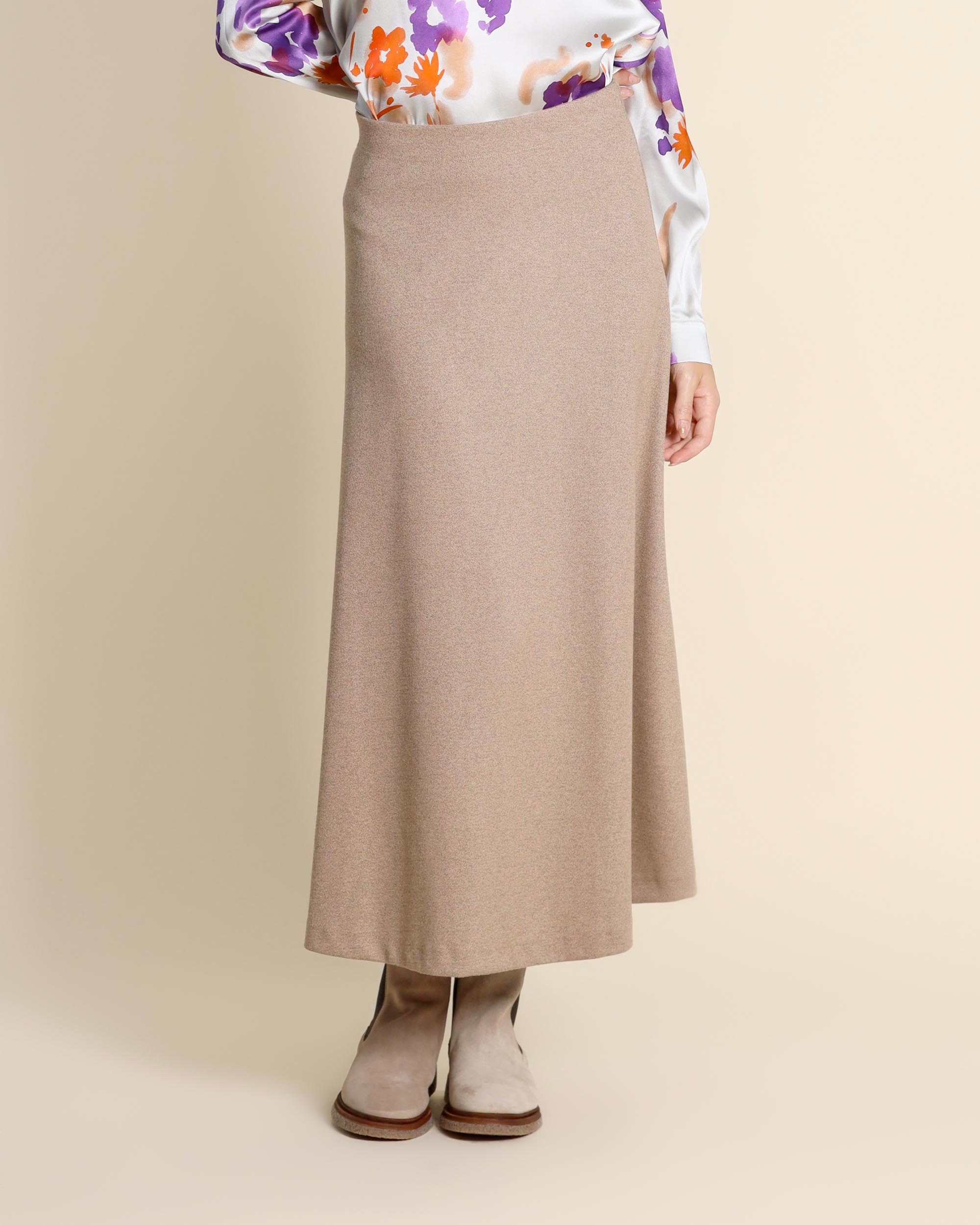 Gonna color cammello in jersey pesante di misto viscosa e cotone stretch, vita elastica, linea svasata, sfoderata, la modella indossa una tg.S, la modella ha le seguenti misure: altezza 173, seno 86,vita 65, fianchi 93, collezione donna Niù Autunno Inverno 2025/26