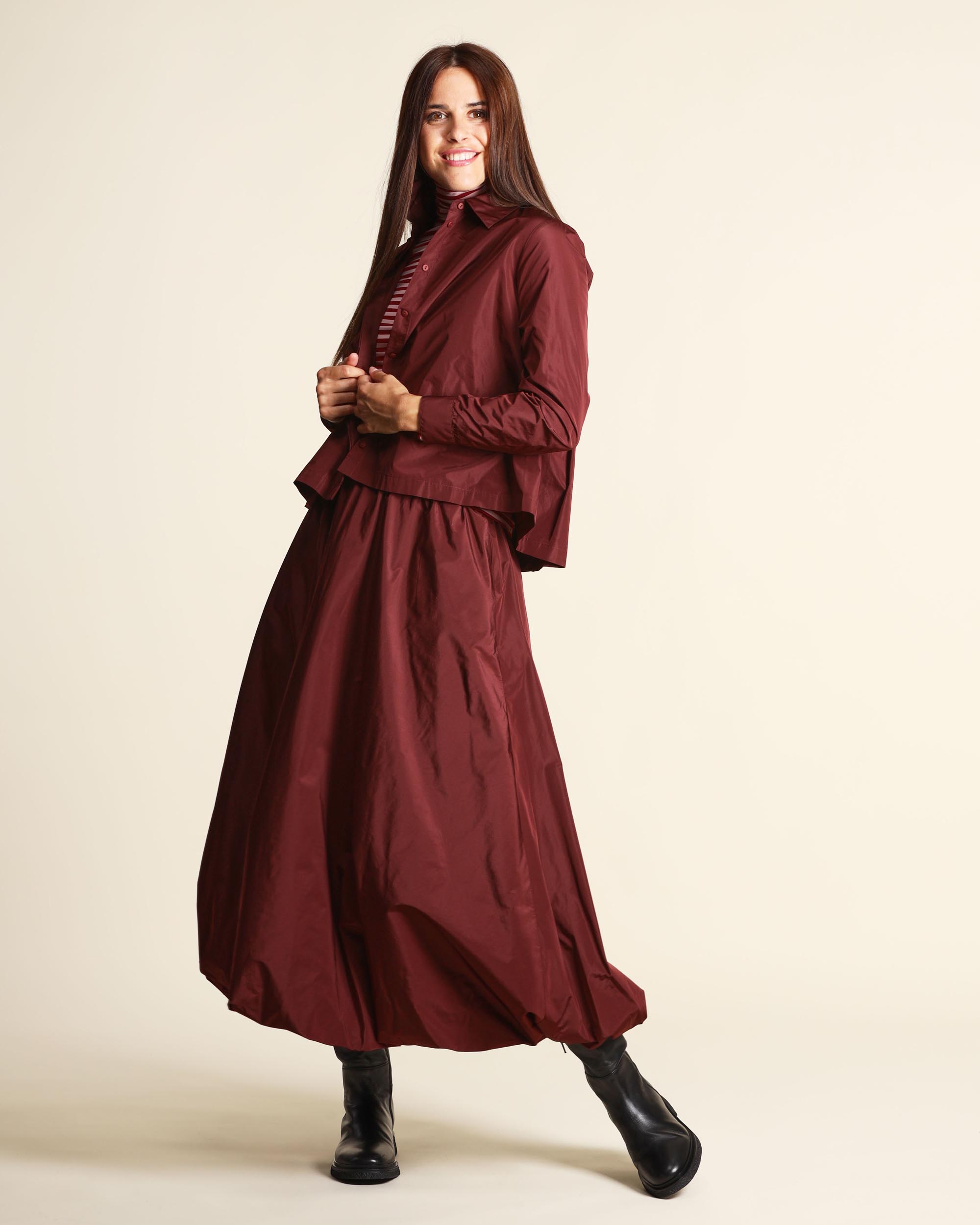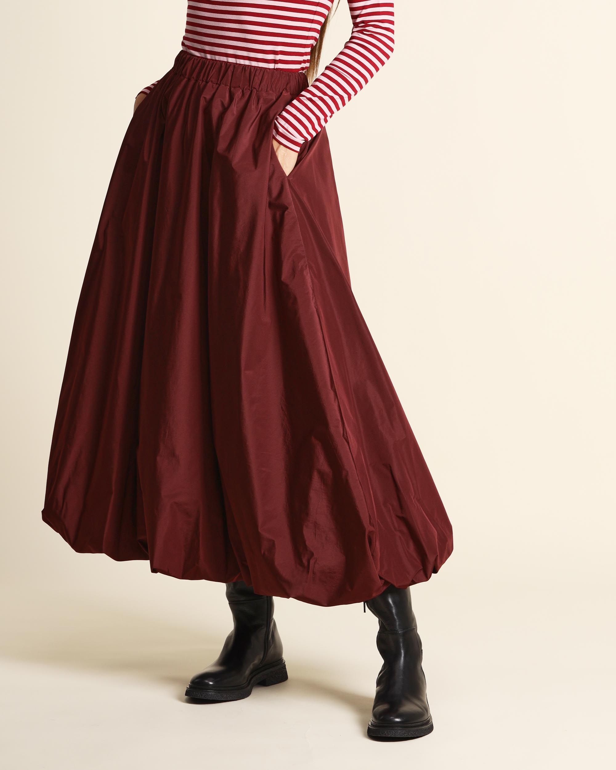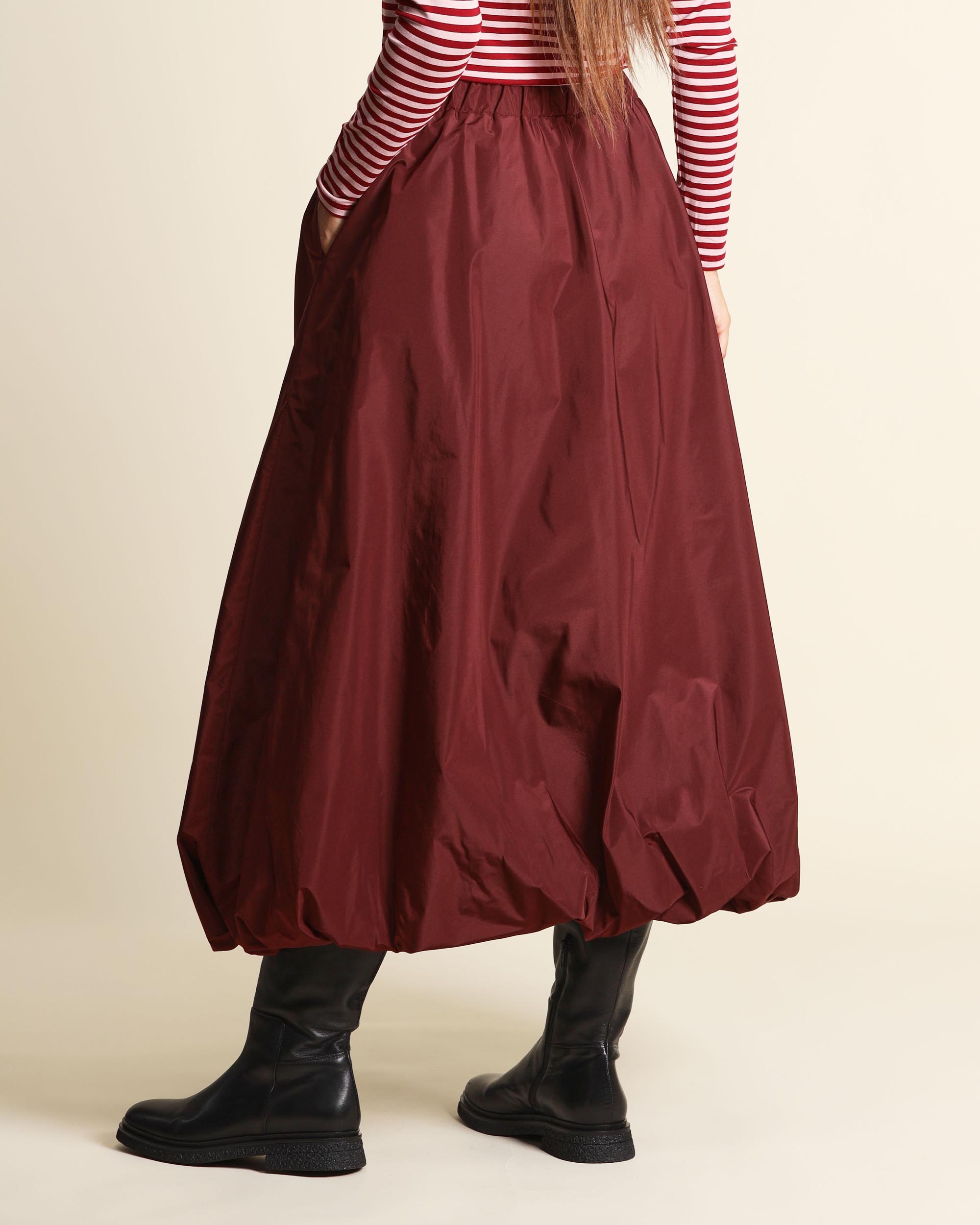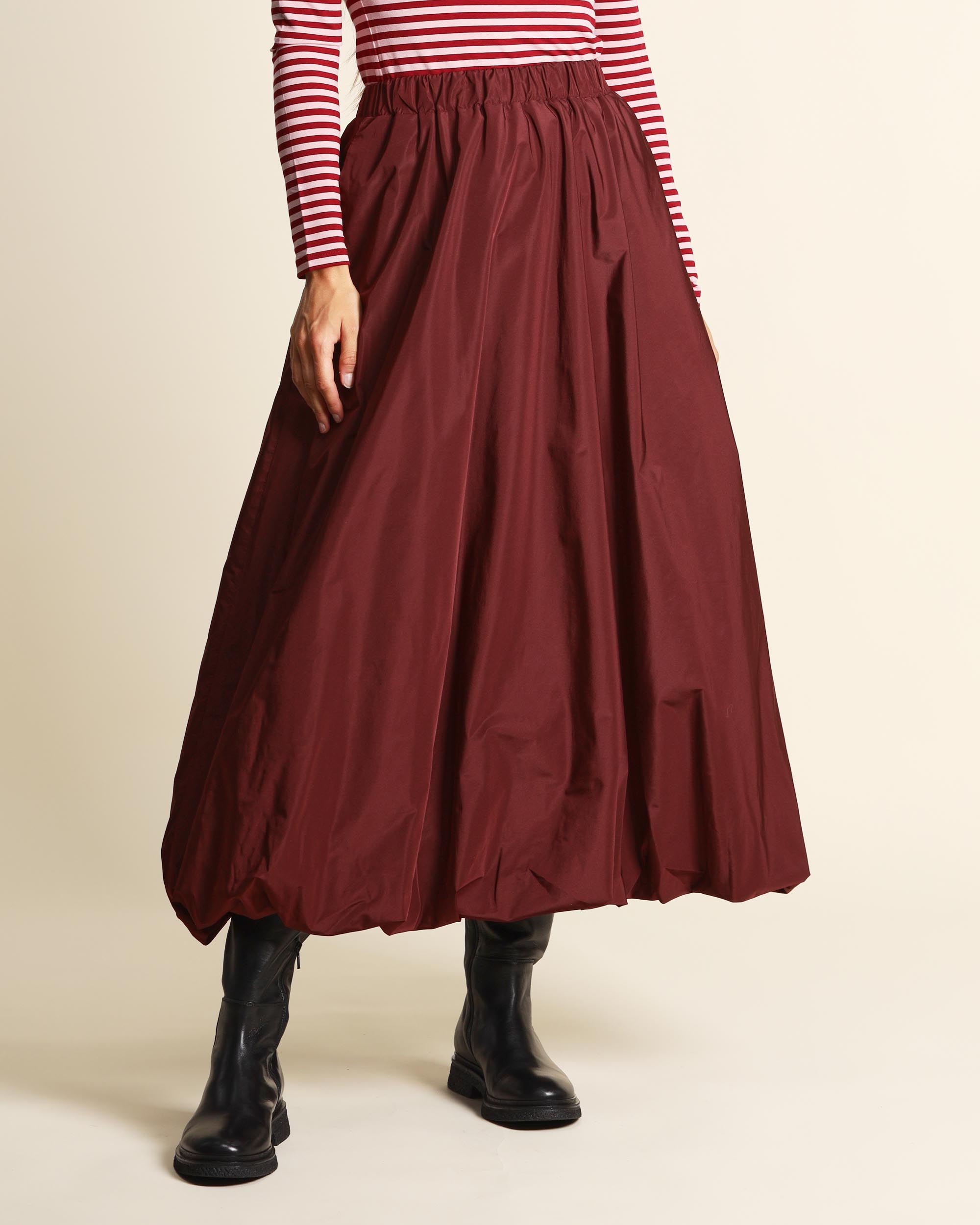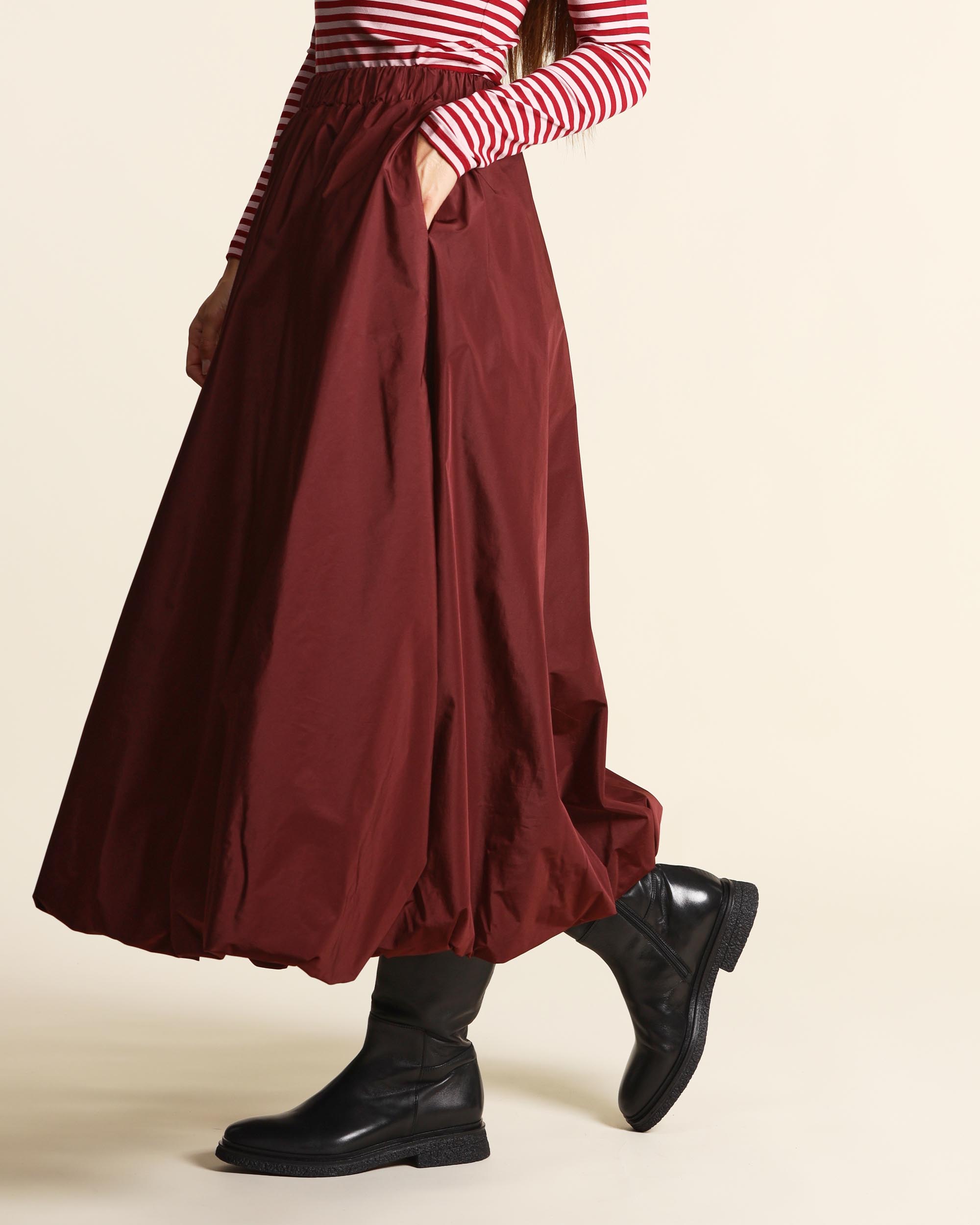 Gonna lunga in taffetà bordeaux, vita elastica, tasche inserite sul fianco, linea ampia con arricciatura e coulisse sul fondo, la modella indossa una tg.S, la modella ha le seguenti misure: altezza 178, seno 86,vita 65, fianchi 93, collezione donna Niù Autunno Inverno 2025/26