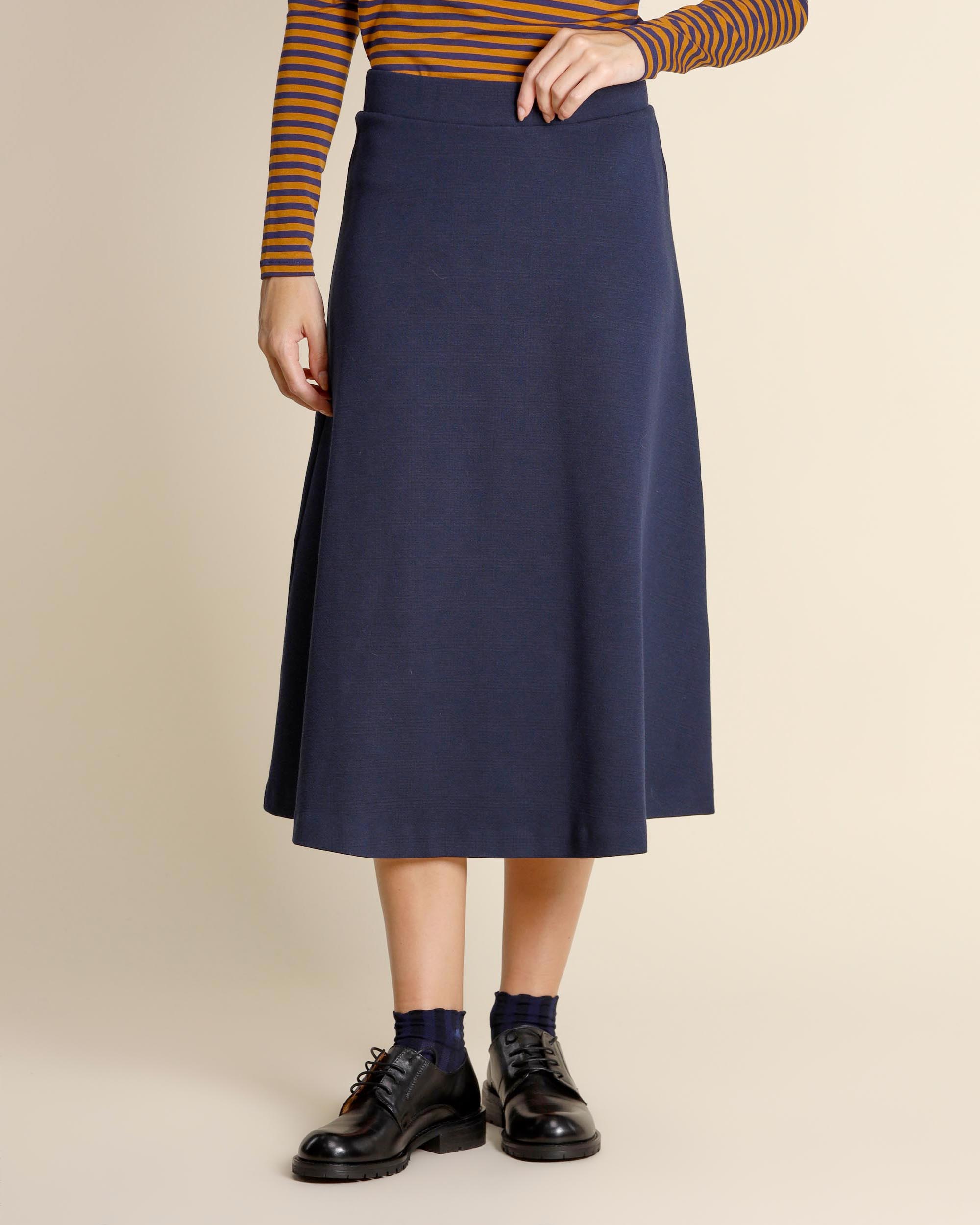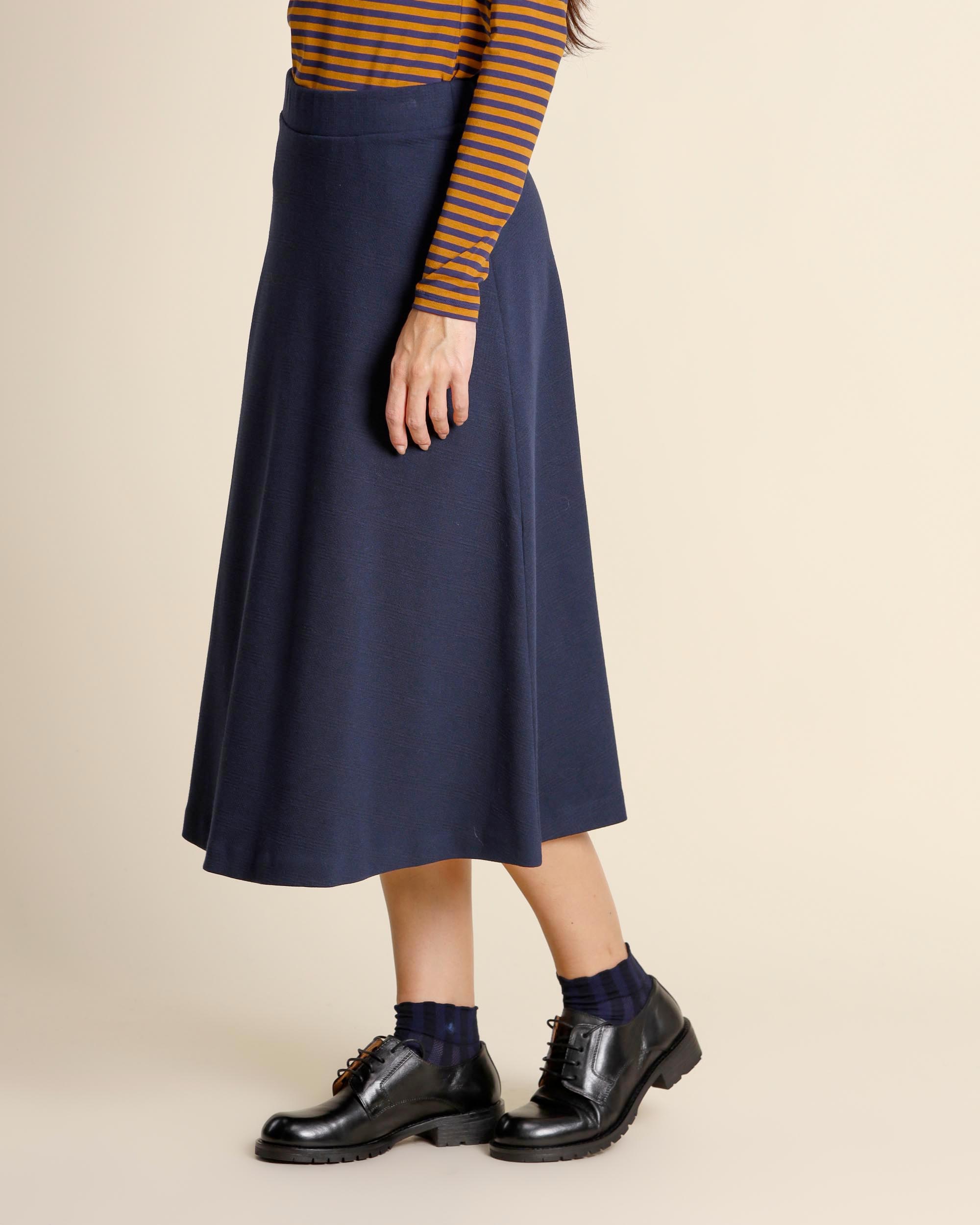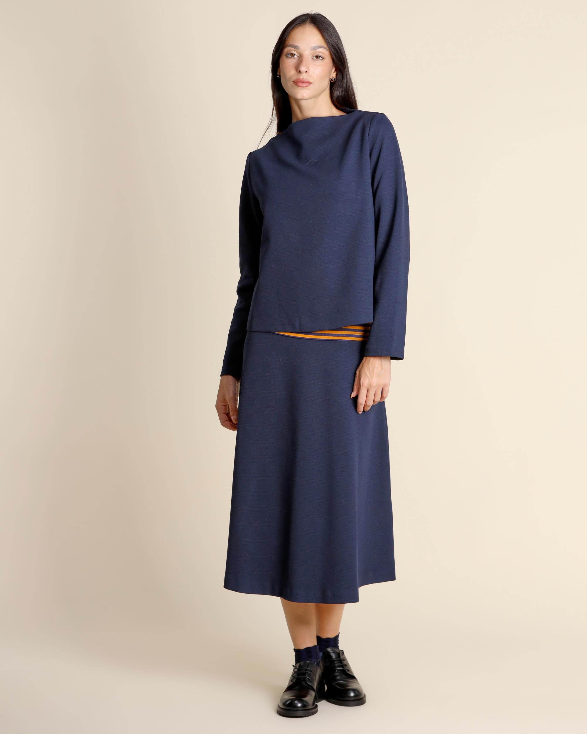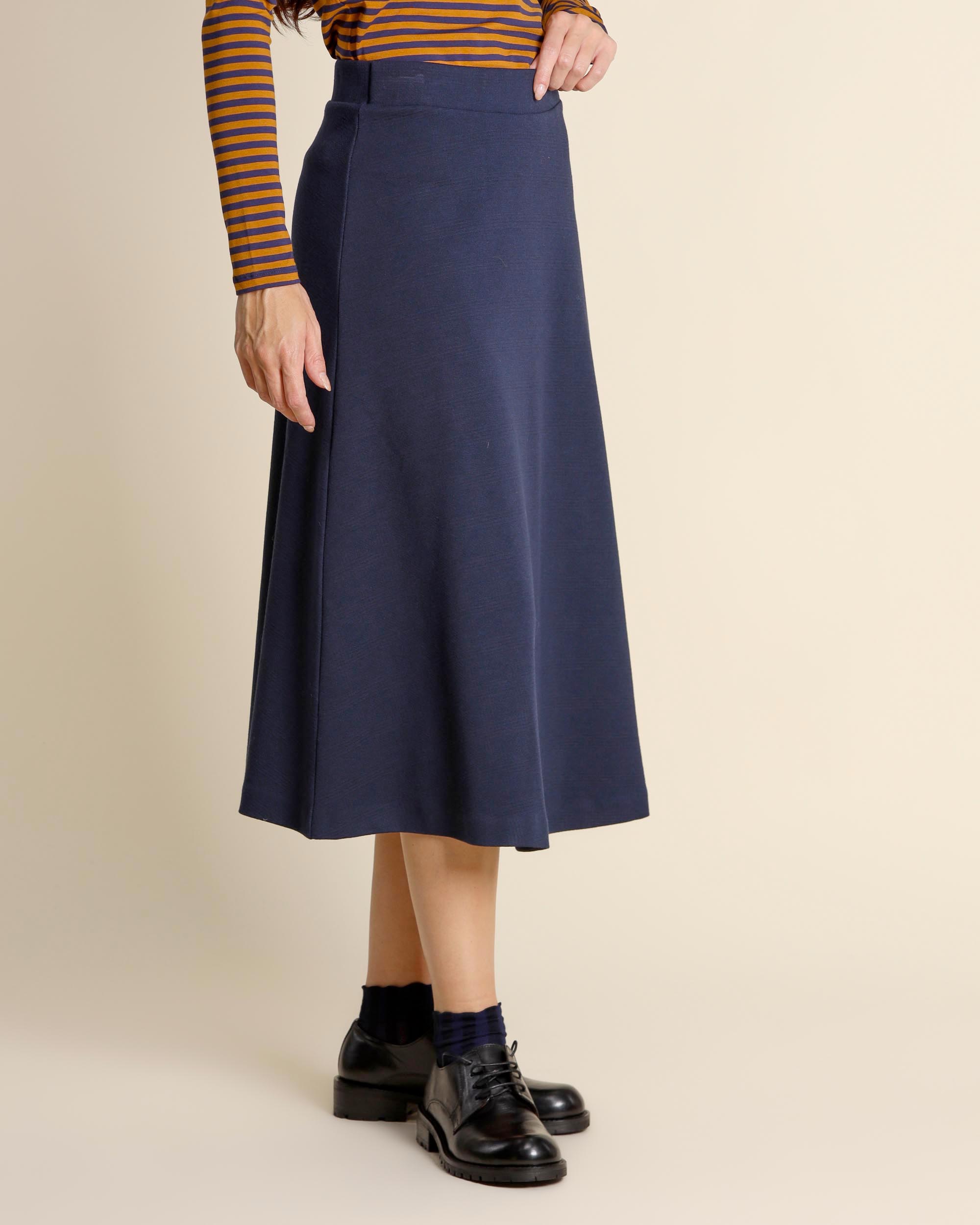 Gonna blu in jersey di misto cotone e viscosa stretch, vita elastica, linea svasata, sfoderata, la modella indossa una tg.S, la modella ha le seguenti misure: altezza 173, seno 86,vita 65, fianchi 93, collezione donna Niù Autunno Inverno 2025/26