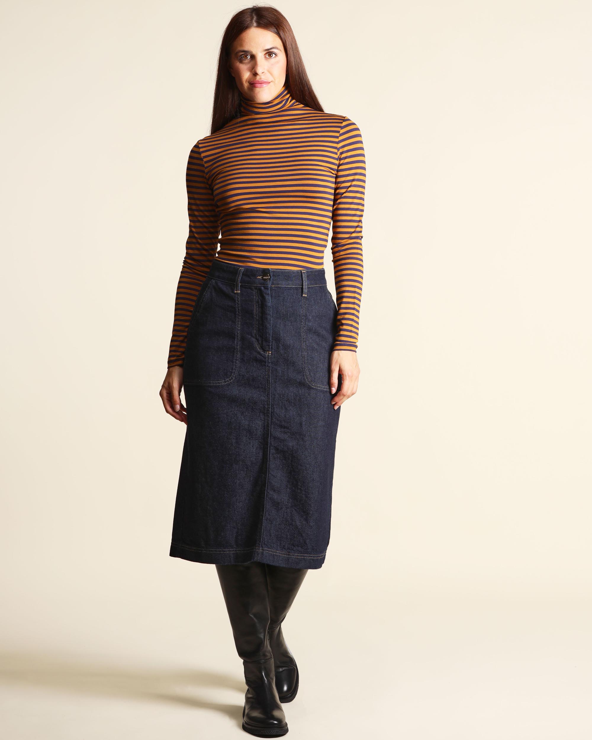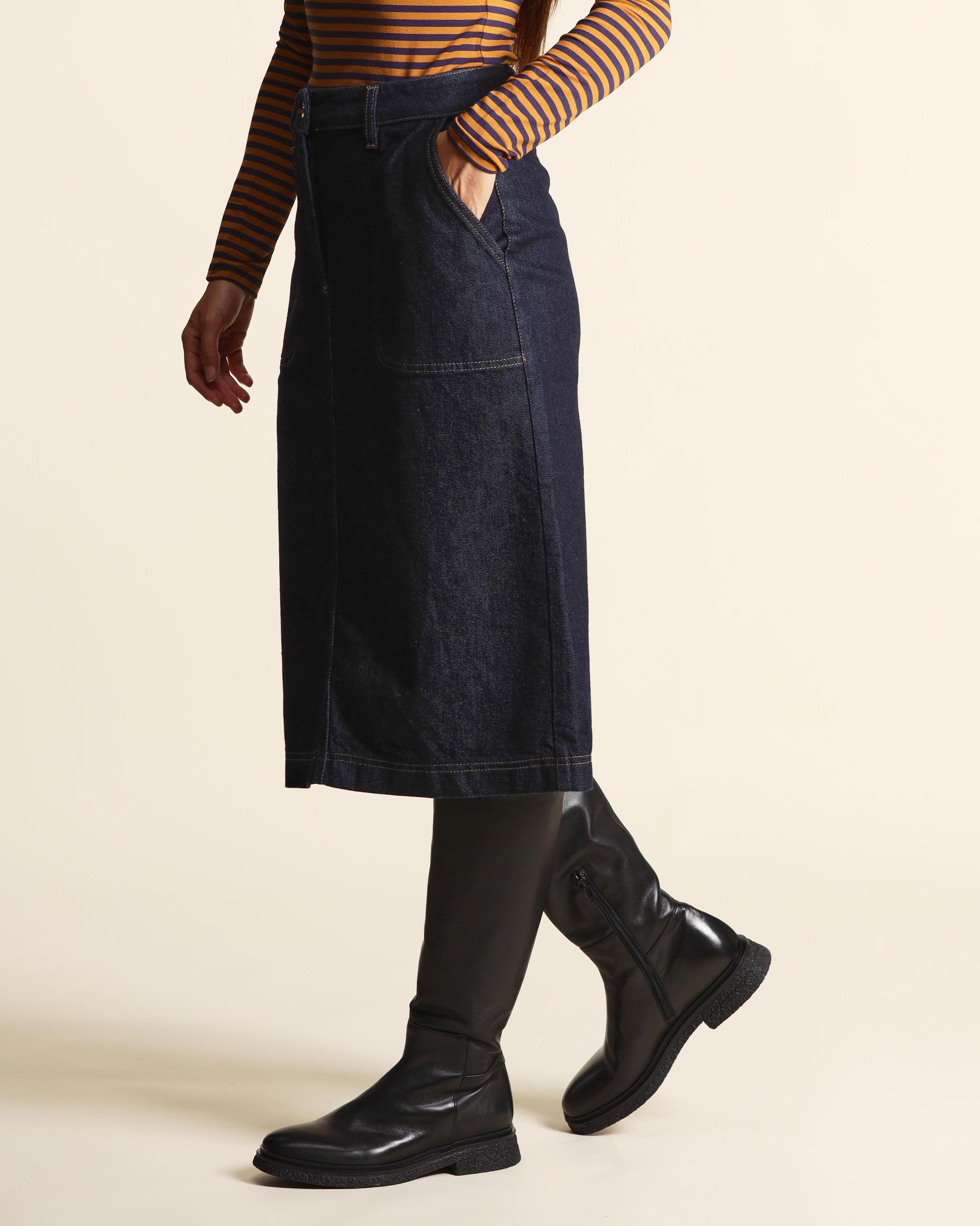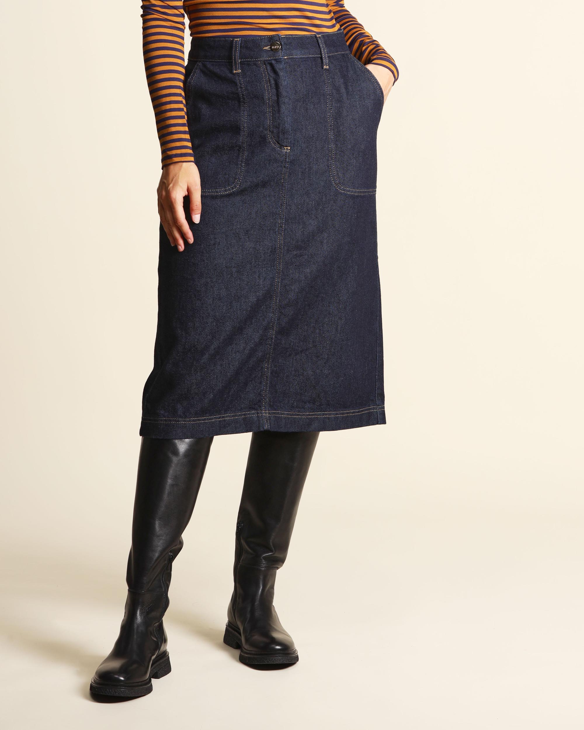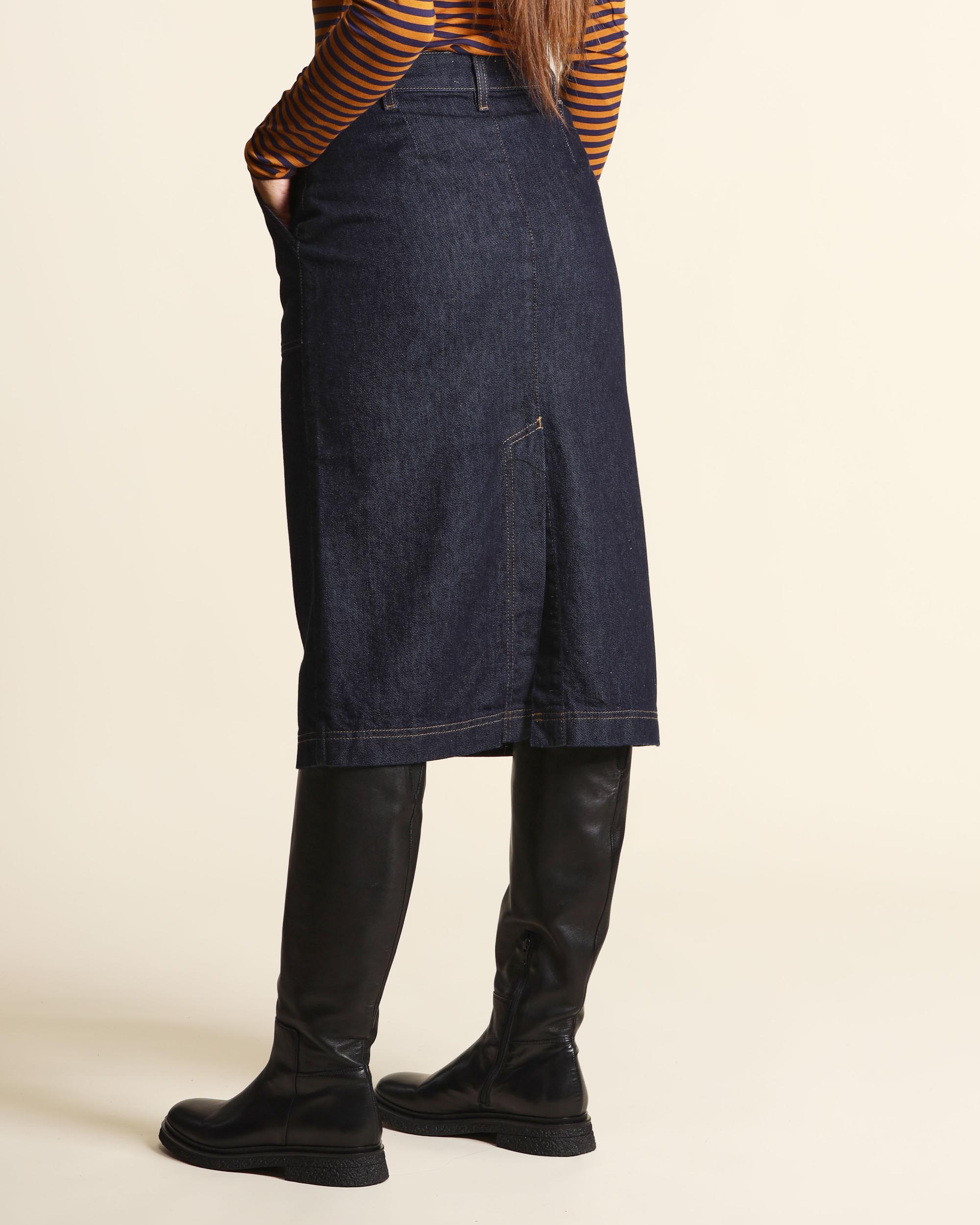 Gonna blu indaco in denim di cotone stretch, chiusura con bottone a chiodo e zip nascosta, tasche applicate, linea dritta, spacco centrale sul dietro, cuciture a contrasto, la modella indossa una tg.S, la modella ha le seguenti misure: altezza 178, seno 86,vita 65, fianchi 93, collezione donna Niù Autunno Inverno 2025/26