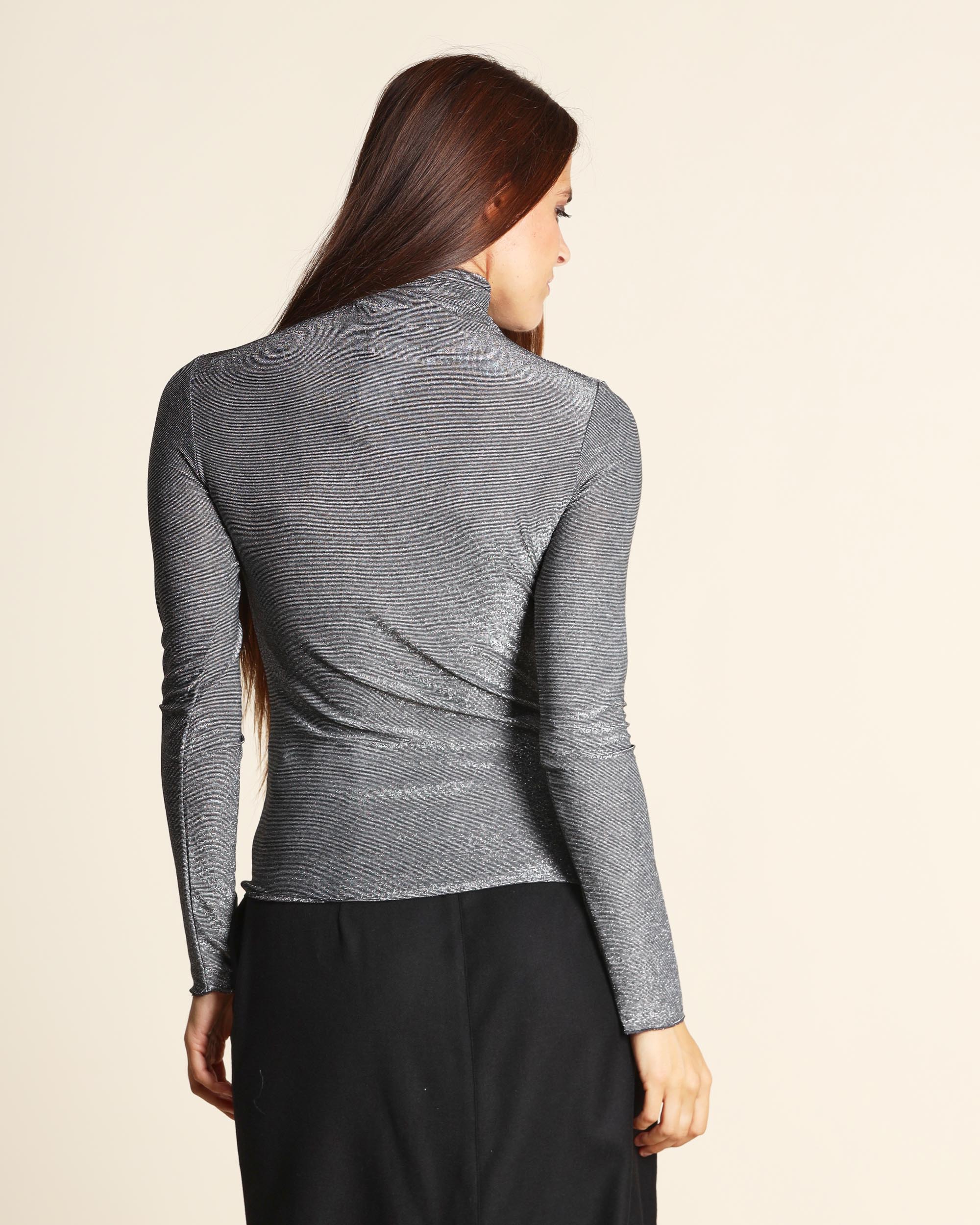 Maglia grigio scuro con lurex in misto viscosa, collo alto, linea aderente, maniche lunghe, la modella indossa una tg.S, la modella ha le seguenti misure: altezza 178, seno 86,vita 65, fianchi 93, collezione donna Niù Autunno Inverno 2025/26