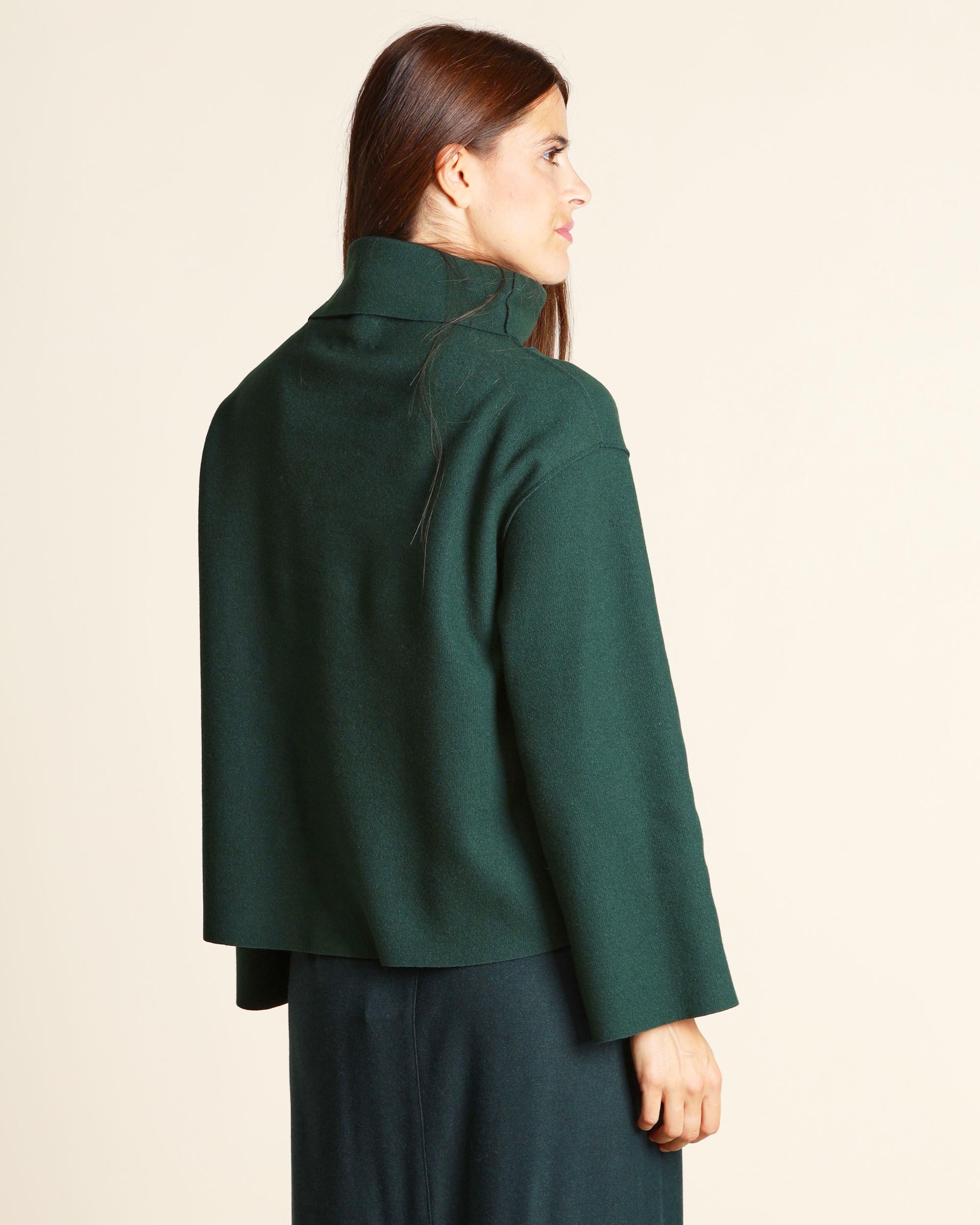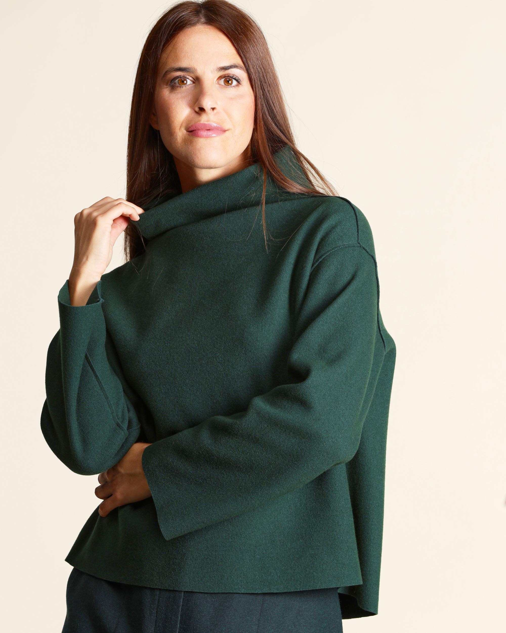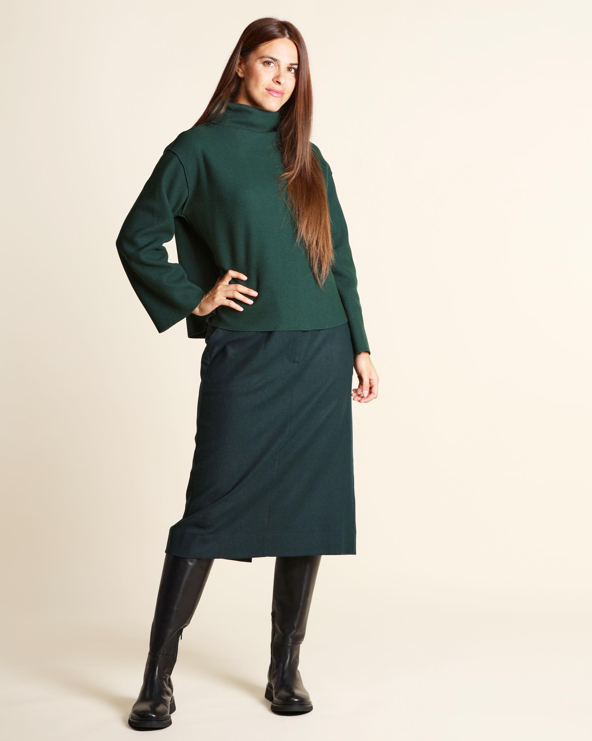 Maglia verde in jersey di misto lana effetto lana cotta, collo a cratere, maniche lunghe, giro sceso, linea boxy, la modella indossa una tg.S, la modella ha le seguenti misure: altezza 173, seno 86,vita 65, fianchi 93, collezione donna Niù Autunno Inverno 2025/26