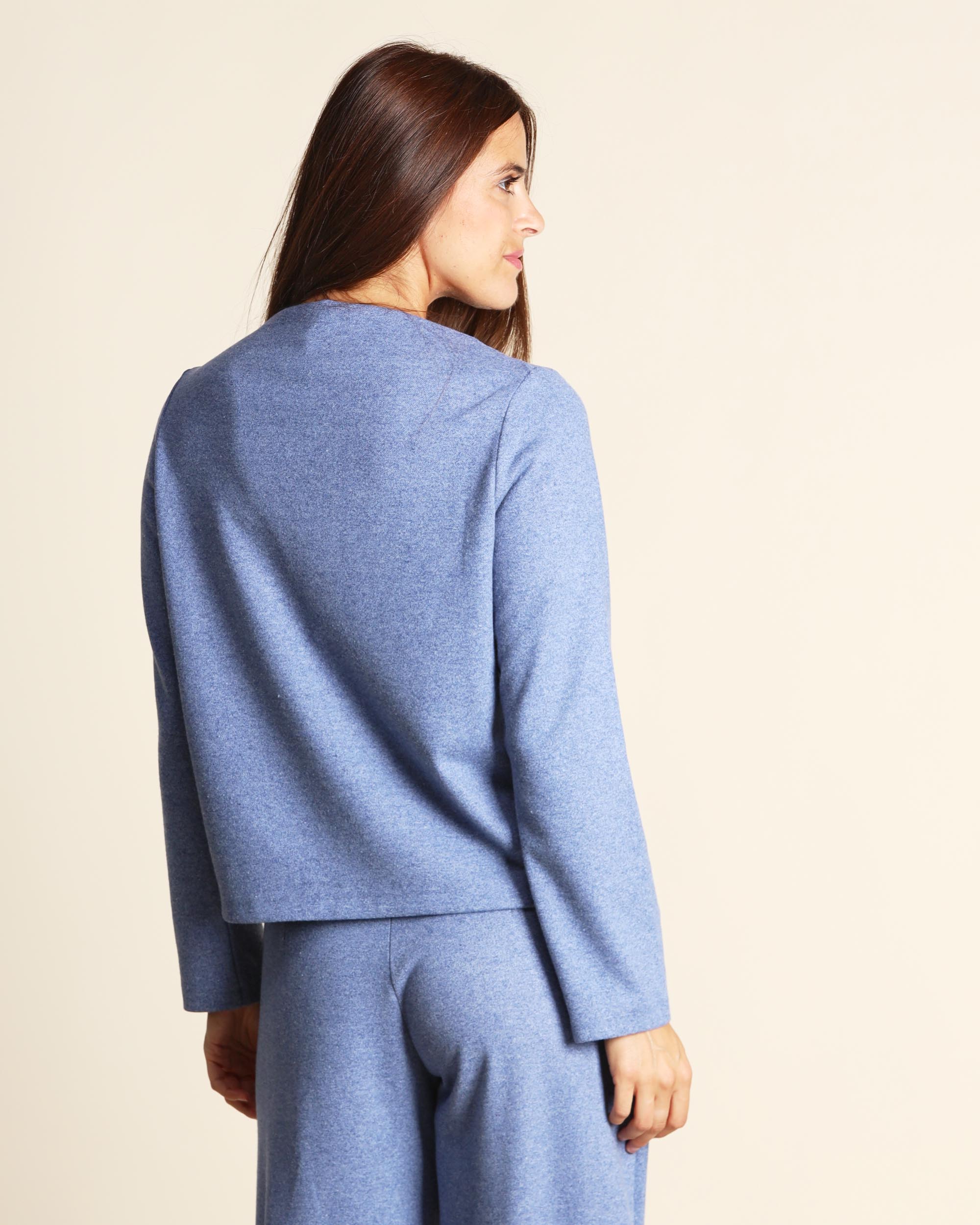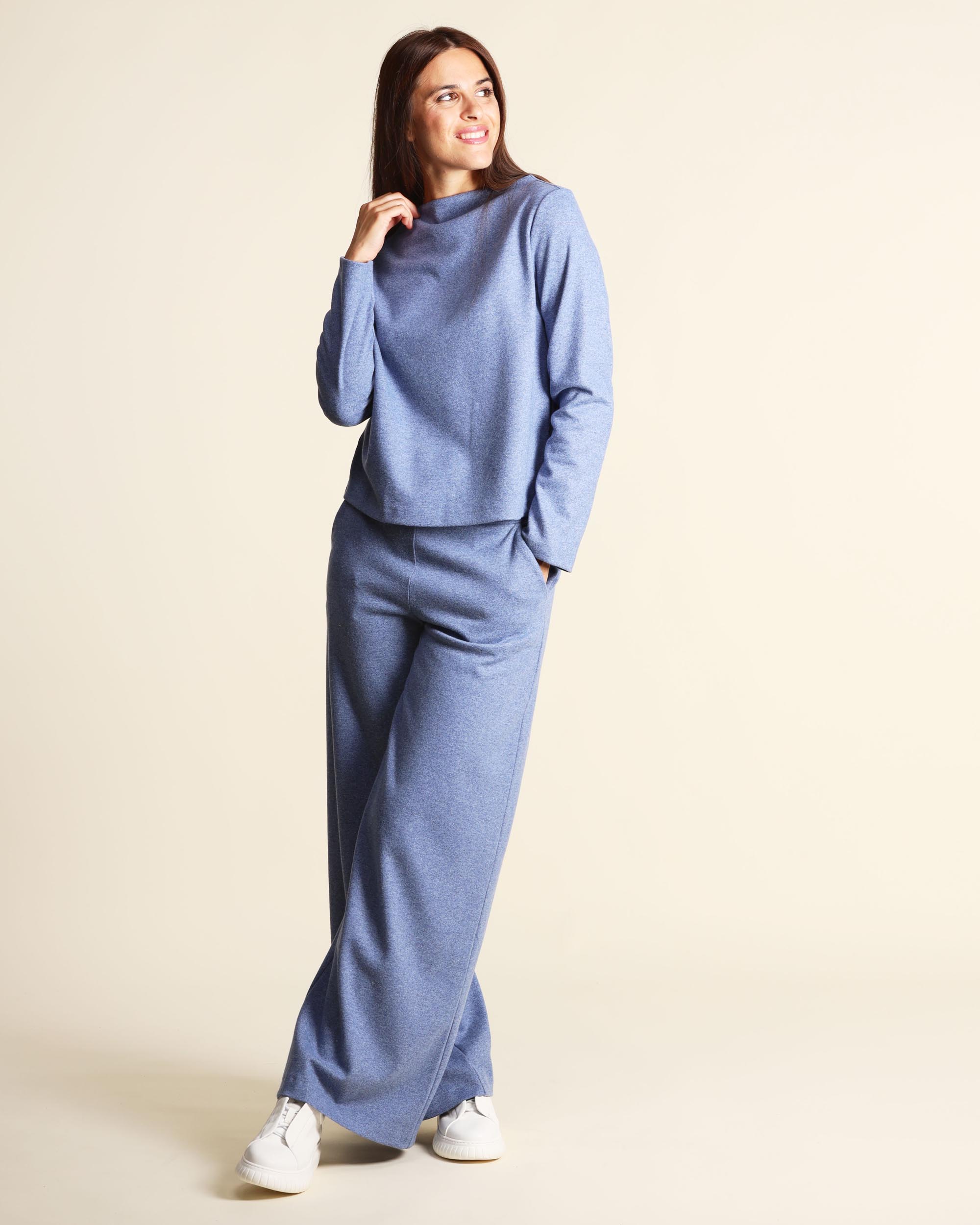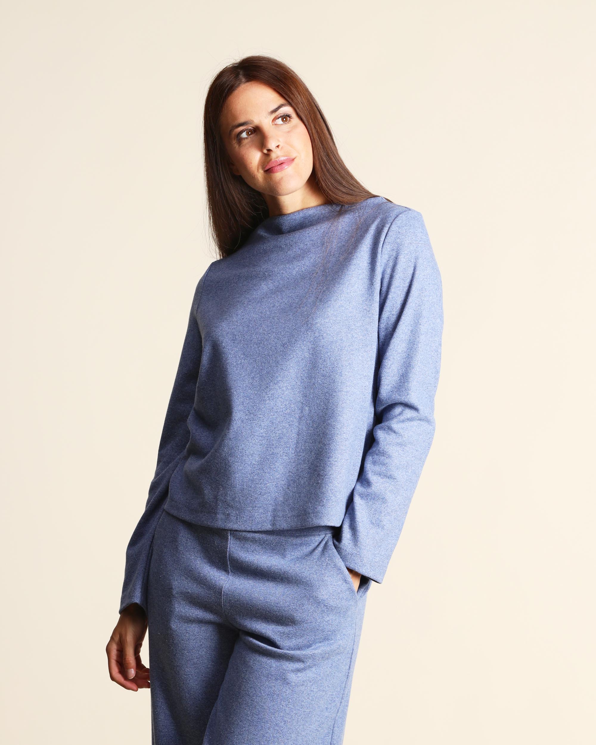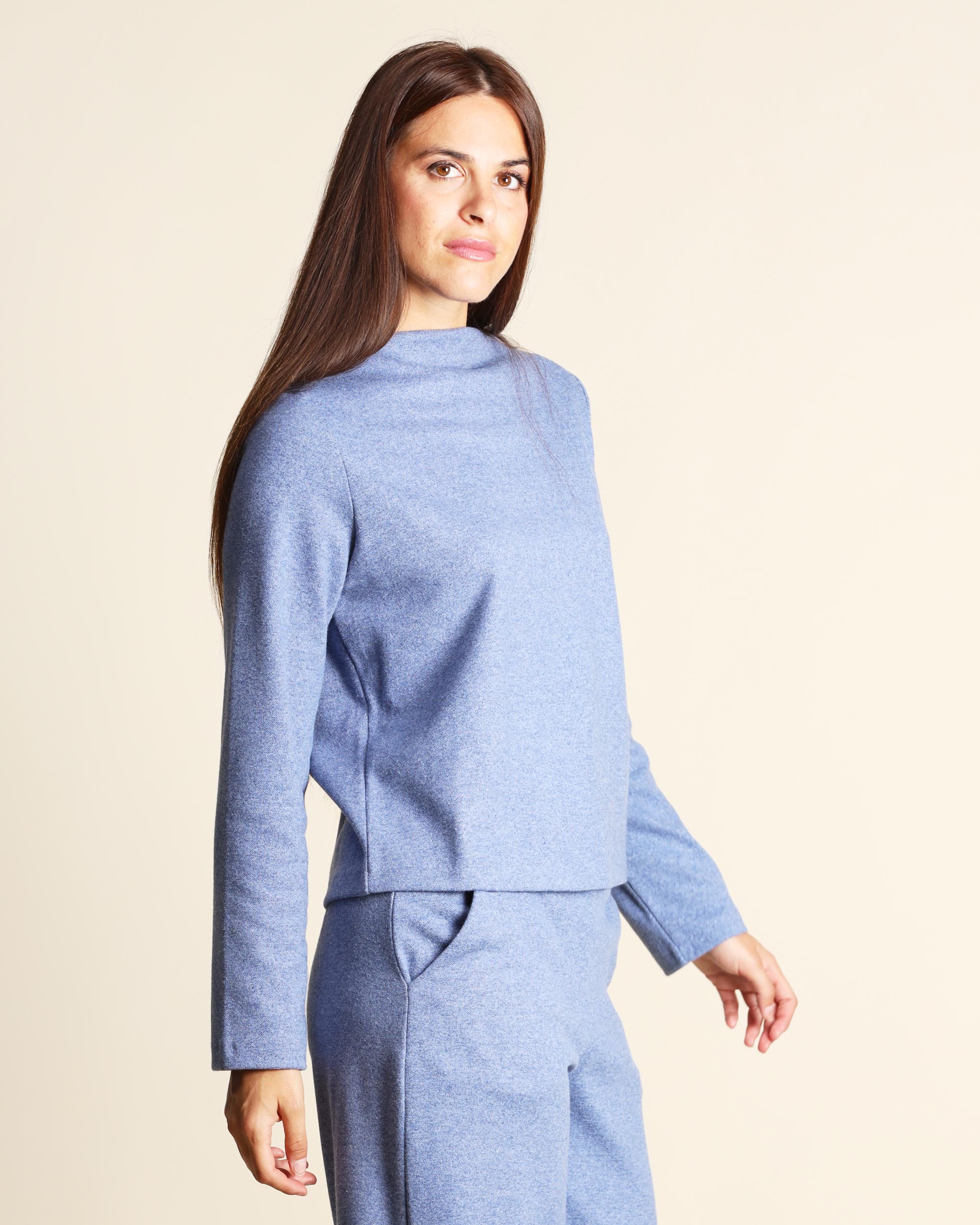 Maglia azzurra in jersey pesante di misto viscosa e cotone stretch, collo a cratere, linea boxy, la modella indossa una tg.S, la modella ha le seguenti misure: altezza 178, seno 86,vita 65, fianchi 93, collezione donna Niù Autunno Inverno 2025/26