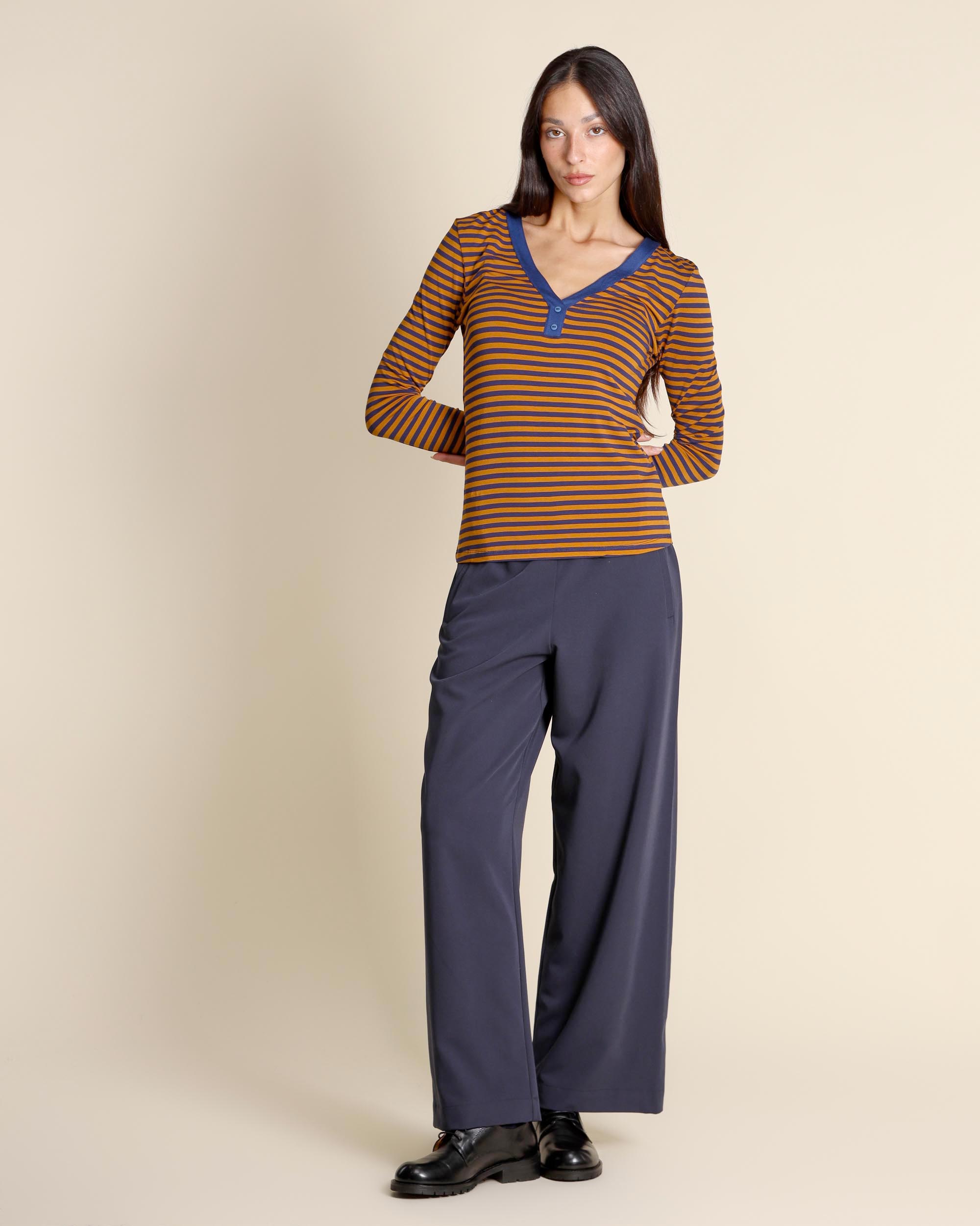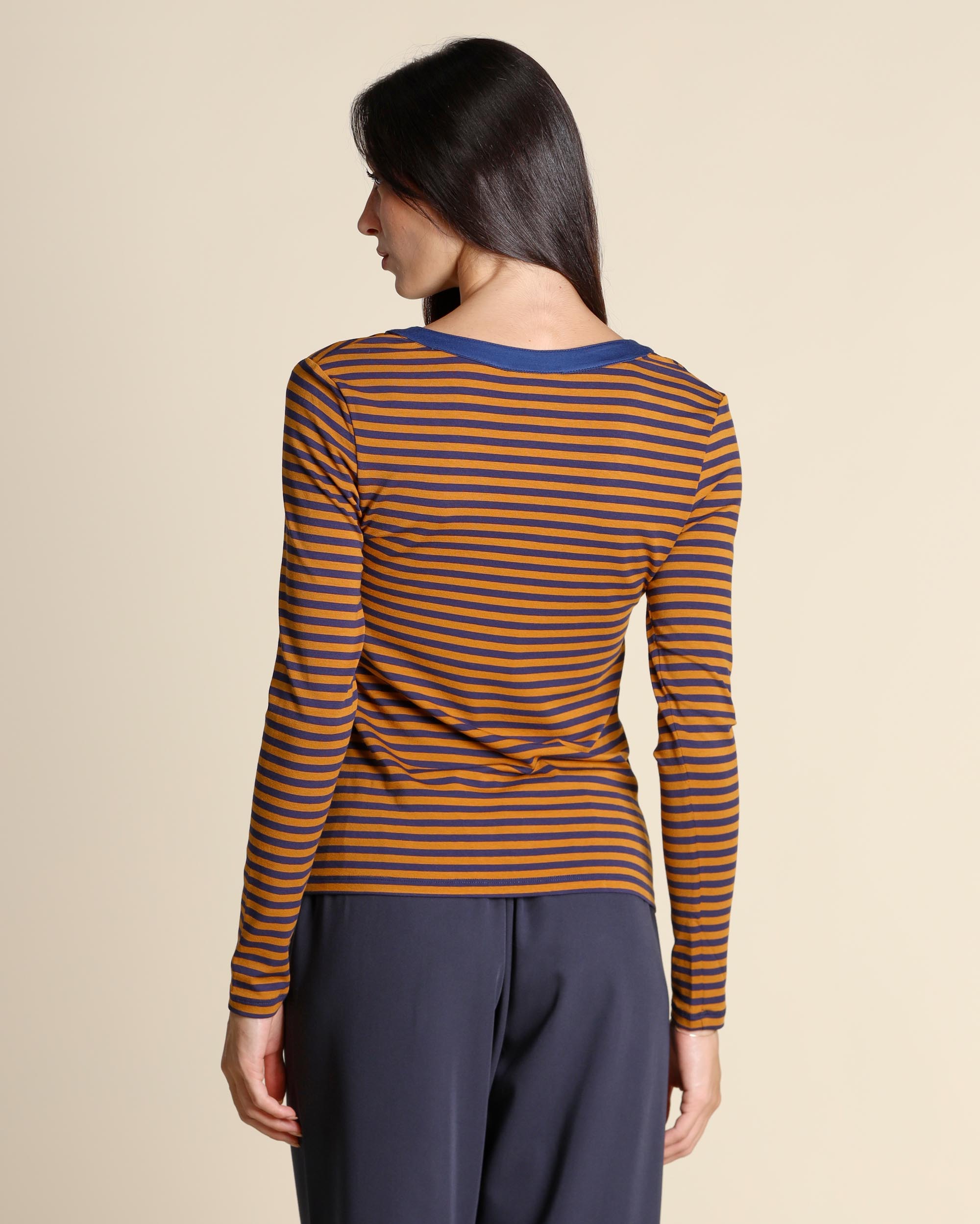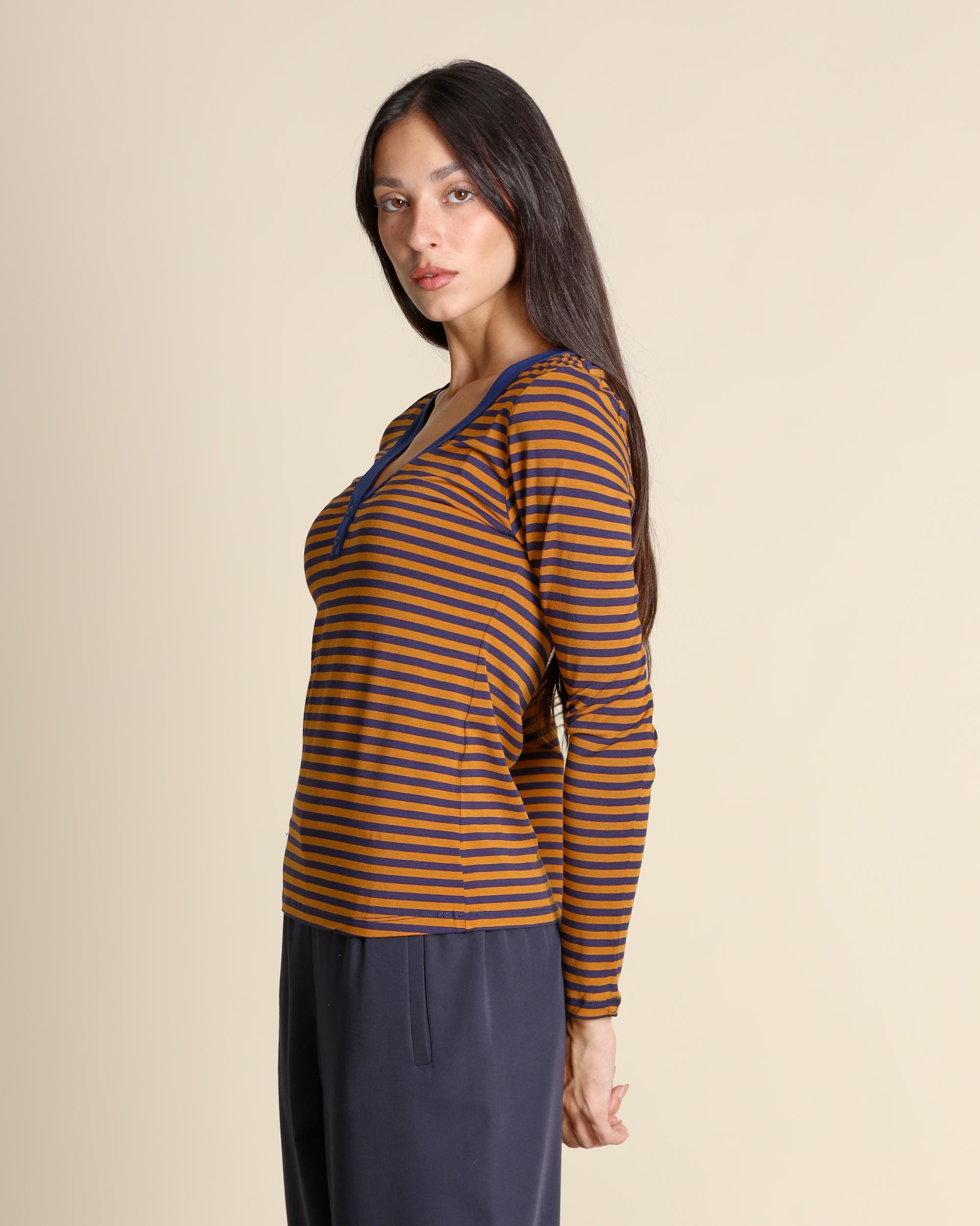 Maglia in jersey di viscosa stretch a righe blu e giallo ocra, scollo a V con bottoni, maniche lunghe, linea semiaderente, la modella indossa una tg.S, la modella ha le seguenti misure: altezza 173, seno 86,vita 65, fianchi 93, collezione donna Niù Autunno Inverno 2025/26