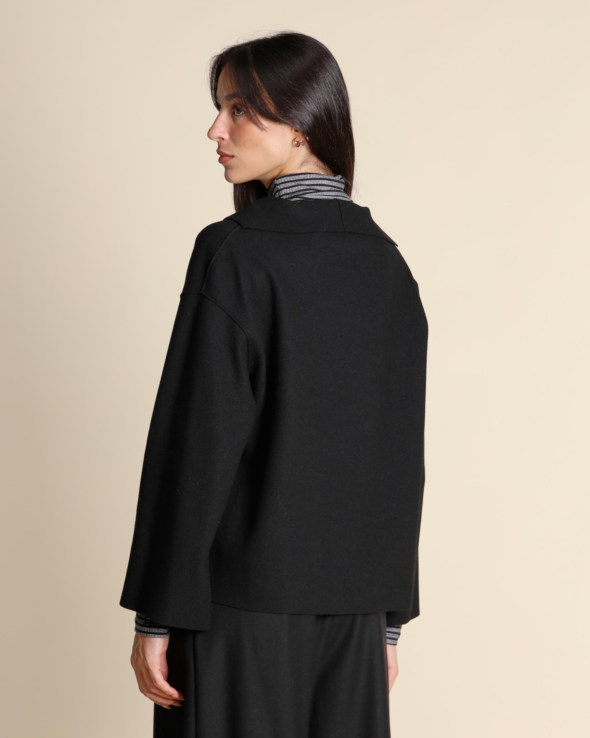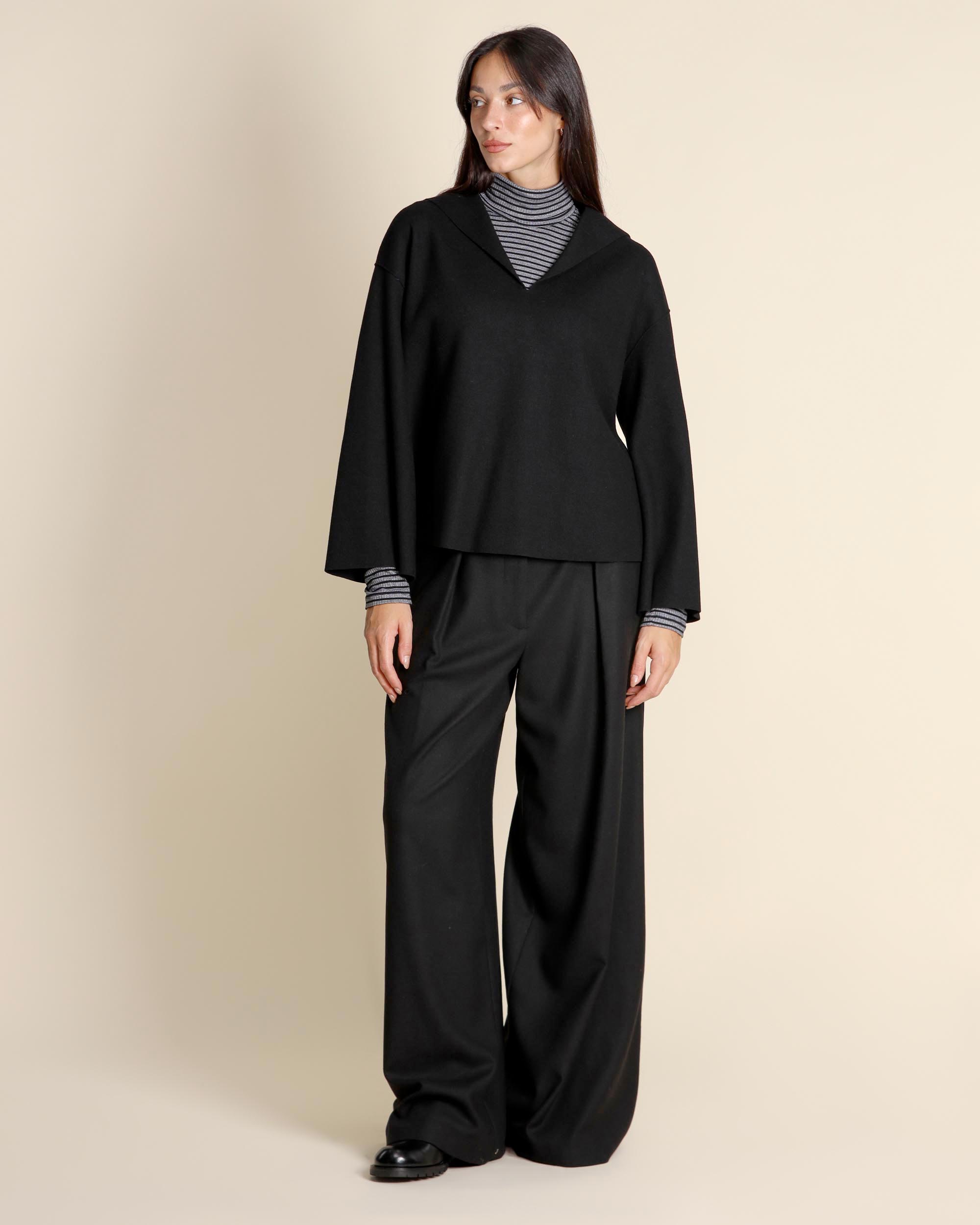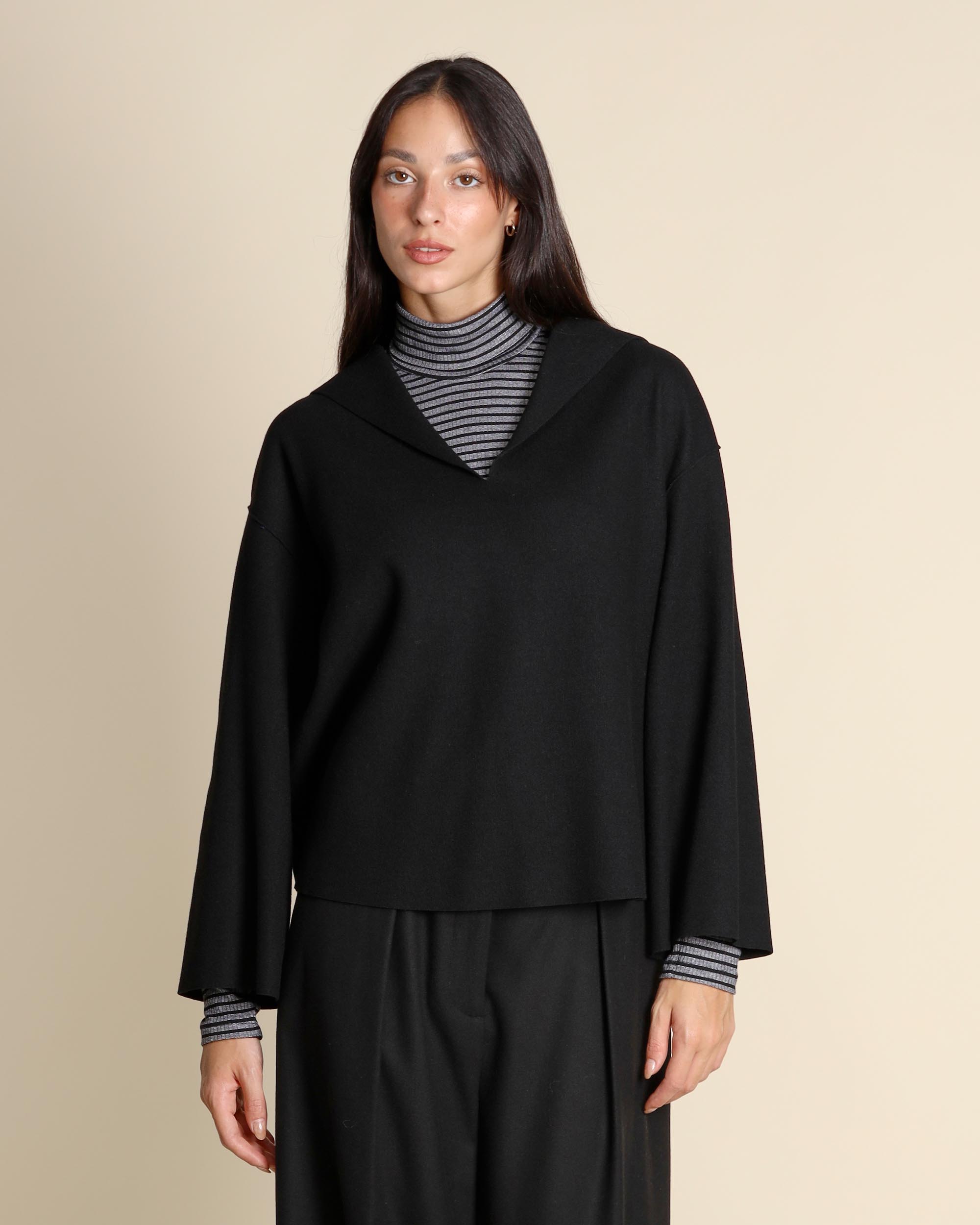 Maglia nera in jersey di misto lana effetto lana cotta, collo in piedi con apertura sul davanti, maniche lunghe, giro sceso, linea morbida, la modella indossa una tg.S, la modella ha le seguenti misure: altezza 173, seno 86,vita 65, fianchi 93, collezione donna Niù Autunno Inverno 2025/26
