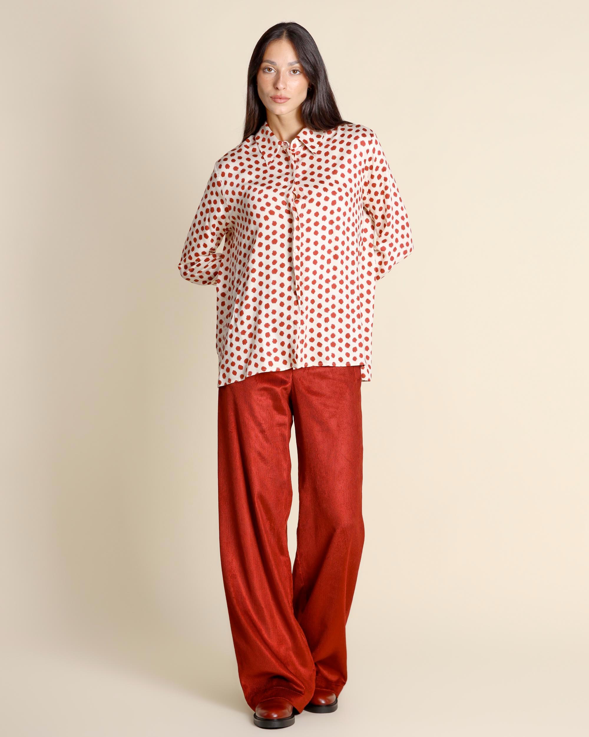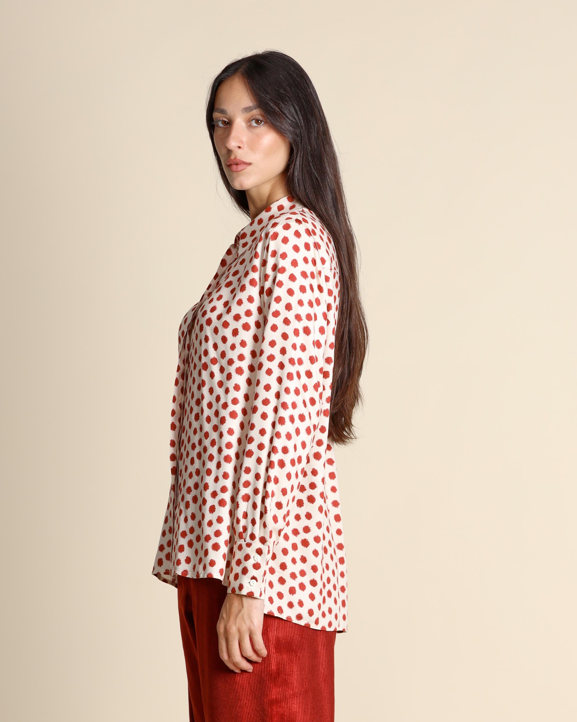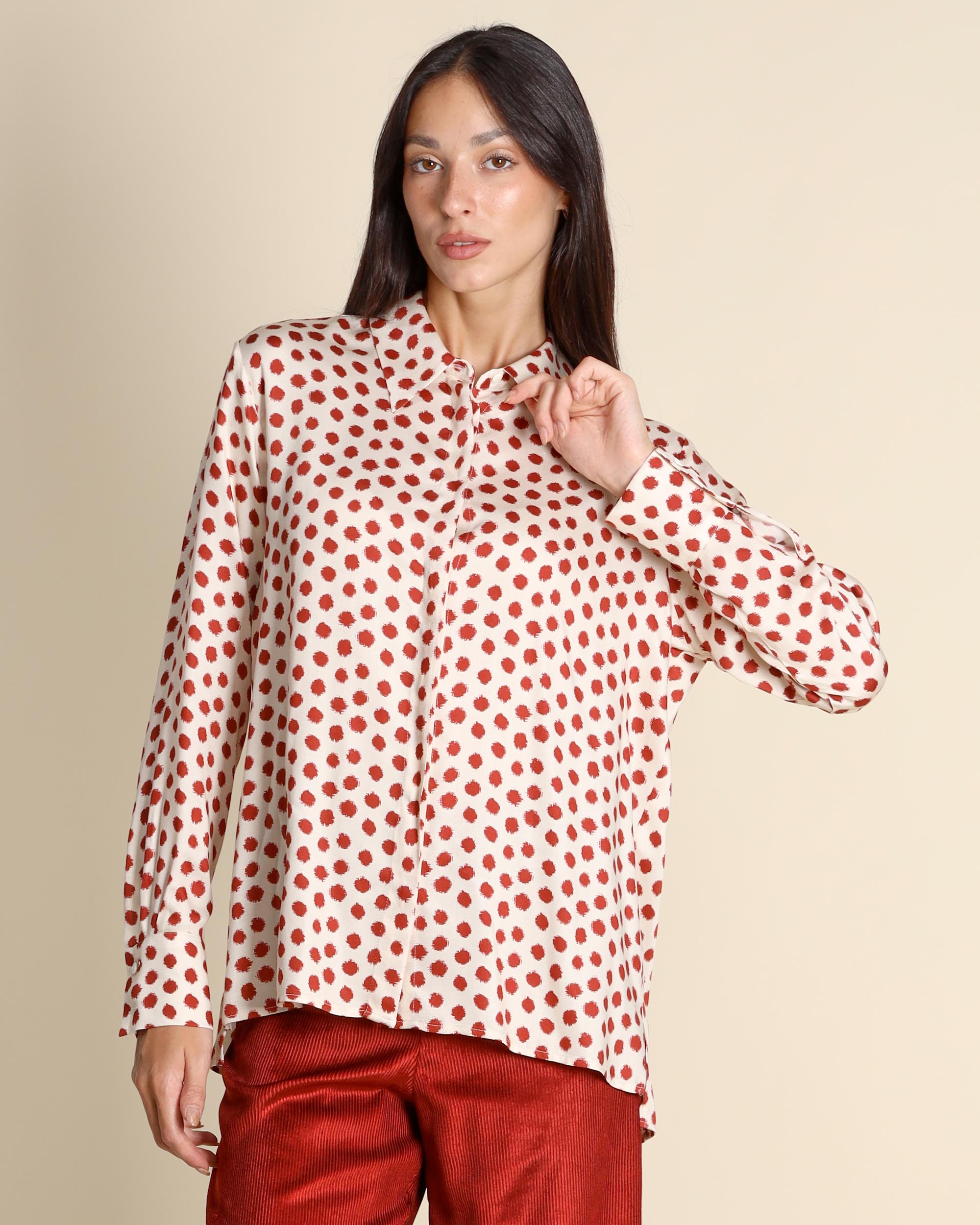 Camicia in twill di viscosa avorio a fantasia, collo a camicia, linea morbida, maniche lunghe con polsino, giro sceso, chiusura con bottoni nascosti, spacchi alterali, fondo più lungo dietro, la modella indossa una tg.S, la modella ha le seguenti misure: altezza 178, seno 86,vita 65, fianchi 93, collezione donna Niù Autunno Inverno 2025/26