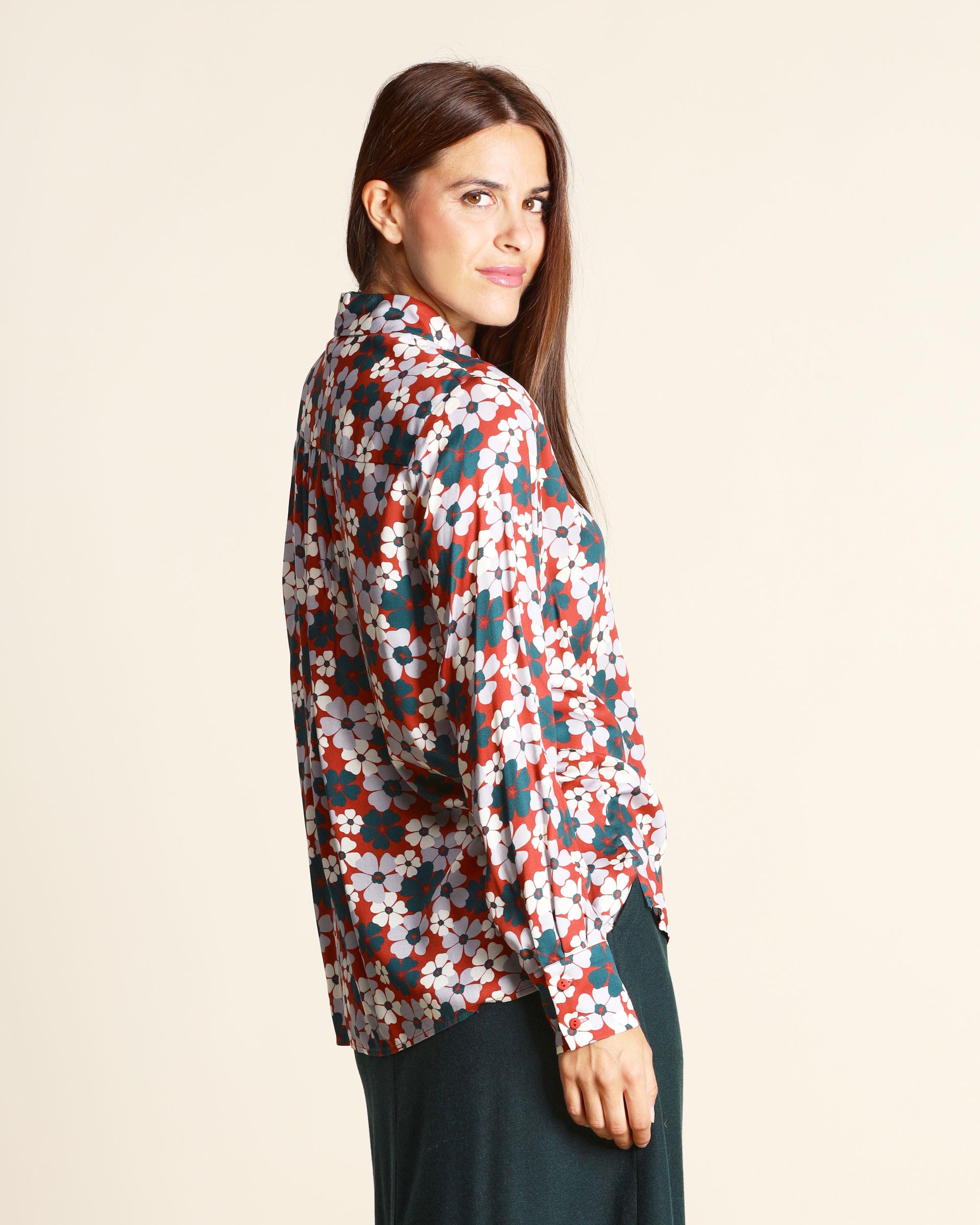 Camicia in twill di viscosa color coccio a fantasia floreale, collo a camicia, linea morbida, maniche lunghe con polsino, giro sceso, chiusura con bottoni nascosti, spacchi alterali, fondo più lungo dietro, la modella indossa una tg.S, la modella ha le seguenti misure: altezza 178, seno 86,vita 65, fianchi 93, collezione donna Niù Autunno Inverno 2025/26