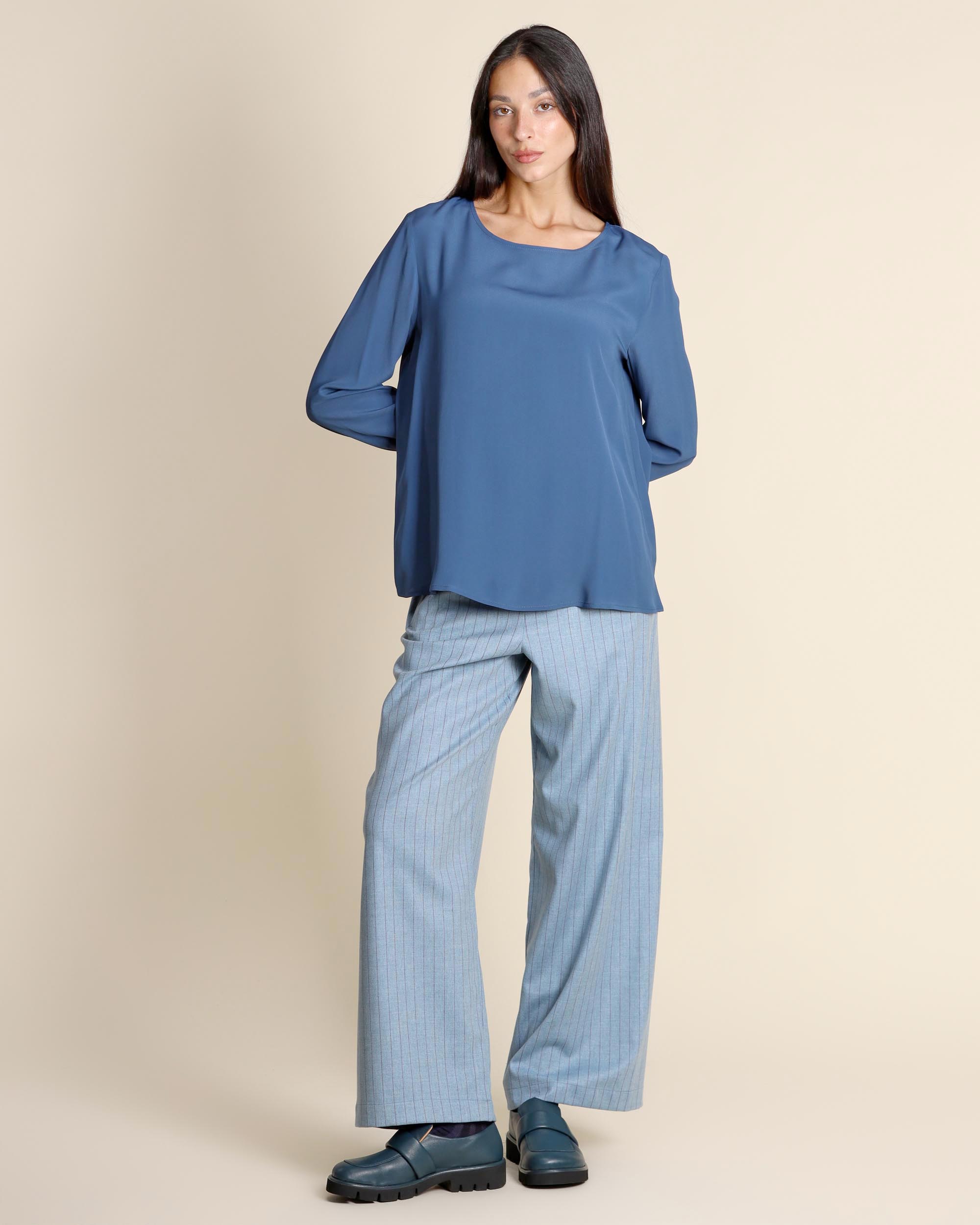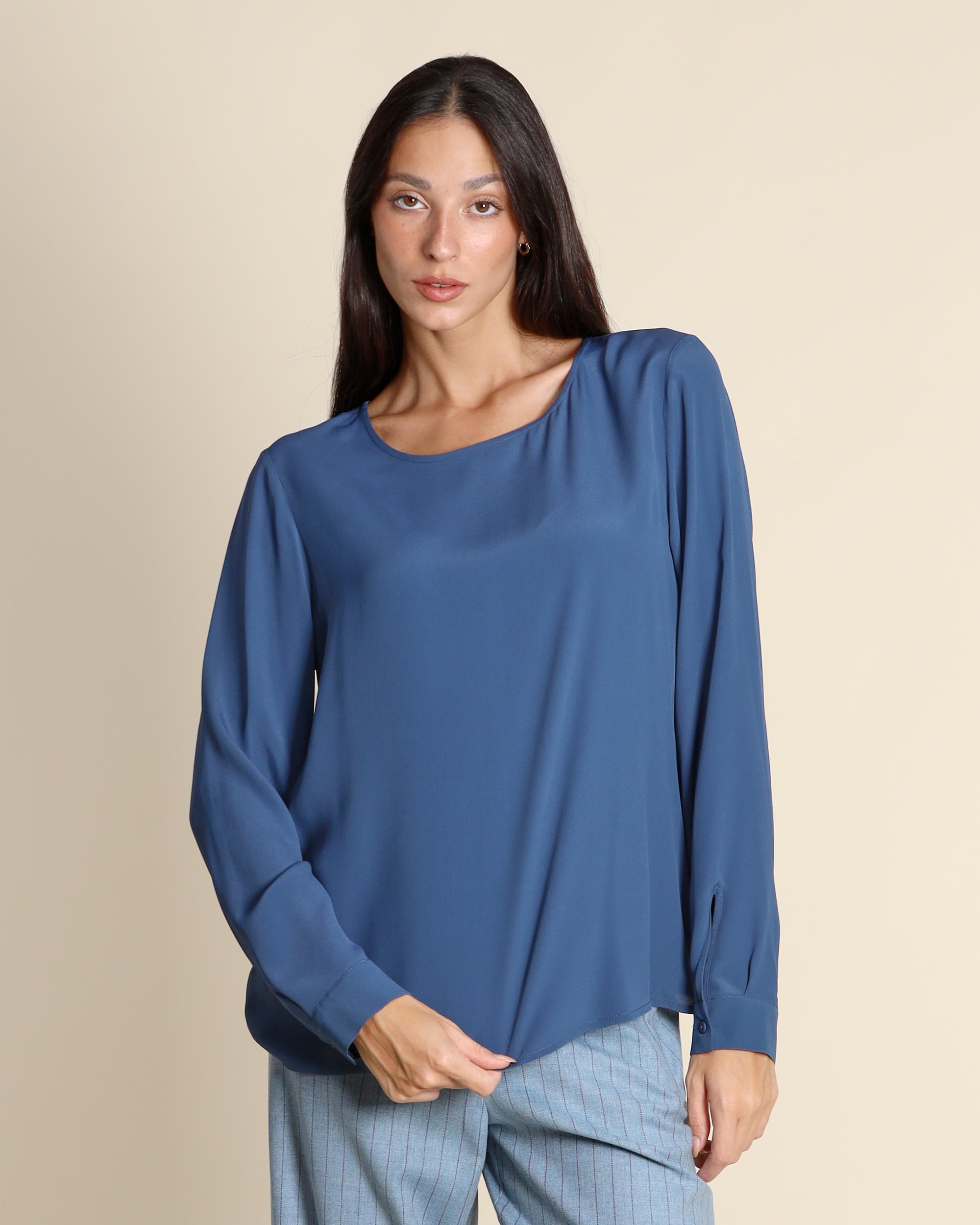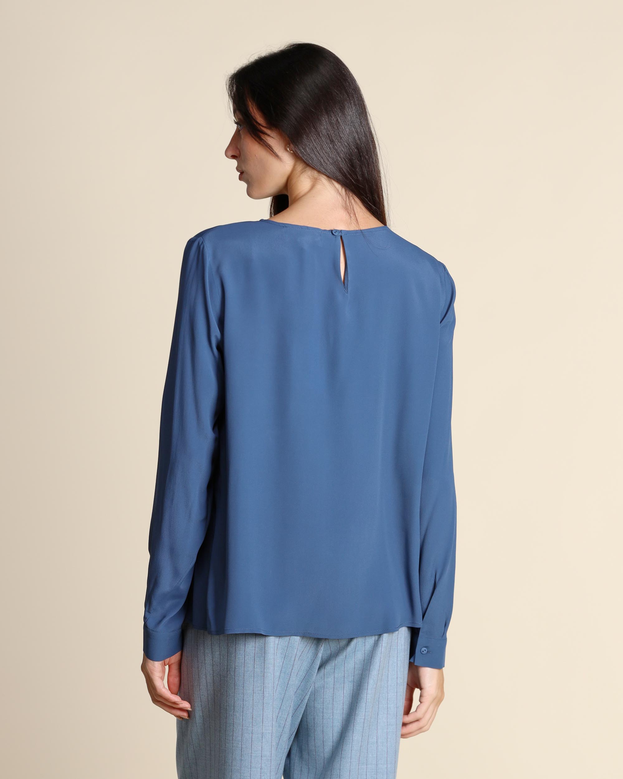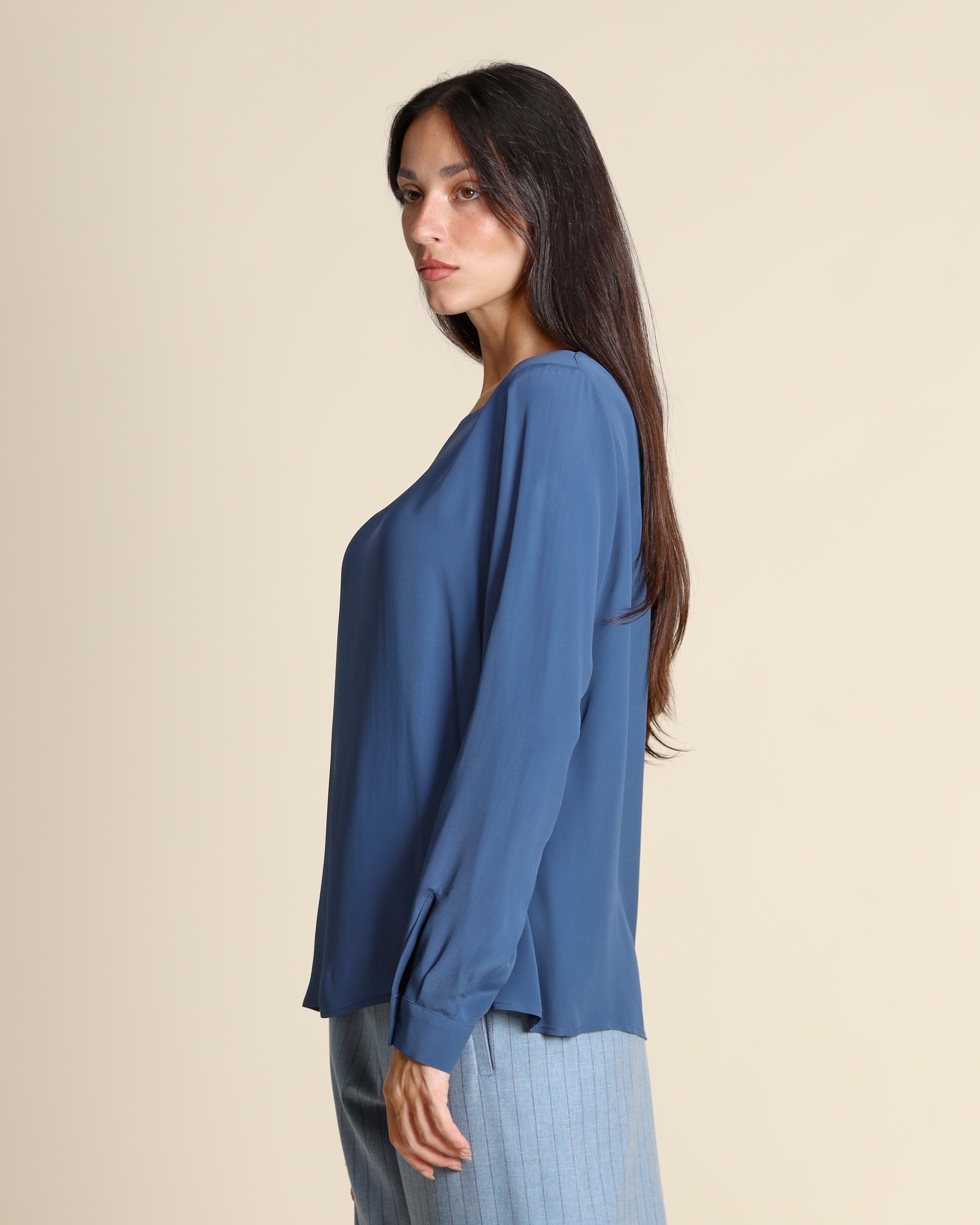 Blusa blu polvere in crepe di misto seta, scollo tondo con apertura a goccia sul dietro, maniche lunghe con polsino, linea dritta, la modella indossa una tg.S, la modella ha le seguenti misure: altezza 173, seno 86,vita 65, fianchi 93, collezione donna Niù Autunno Inverno 2025/26