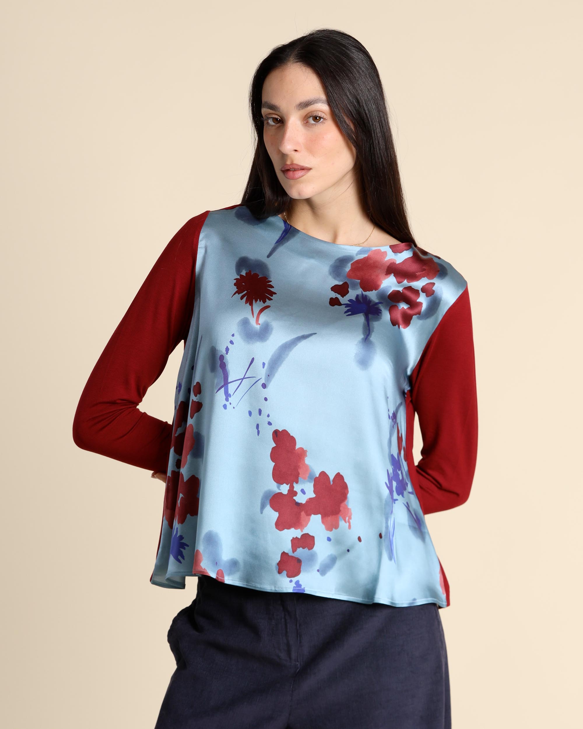 Camicia in bimateriale, seta stretch a fantasia e jersey di viscosa bordeaux unito, scollo a barchetta, linea dritta, maniche lunghe, la modella indossa una tg.S, la modella ha le seguenti misure: altezza 175, seno 86,vita 65, fianchi 93, collezione donna Niù Autunno Inverno 2025/26