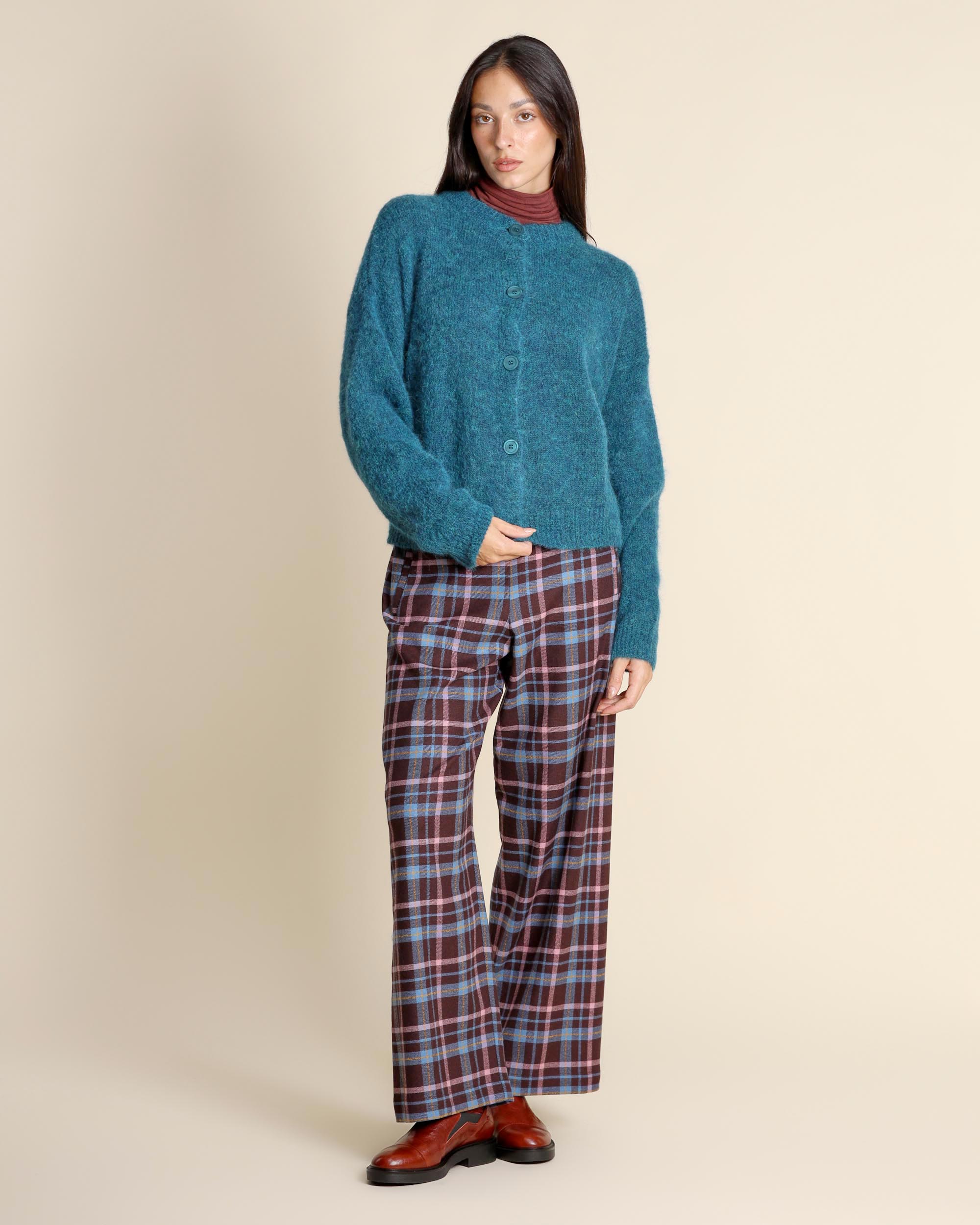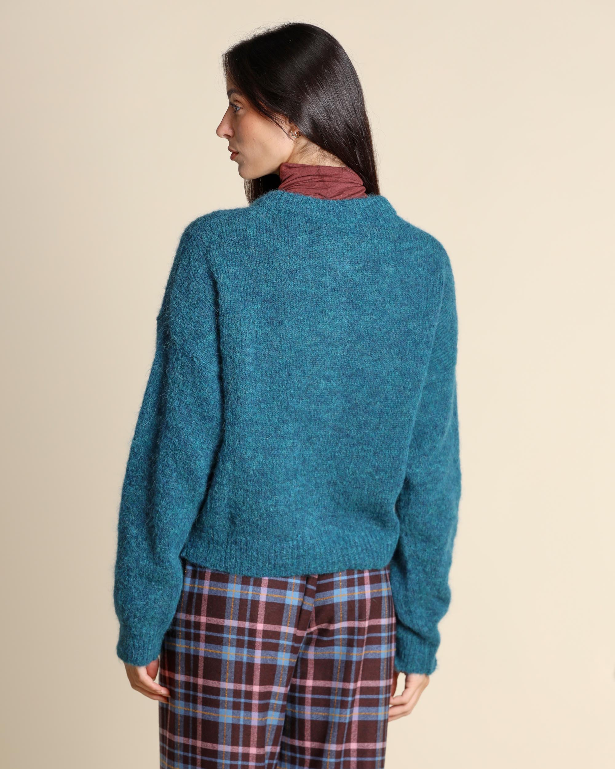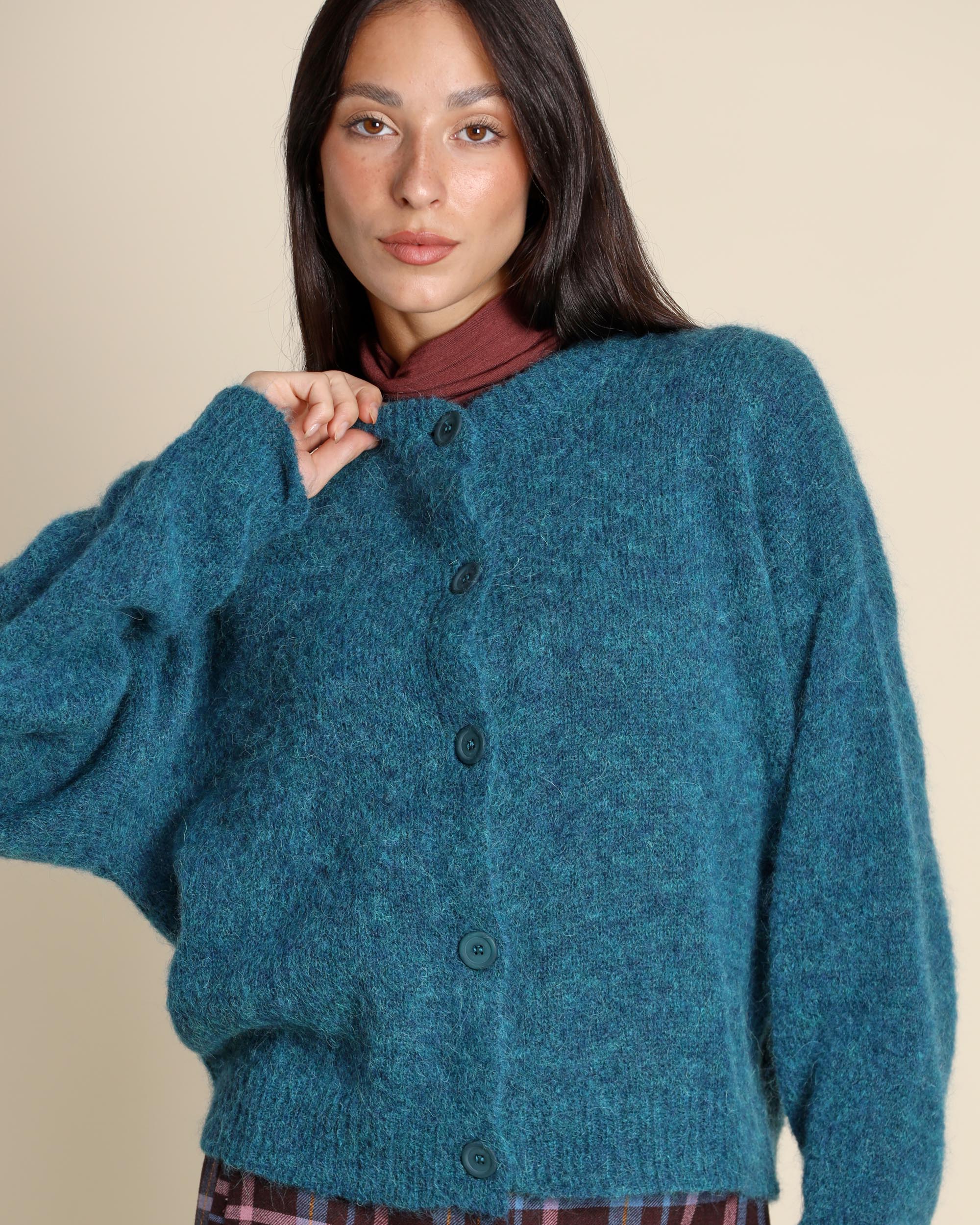 Cardigan color petrolio in misto alpaca, scollo tondo, maniche lunghe, chiusura con bottoni, linea morbida, made in Italy, la modella indossa una tg.S, la modella ha le seguenti misure: altezza 173, seno 86,vita 65, fianchi 93, collezione donna Niù Autunno Inverno 2025/26