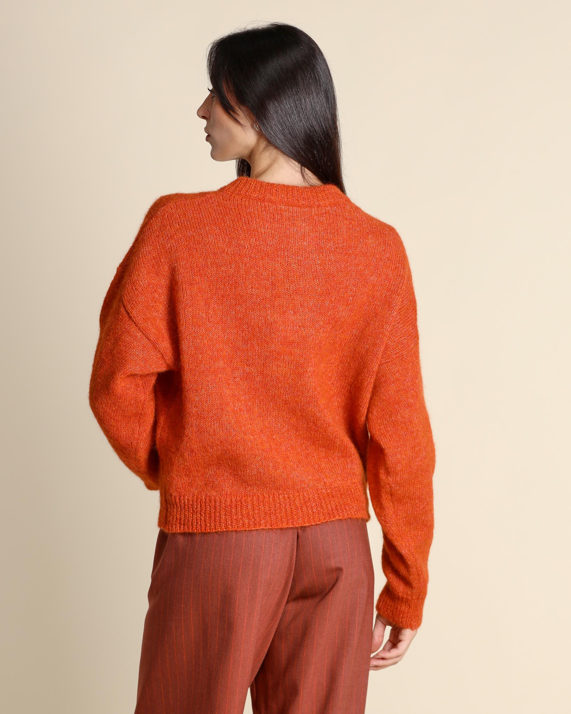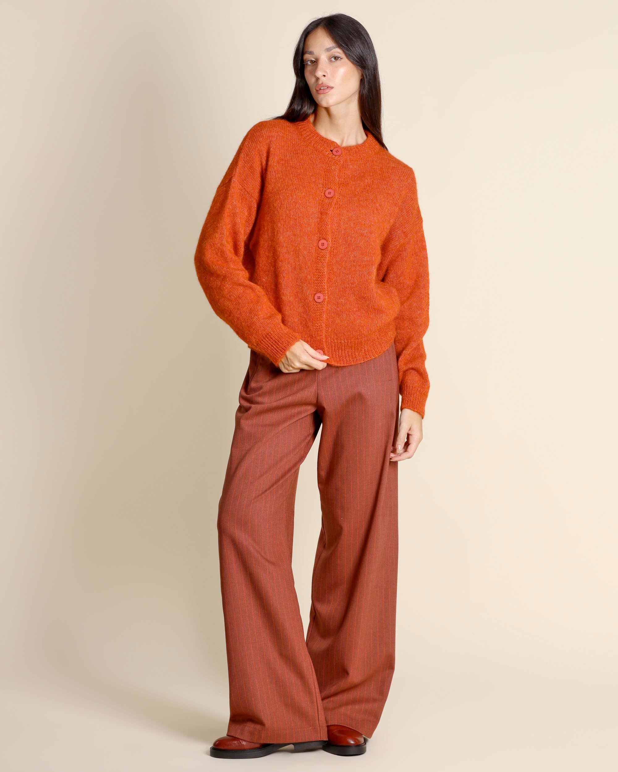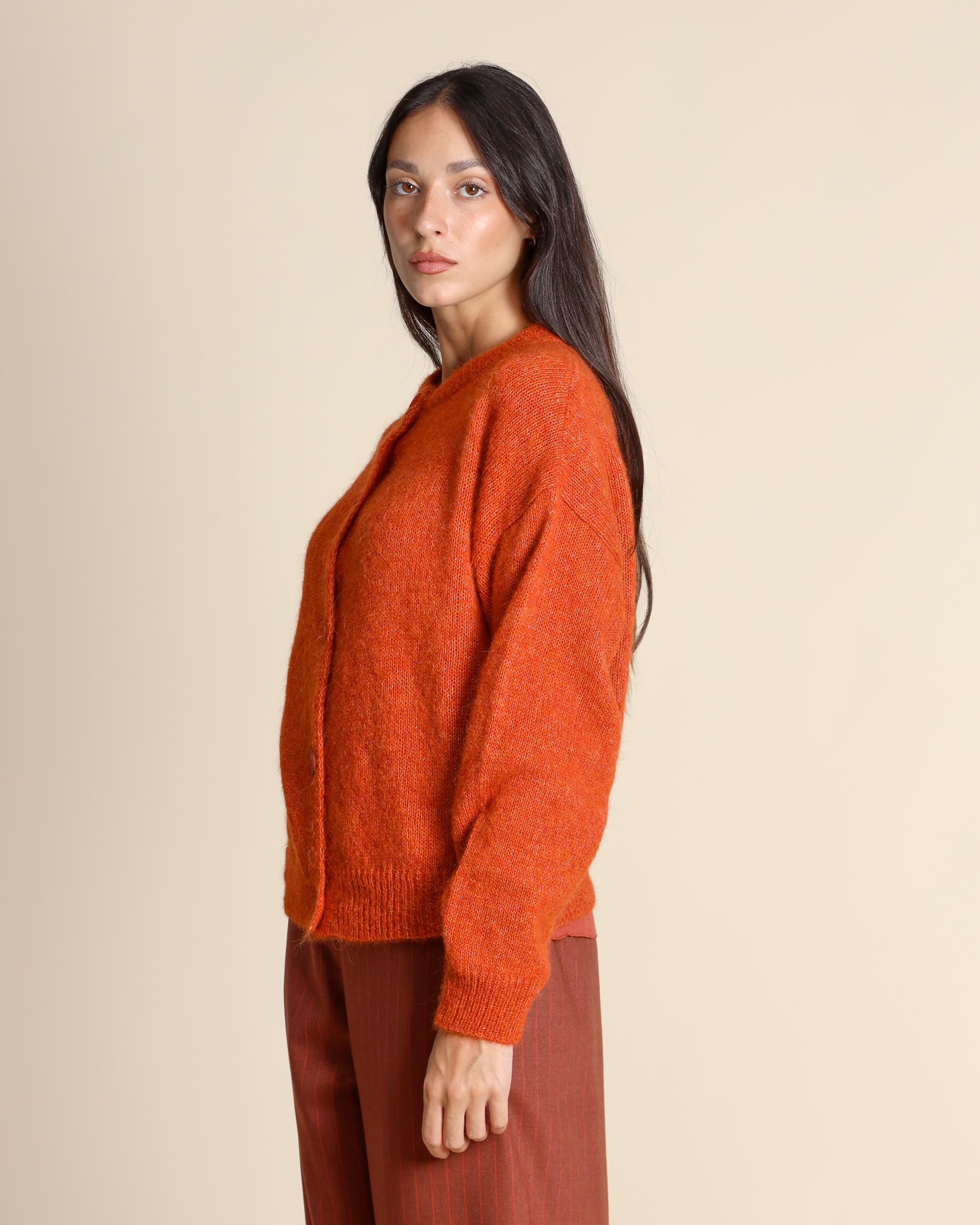 Cardigan arancio in misto alpaca, scollo tondo, maniche lunghe, chiusura con bottoni, linea morbida, made in Italy, la modella indossa una tg.S, la modella ha le seguenti misure: altezza 173, seno 86,vita 65, fianchi 93, collezione donna Niù Autunno Inverno 2025/26