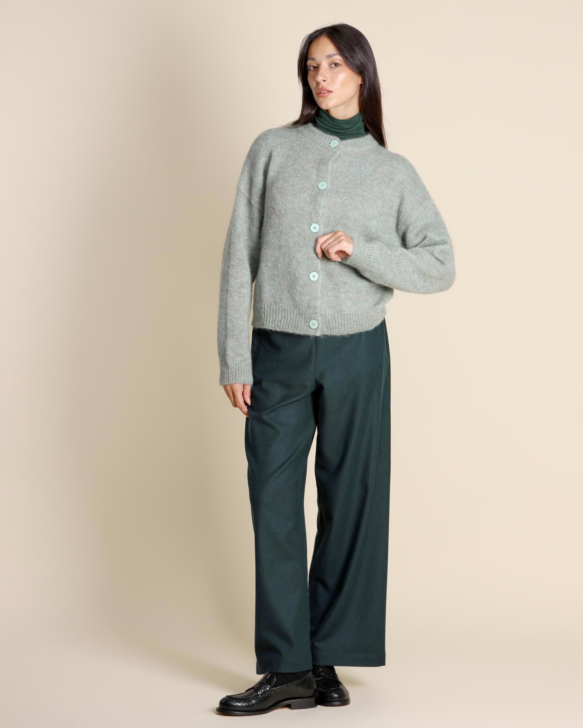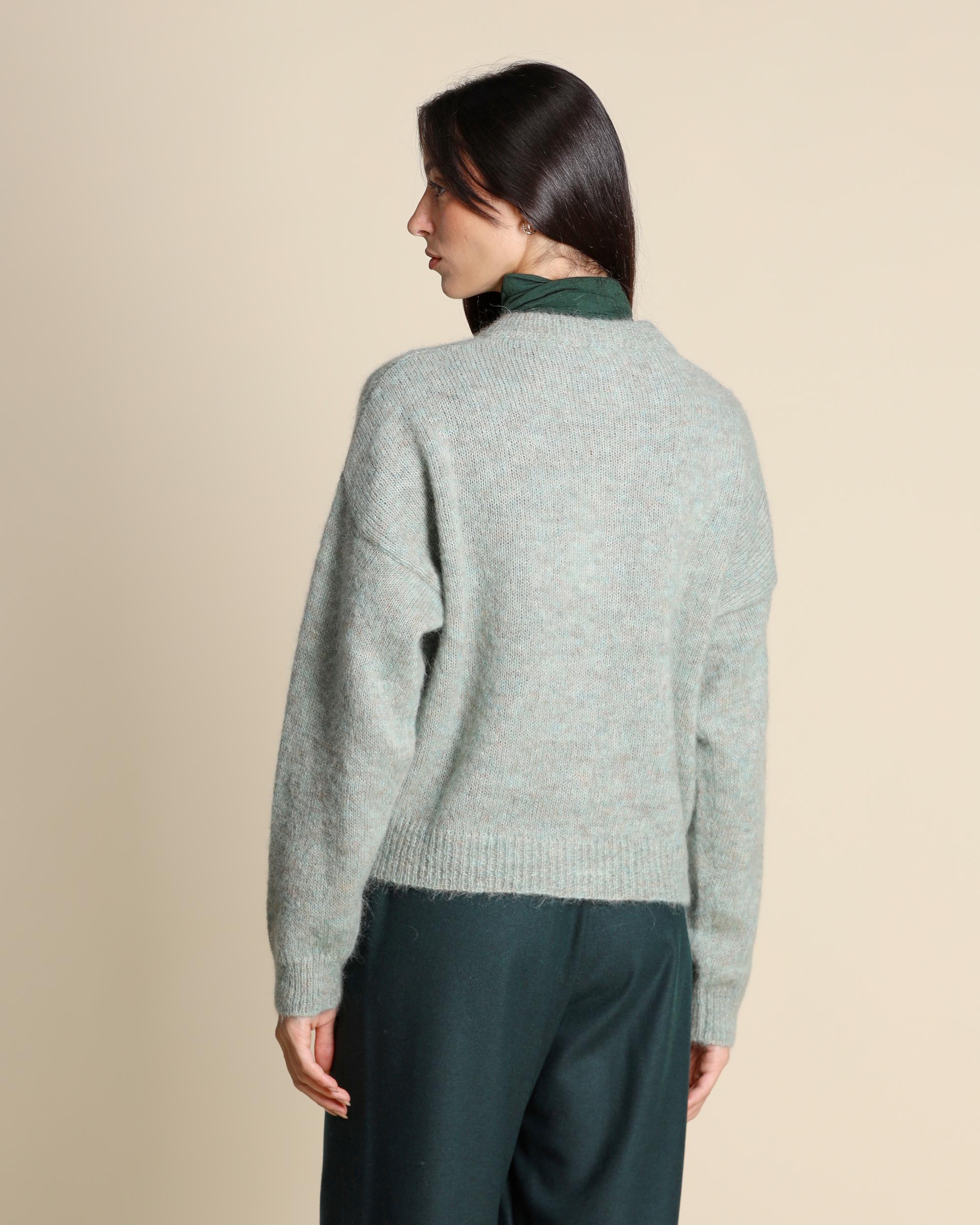 Cardigan verde acqua melange in misto alpaca, scollo tondo, maniche lunghe, chiusura con bottoni, linea morbida, made in Italy, la modella indossa una tg.S, la modella ha le seguenti misure: altezza 173, seno 86,vita 65, fianchi 93, collezione donna Niù Autunno Inverno 2025/26