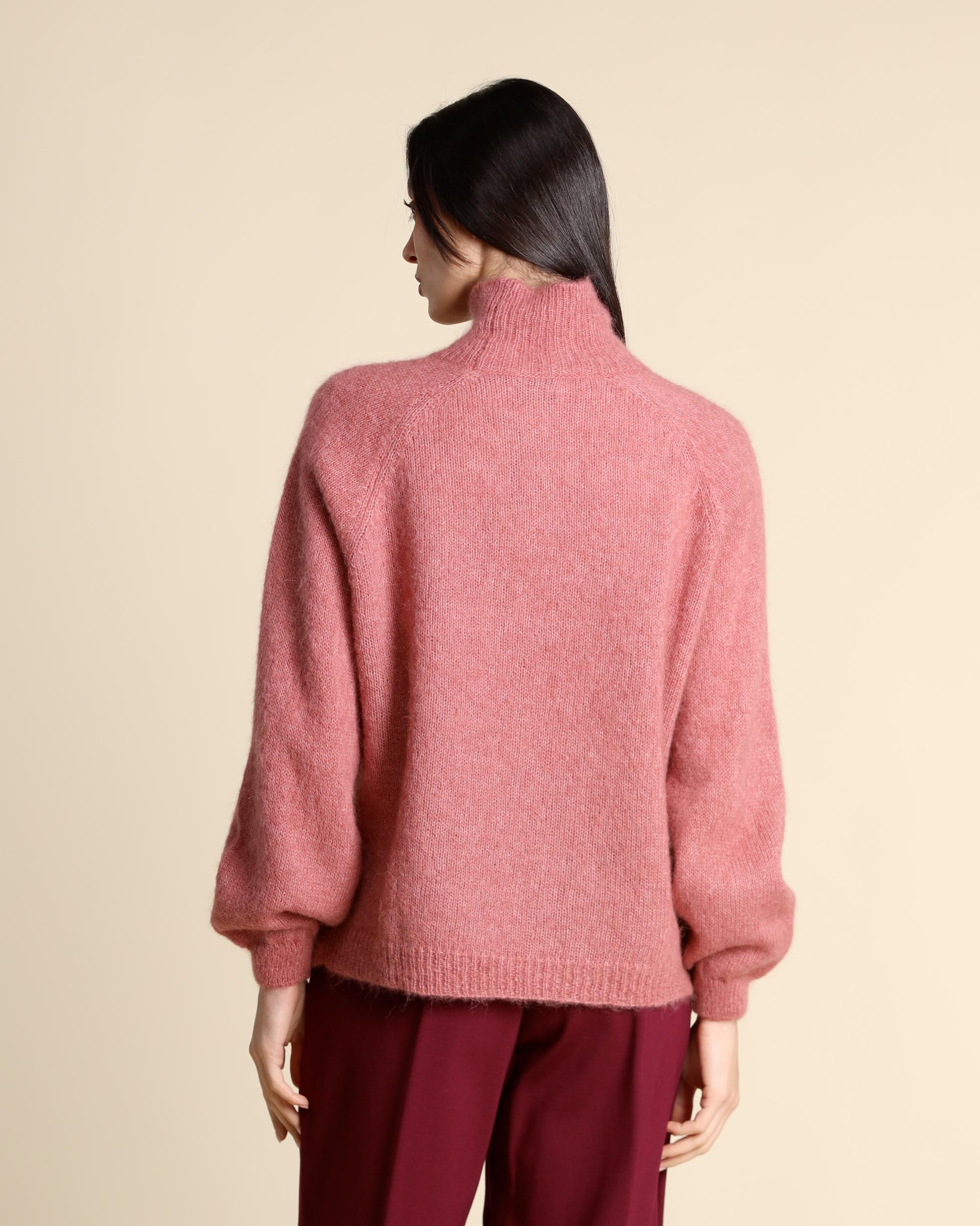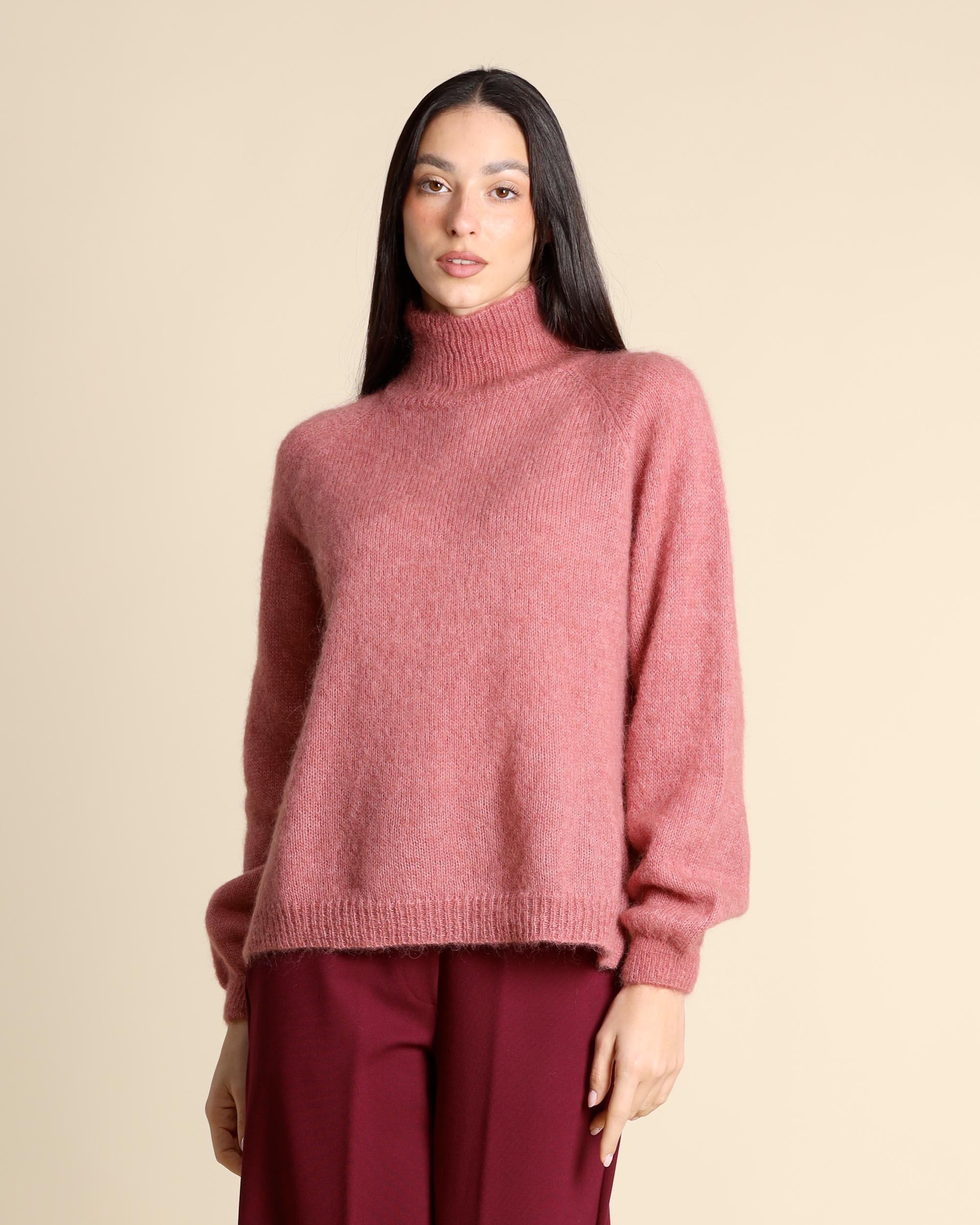 Maglia dolcevita rosa in misto alpaca, collo alto, maniche lunghe raglan, linea morbida, made in Italy, la modella indossa una tg.S, la modella ha le seguenti misure: altezza 177, seno 86,vita 65, fianchi 93, collezione donna Niù Autunno Inverno 2025/26