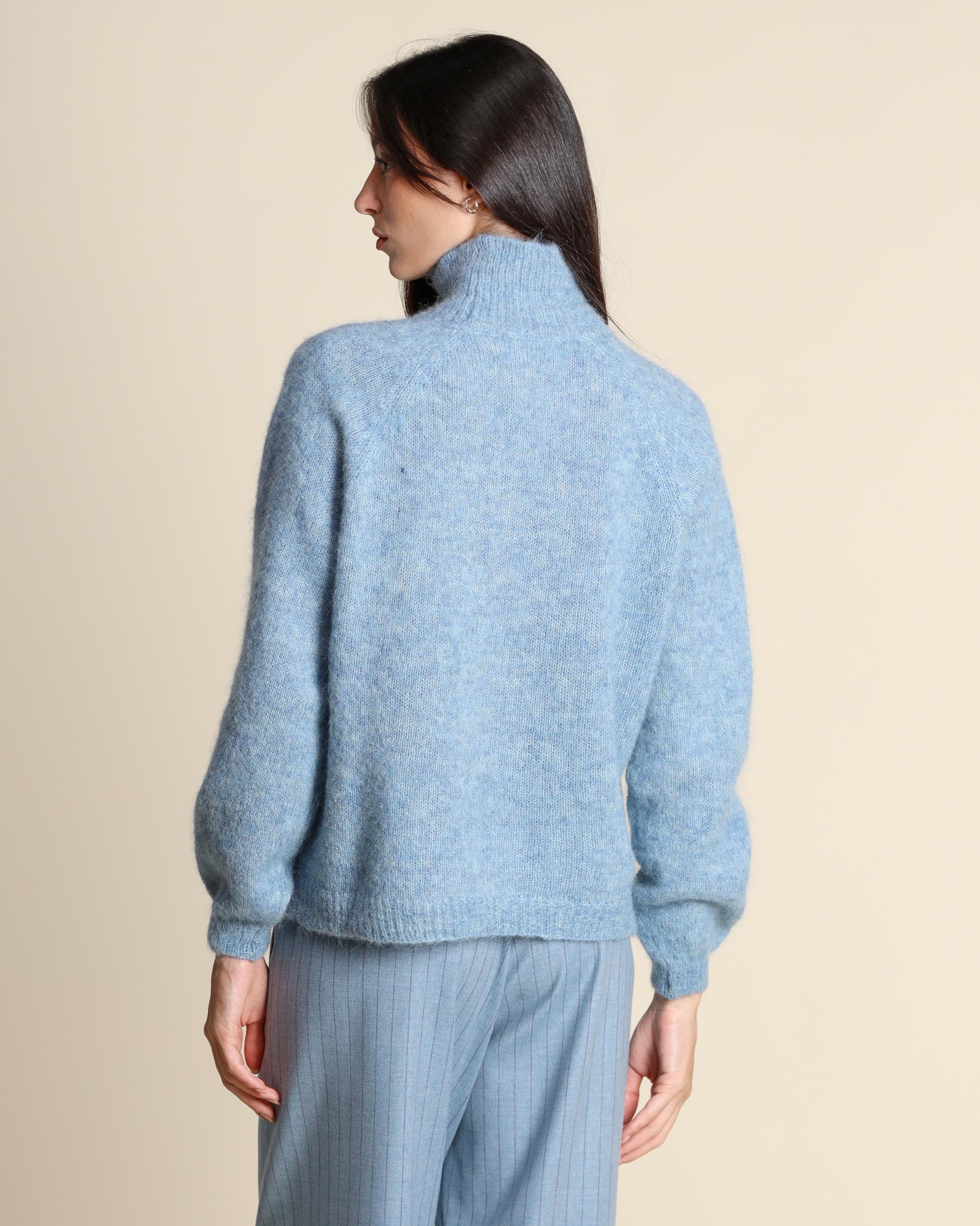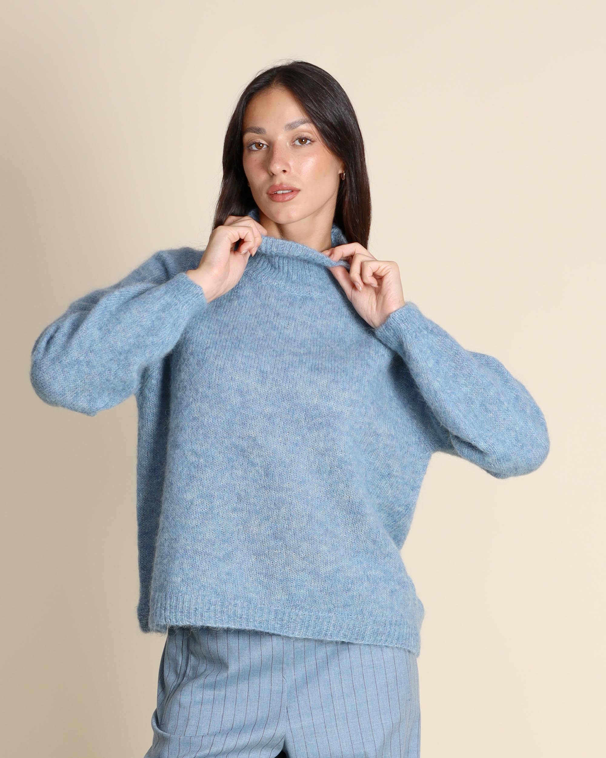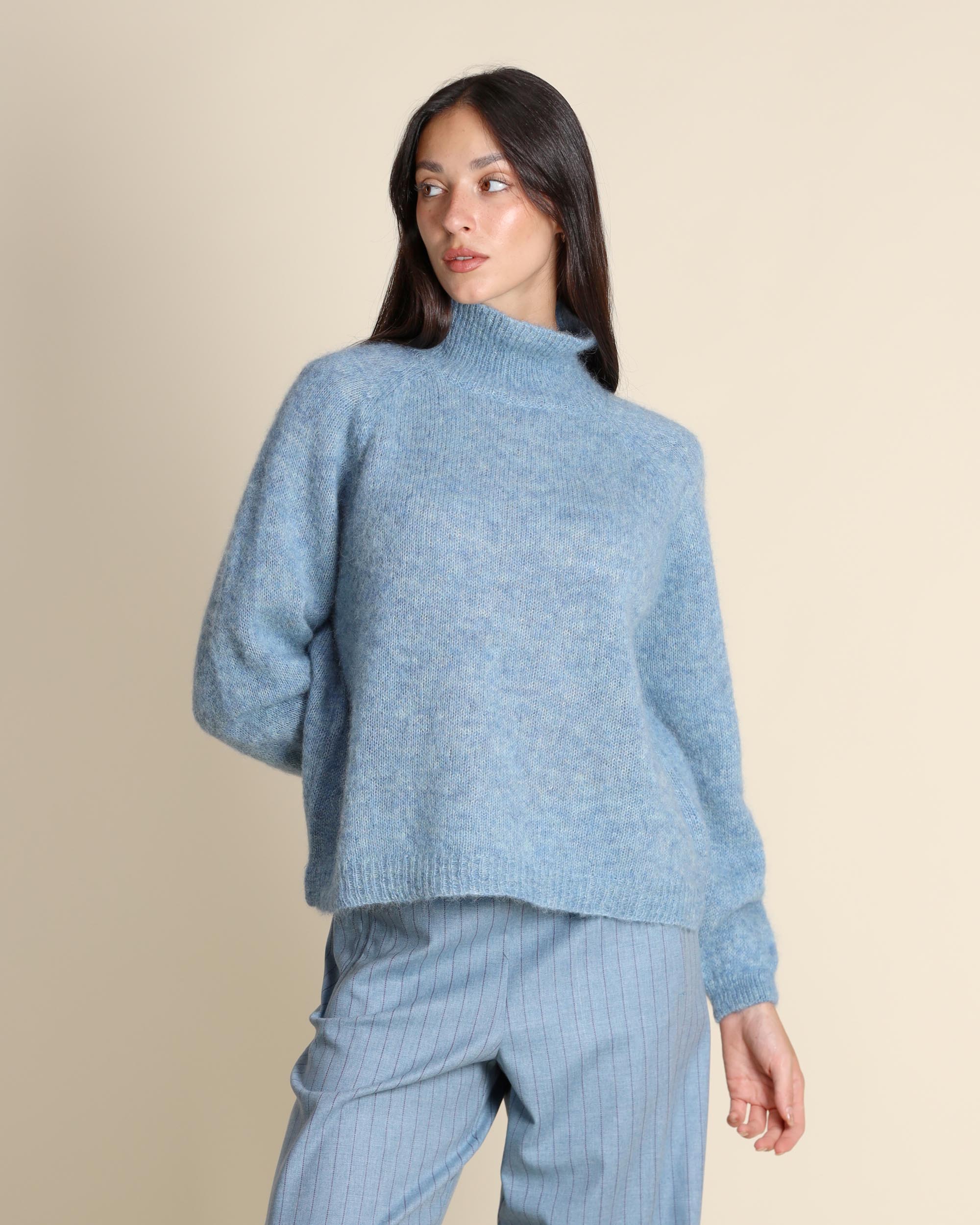 Maglia dolcevita in misto alpaca, collo alto, maniche lunghe raglan, linea morbida, made in Italy, la modella indossa una tg.S, la modella ha le seguenti misure: altezza 173, seno 86,vita 65, fianchi 93, collezione donna Niù Autunno Inverno 2025/26