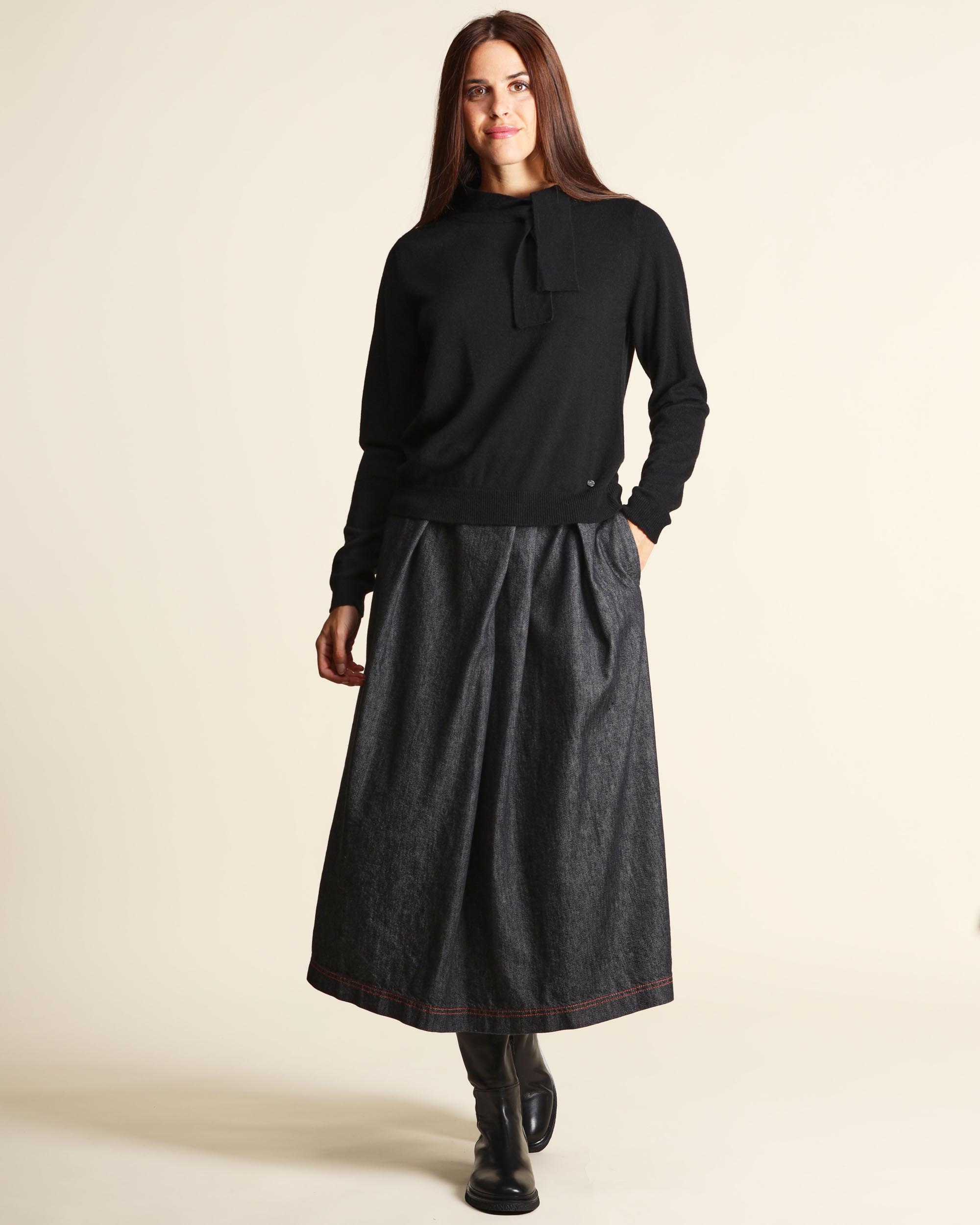 Maglia nera in misto lana, viscosa e cashmere, collo con fiocco, maniche lunghe, linea dritta, la modella indossa una tg.S, la modella ha le seguenti misure: altezza 178, seno 86,vita 65, fianchi 93, collezione donna Niù Autunno Inverno 2025/26
