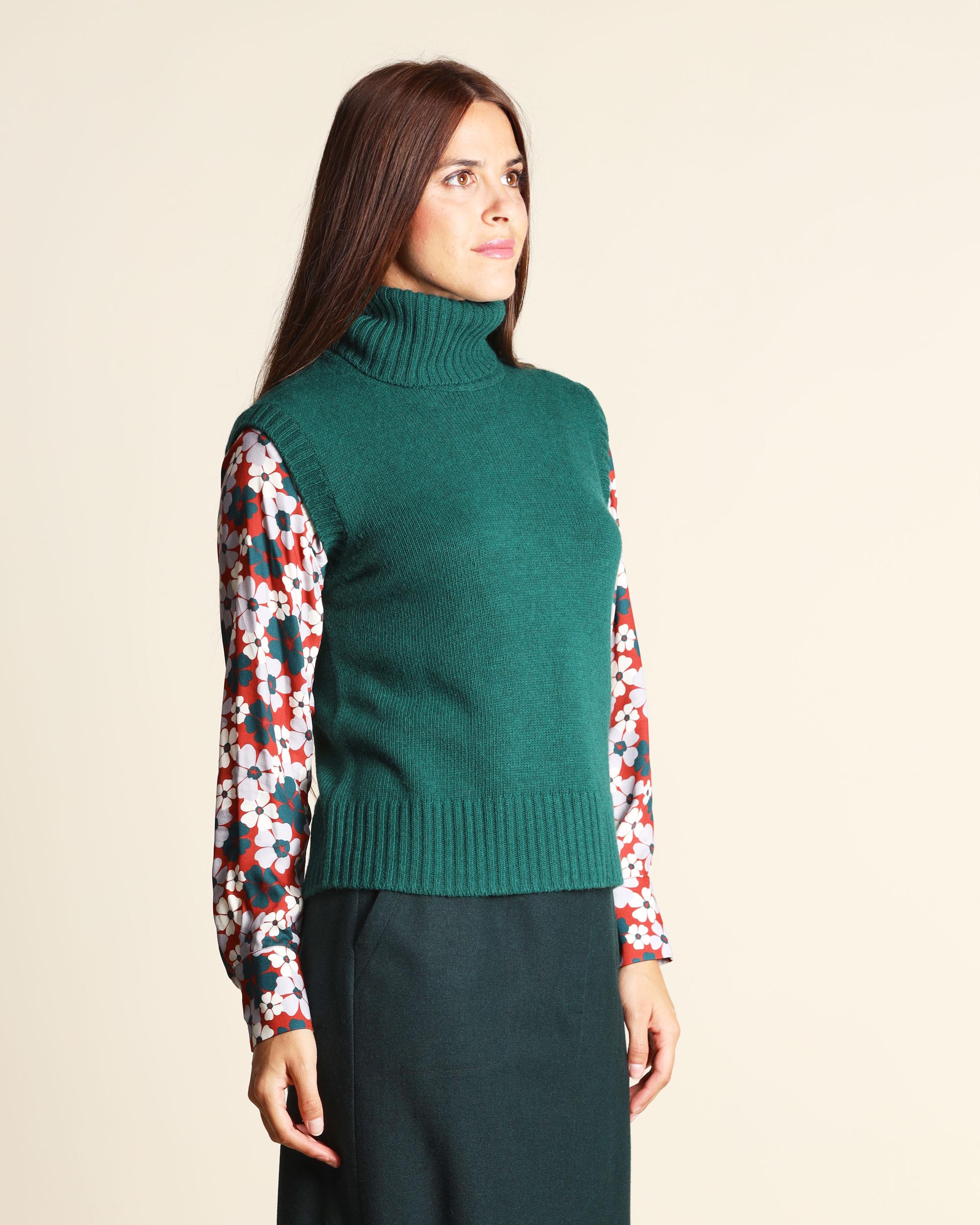 Gilet verde in misto lana, viscosa e cashmere, collo alto, senza maniche, linea morbida, la modella indossa una tg.S, la modella ha le seguenti misure: altezza 178, seno 86,vita 65, fianchi 93, collezione donna Niù Autunno Inverno 2025/26