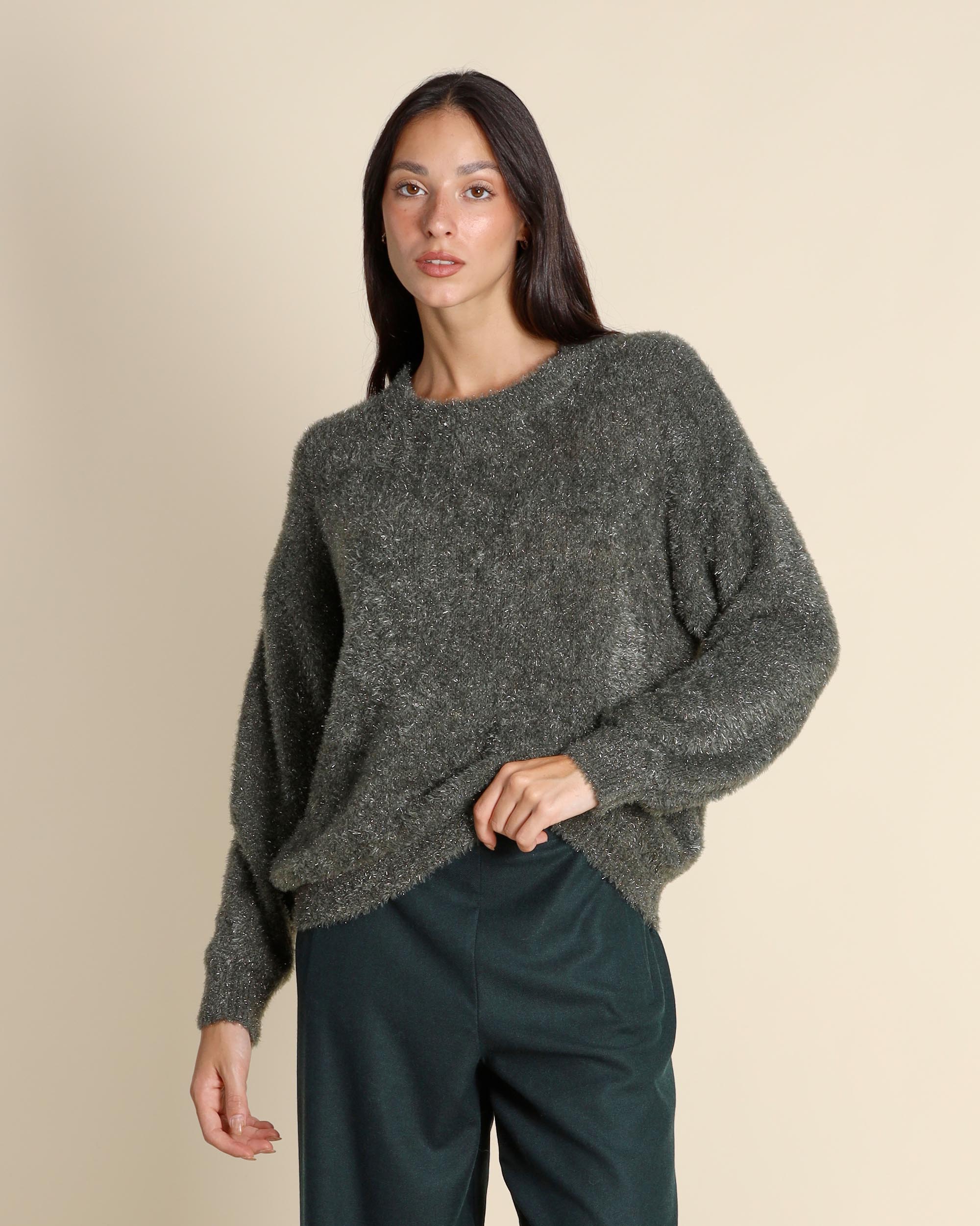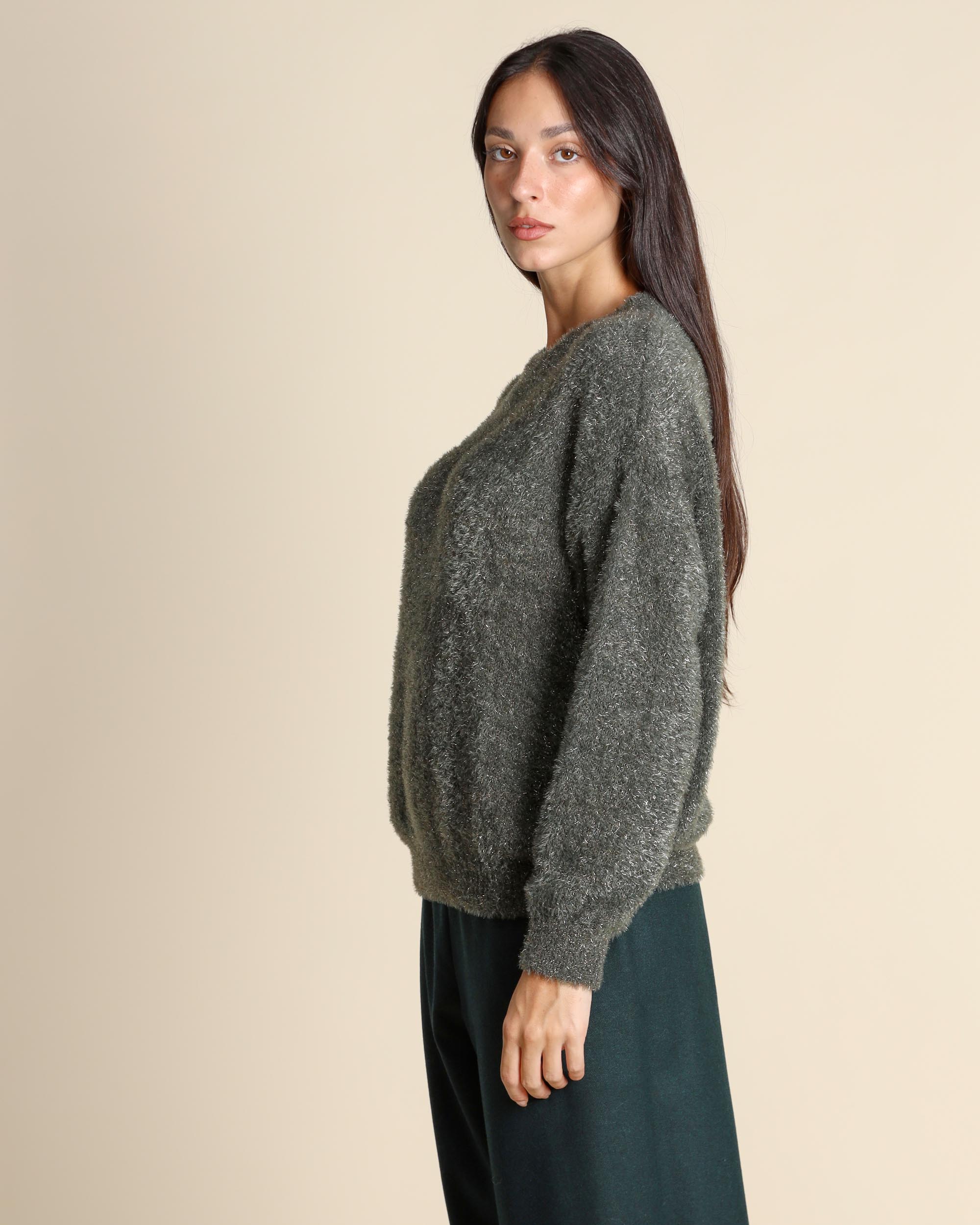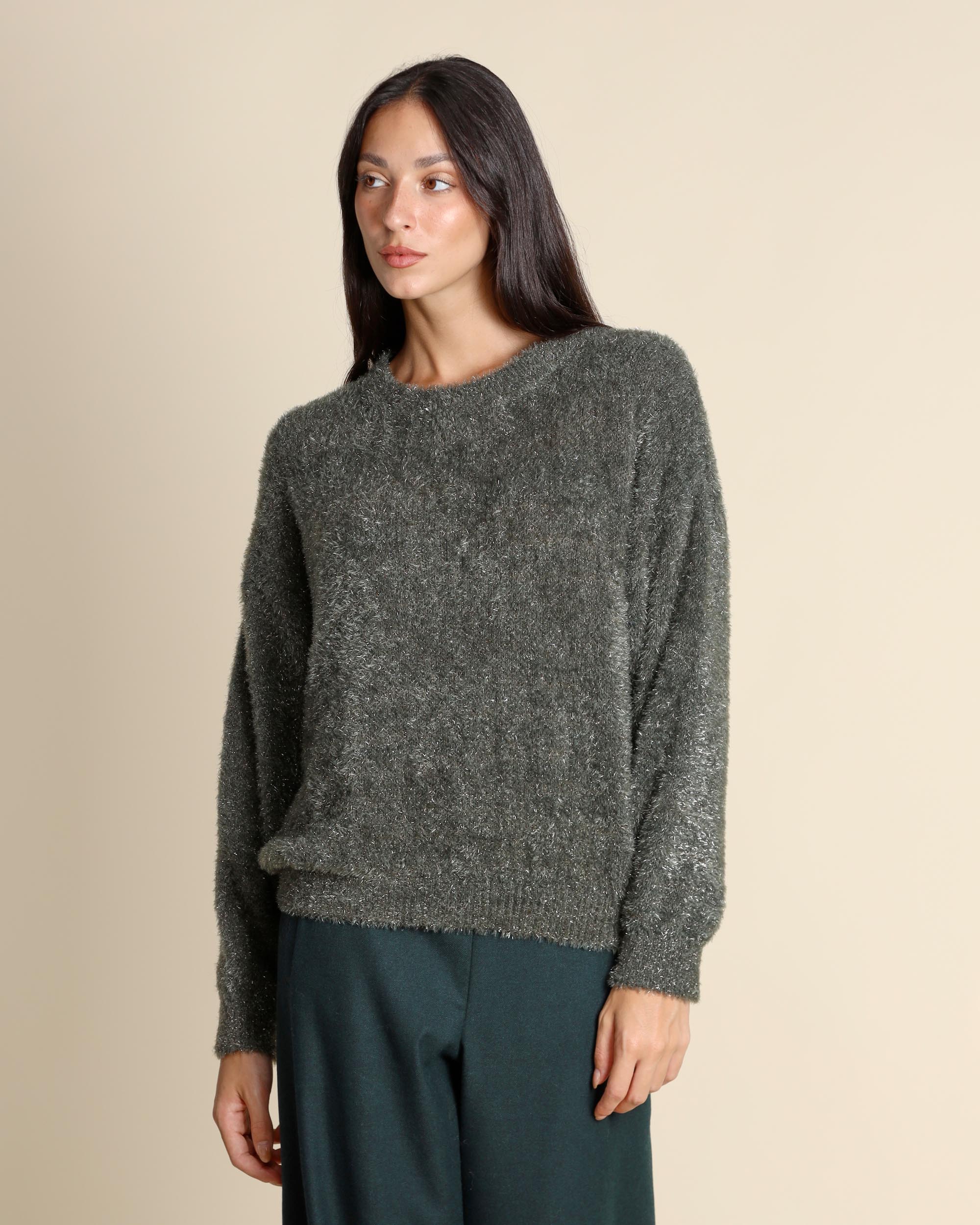 Maglia con lurex verde, girocollo, linea morbida, maniche lunghe, giro sceso, made in Italy, la modella indossa una tg.S, la modella ha le seguenti misure: altezza 178, seno 86,vita 65, fianchi 93, collezione donna Niù Autunno Inverno 2025/26