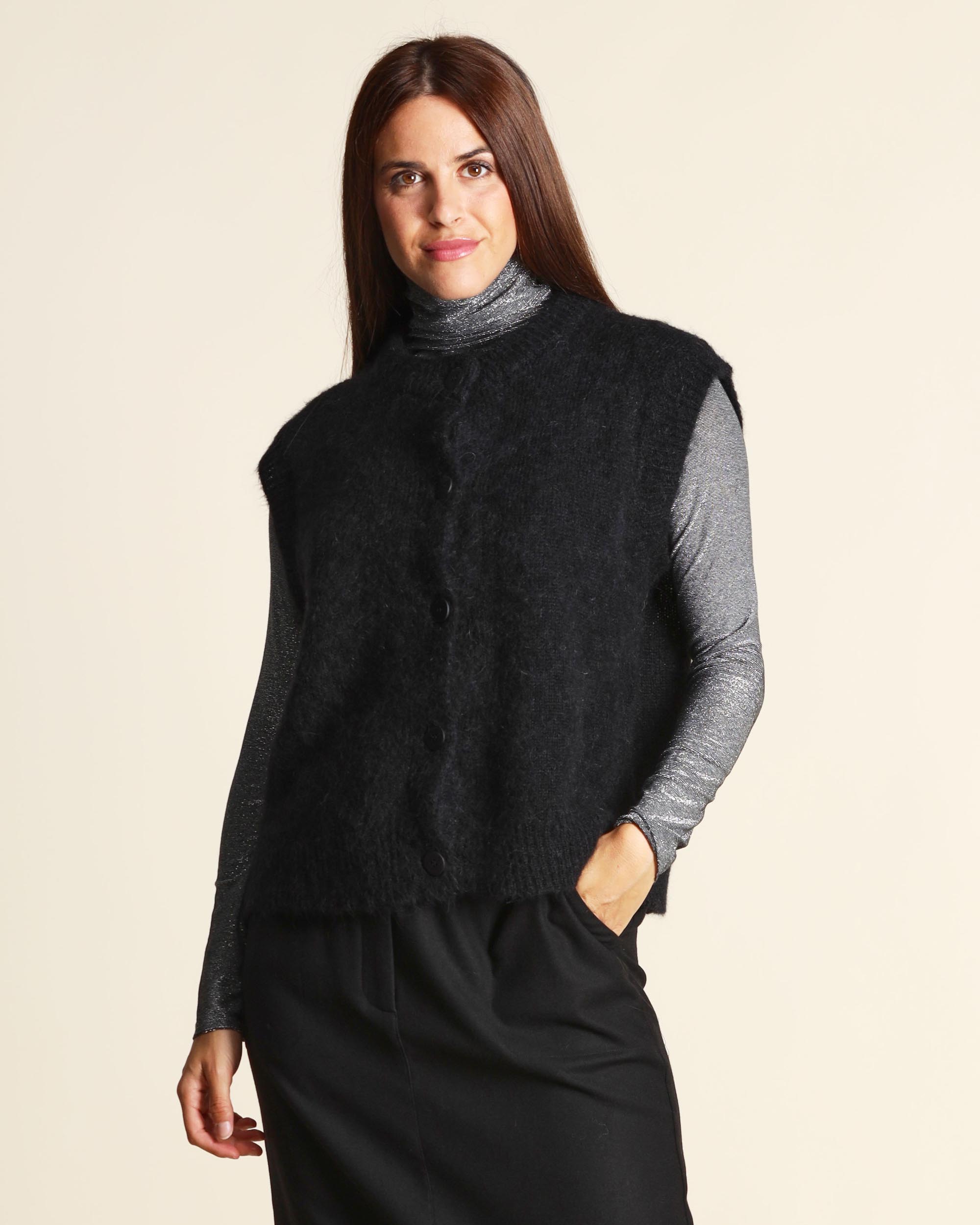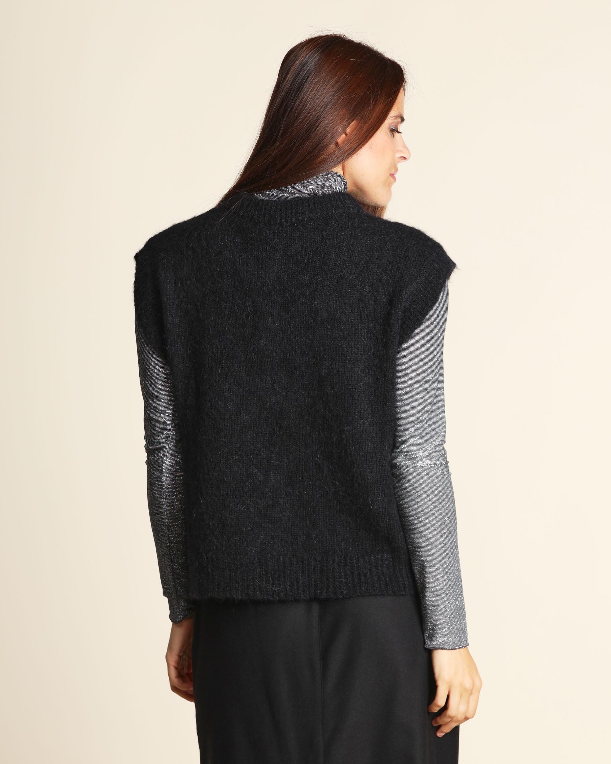 Gilet nero in alpaca, scollo tondo, senza maniche, chiusura con bottoni, linea morbida, made in Italy, la modella indossa una tg.S, la modella ha le seguenti misure: altezza 178, seno 86,vita 65, fianchi 93, collezione donna Niù Autunno Inverno 2025/26
