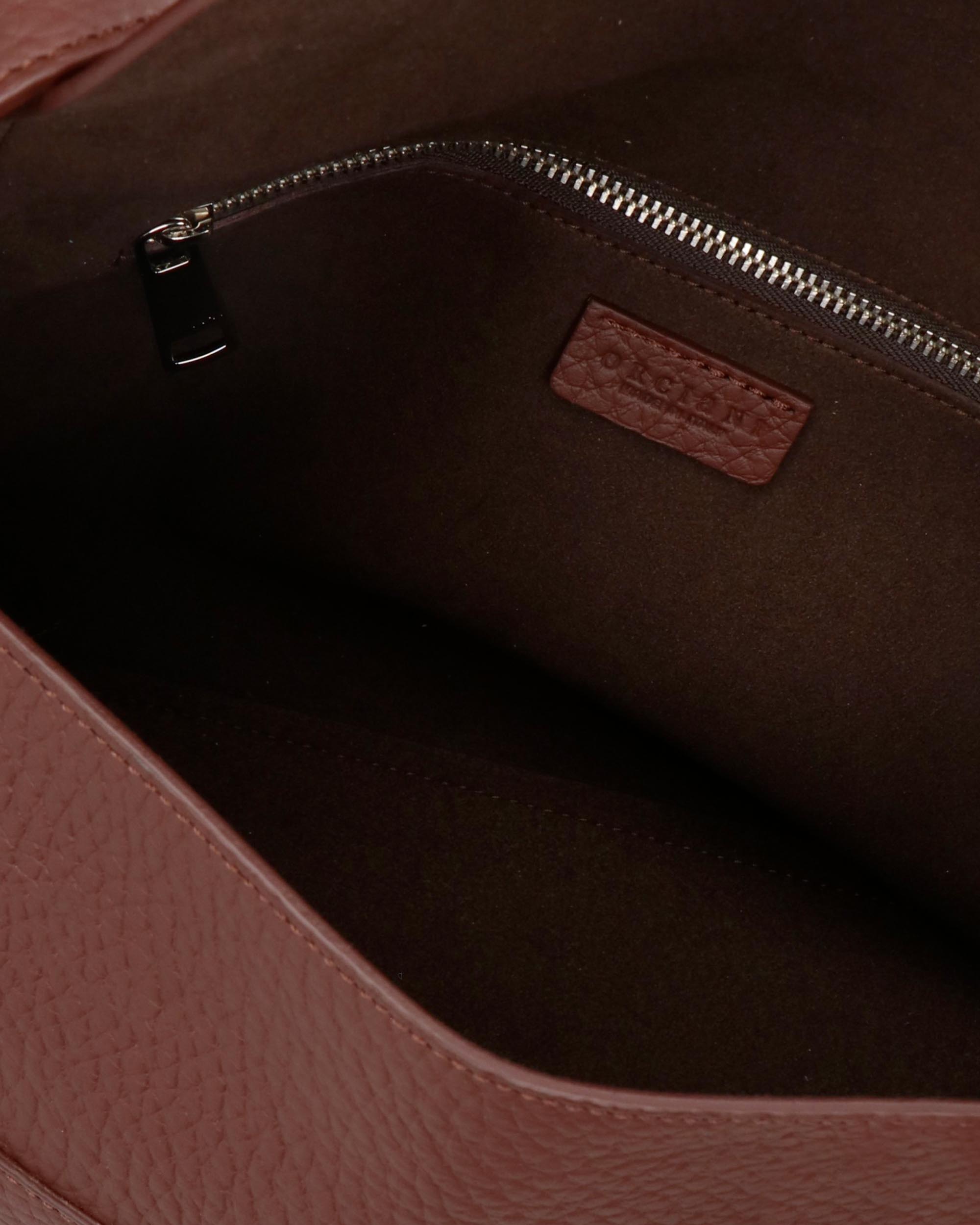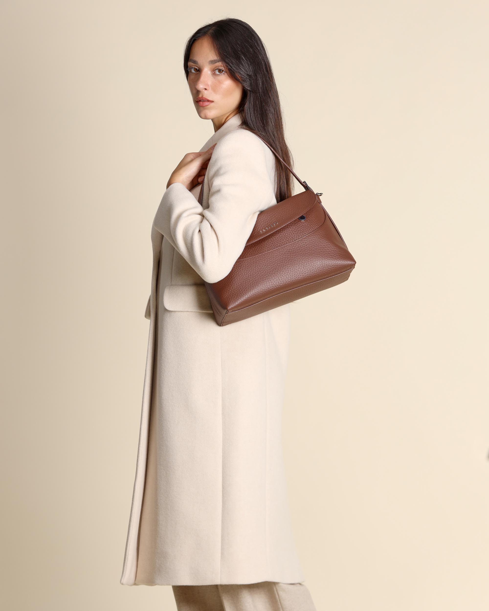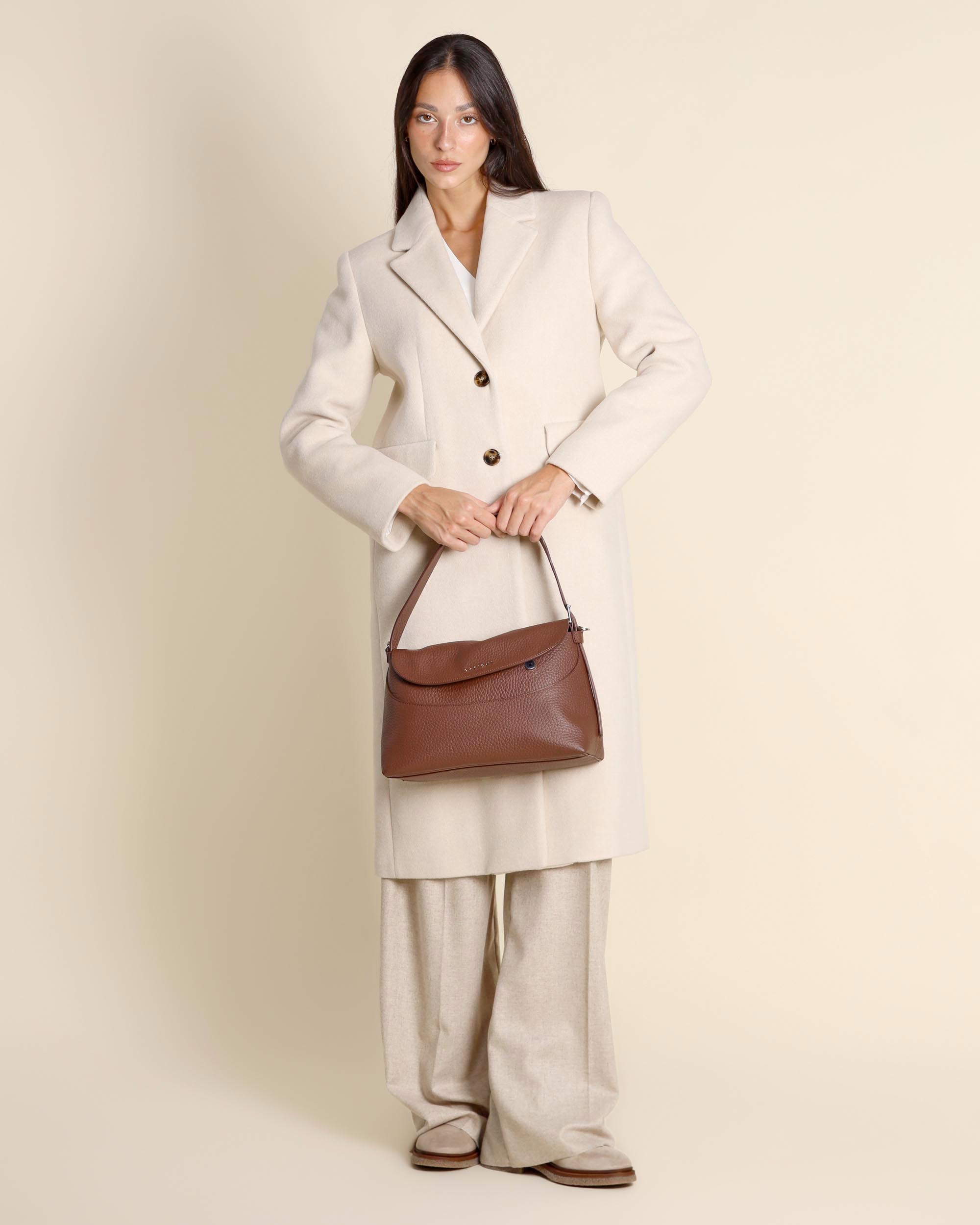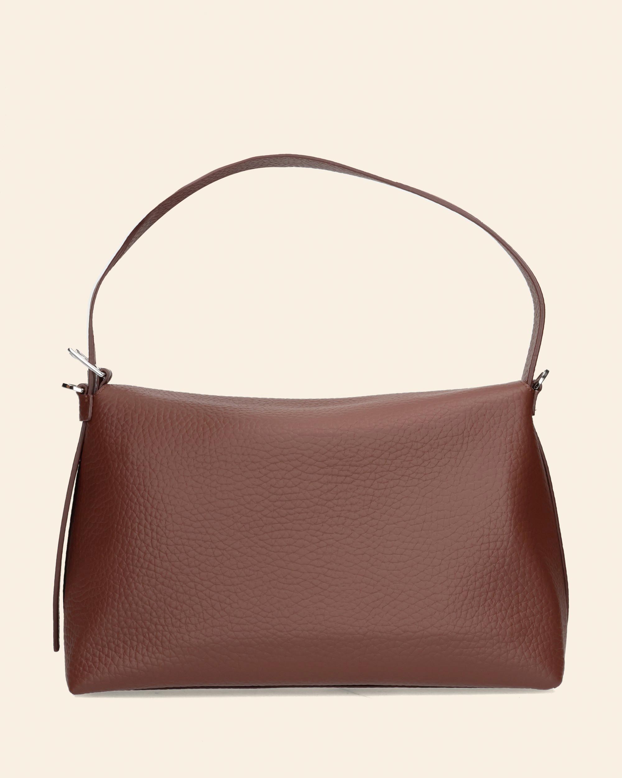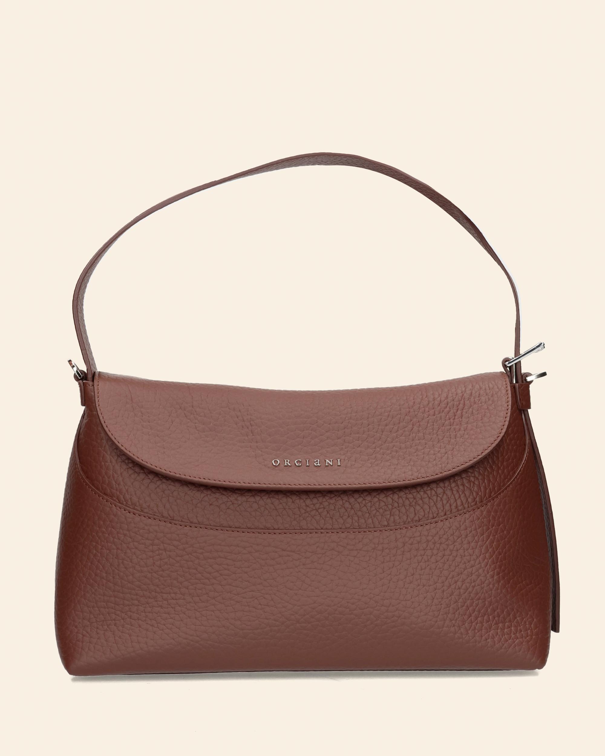 Borsa Nana a spalla in pelle martellata color caffè, manico regolabile con fibbia, tracolla regolabile e removibile, chiusura con patta e bottoni magnetici, una tasca interna con zip, finiture palladio, larghezza 30cm, altezza 19cm, profondità 14cm, made in Italy, collezione donna Orciani