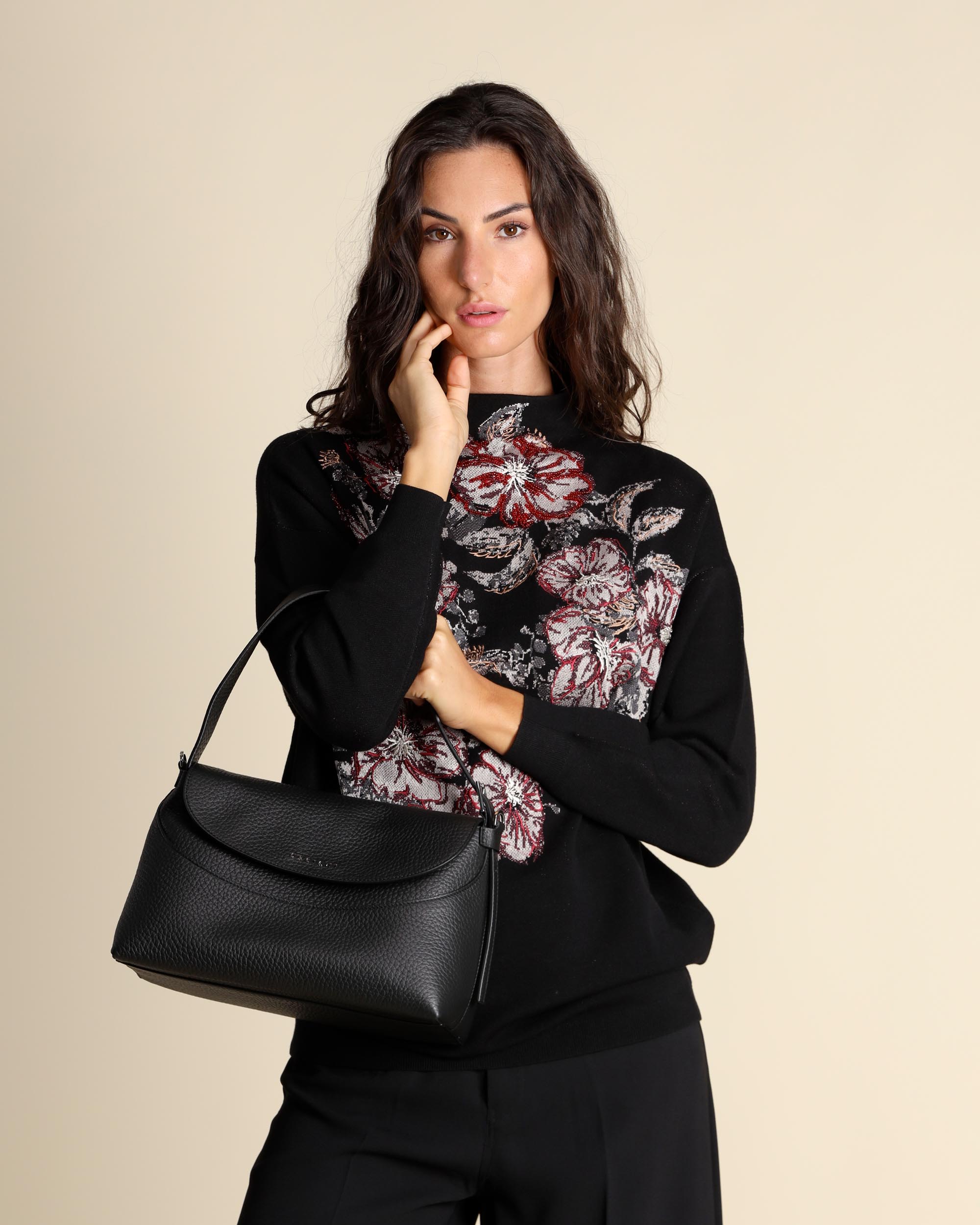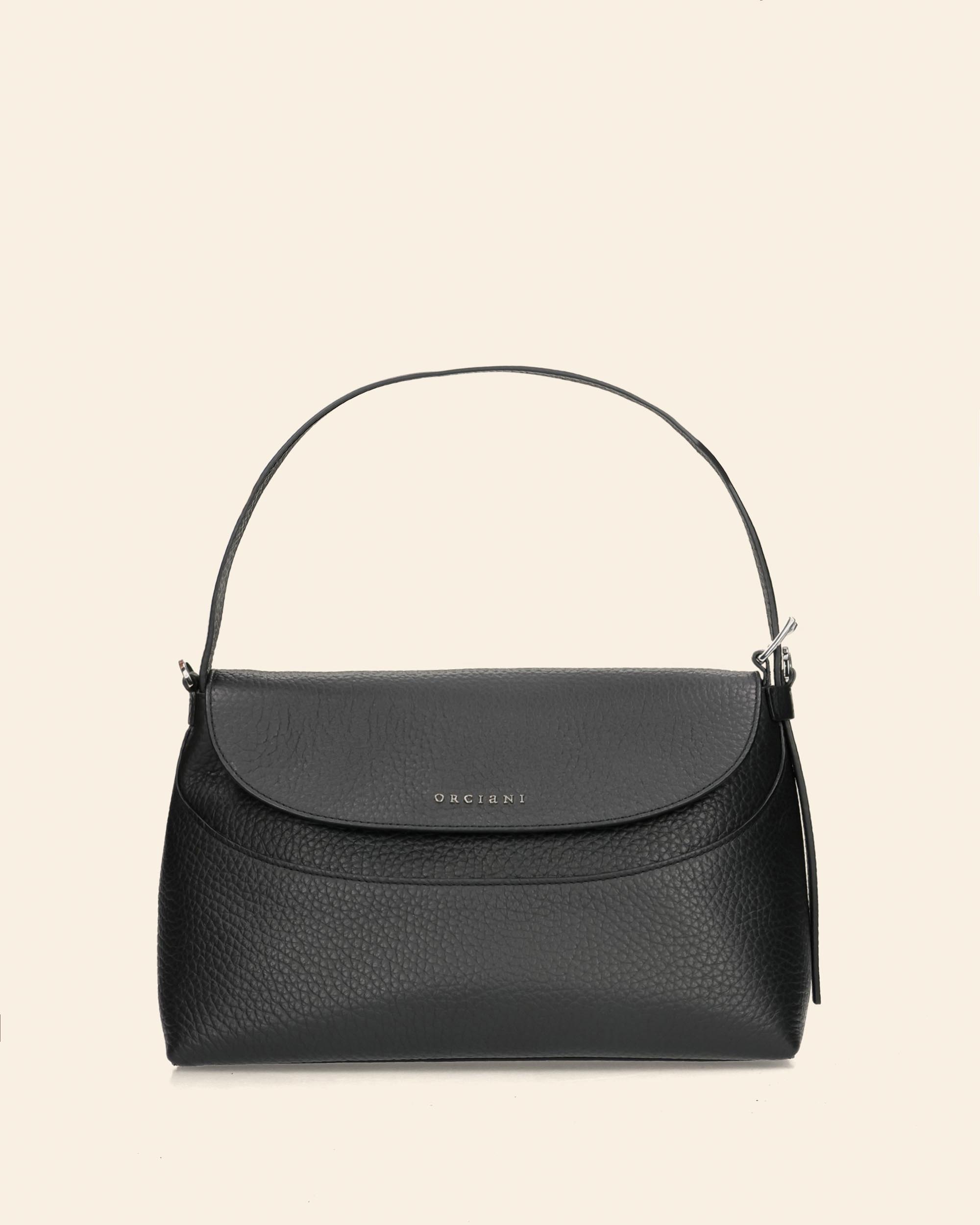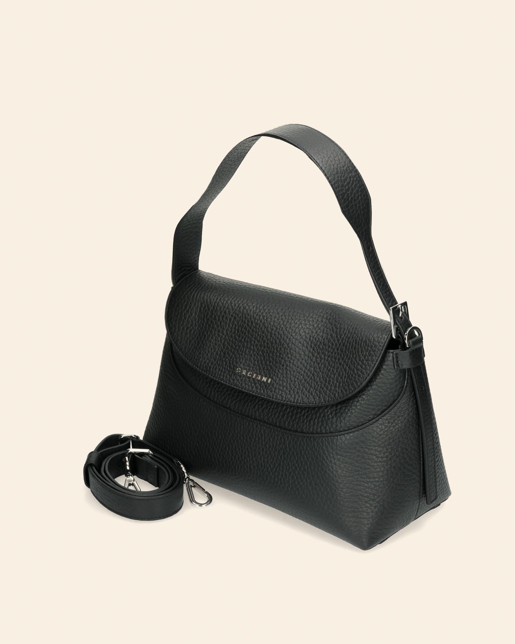 Borsa Nana a spalla in pelle martellata nera, manico regolabile con fibbia, tracolla regolabile e removibile, chiusura con patta e bottoni magnetici, una tasca interna con zip, finiture palladio, larghezza 30cm, altezza 19cm, profondità 14cm, made in Italy, collezione donna Orciani