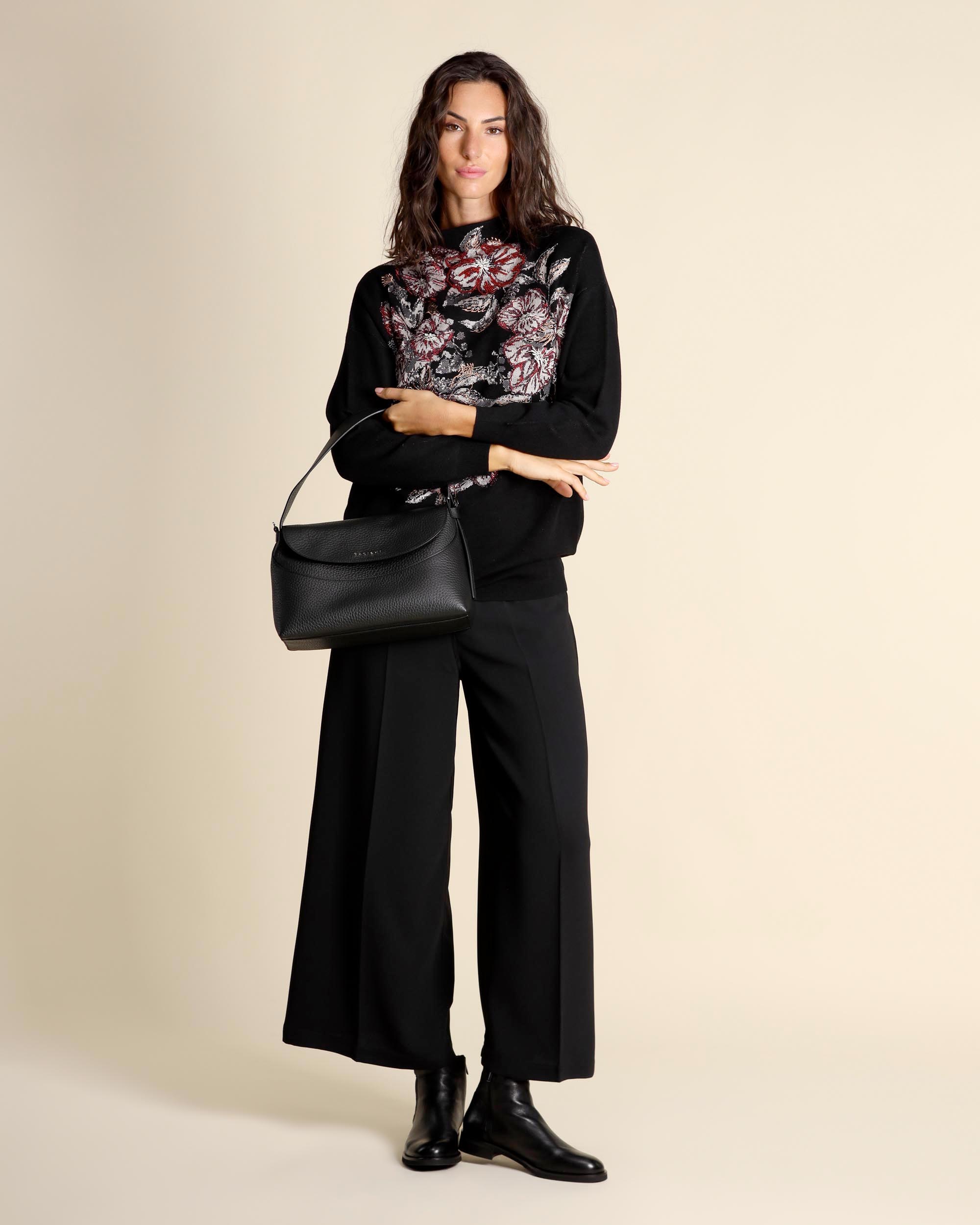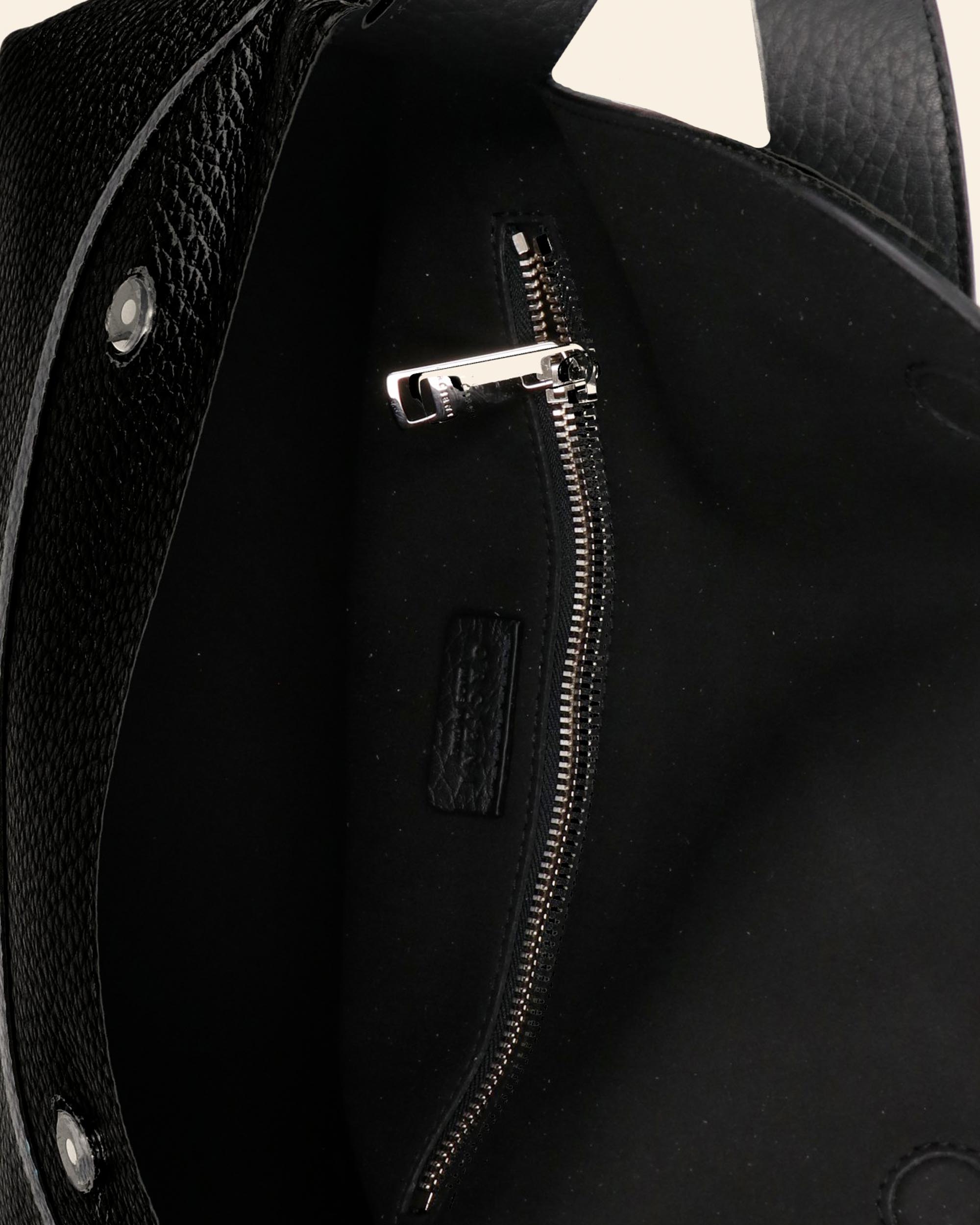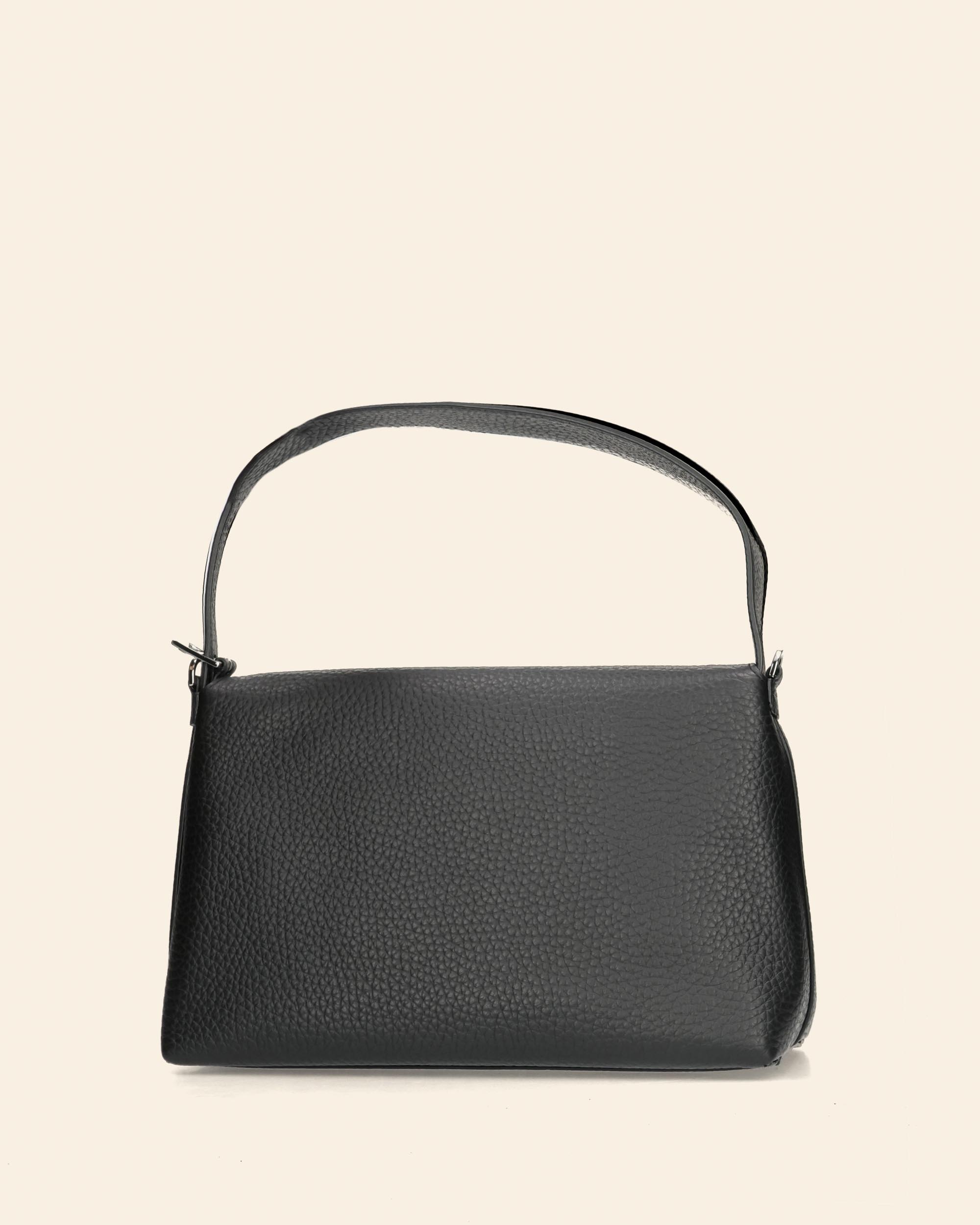 Borsa Nana a spalla in pelle martellata nera, manico regolabile con fibbia, tracolla regolabile e removibile, chiusura con patta e bottoni magnetici, una tasca interna con zip, finiture palladio, larghezza 30cm, altezza 19cm, profondità 14cm, made in Italy, collezione donna Orciani