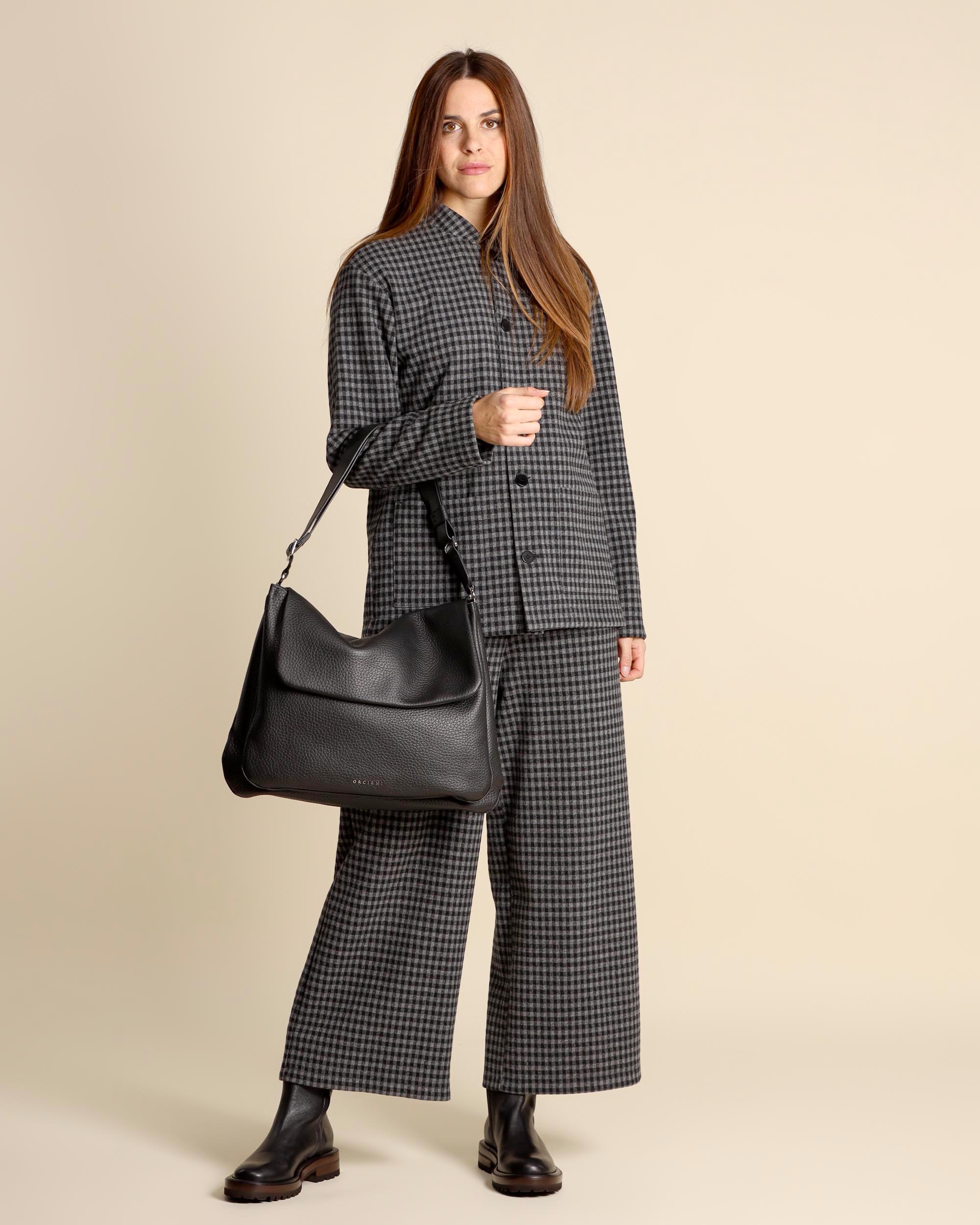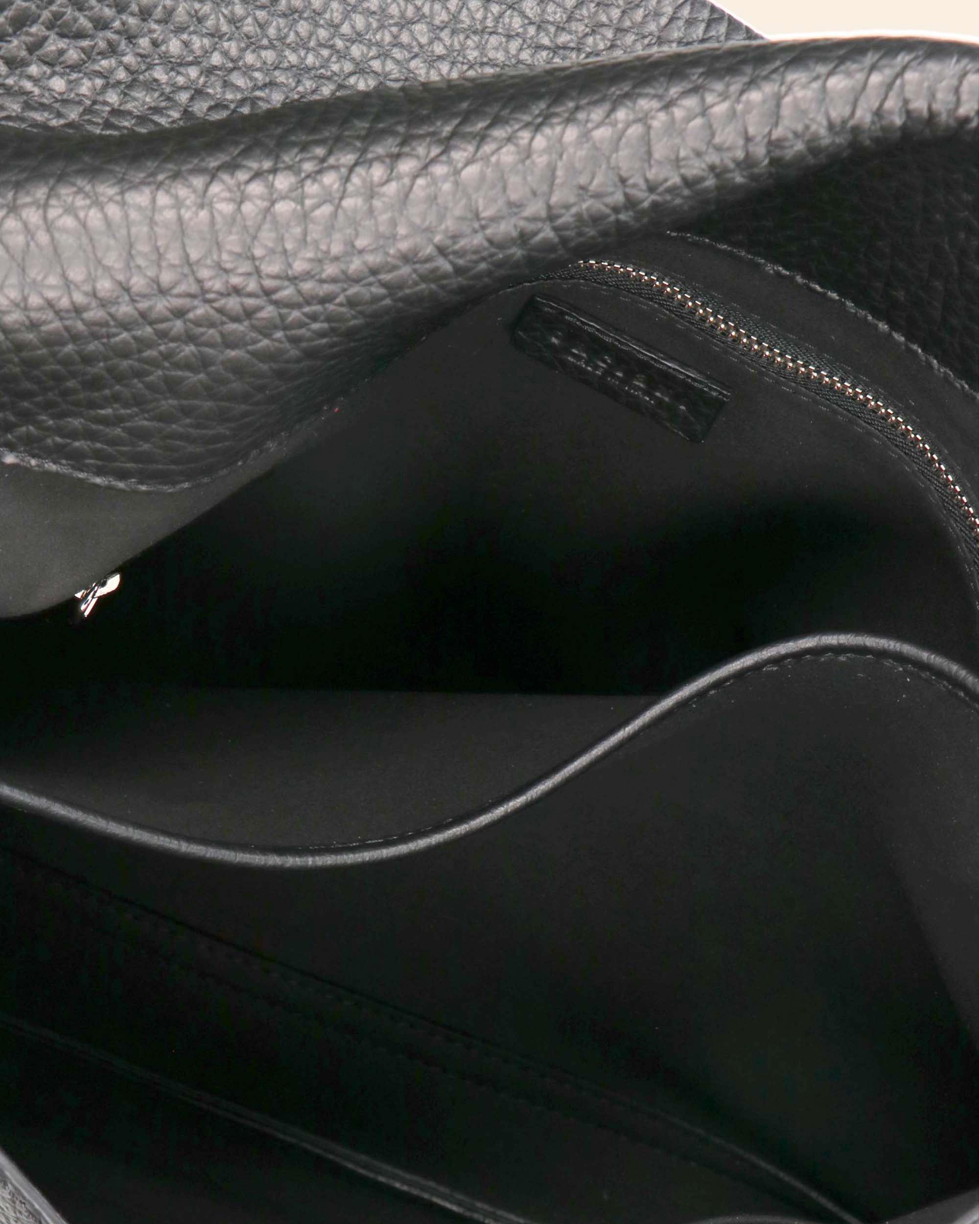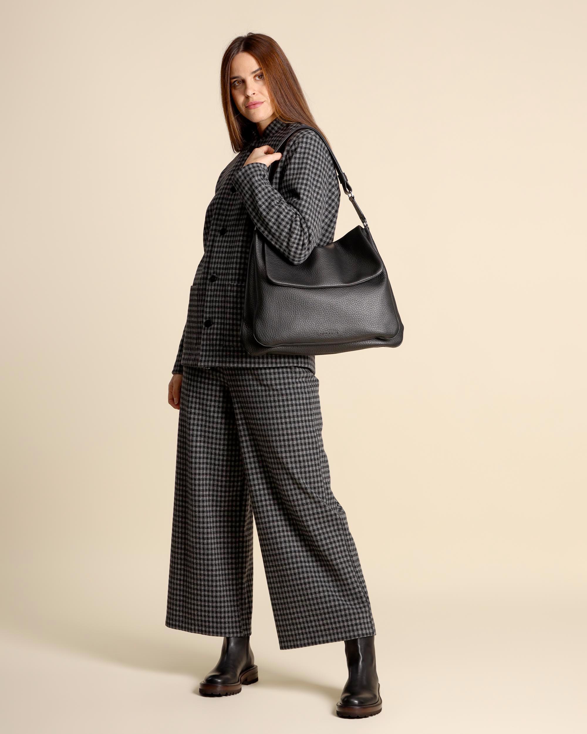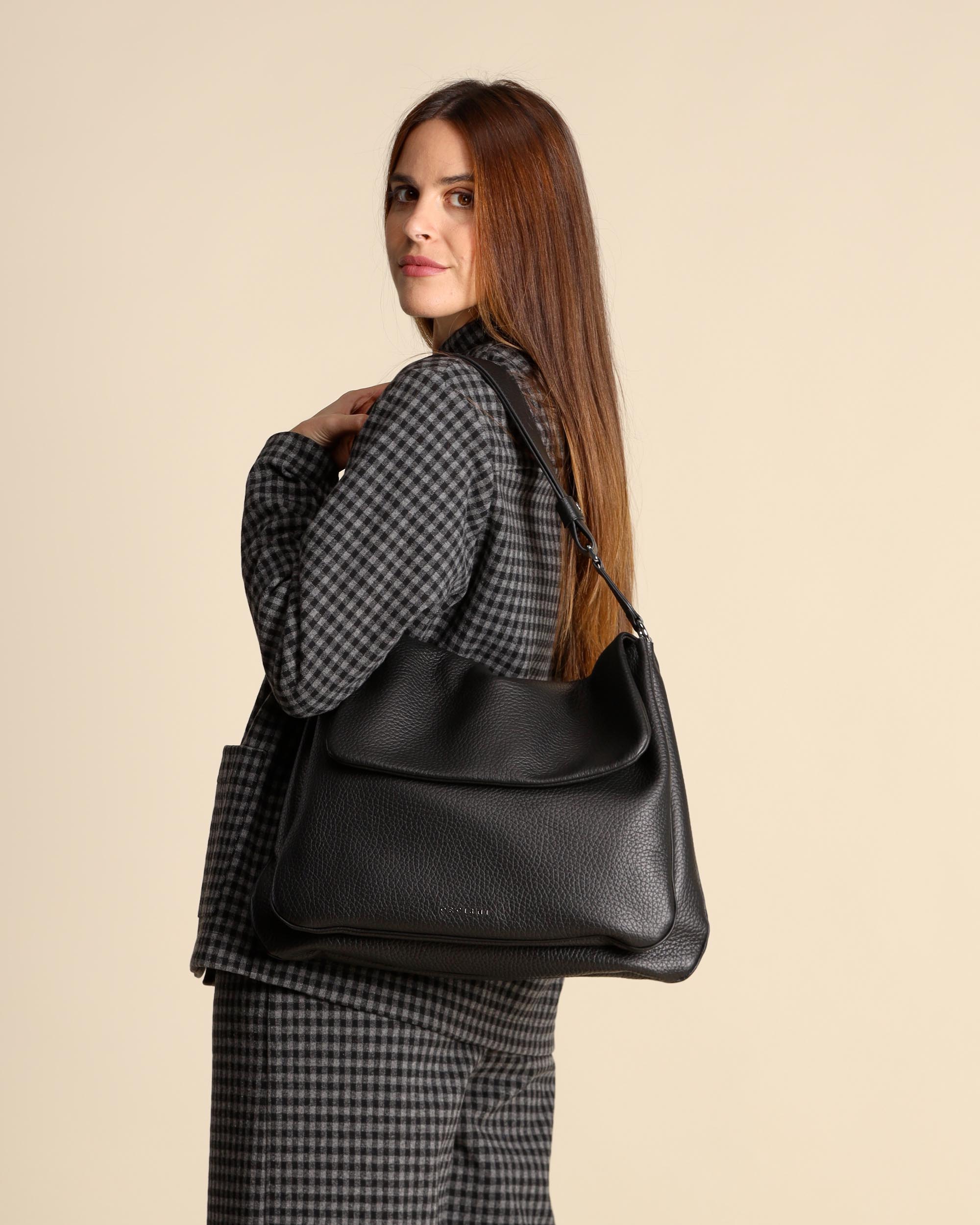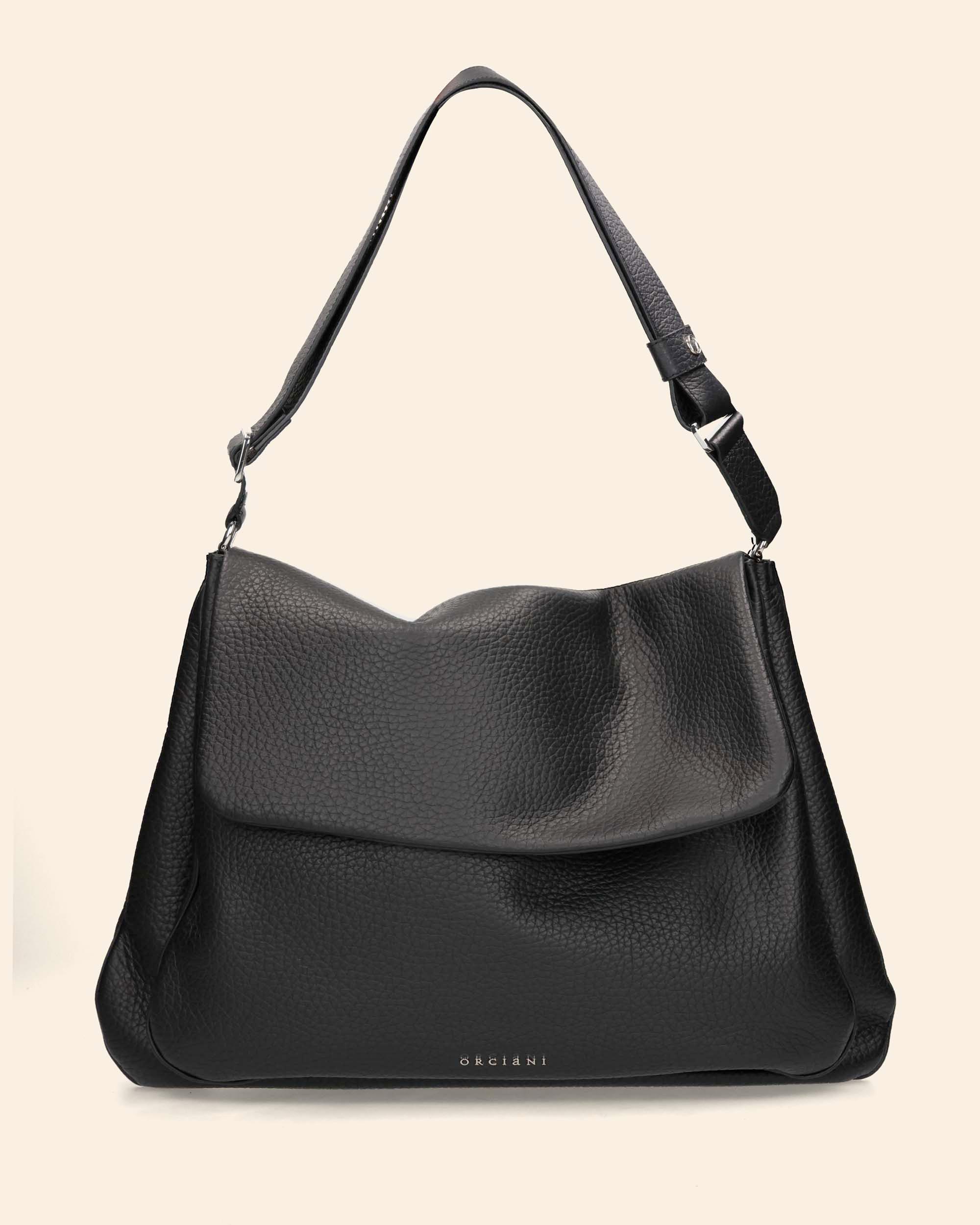 Borsa Diana crossbody in pelle martellata nera, tracolla regolabile, chiusura con patta e bottone magnetico, doppia tasca interna aperta, tasca interna con zip, finiture palladio, larghezza 44cm, altezza 35cm, profondità 7cm, made in Italy, collezione donna Orciani