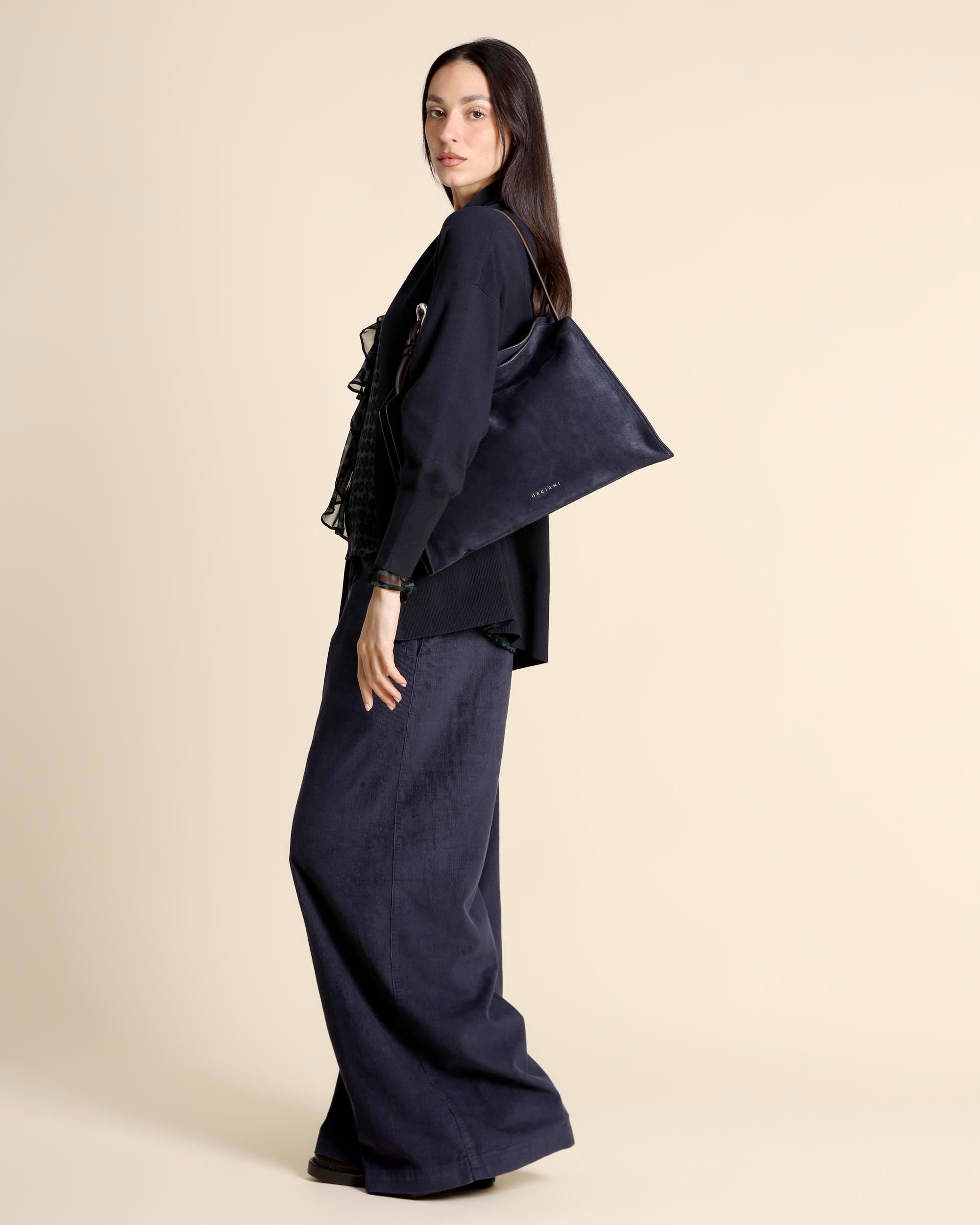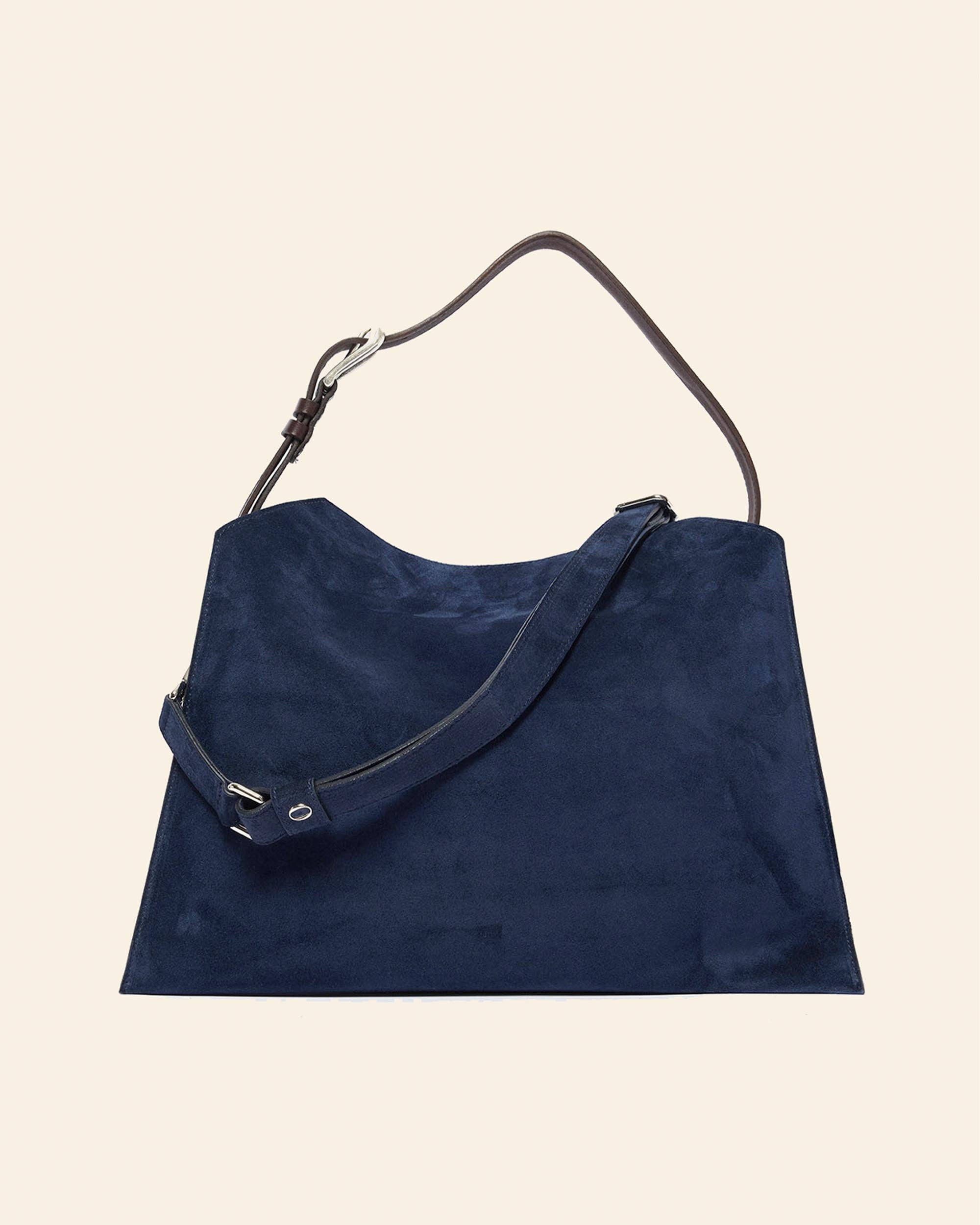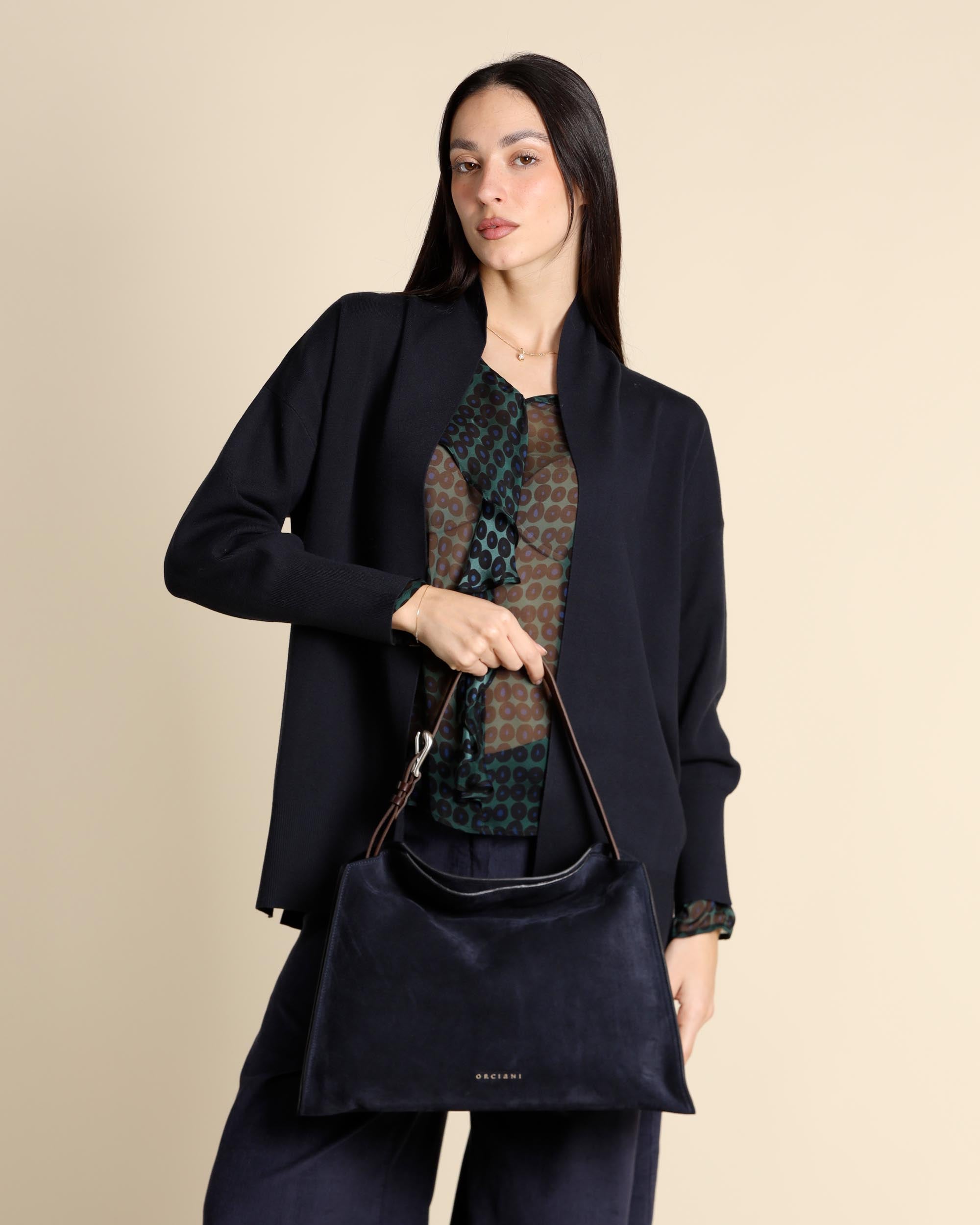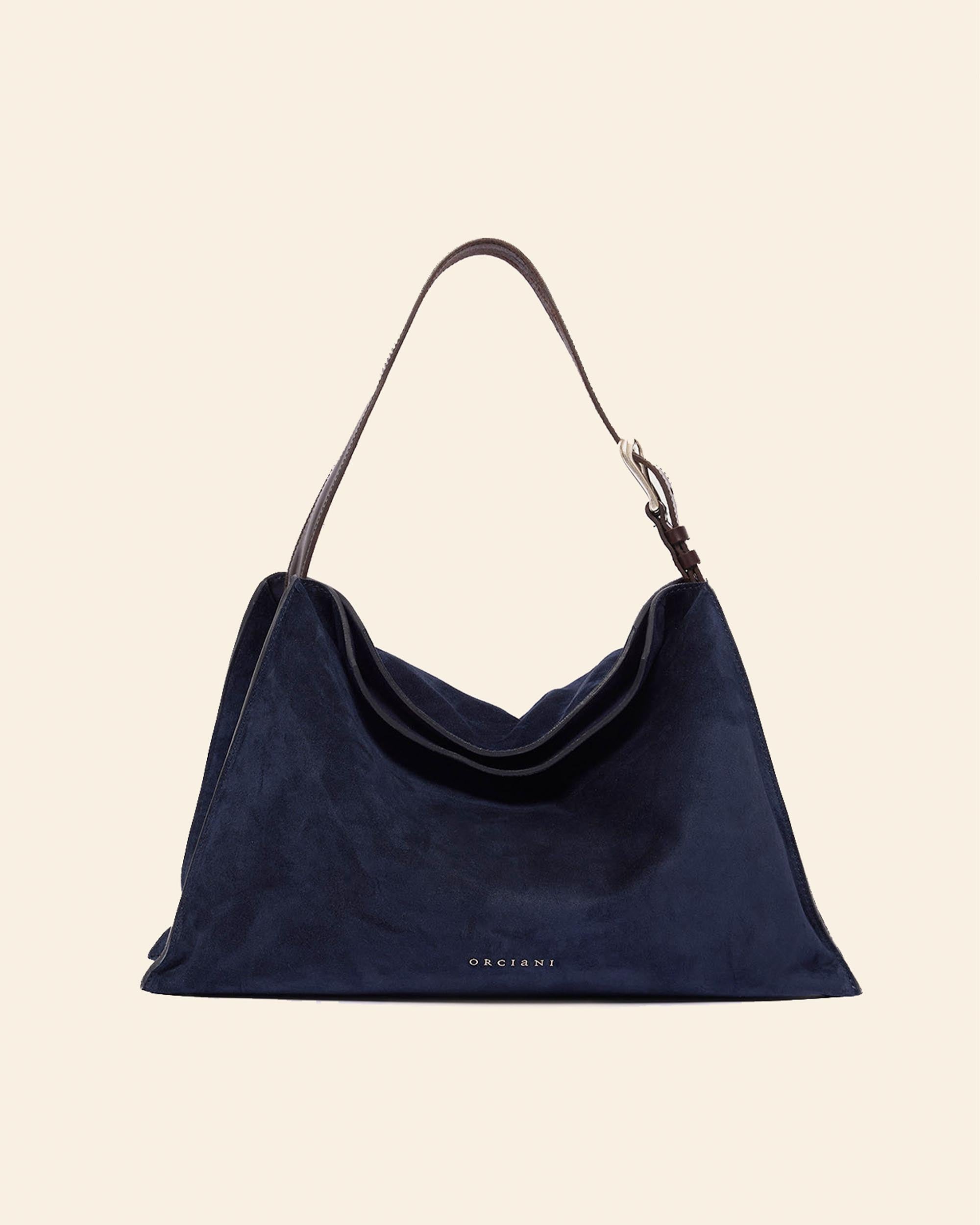 Borsa Trinity midi blu in suede, a spalla, manico che può essere indossato come cintura, tracolla regolabile e removibile, chiusura con bottoni magnetici, triplo scomparto, tasca interna con zip, finiture palladio, larghezza 39cm, altezza 25cm, profondità 10cm, made in Italy, collezione donna Orciani
