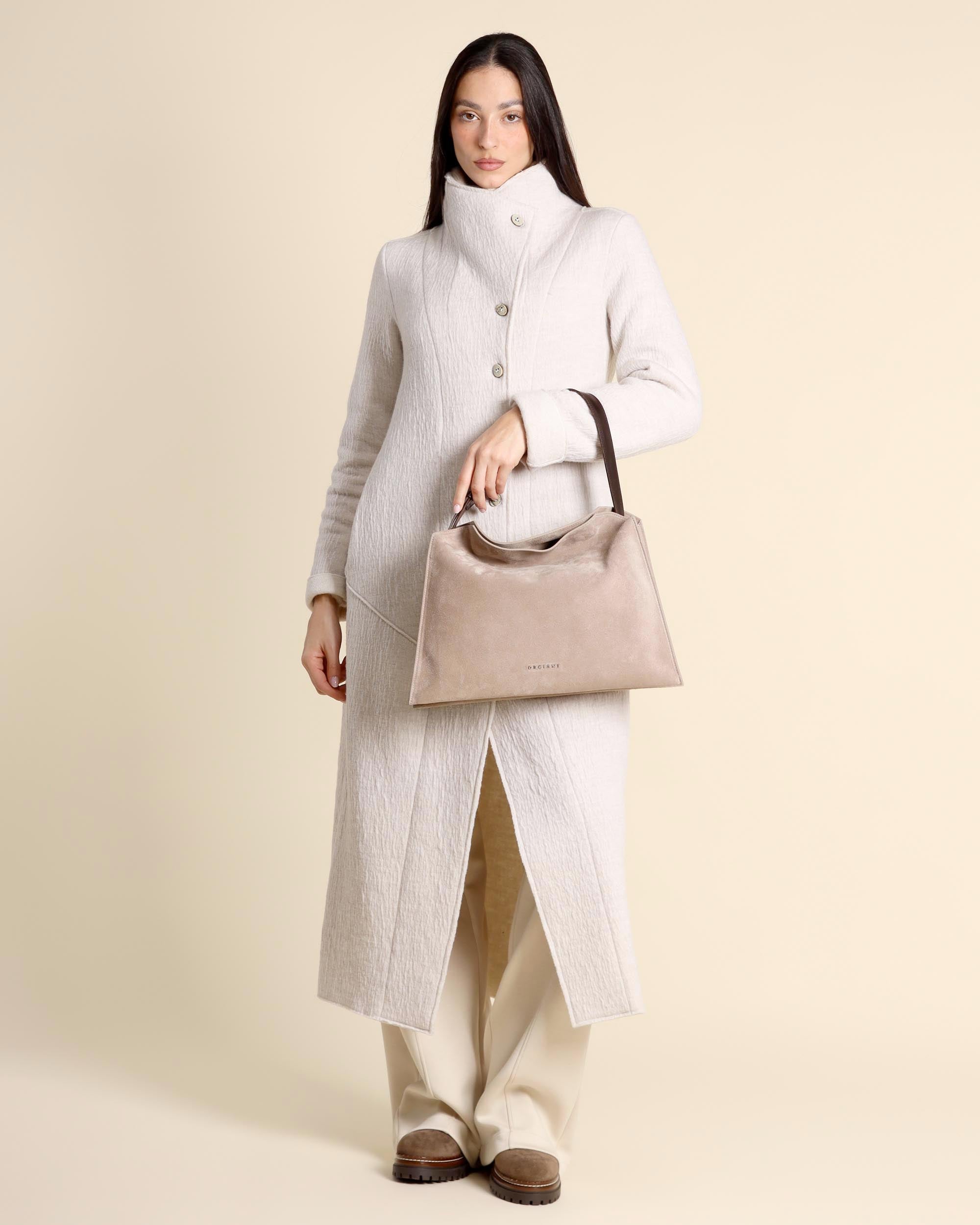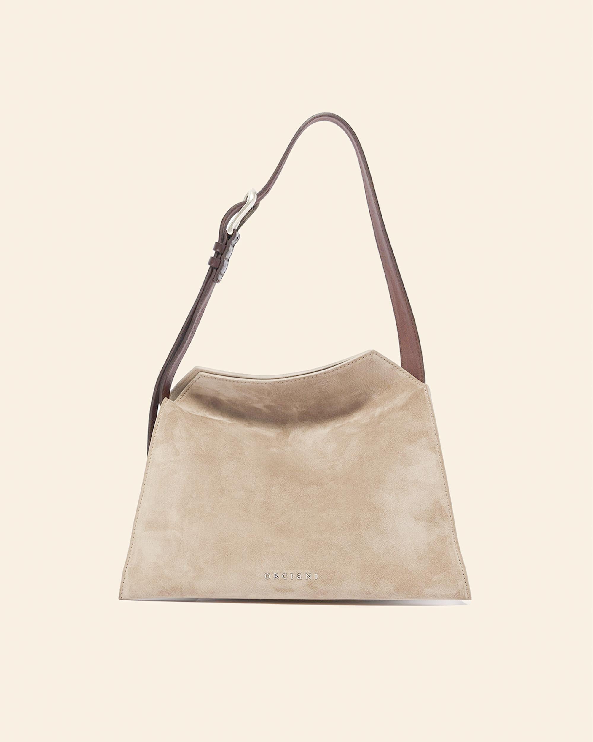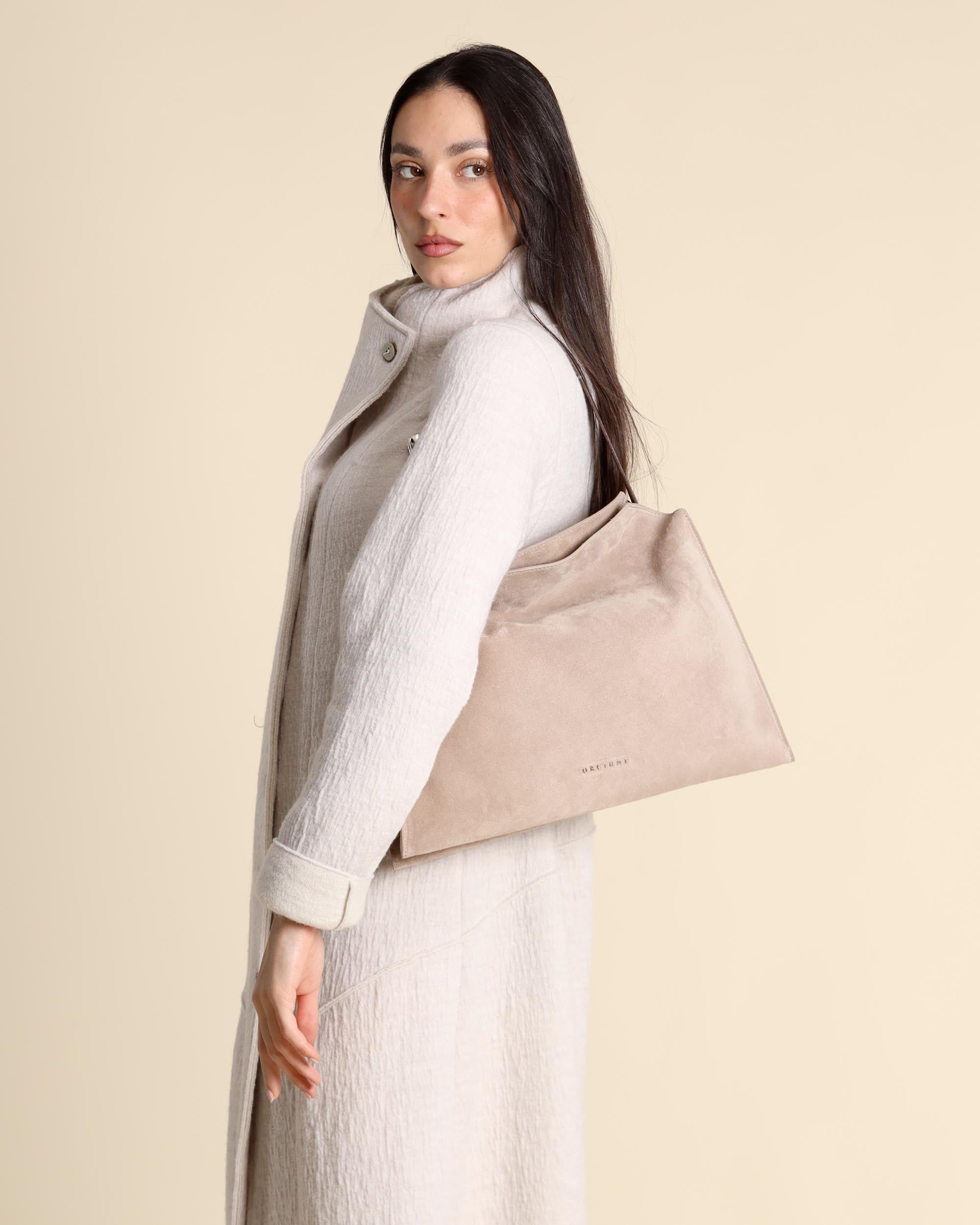 Borsa Trinity midi sabbia in suede, a spalla, manico che può essere indossato come cintura, tracolla regolabile e removibile, chiusura con bottoni magnetici, triplo scomparto, tasca interna con zip, finiture palladio, larghezza 39cm, altezza 25cm, profondità 10cm, made in Italy, collezione donna Orciani