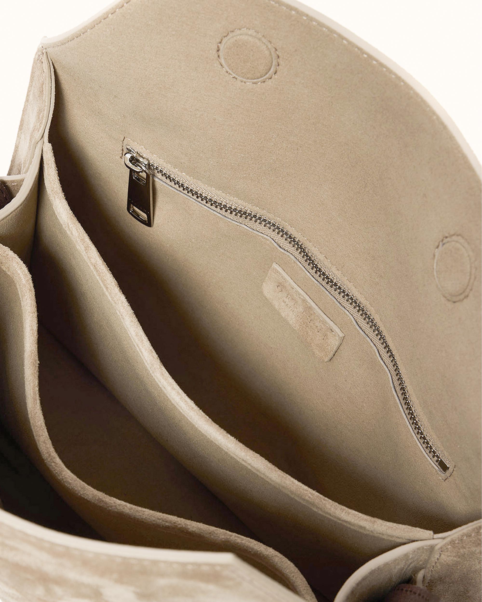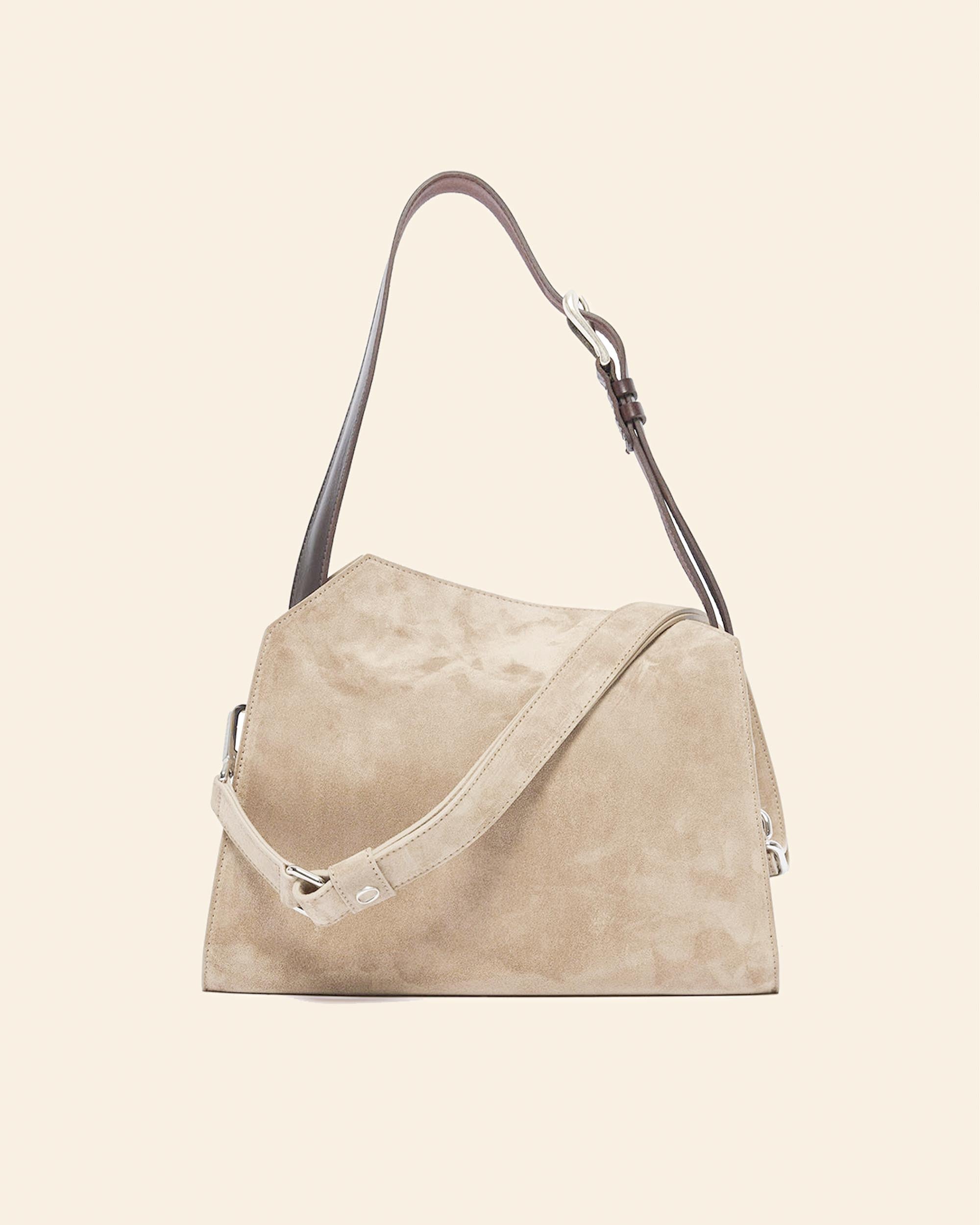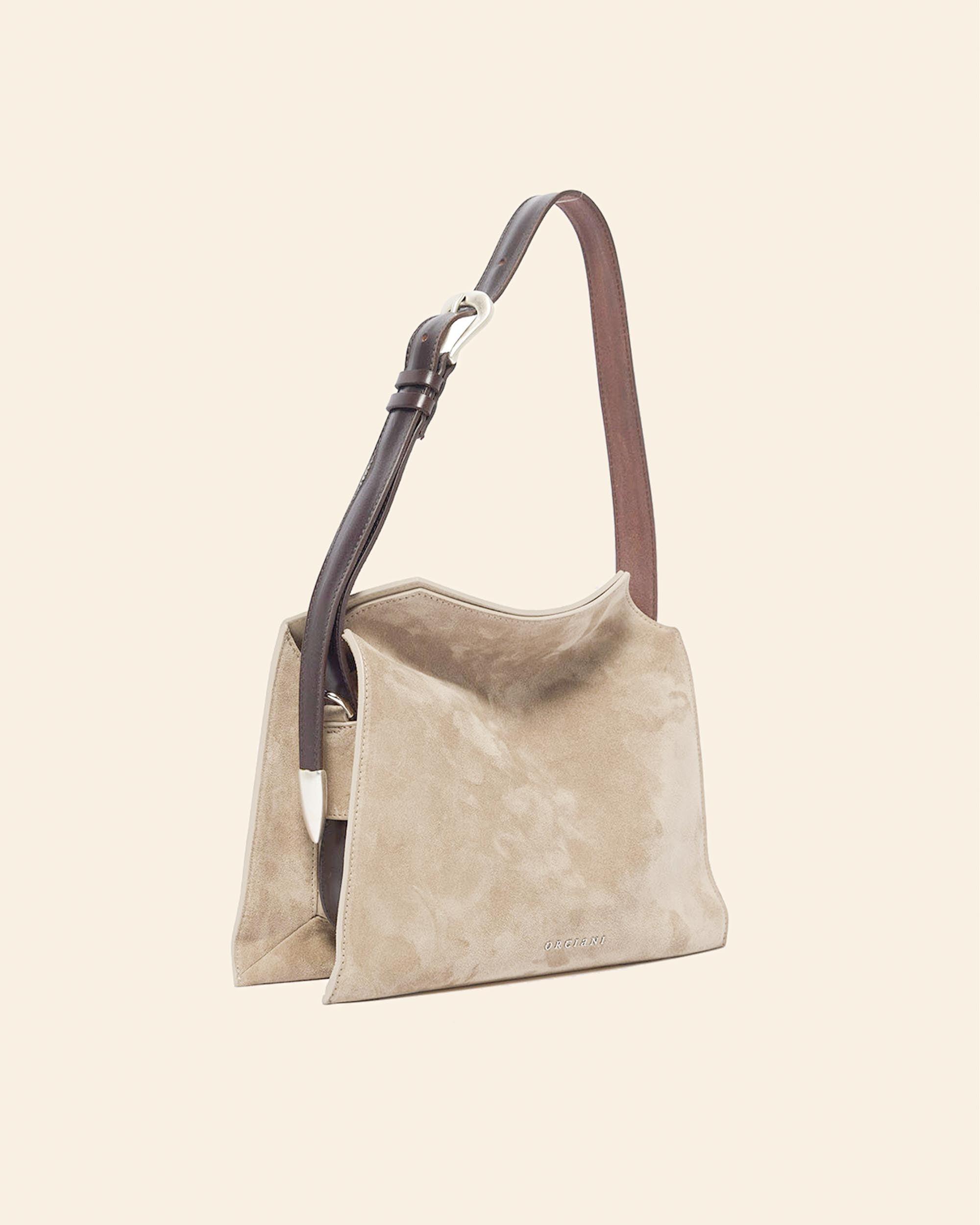 Borsa Trinity midi sabbia in suede, a spalla, manico che può essere indossato come cintura, tracolla regolabile e removibile, chiusura con bottoni magnetici, triplo scomparto, tasca interna con zip, finiture palladio, larghezza 39cm, altezza 25cm, profondità 10cm, made in Italy, collezione donna Orciani