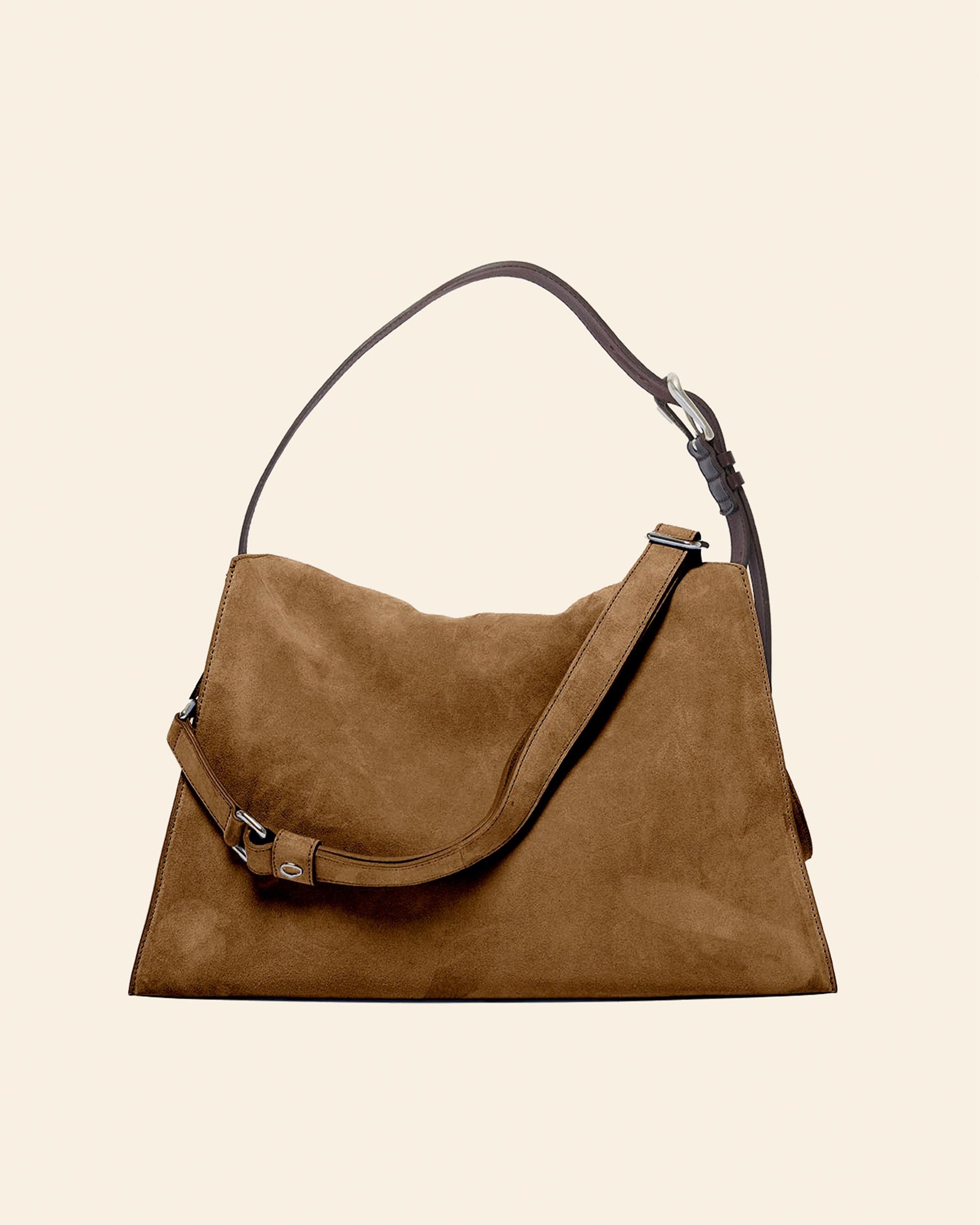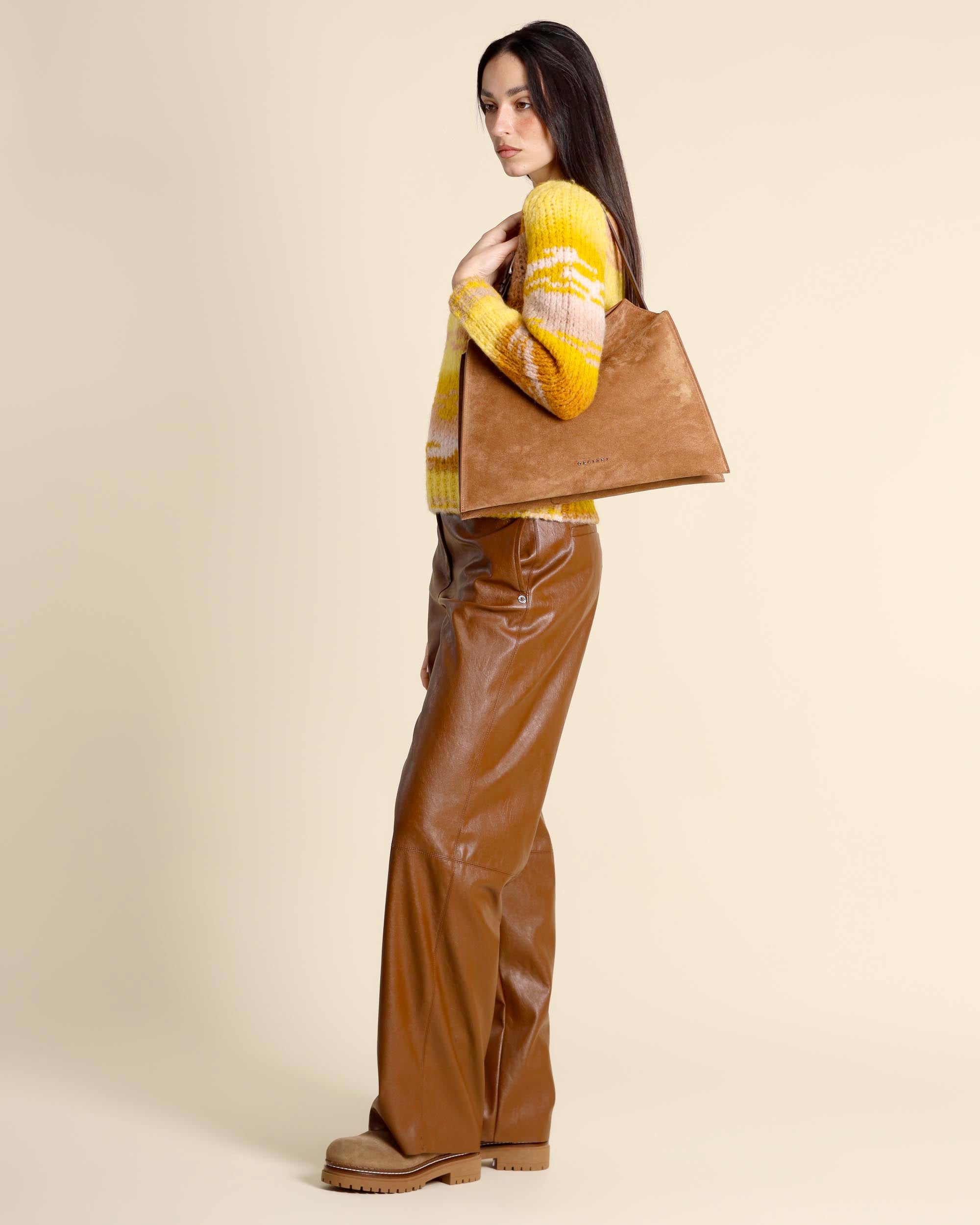 Borsa Trinity midi color cuoio in suede, a spalla, manico che può essere indossato come cintura, tracolla regolabile e removibile, chiusura con bottoni magnetici, triplo scomparto, tasca interna con zip, finiture palladio, larghezza 39cm, altezza 25cm, profondità 10cm, made in Italy, collezione donna Orciani