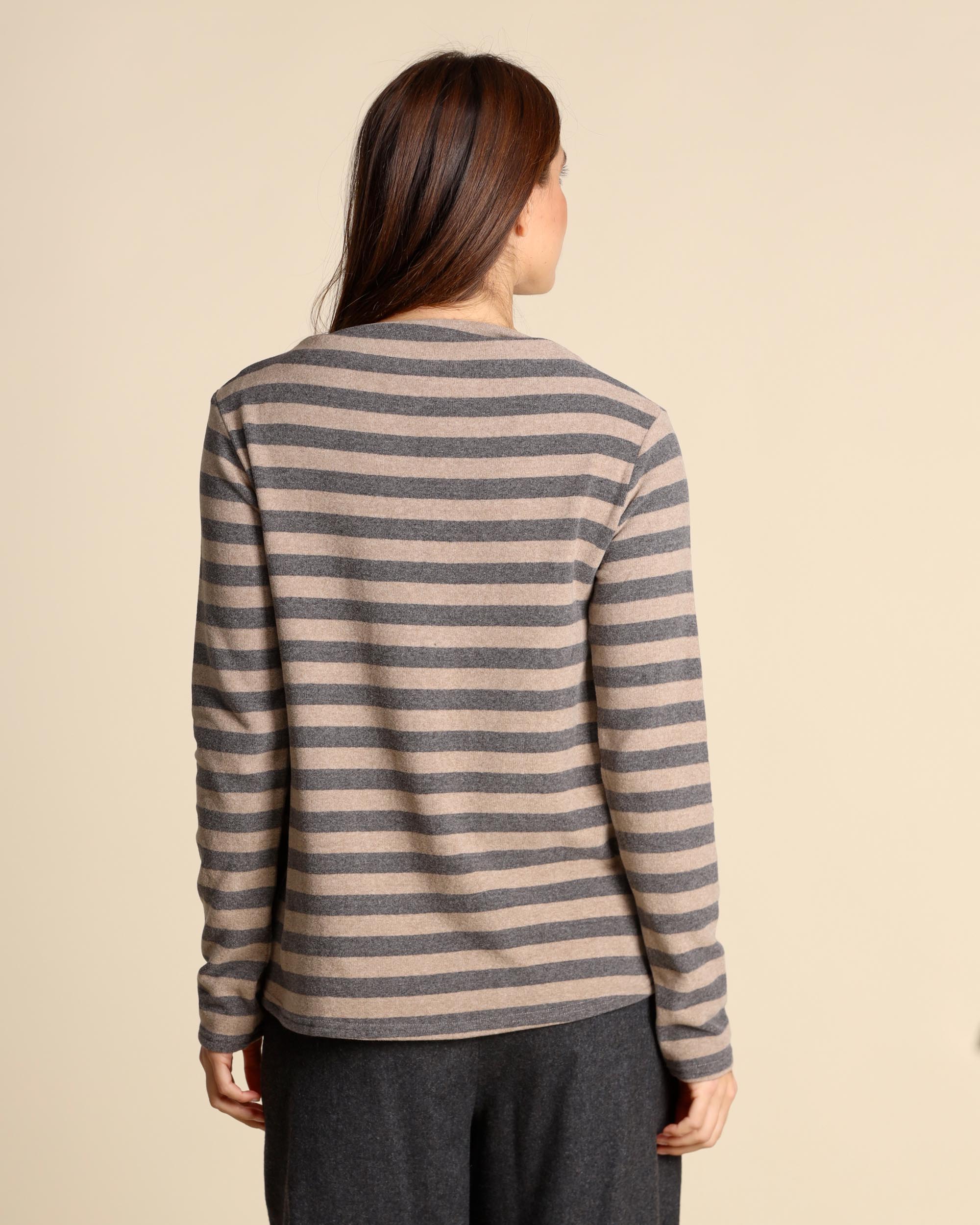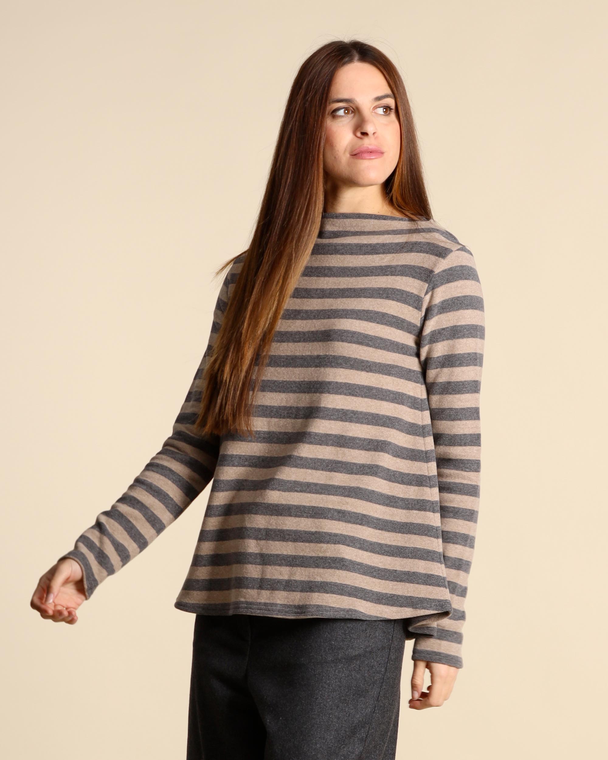 Maglia in jersey di misto cotone stretch grigia e beige a righe, collo a barchetta, maniche lunghe, linea morbida, made in Italy, la modella indossa una tg.S, la modella ha le seguenti misure: altezza 177, seno 87,vita 65, fianchi 93, collezione donna Neirami Autunno Inverno 2025/26